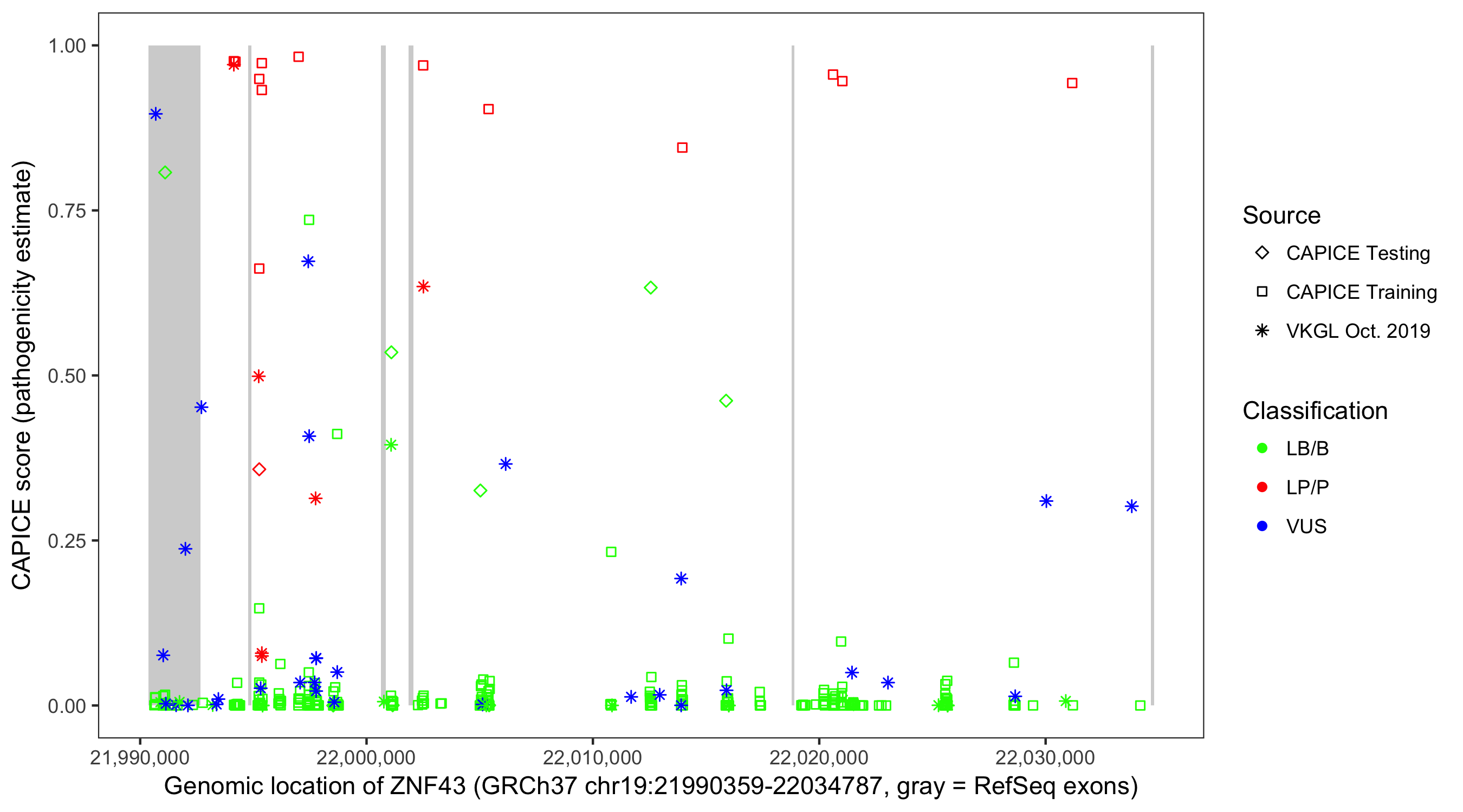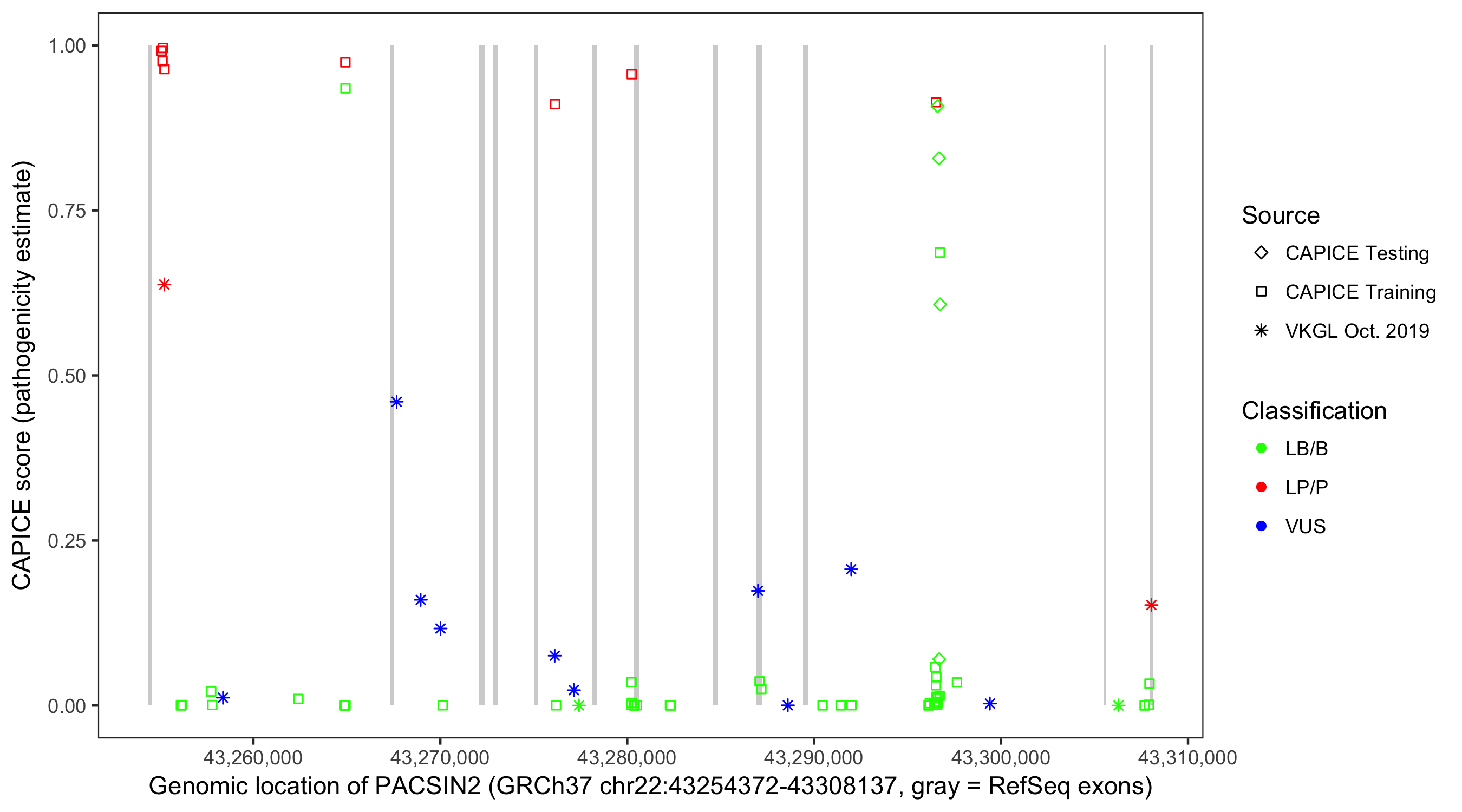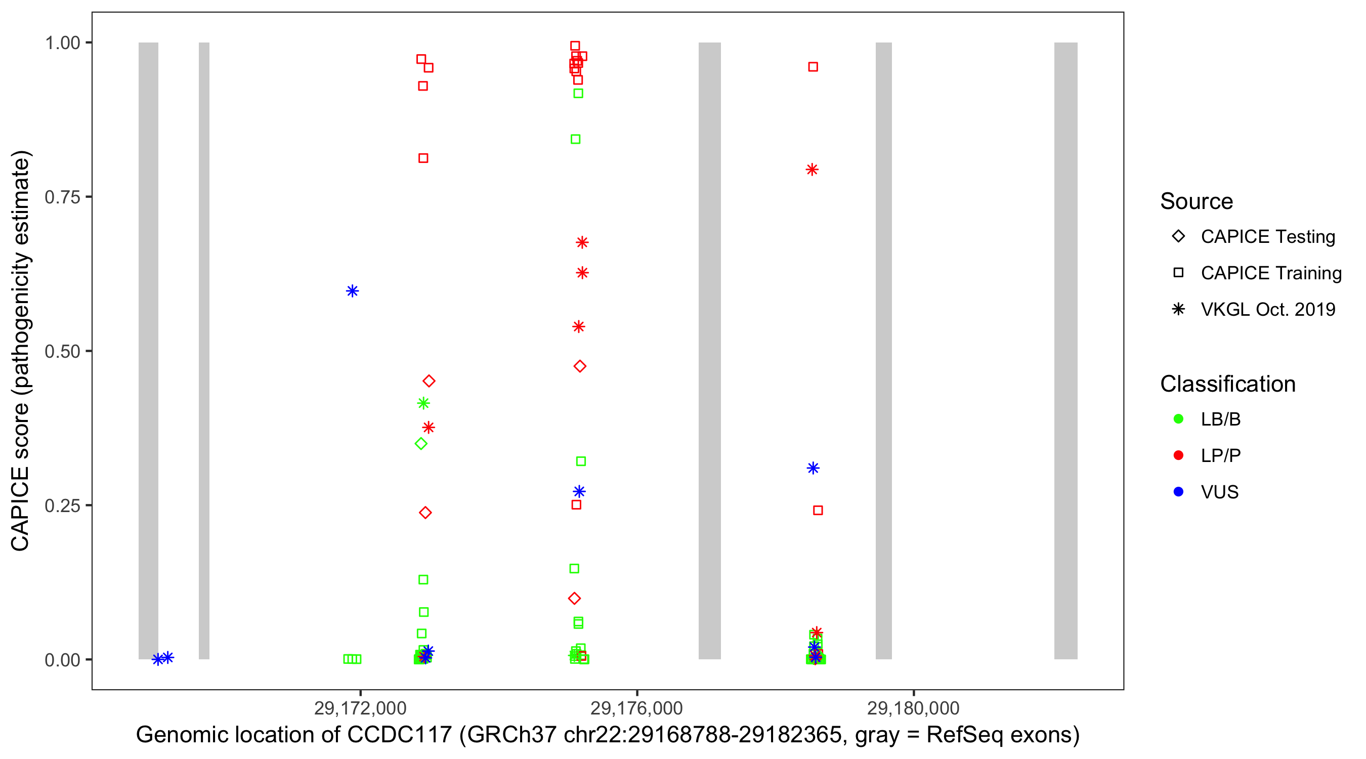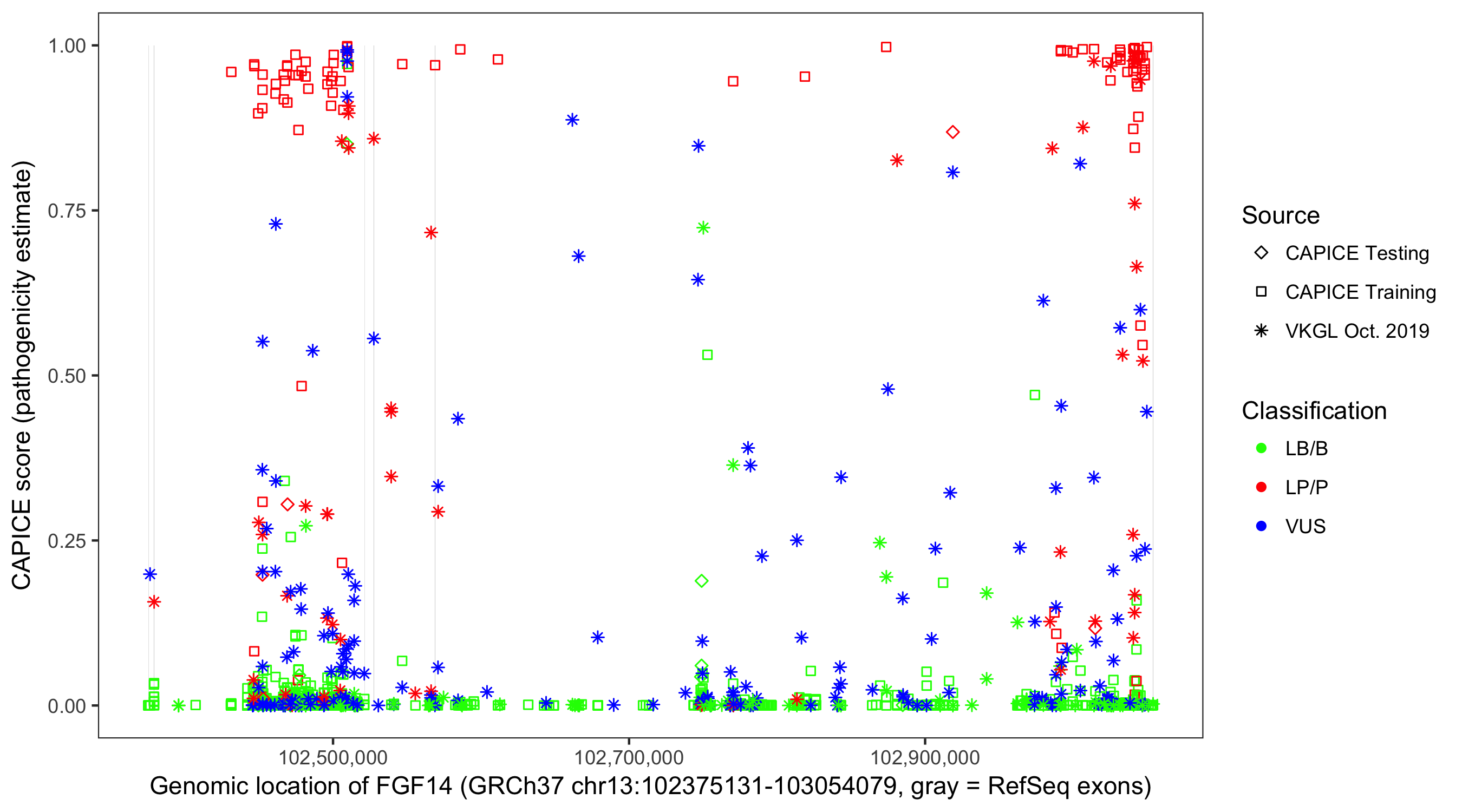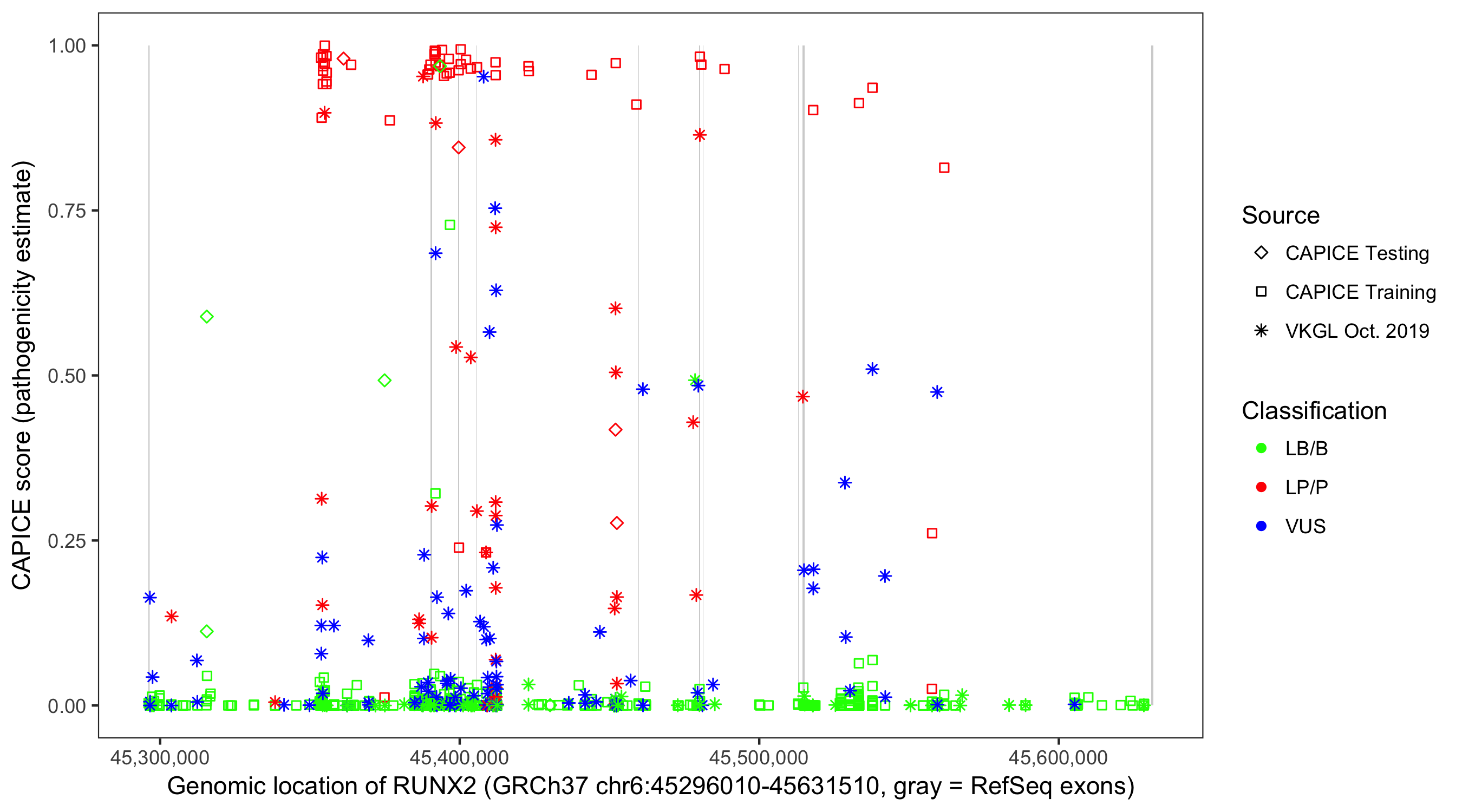 Shown are CAPICE train/test variants plus VKGL Oct 2019.