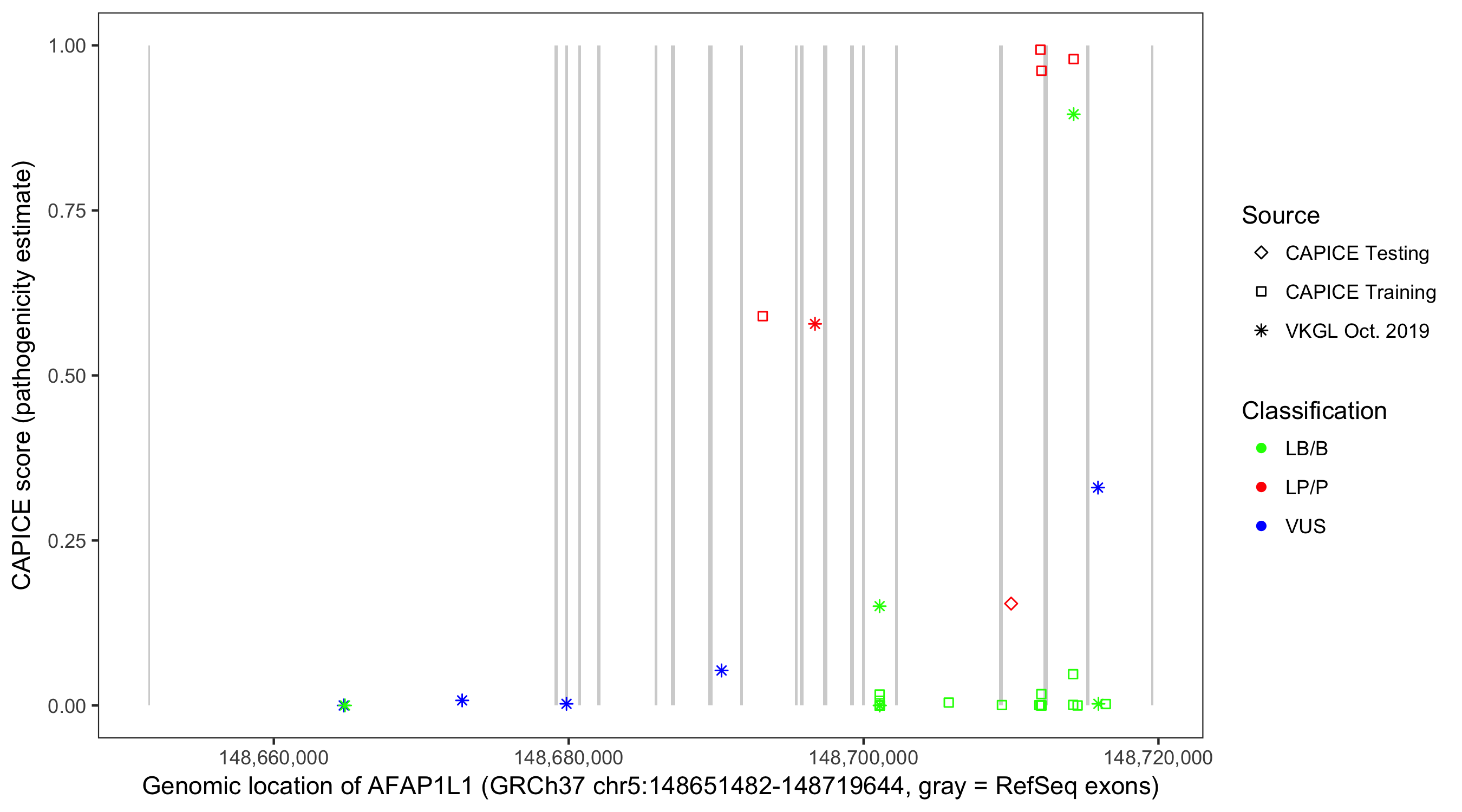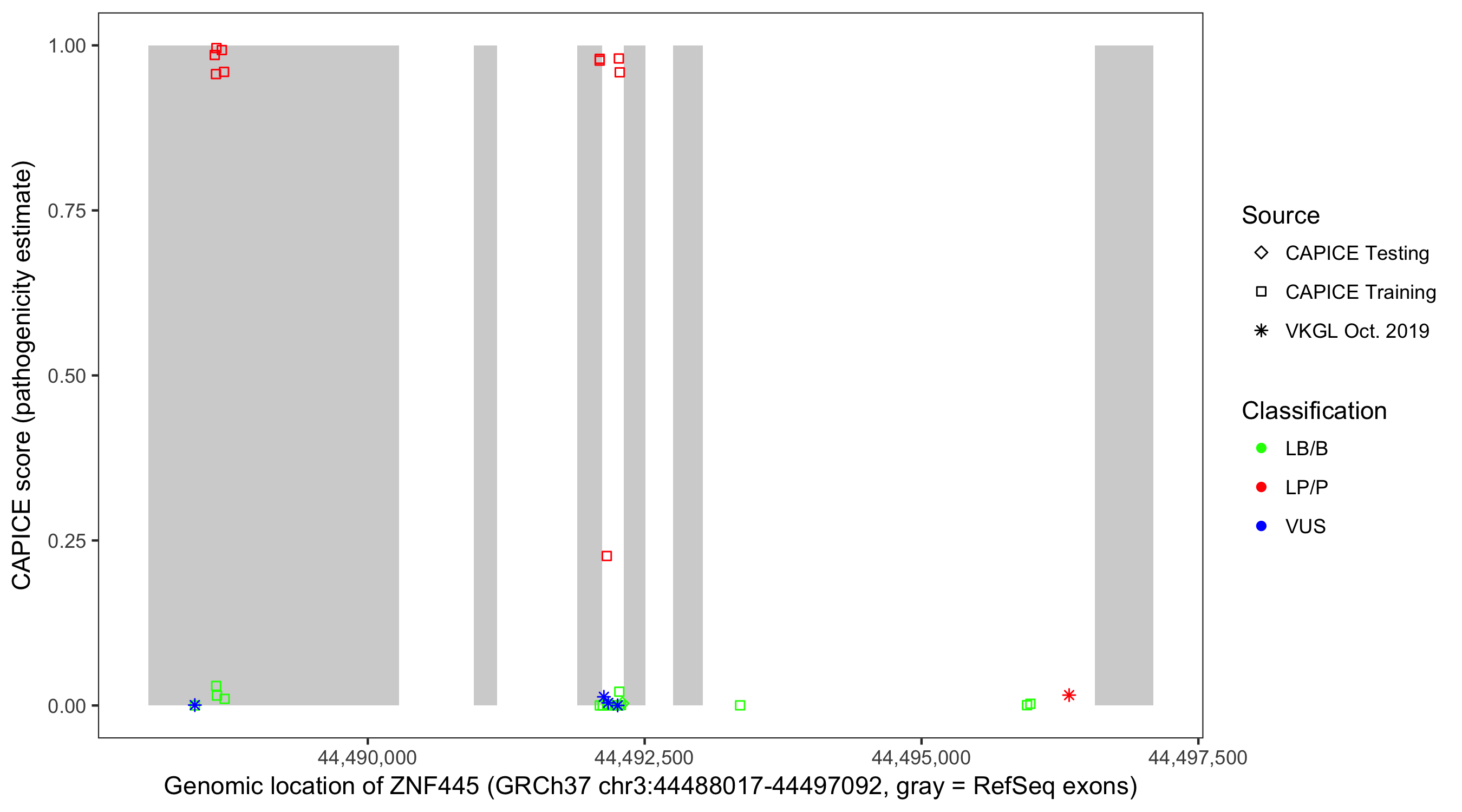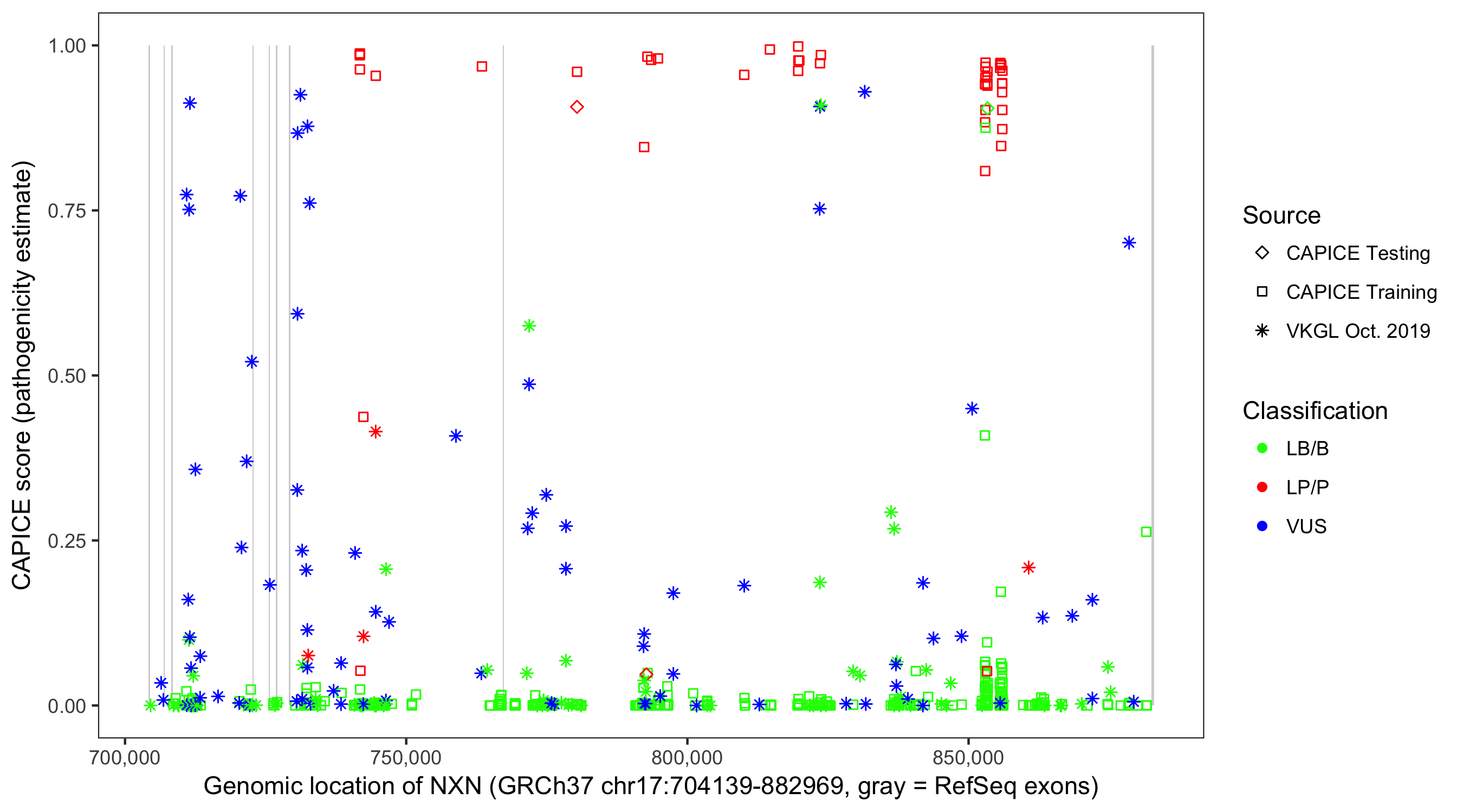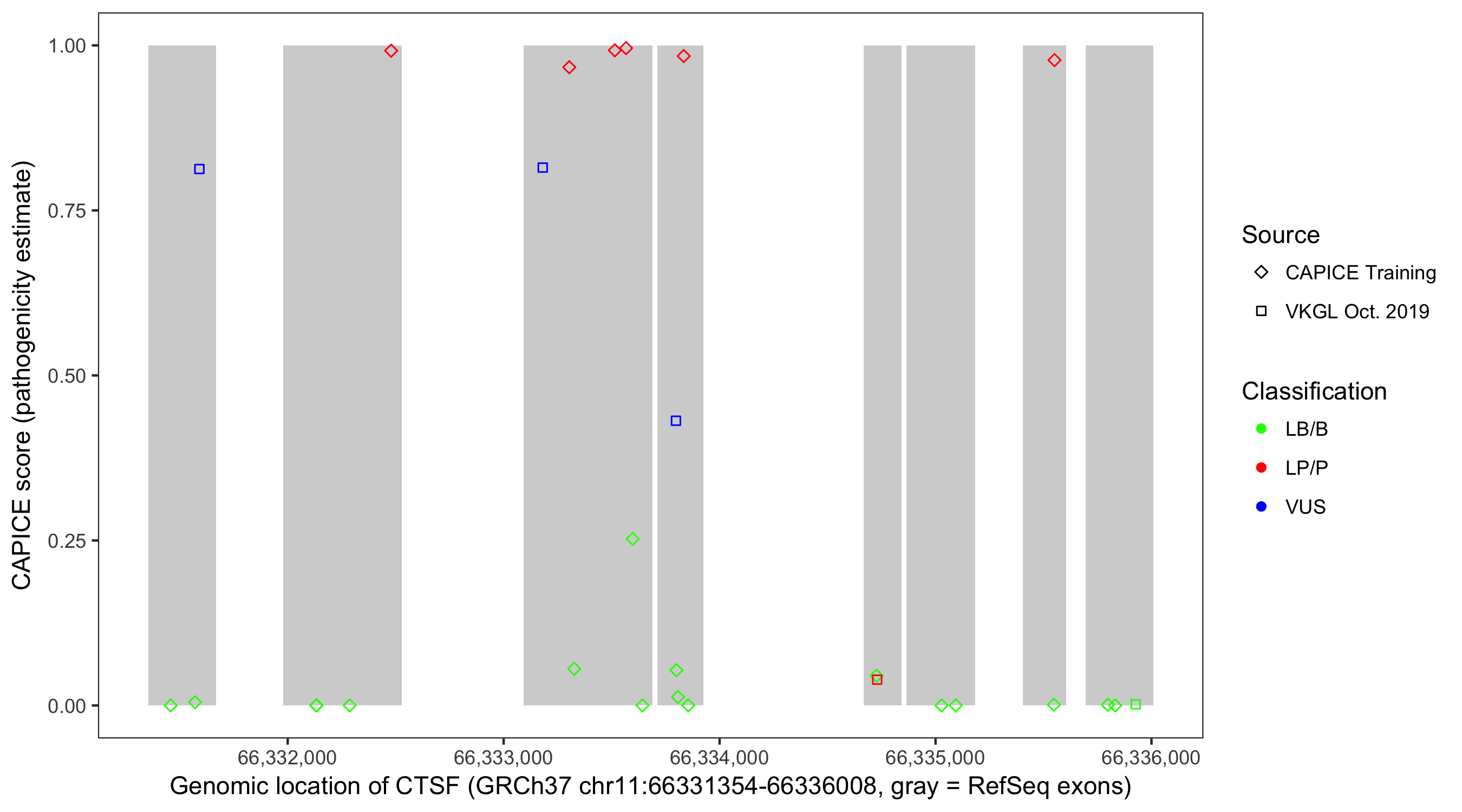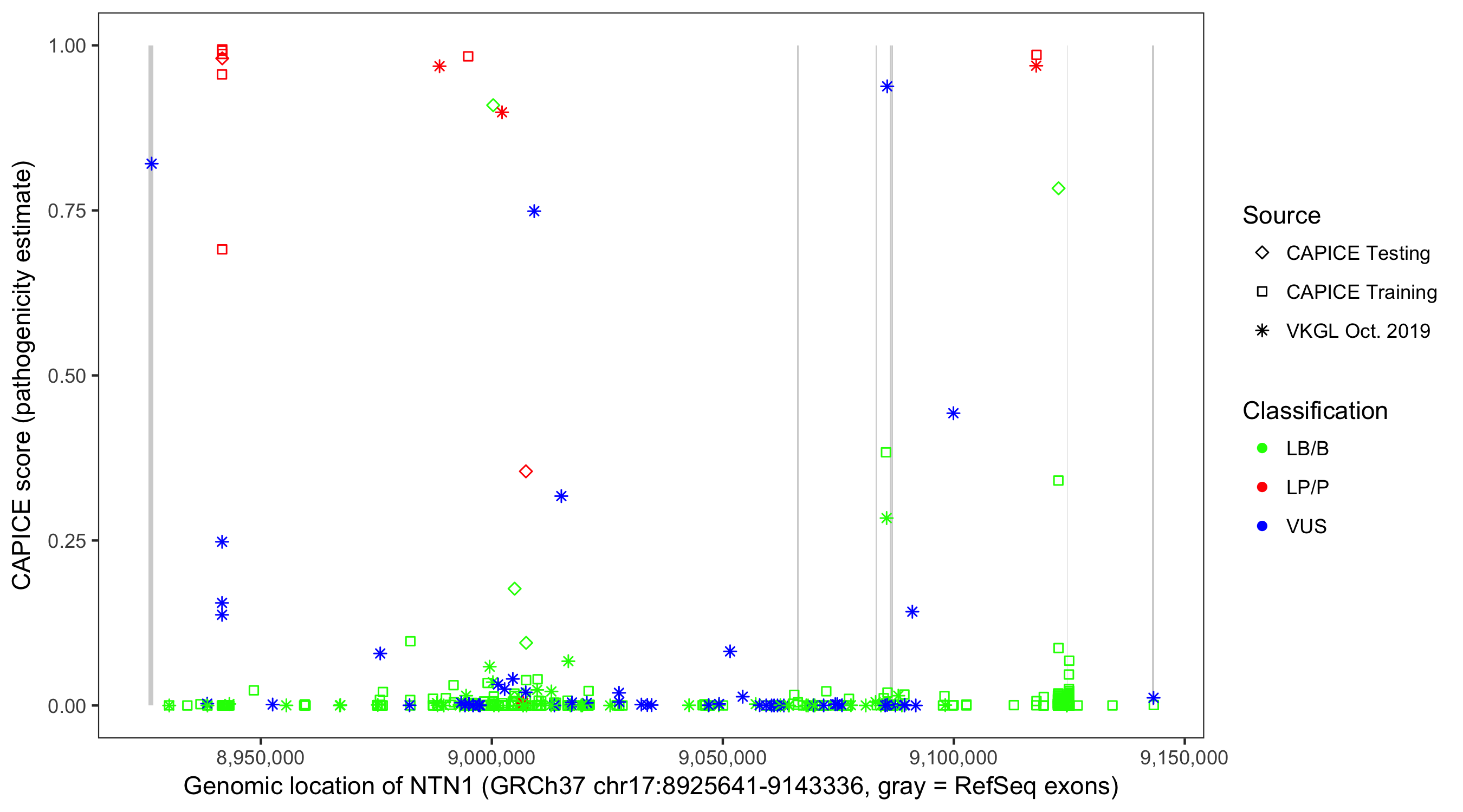 Shown are CAPICE train/test variants plus VKGL Oct 2019.
