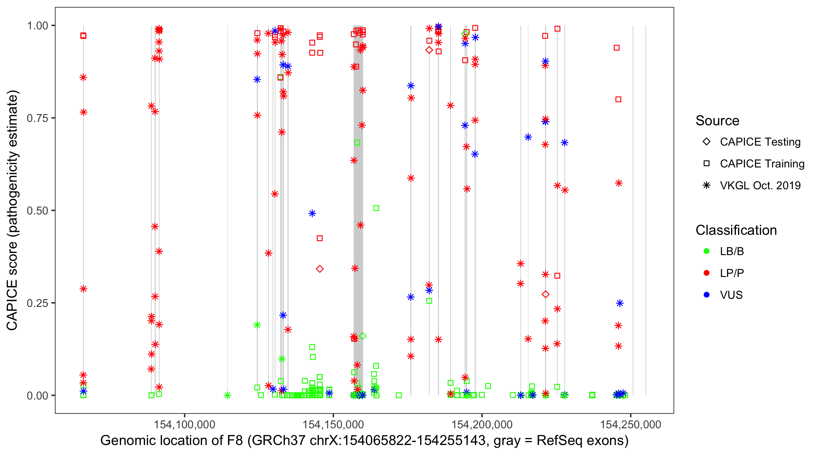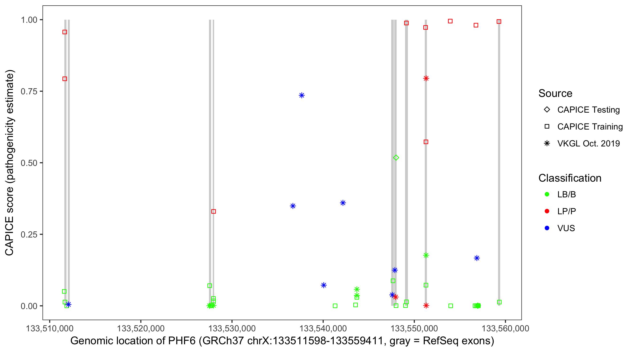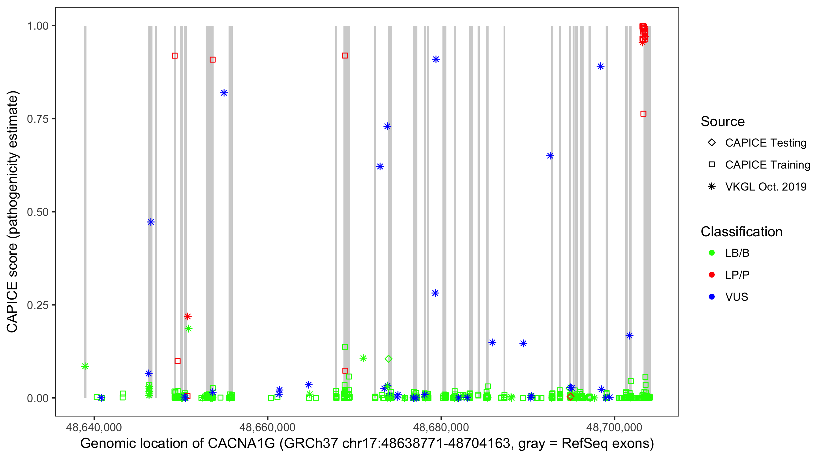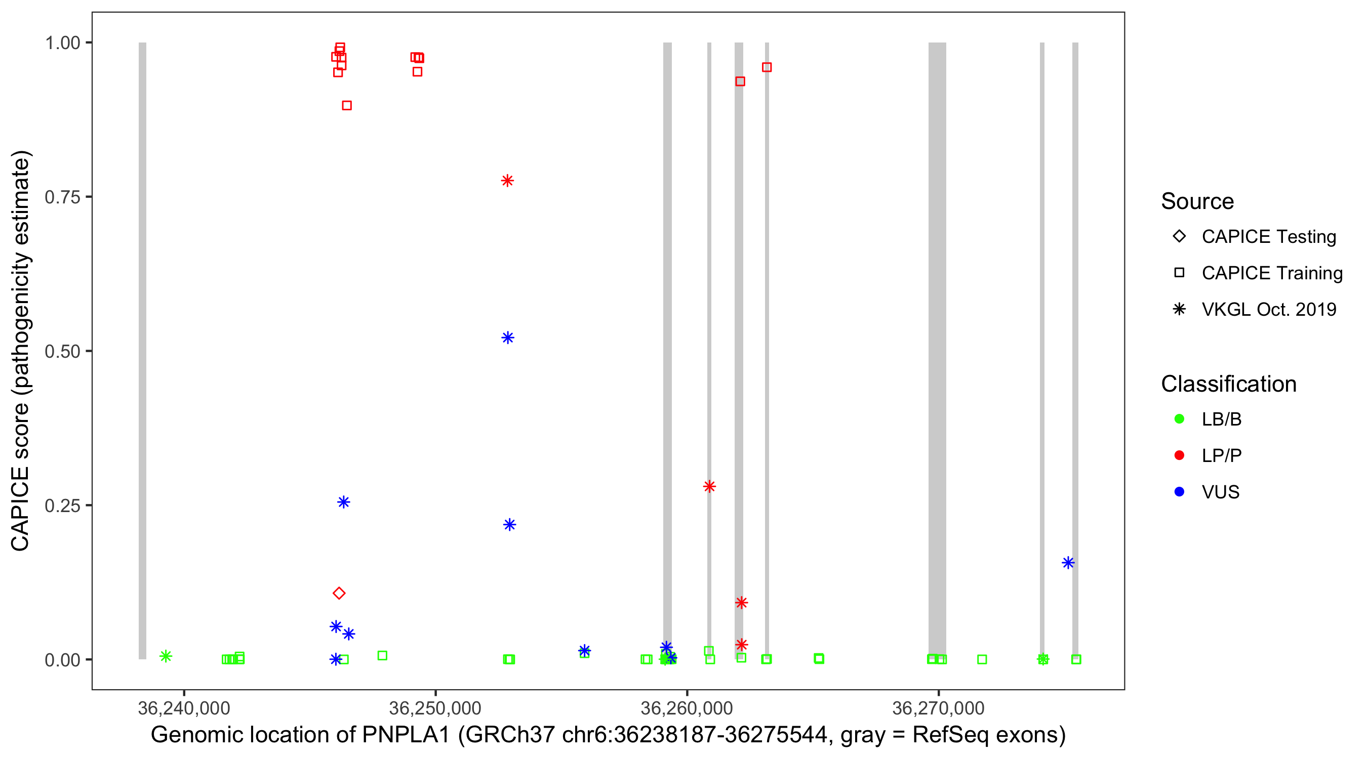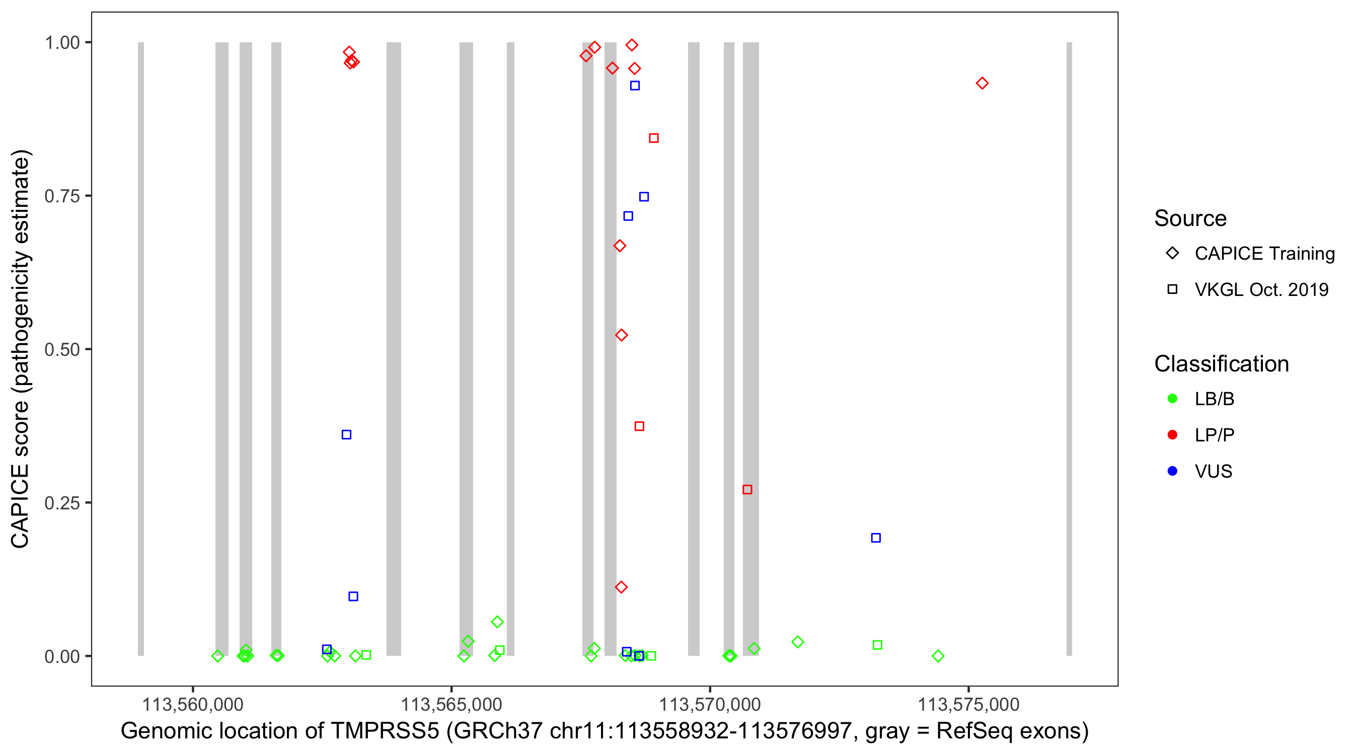 Shown are CAPICE train/test variants plus VKGL Oct 2019.