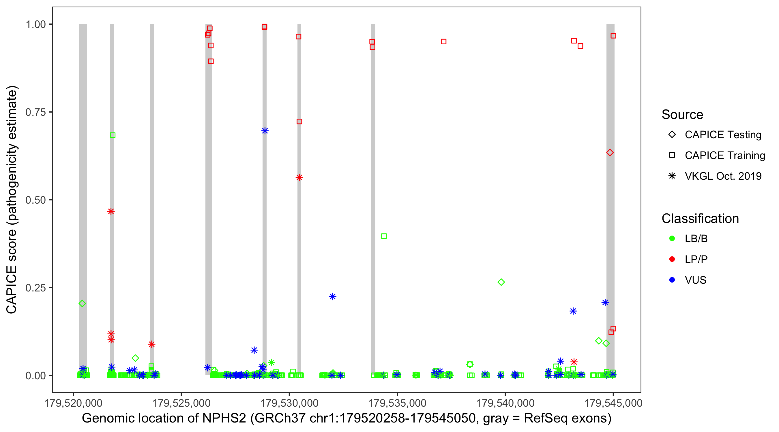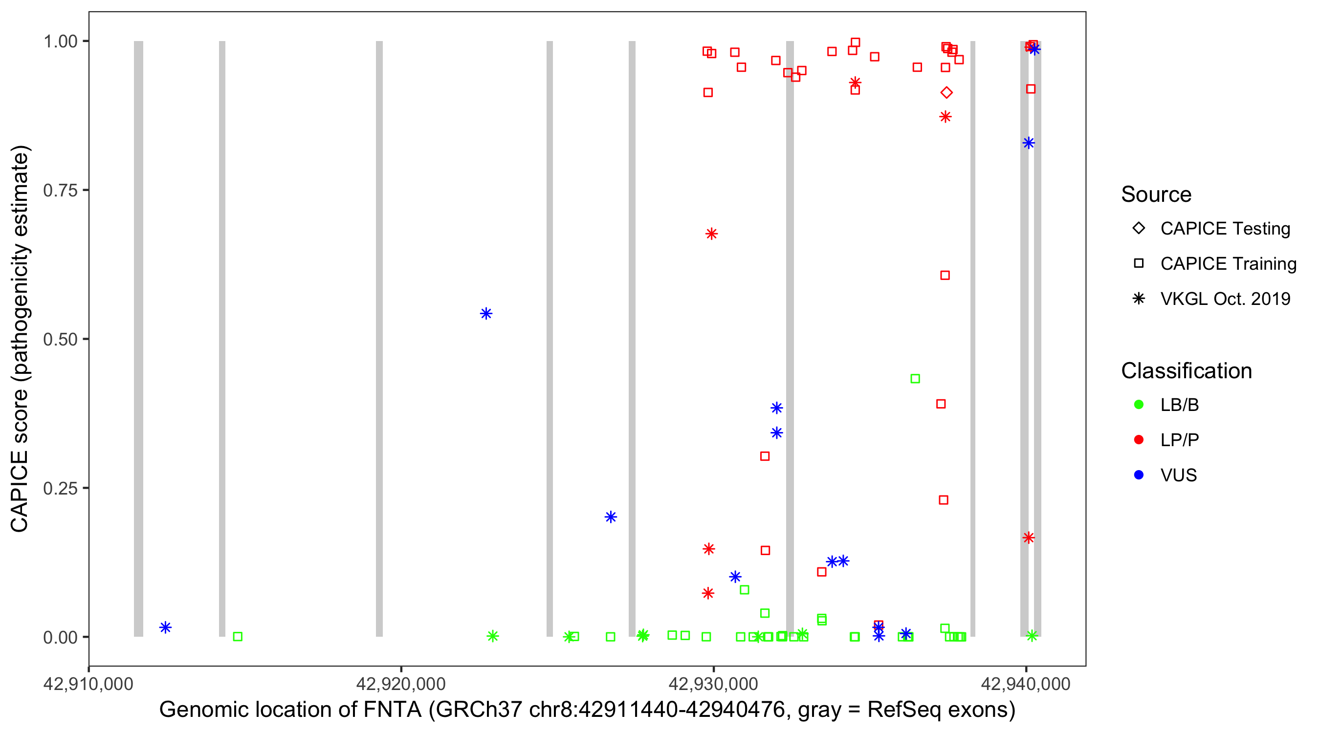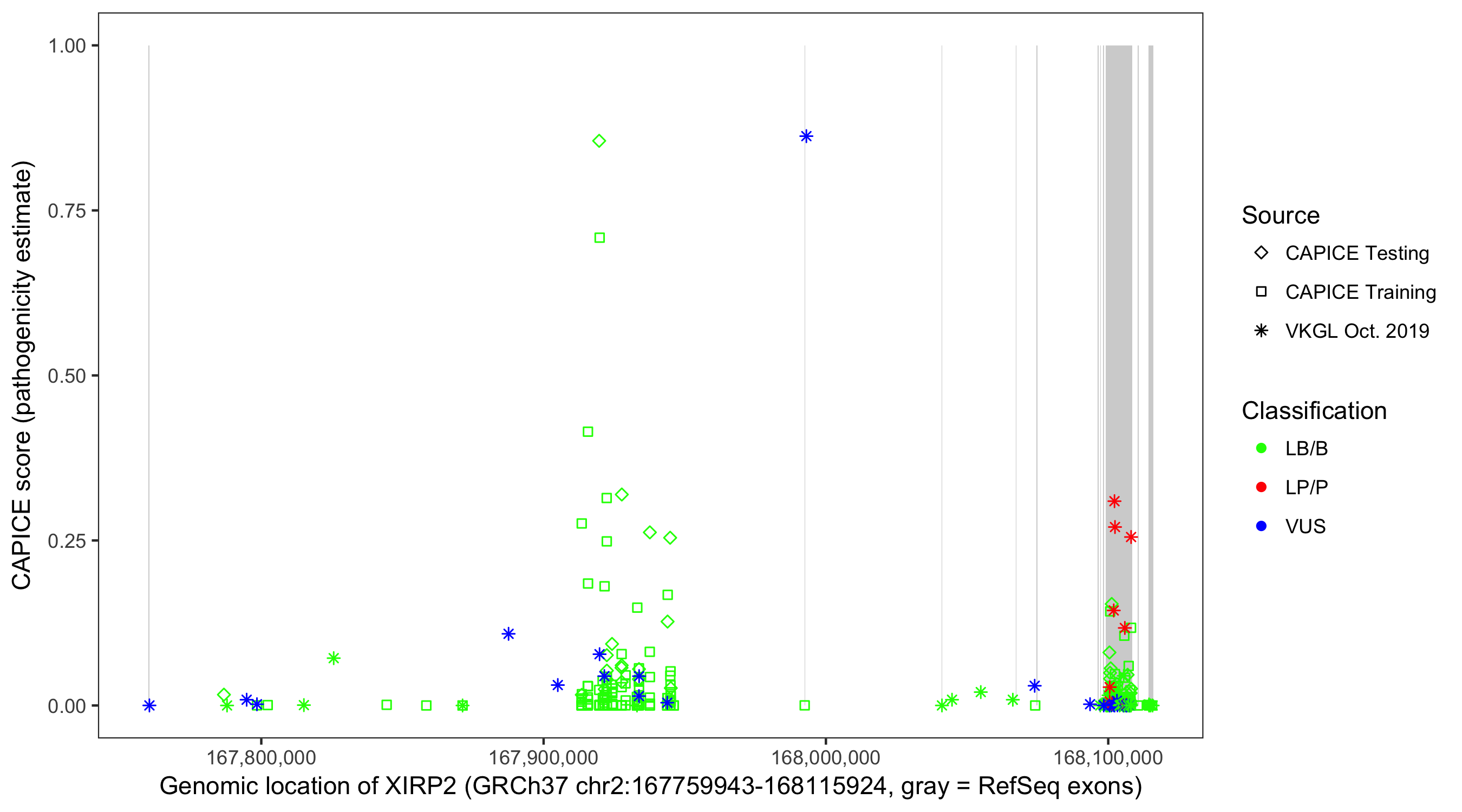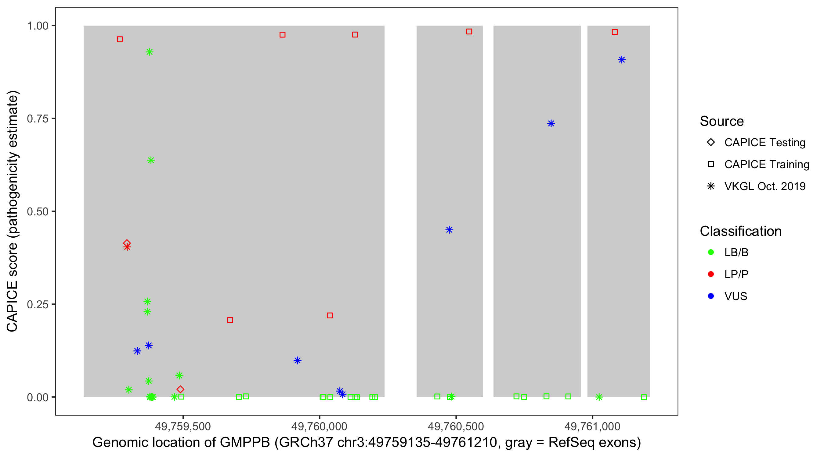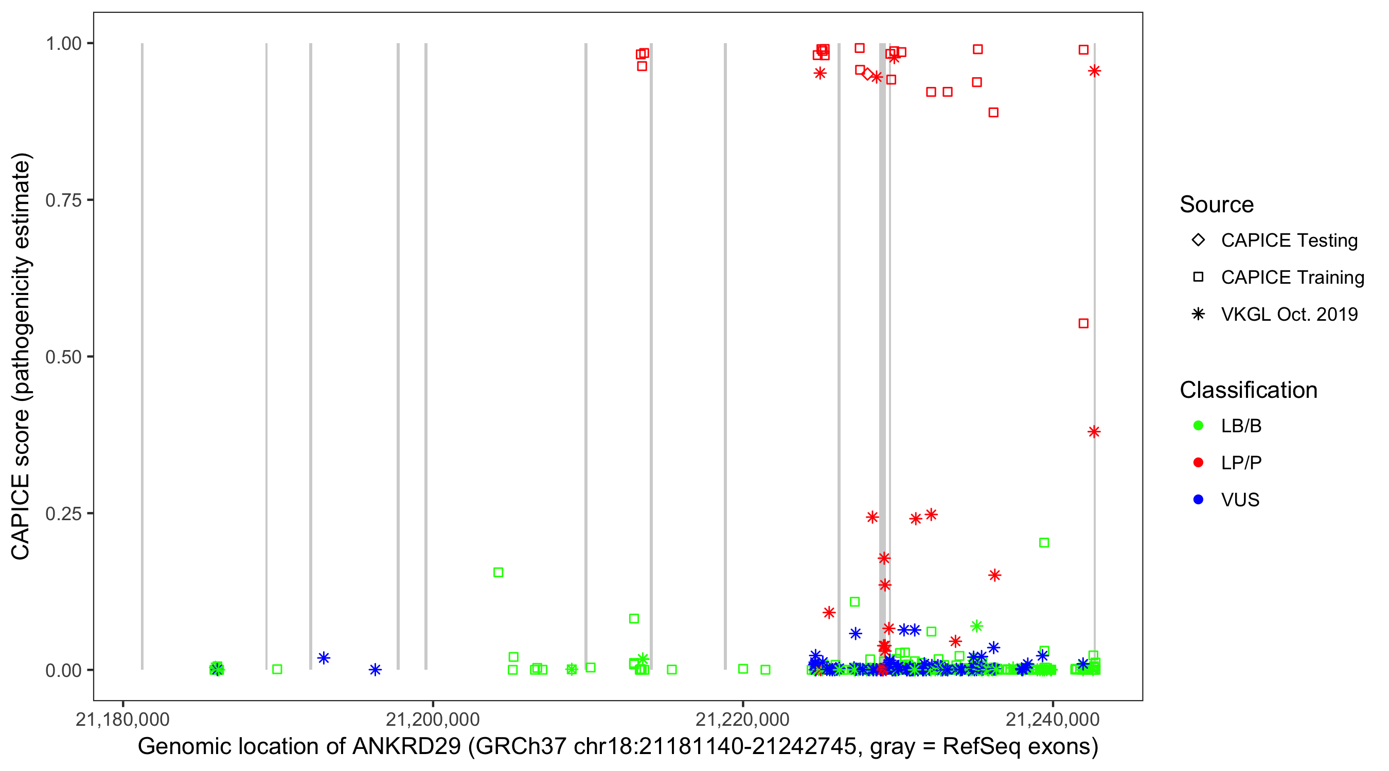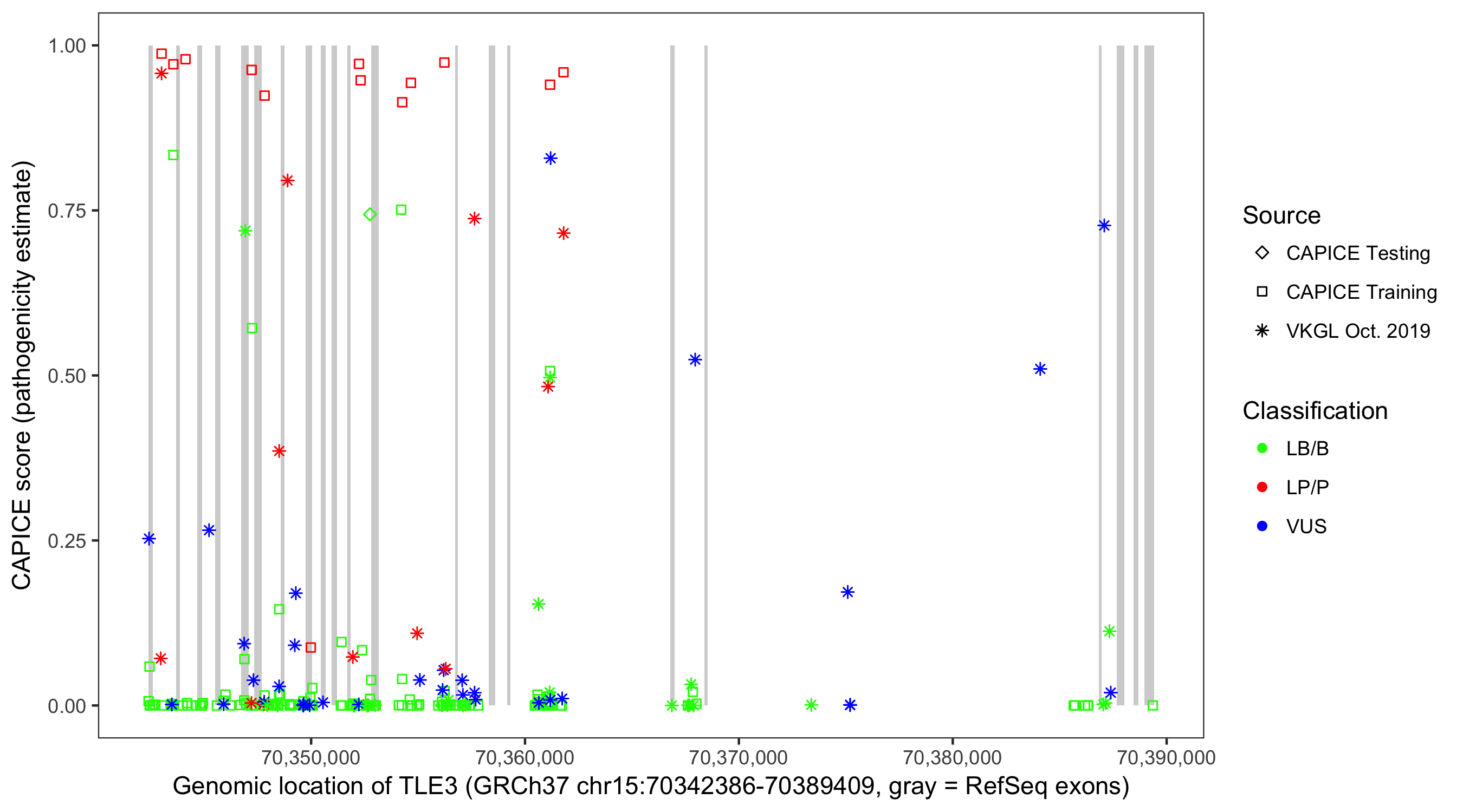 Shown are CAPICE train/test variants plus VKGL Oct 2019.