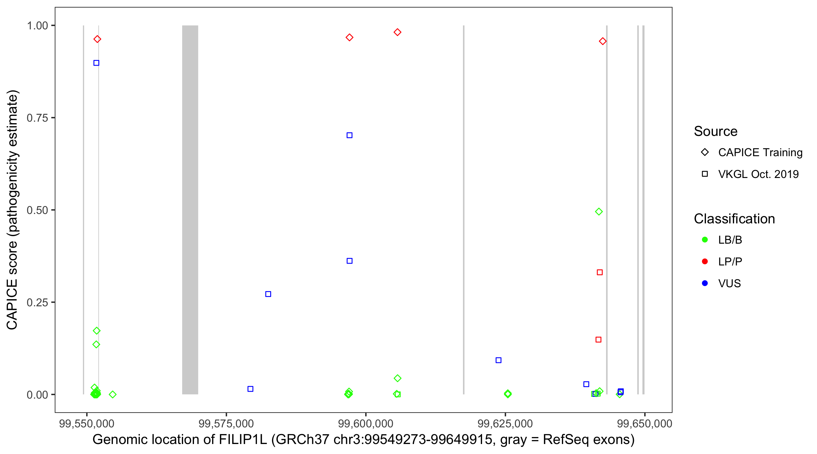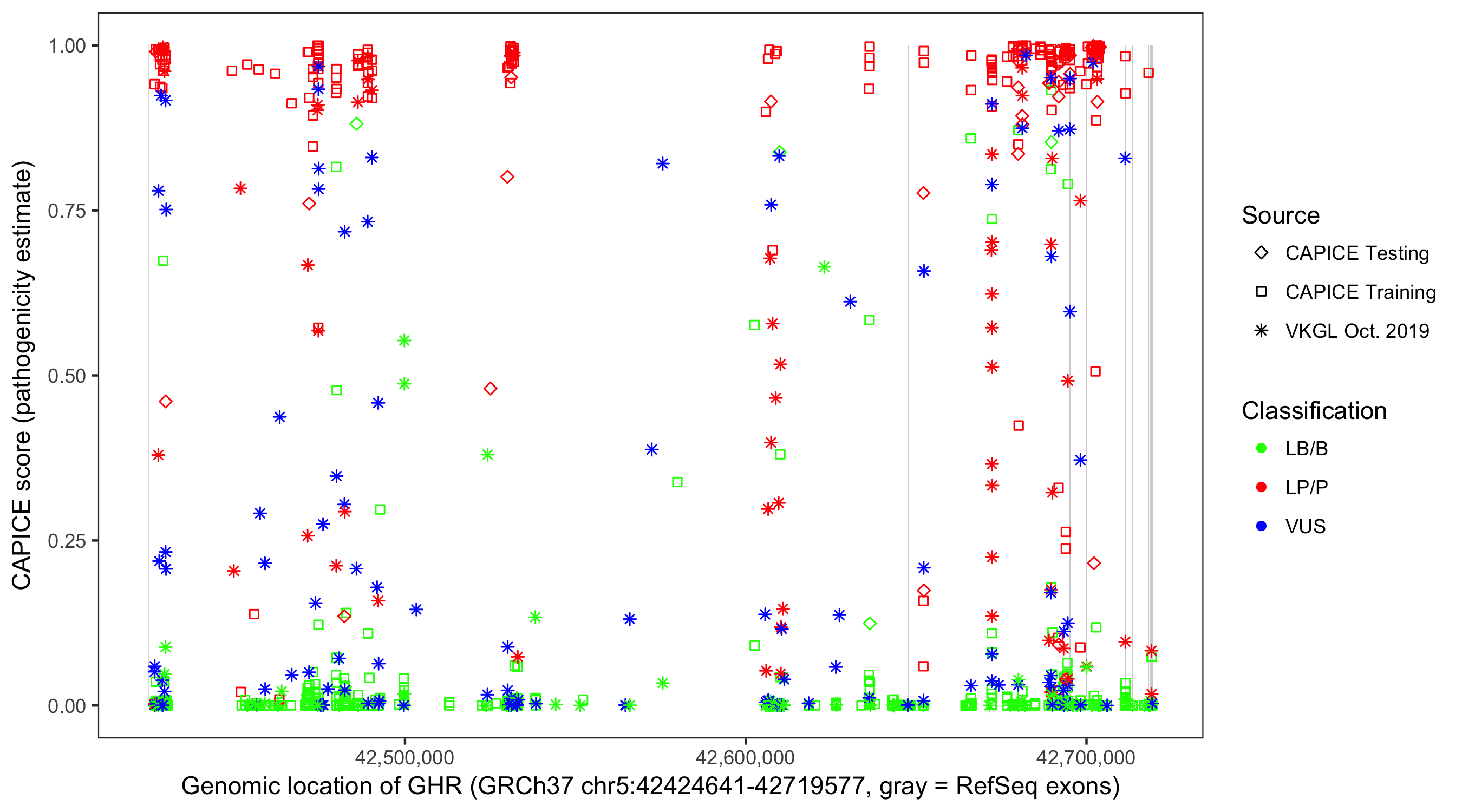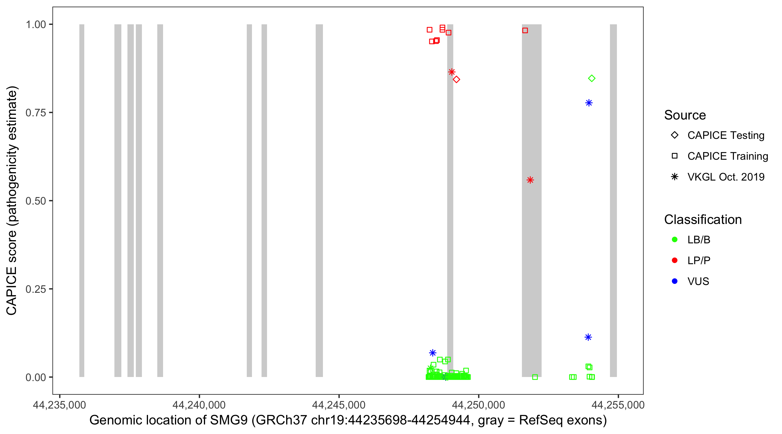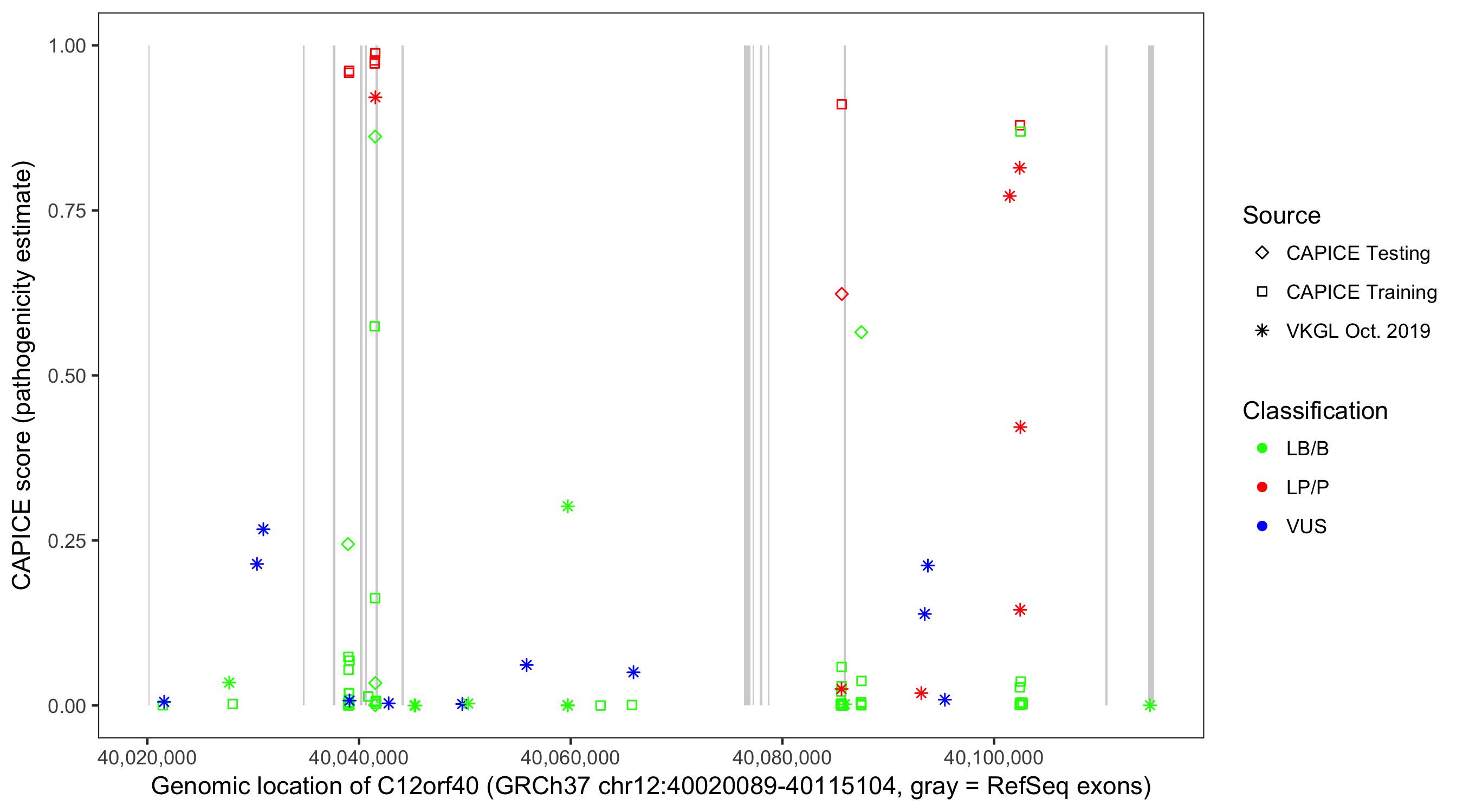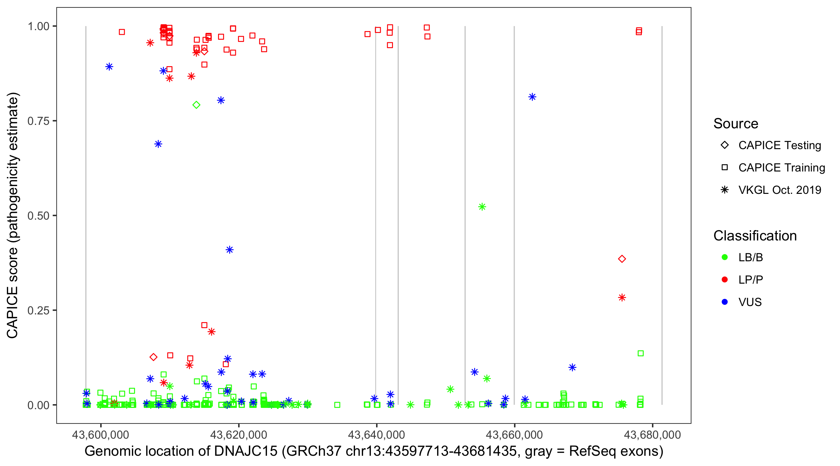 Shown are CAPICE train/test variants plus VKGL Oct 2019.