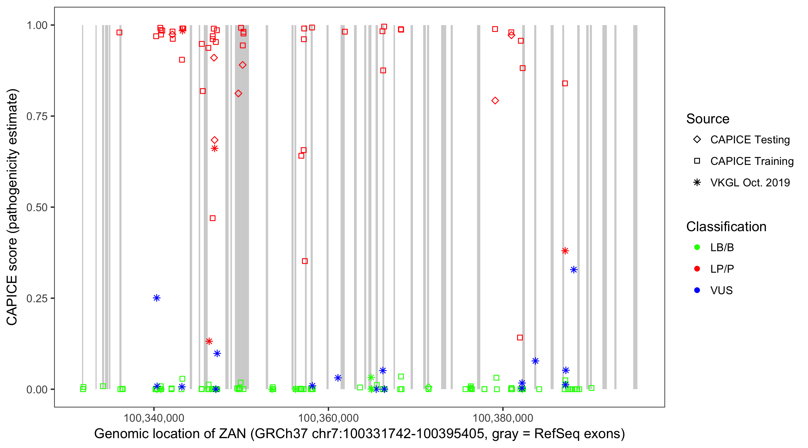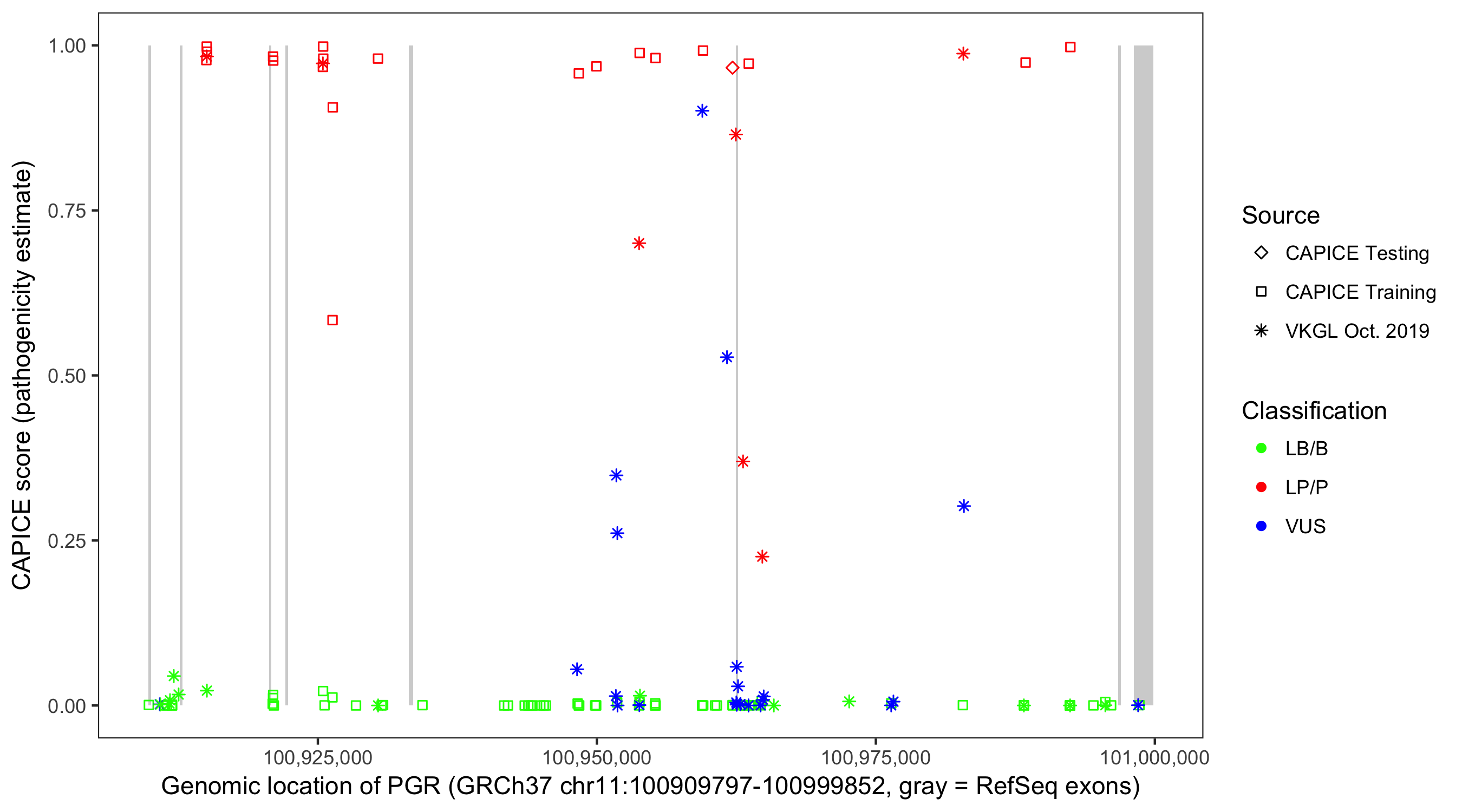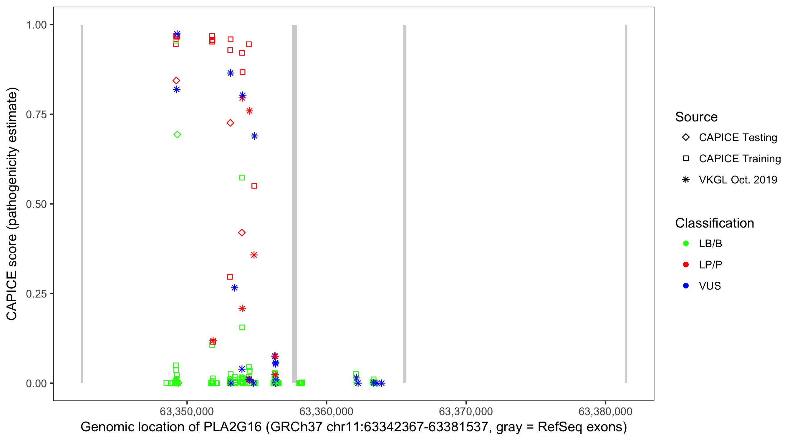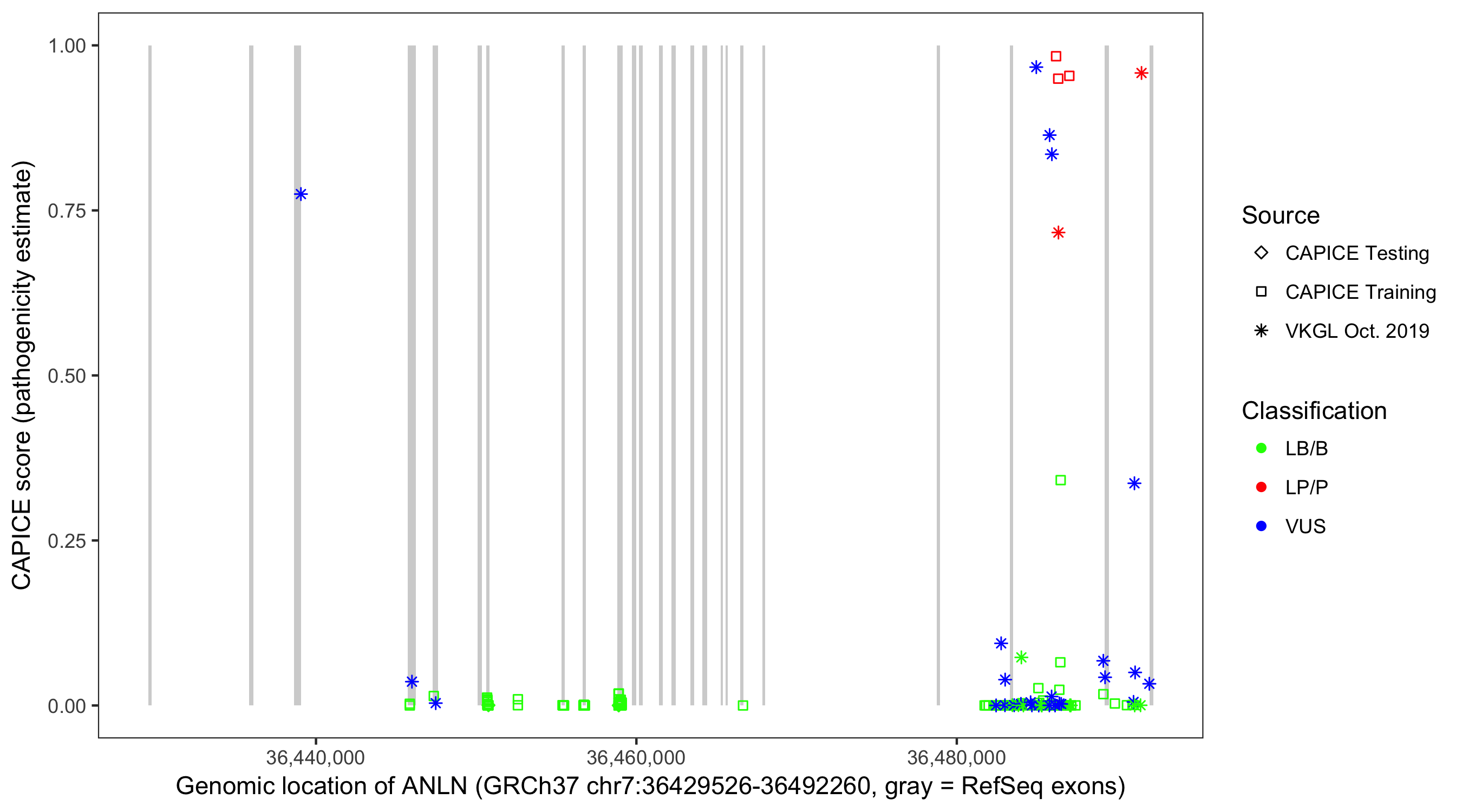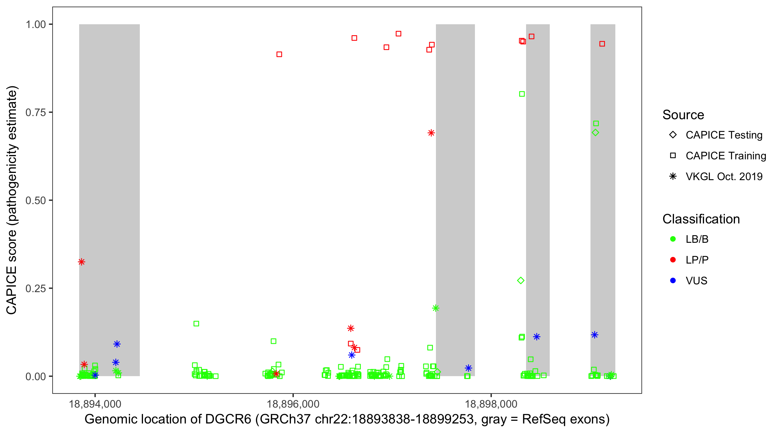 Shown are CAPICE train/test variants plus VKGL Oct 2019.