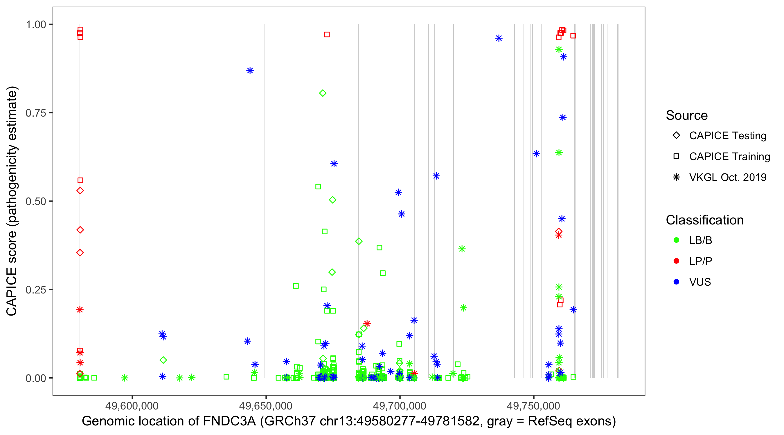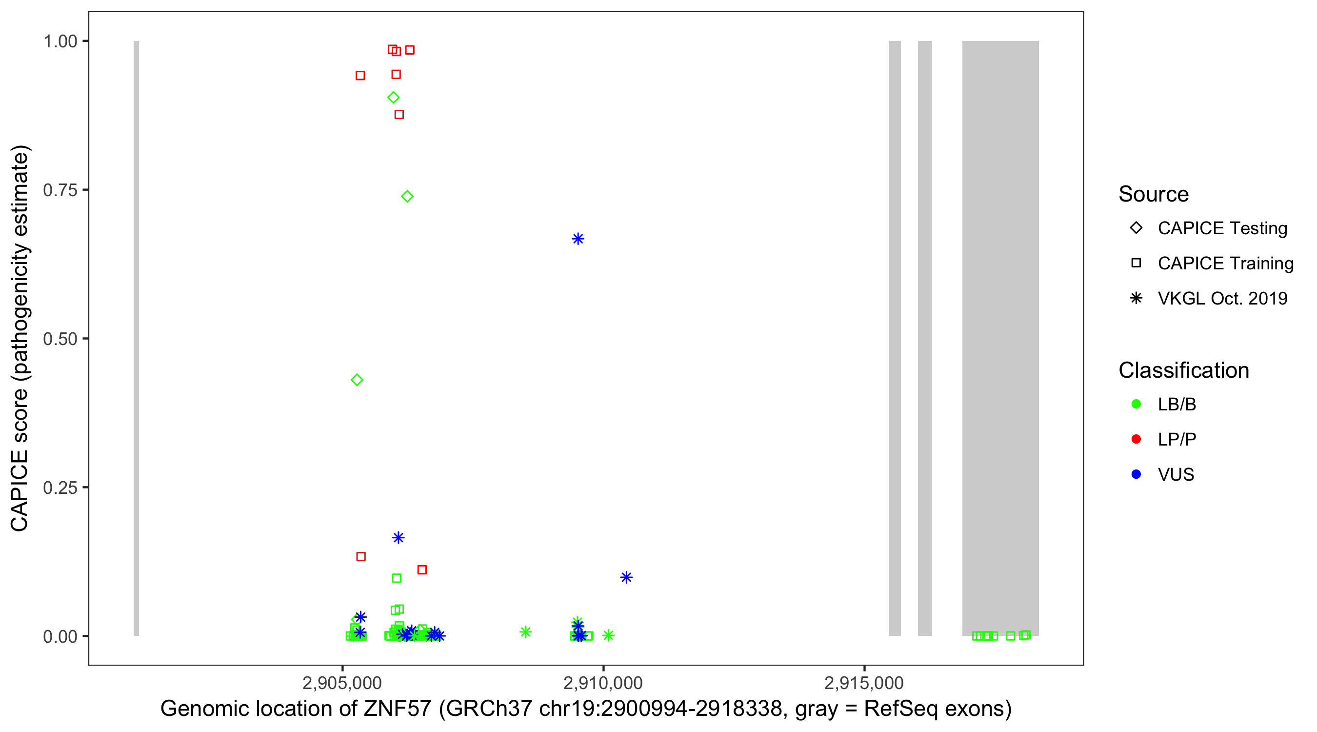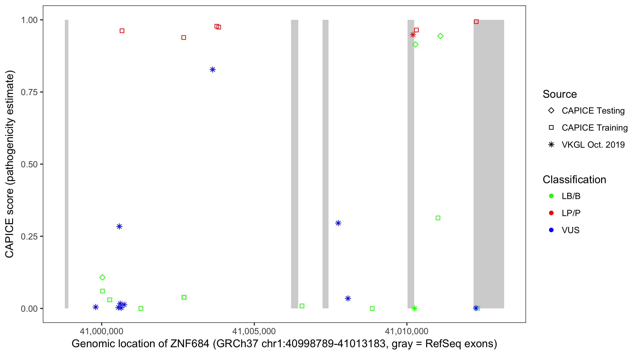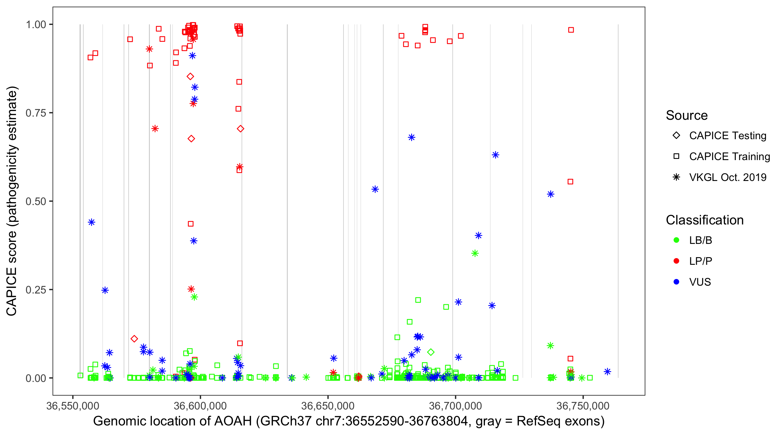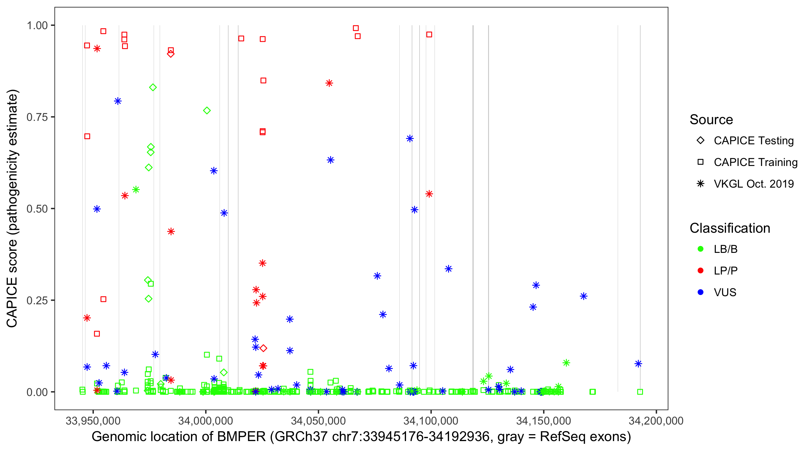 Shown are CAPICE train/test variants plus VKGL Oct 2019.