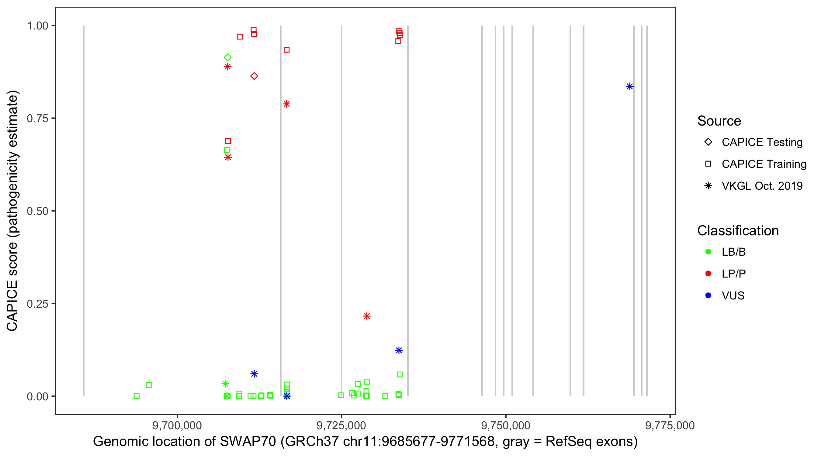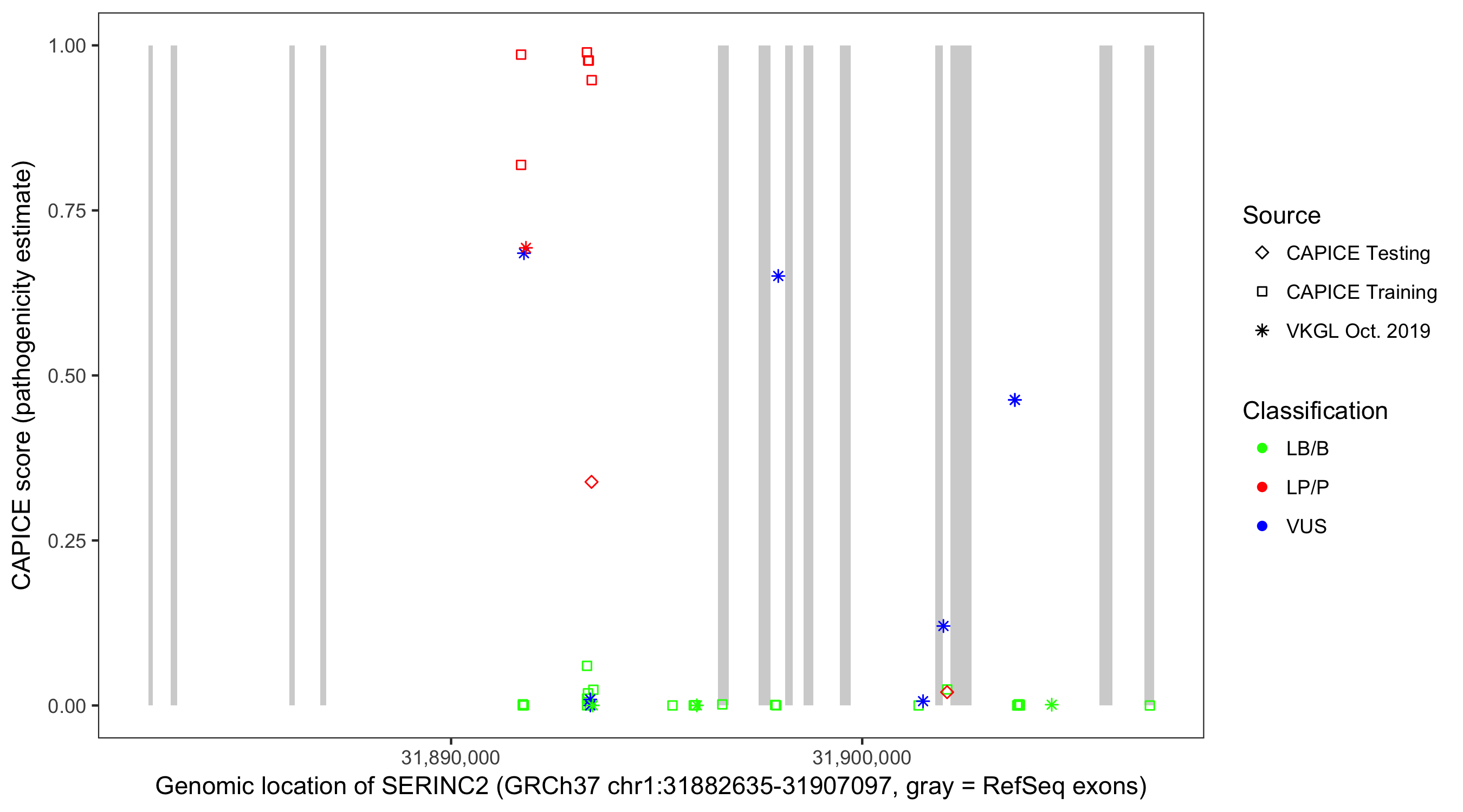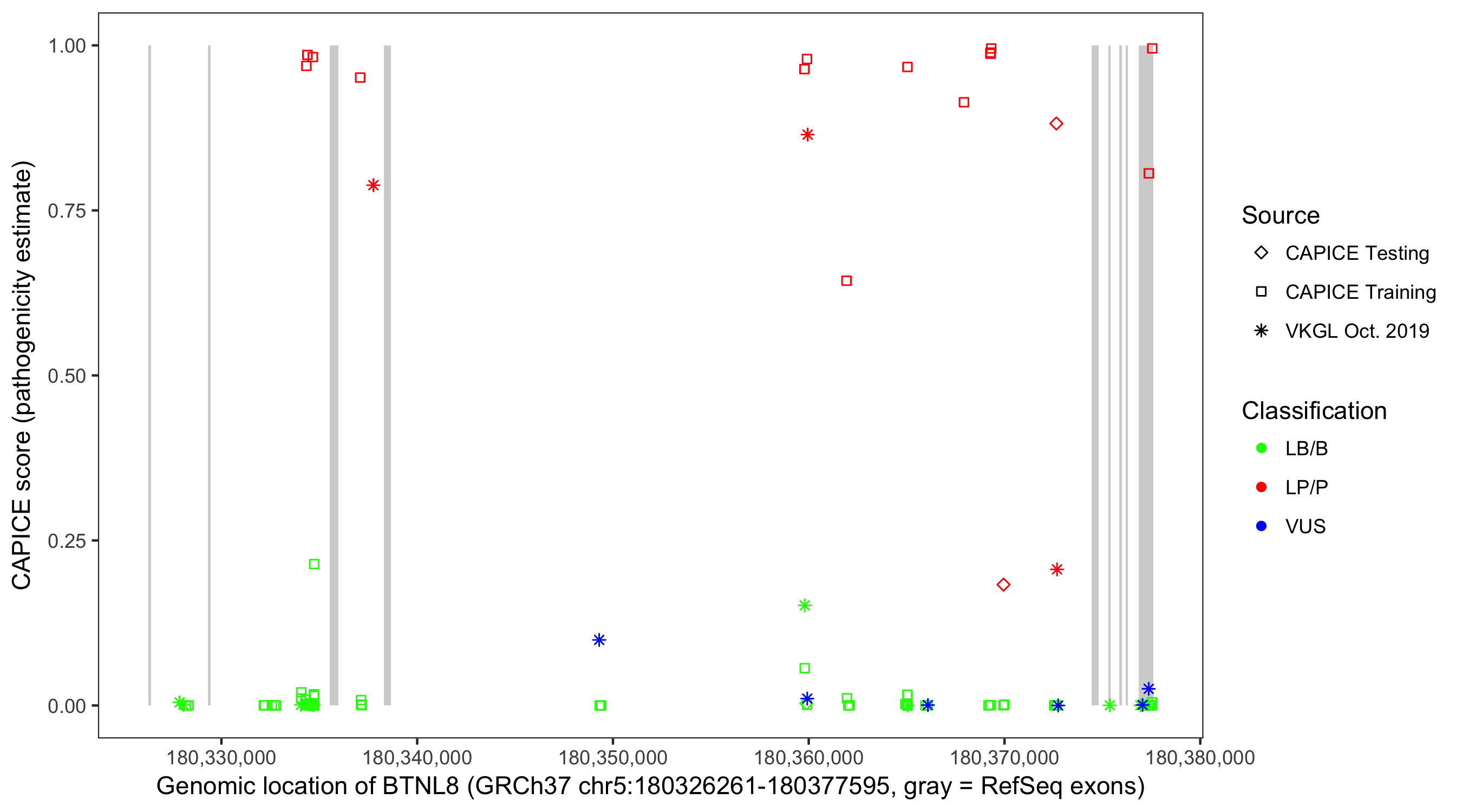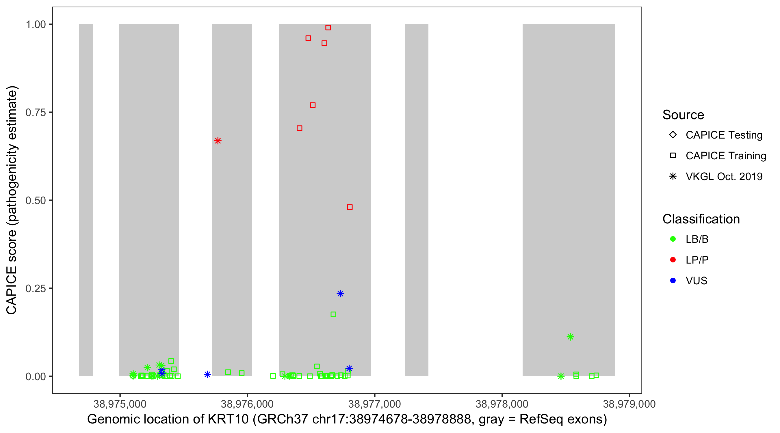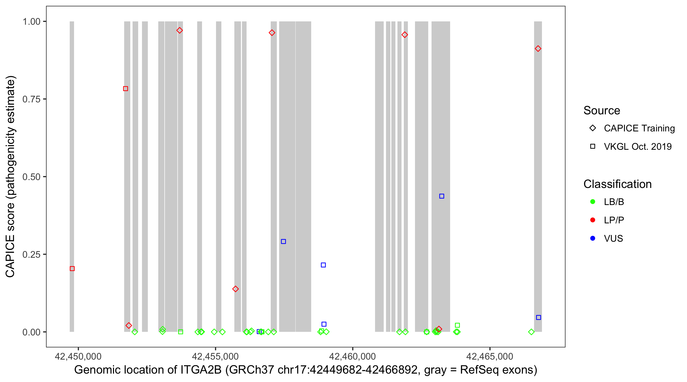 Shown are CAPICE train/test variants plus VKGL Oct 2019.