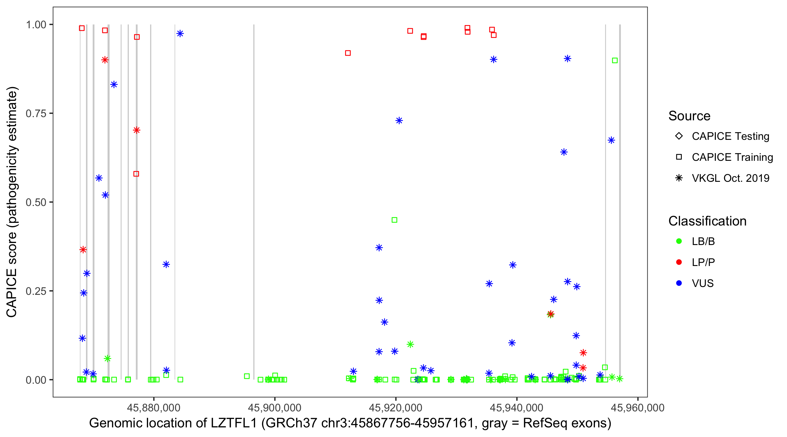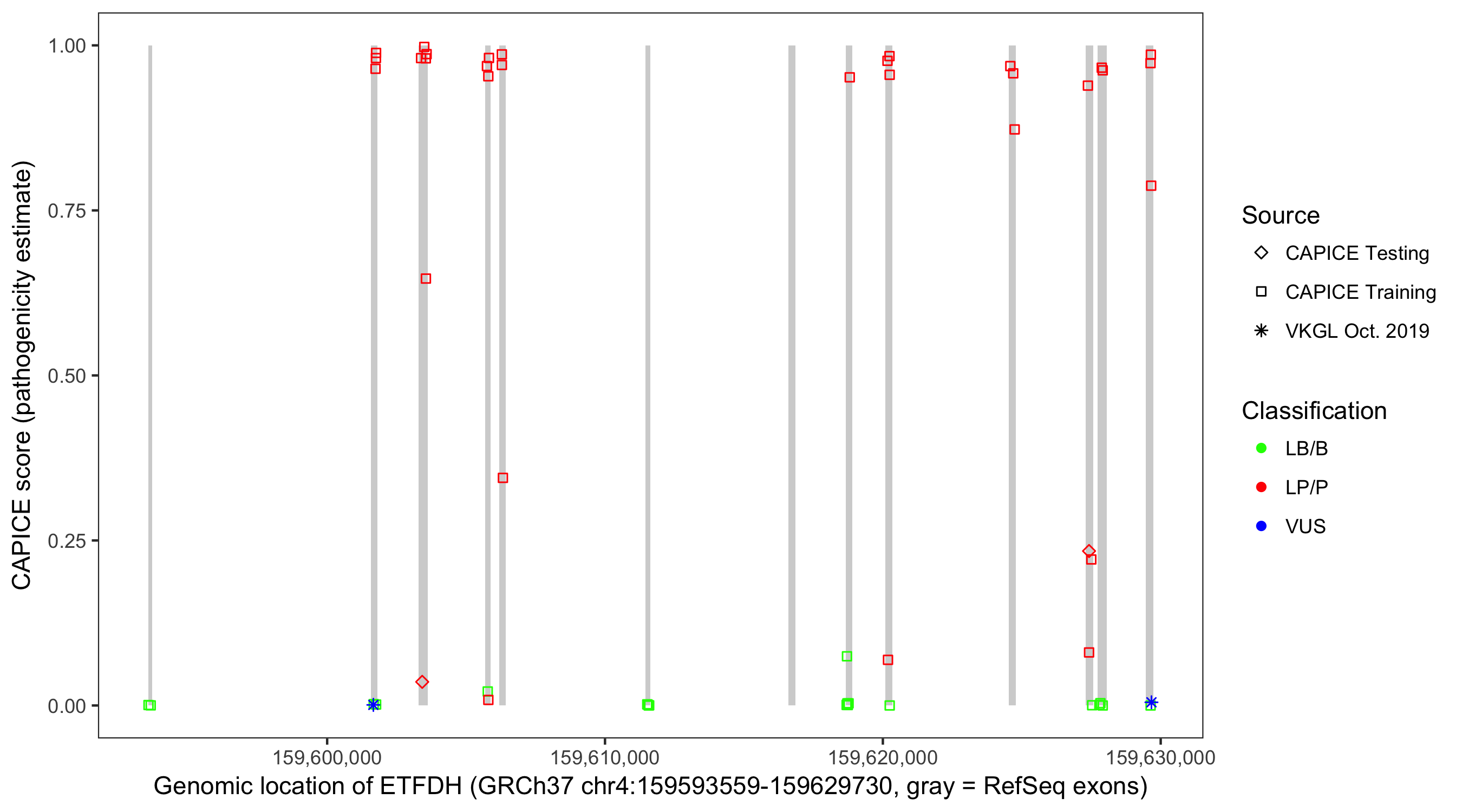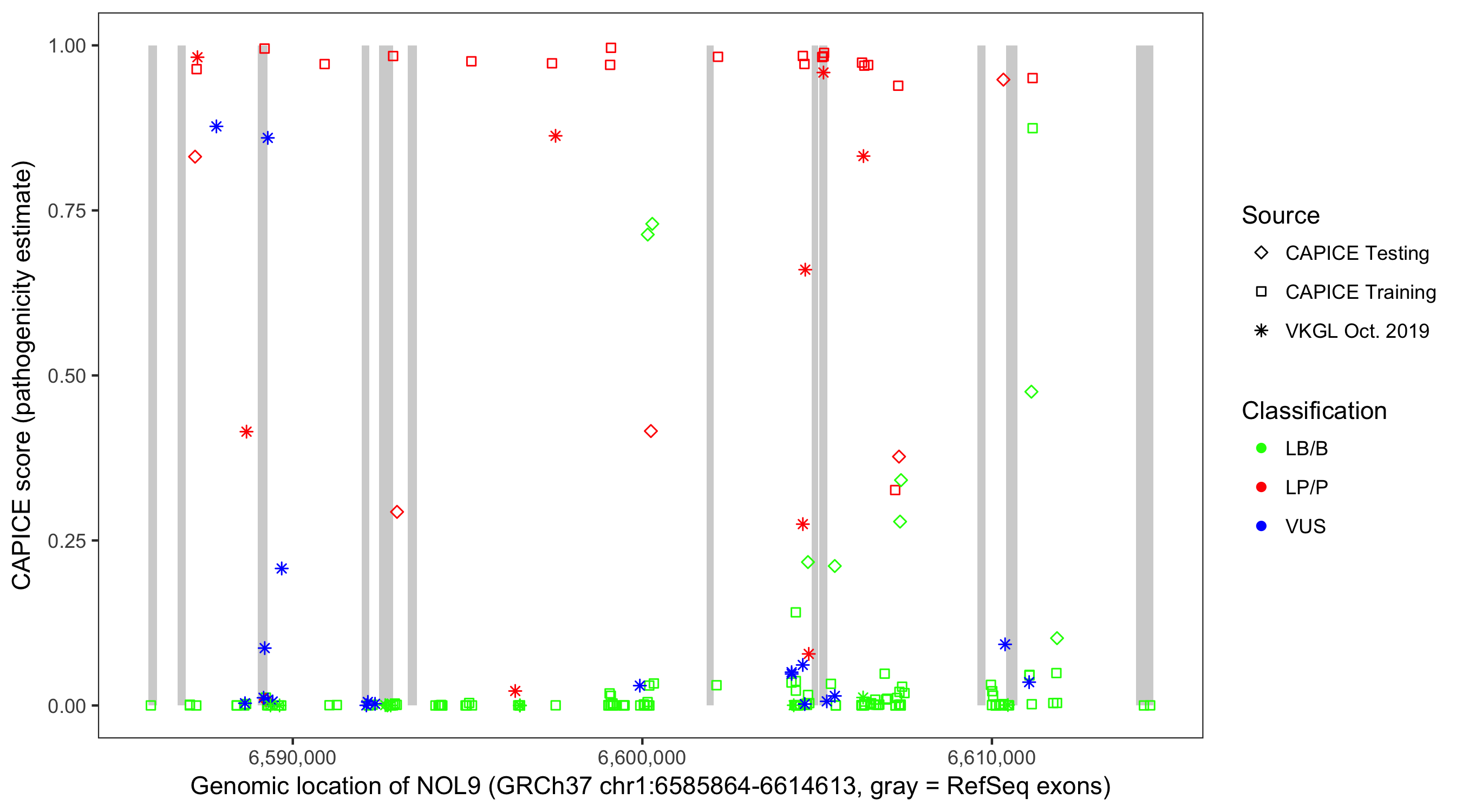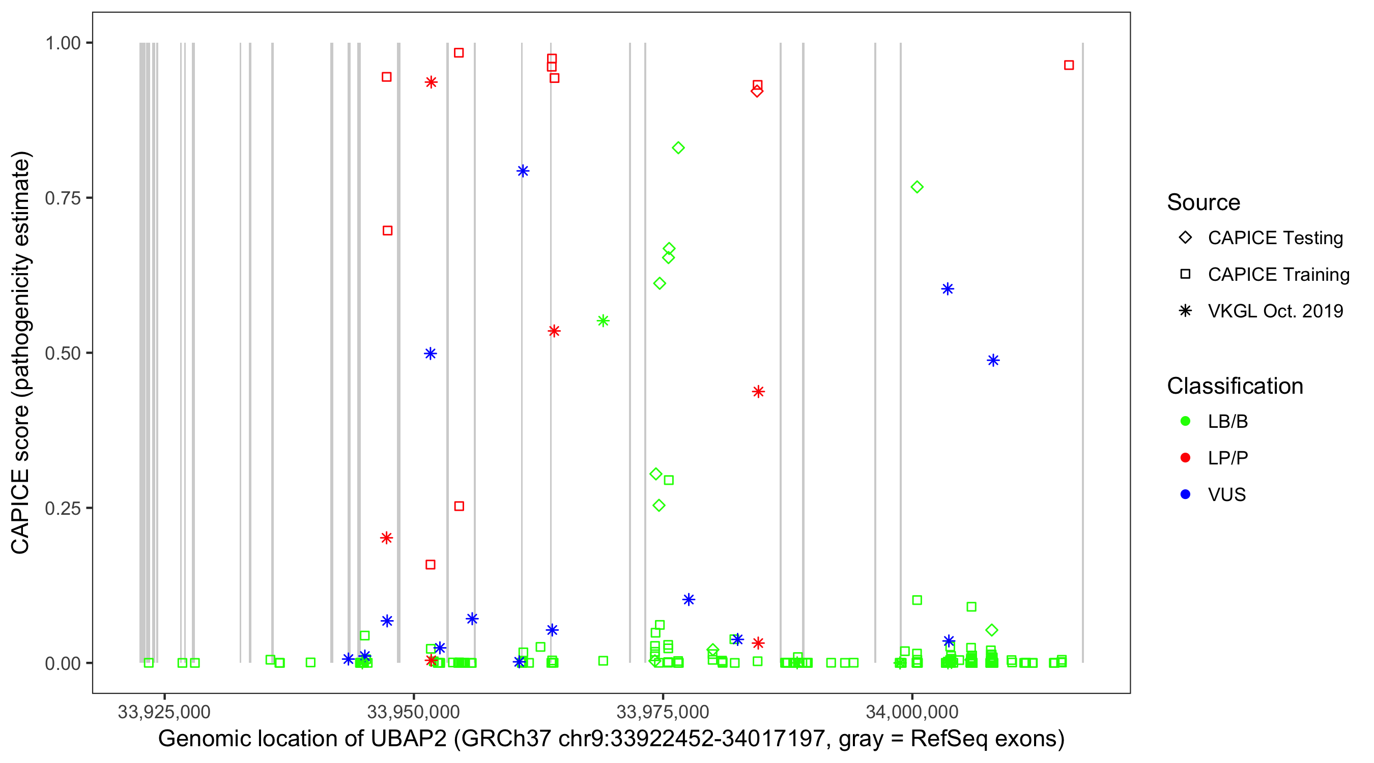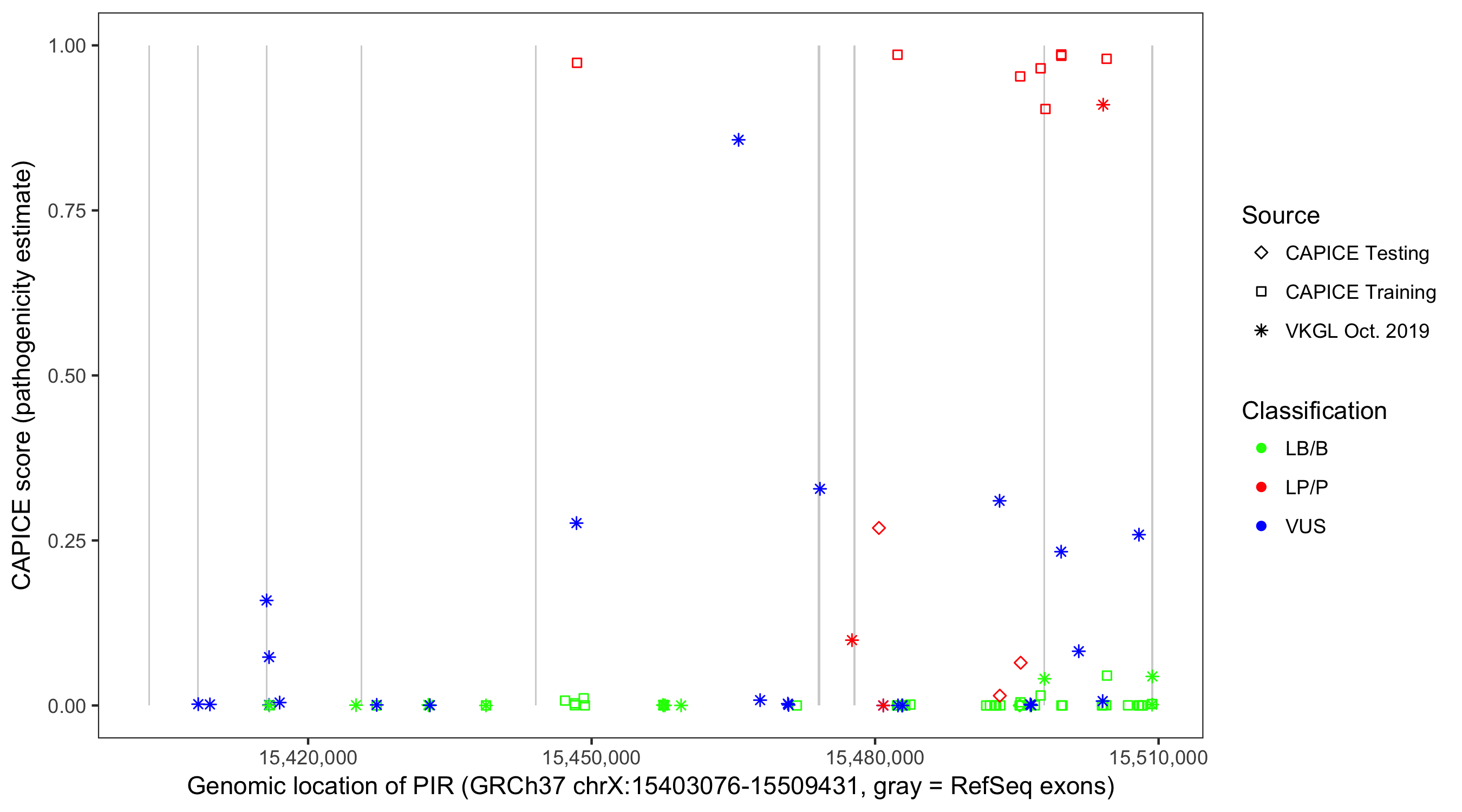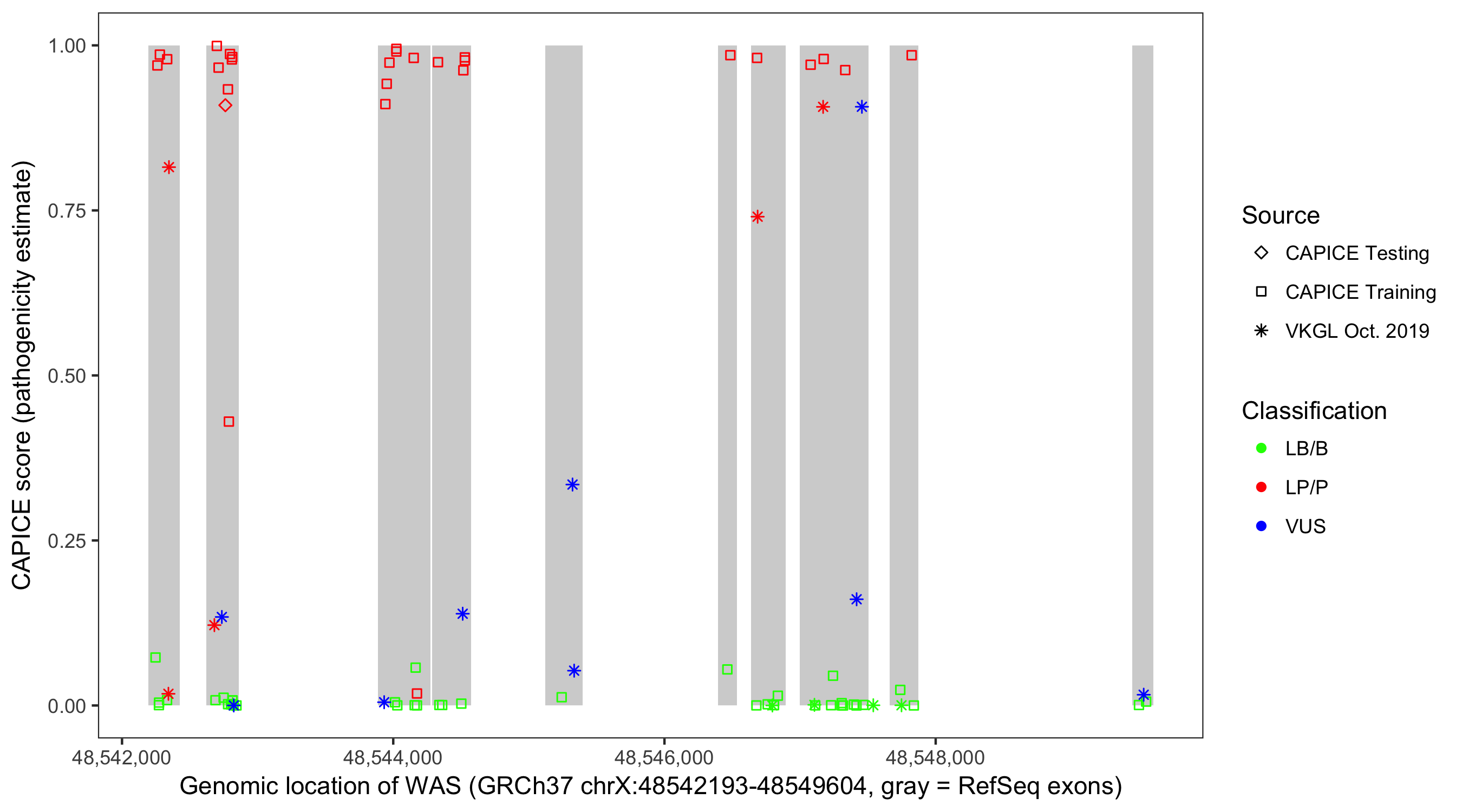 Shown are CAPICE train/test variants plus VKGL Oct 2019.