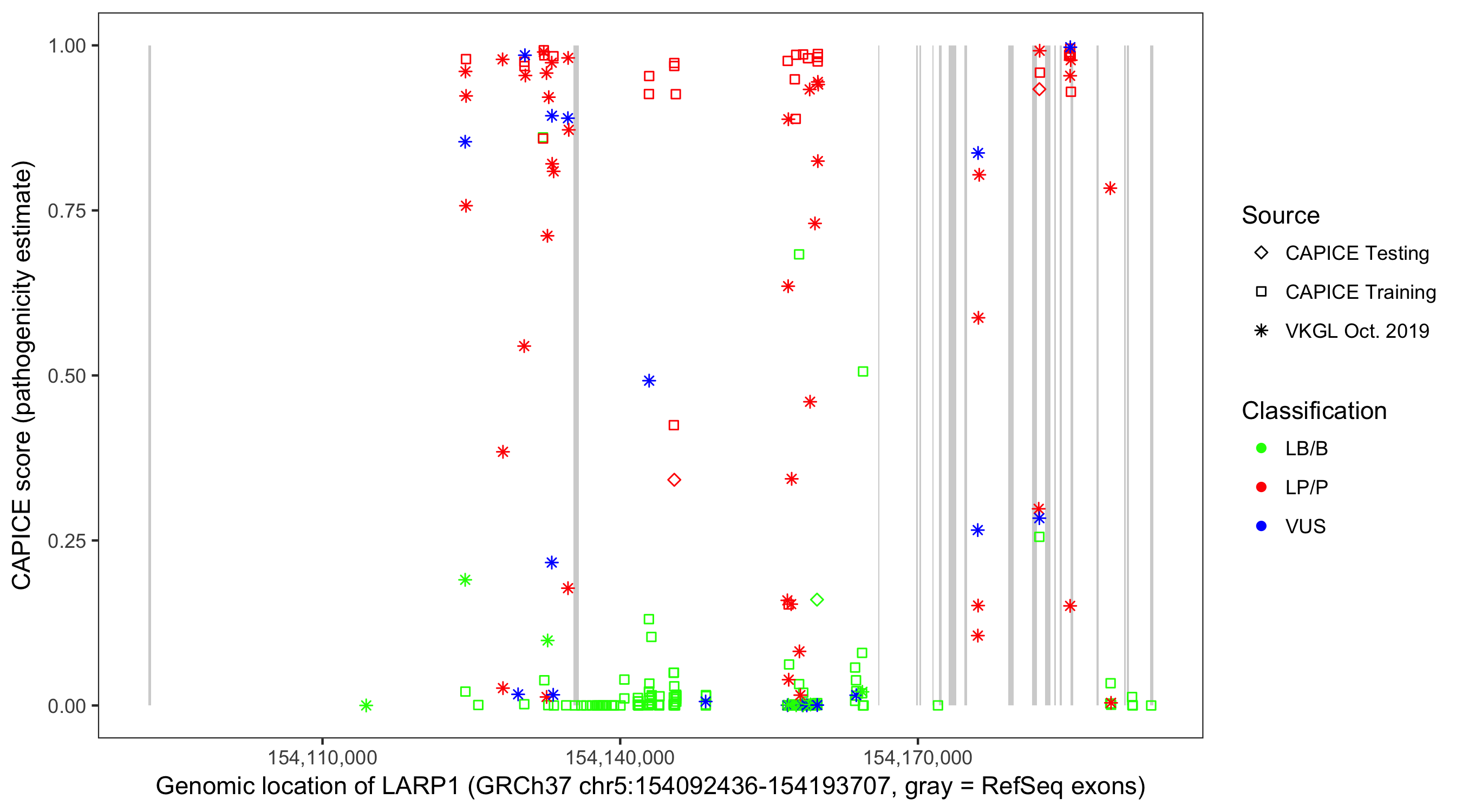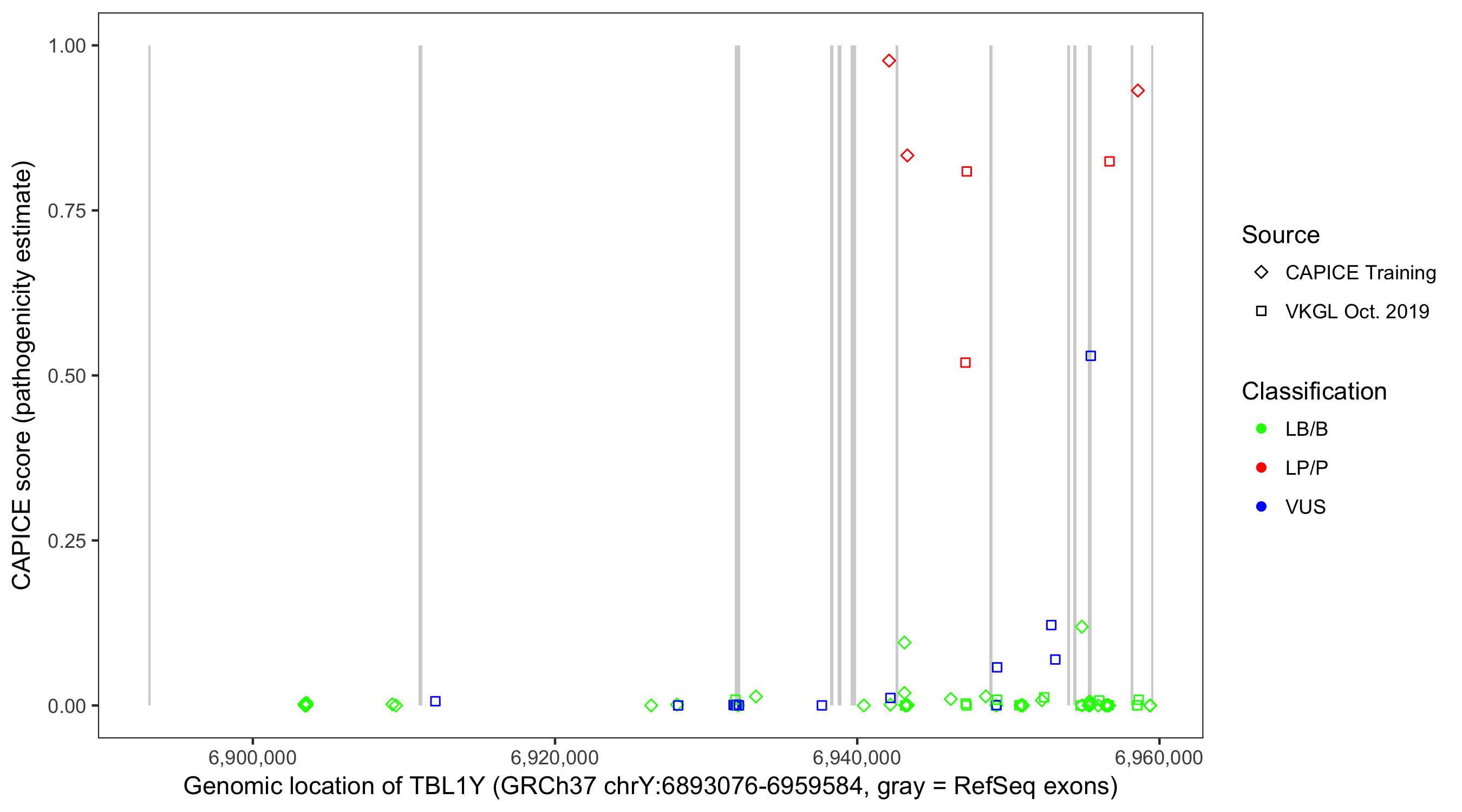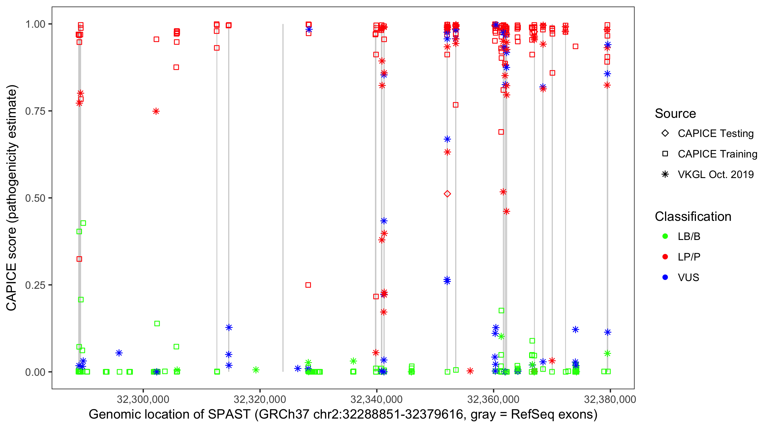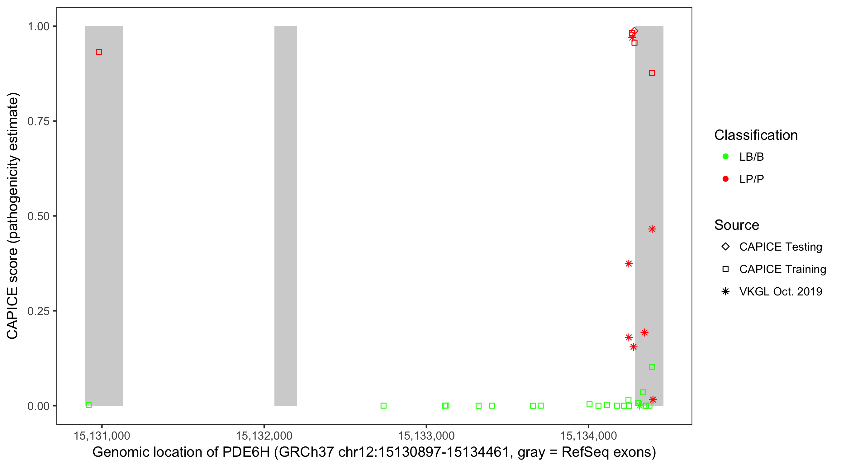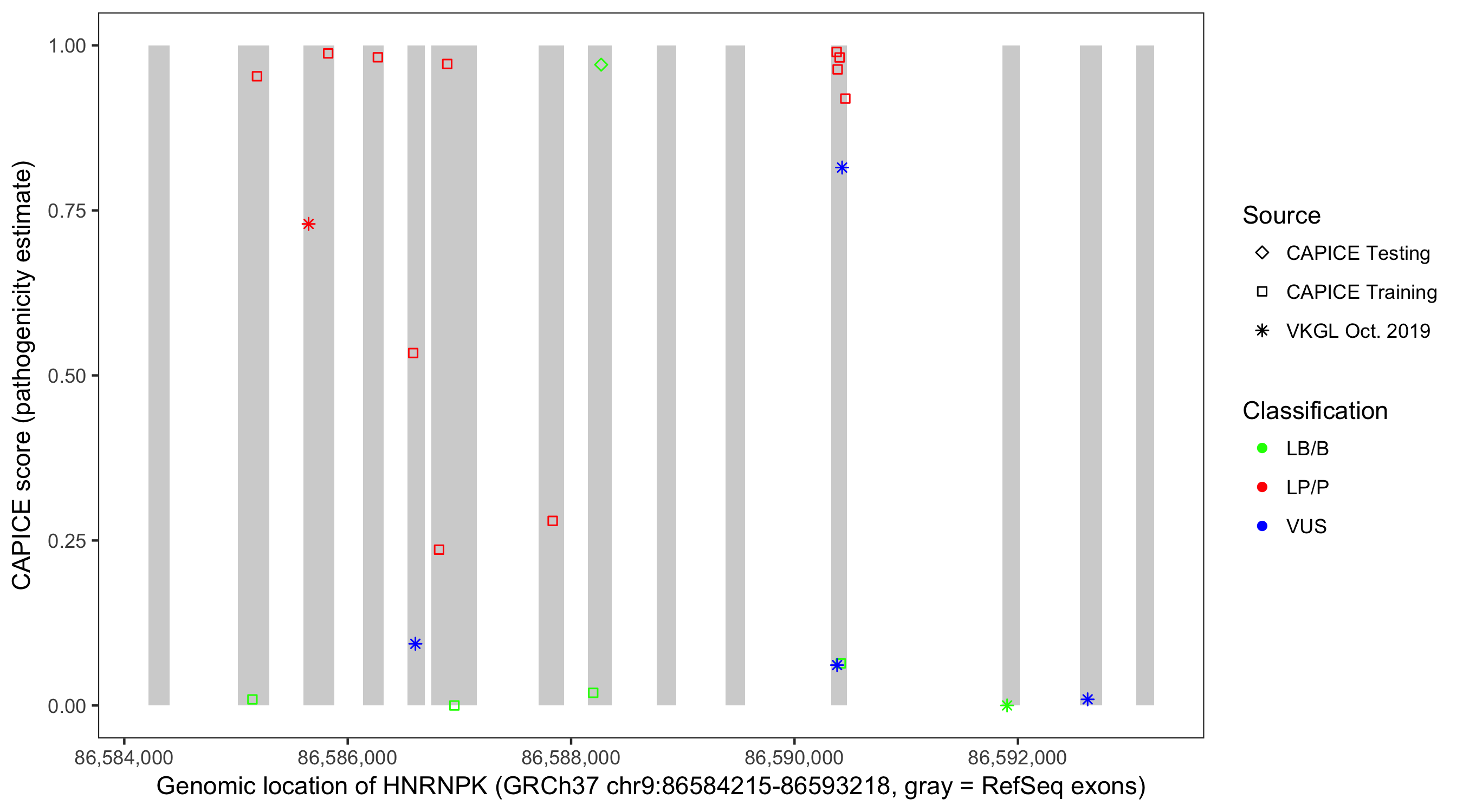 Shown are CAPICE train/test variants plus VKGL Oct 2019.