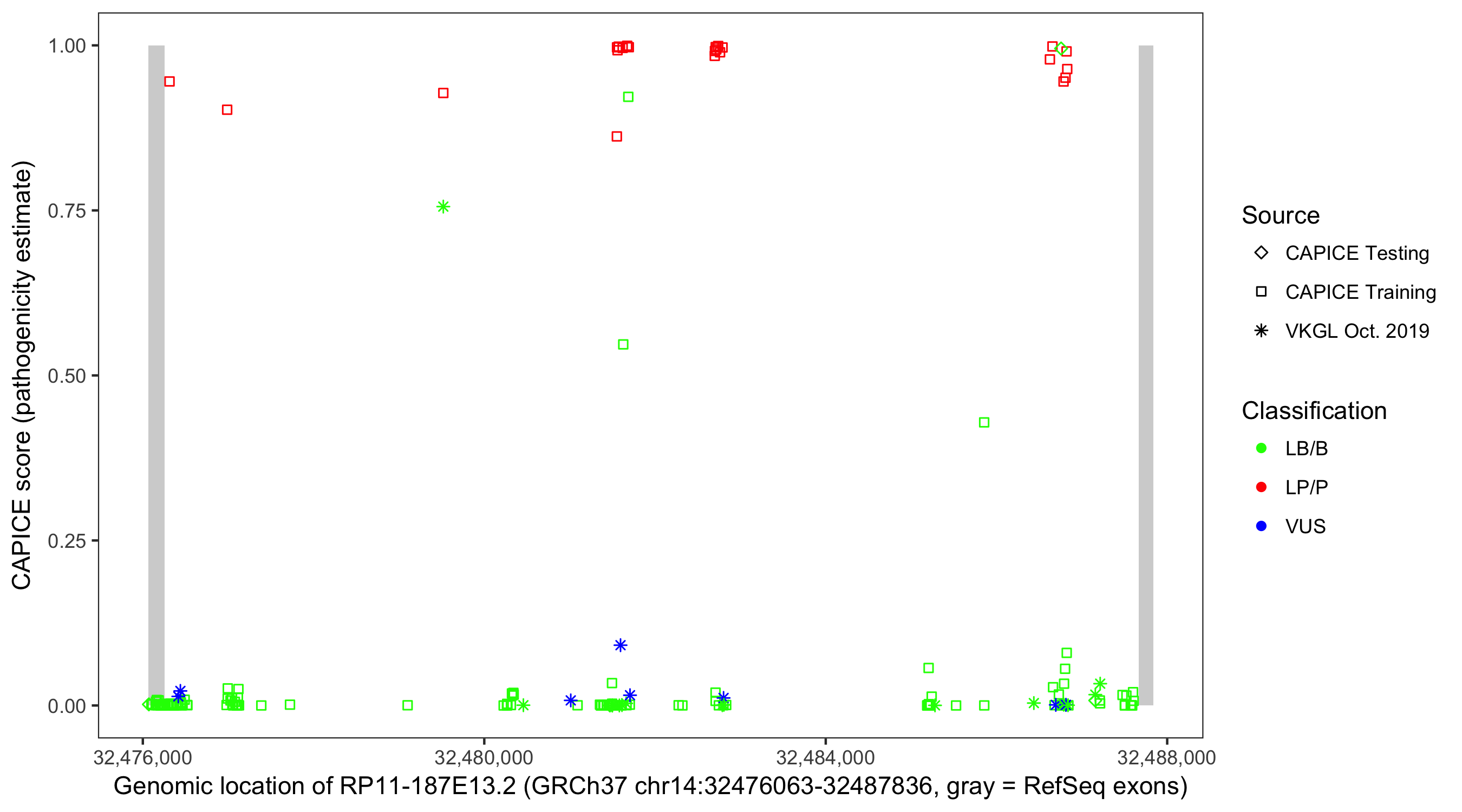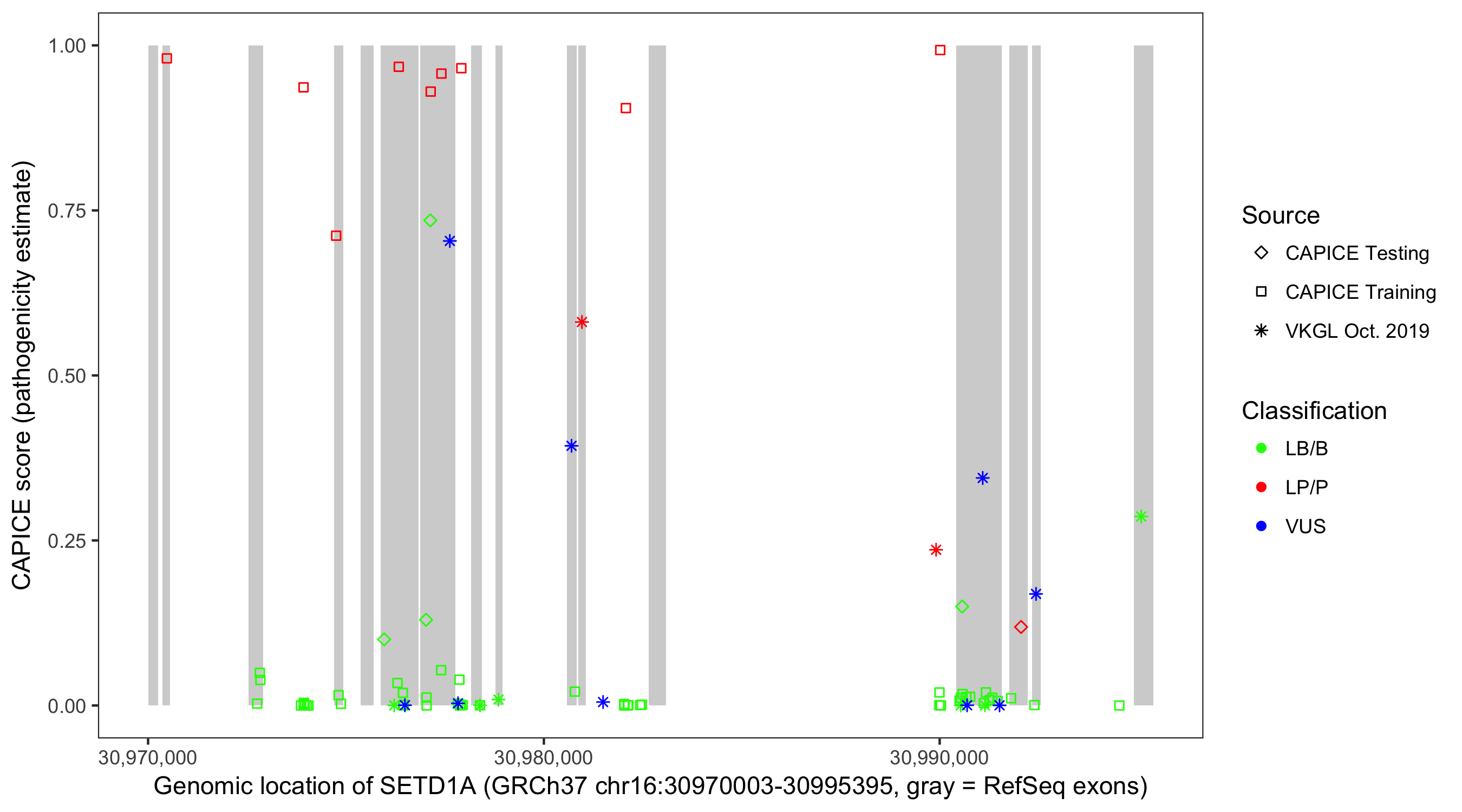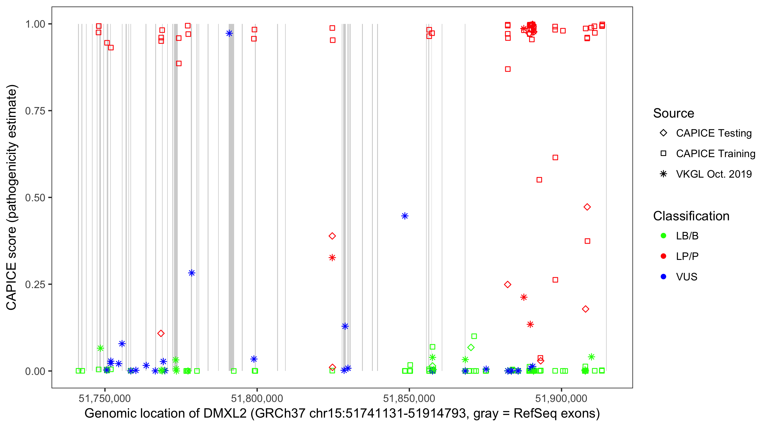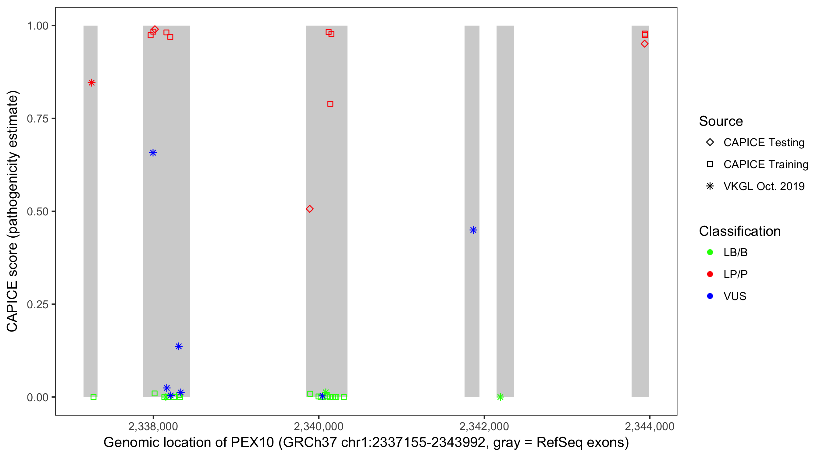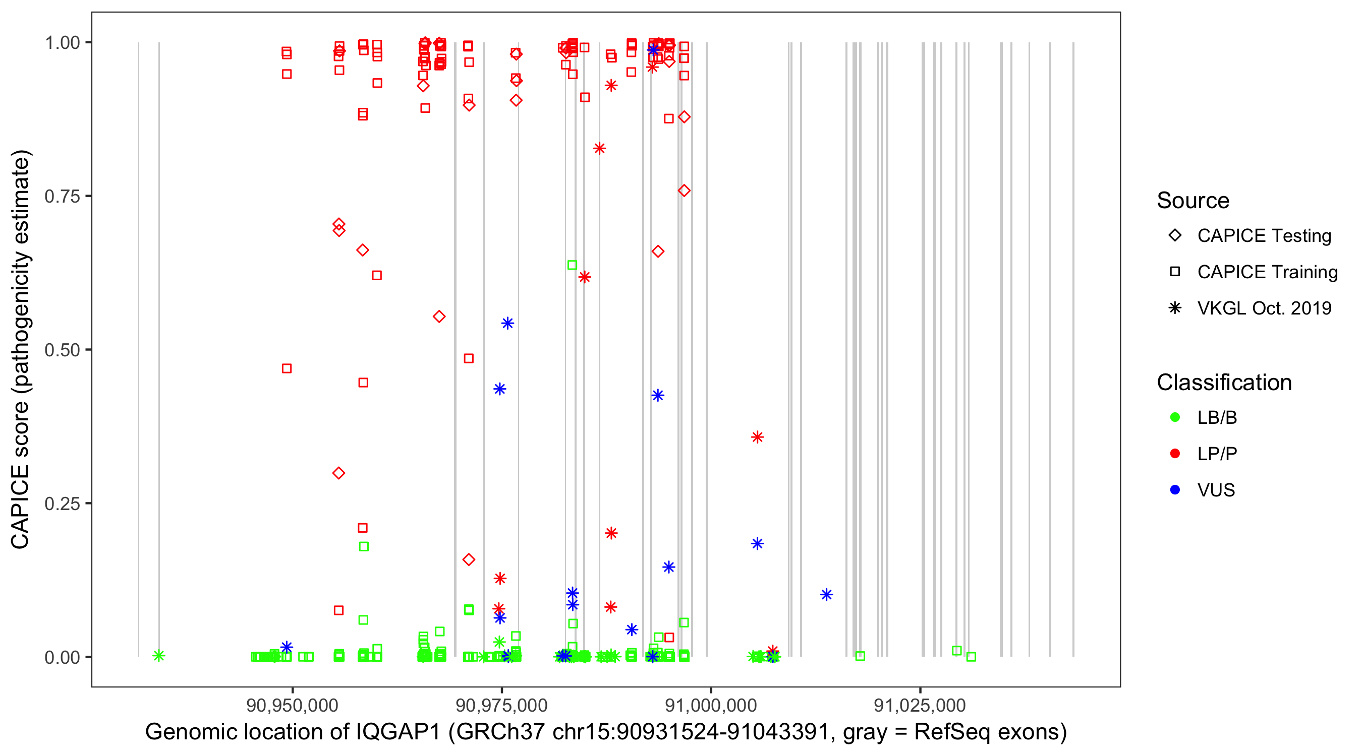 Shown are CAPICE train/test variants plus VKGL Oct 2019.