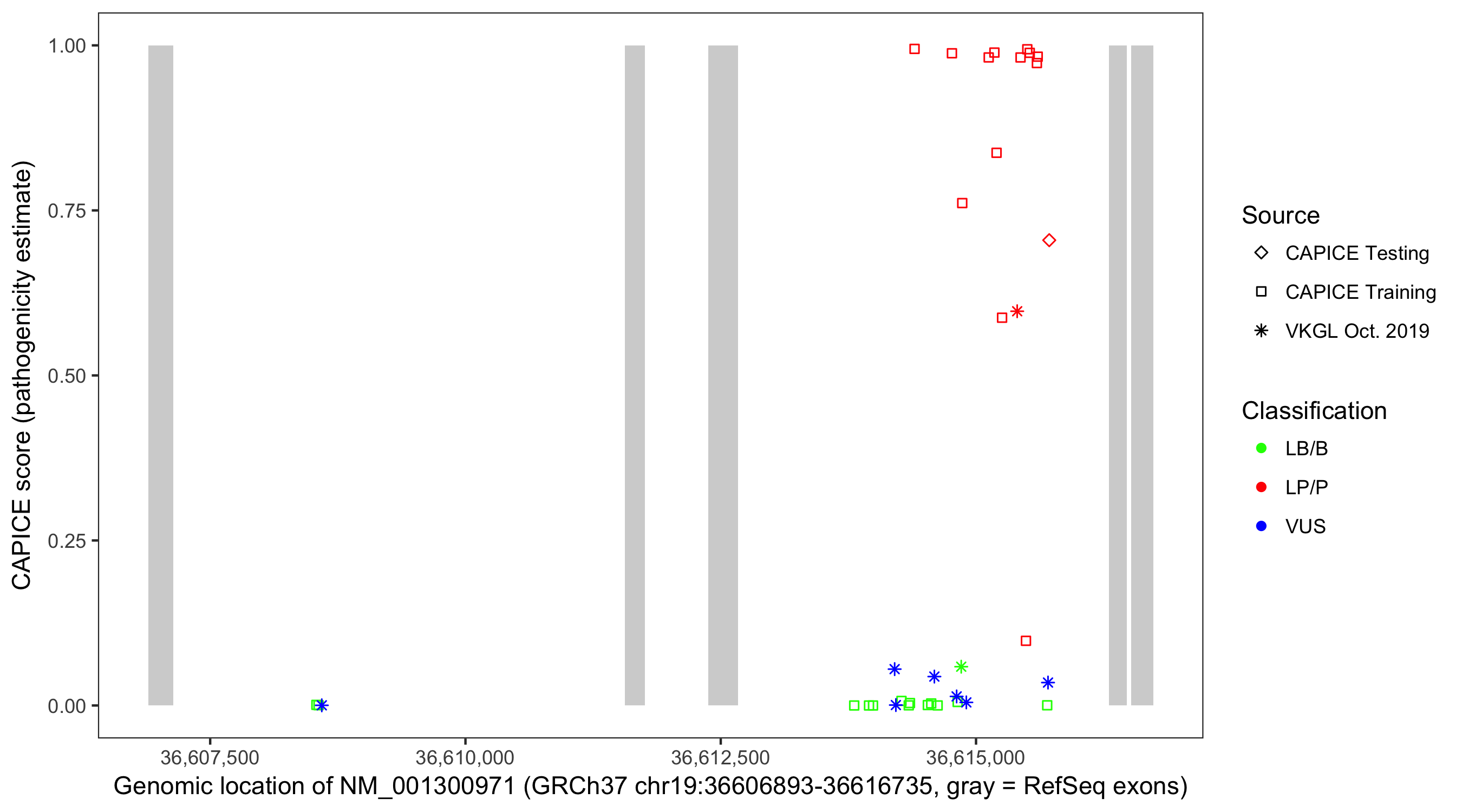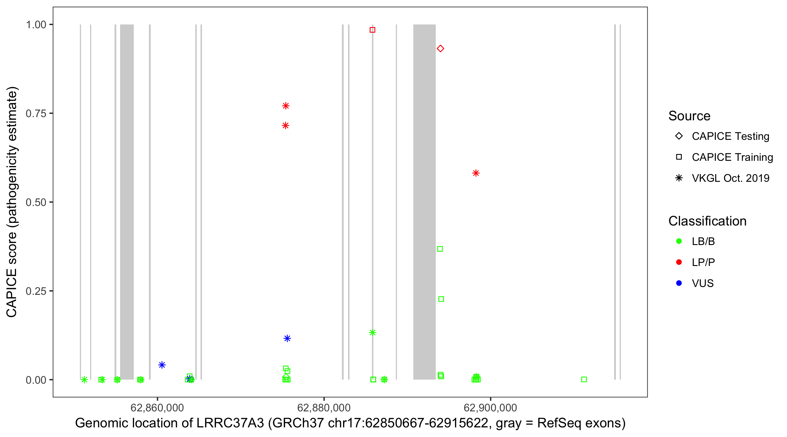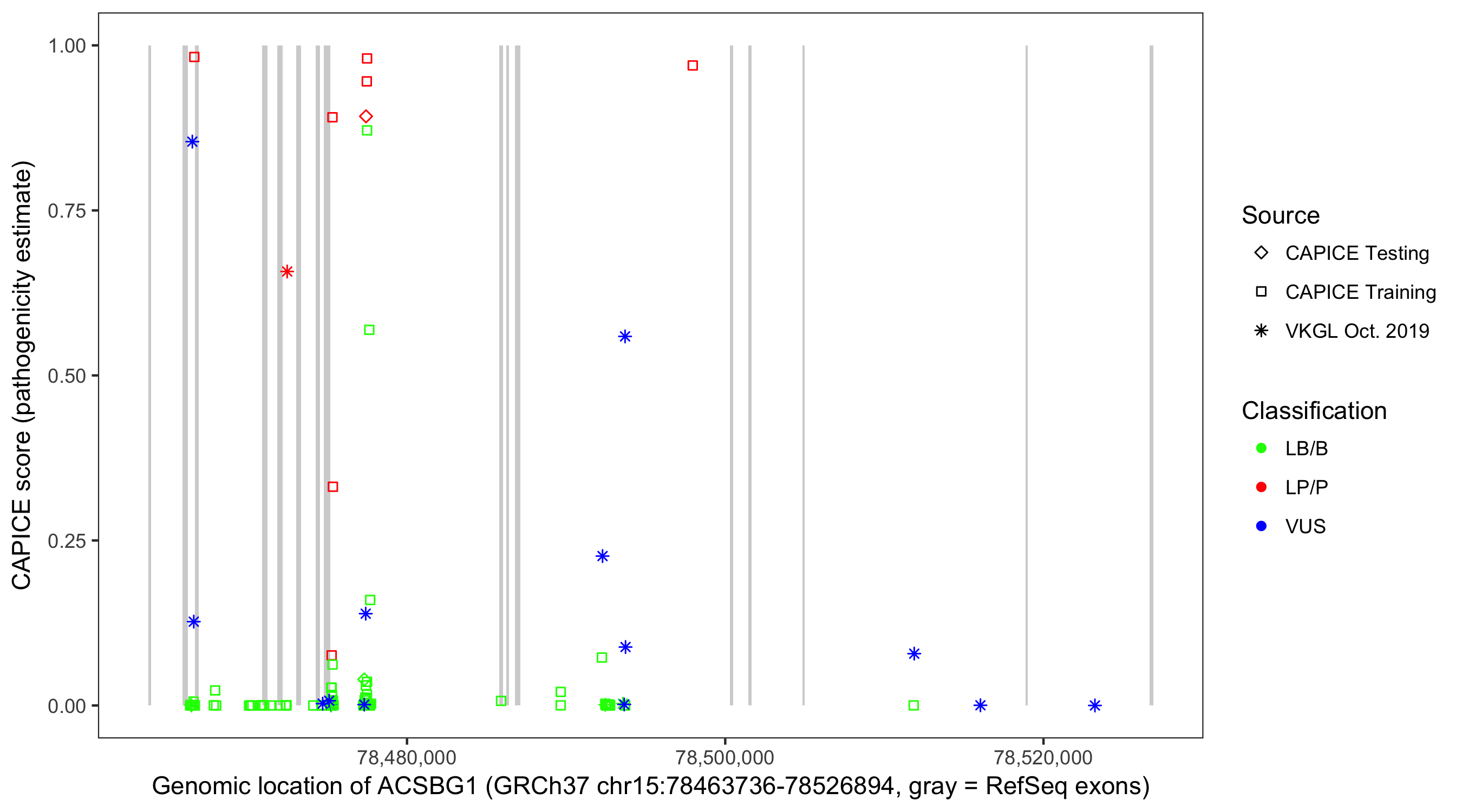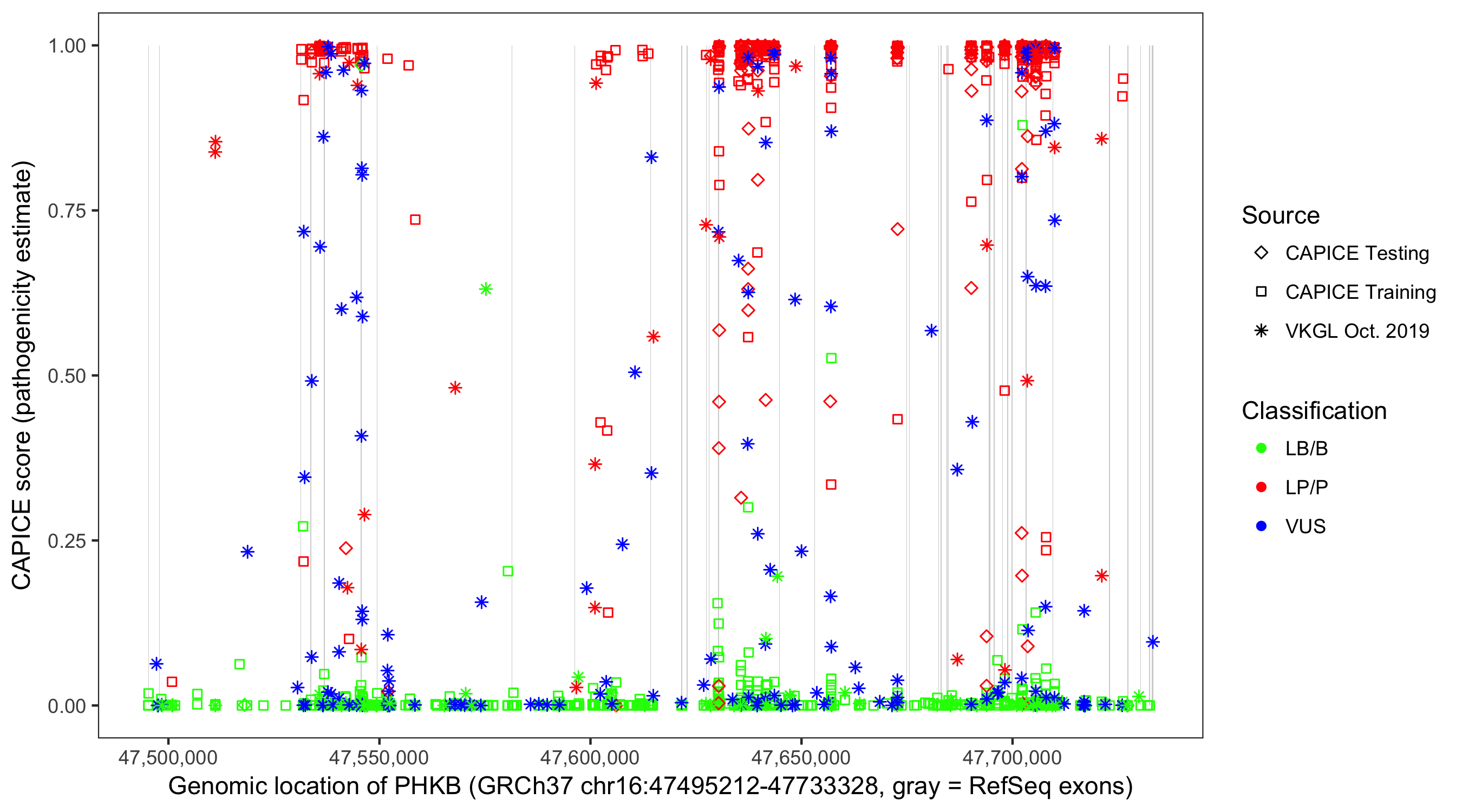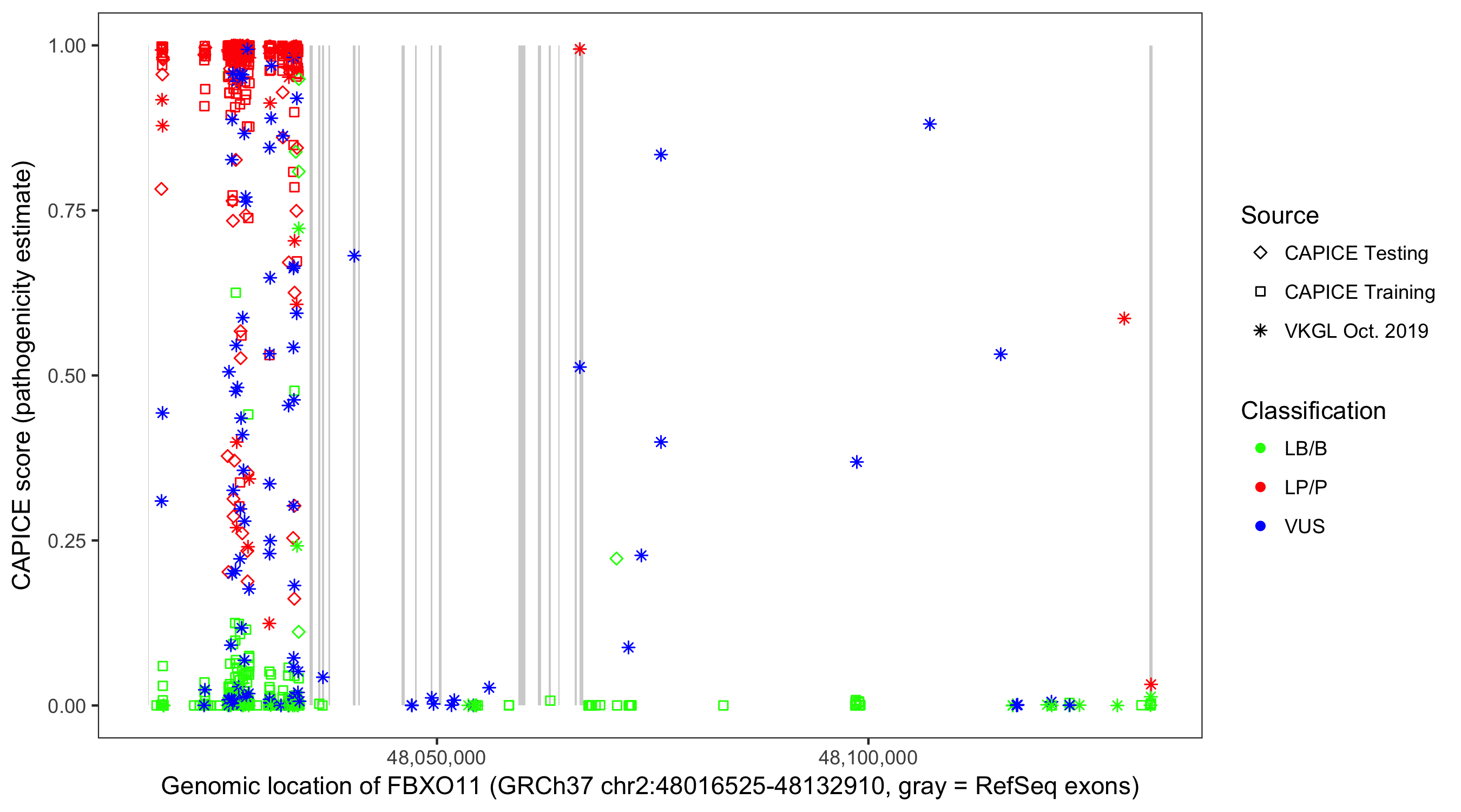 Shown are CAPICE train/test variants plus VKGL Oct 2019.