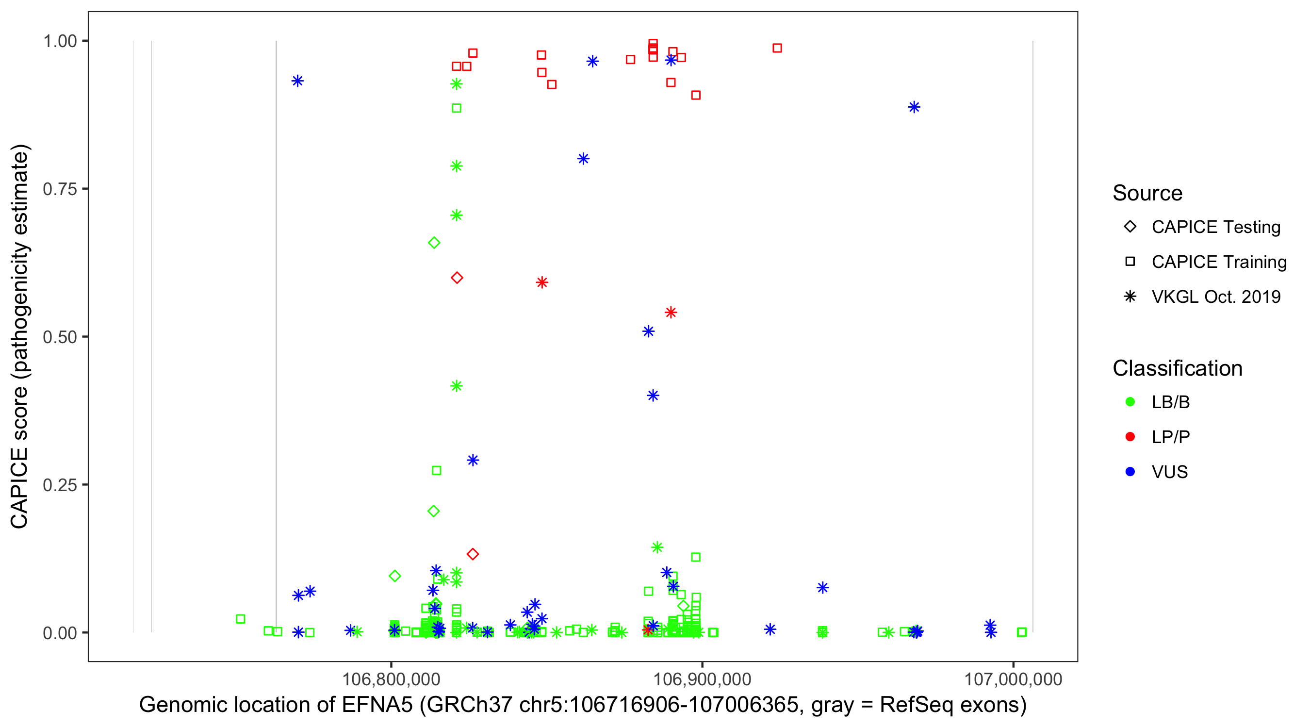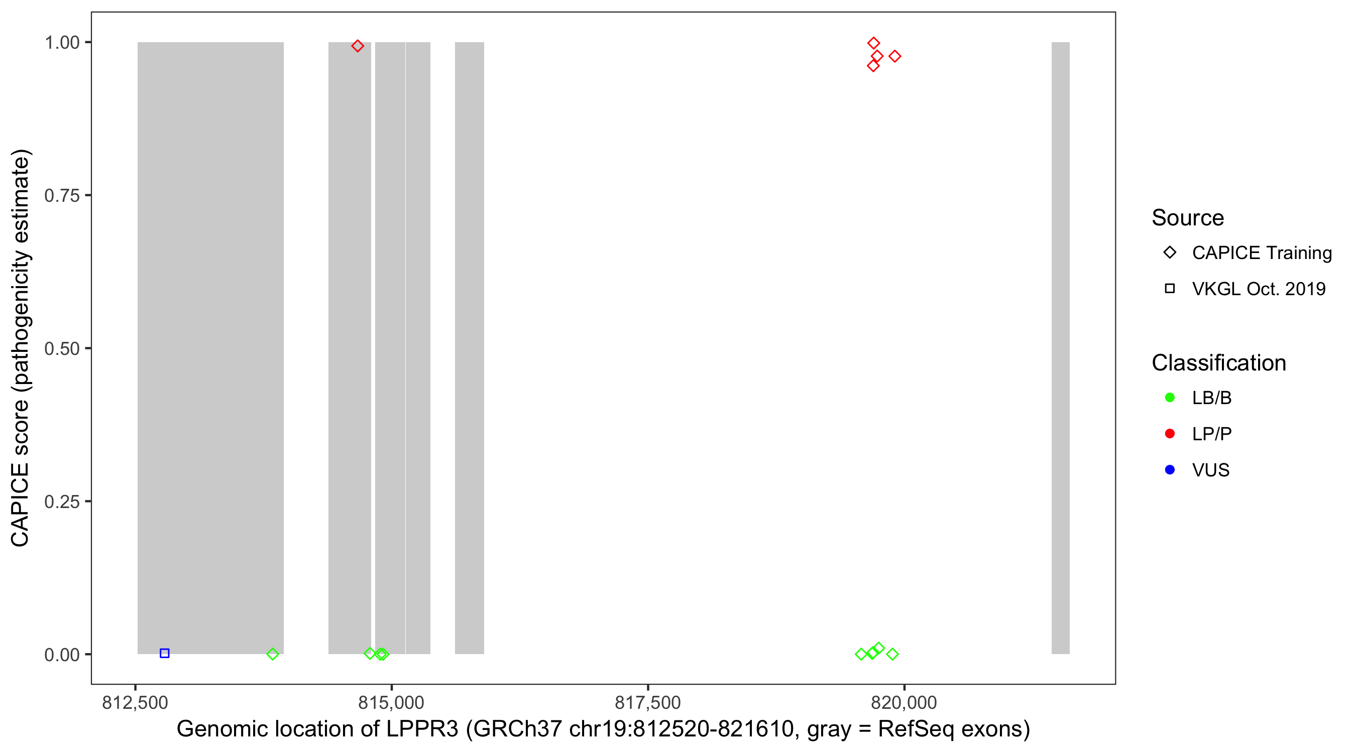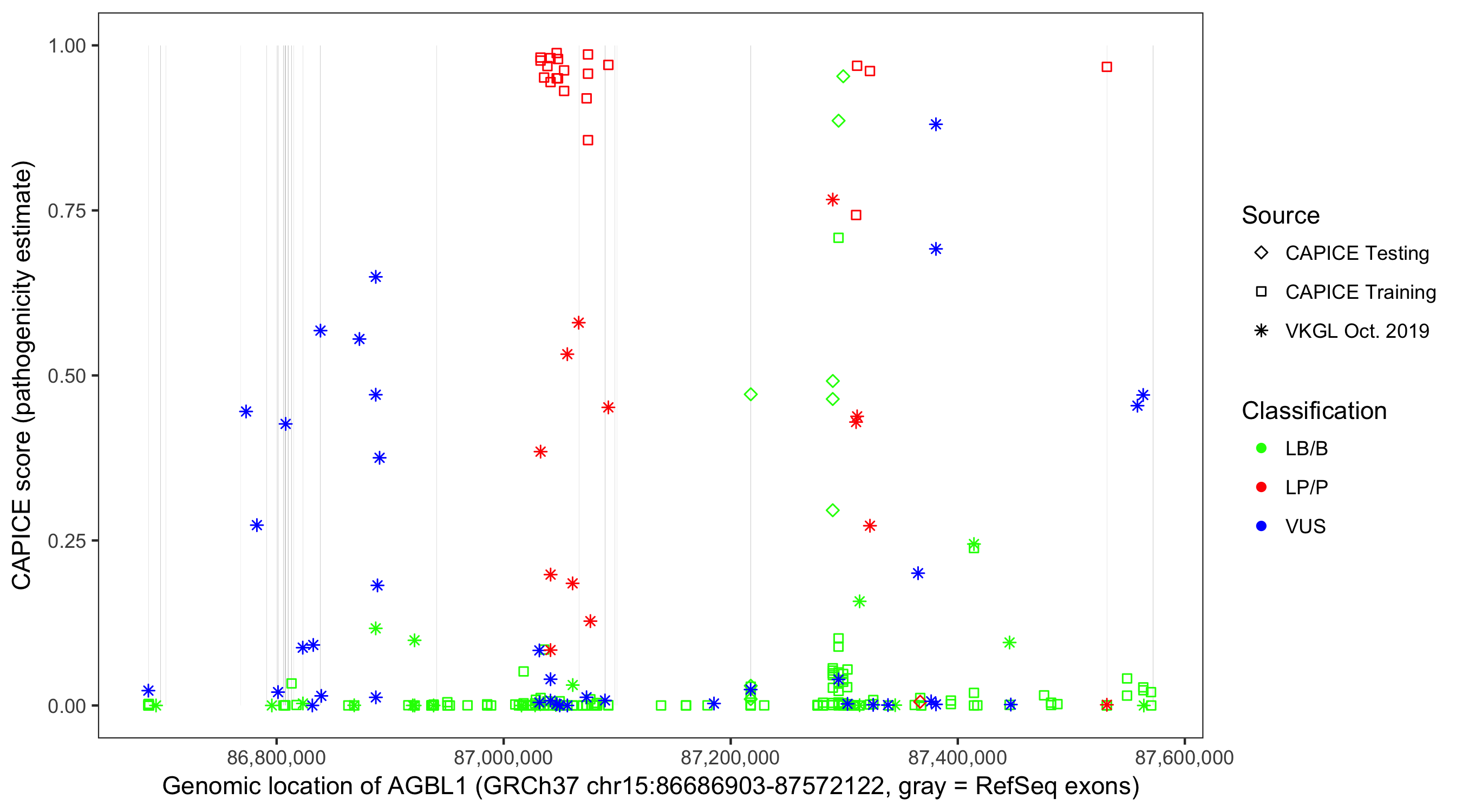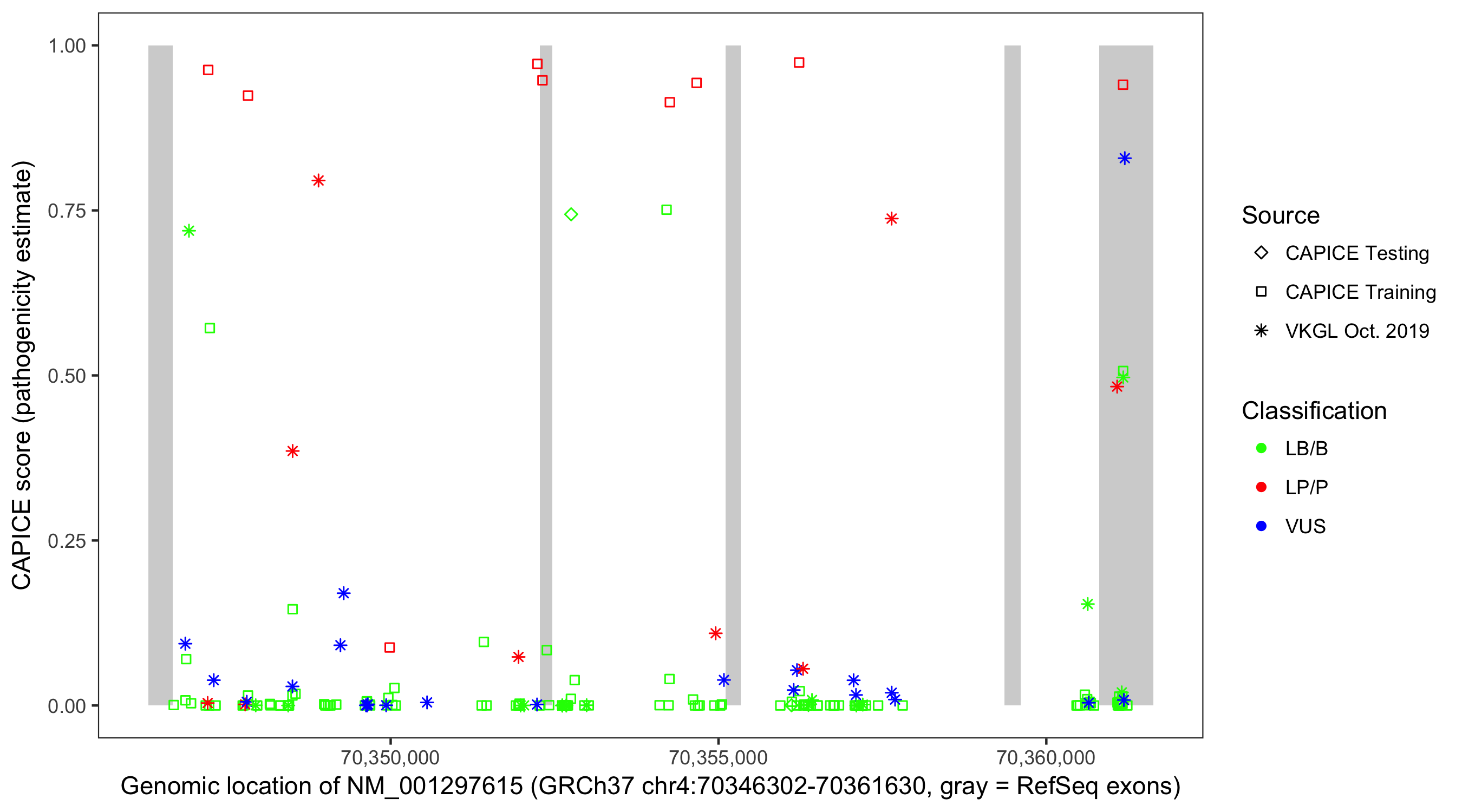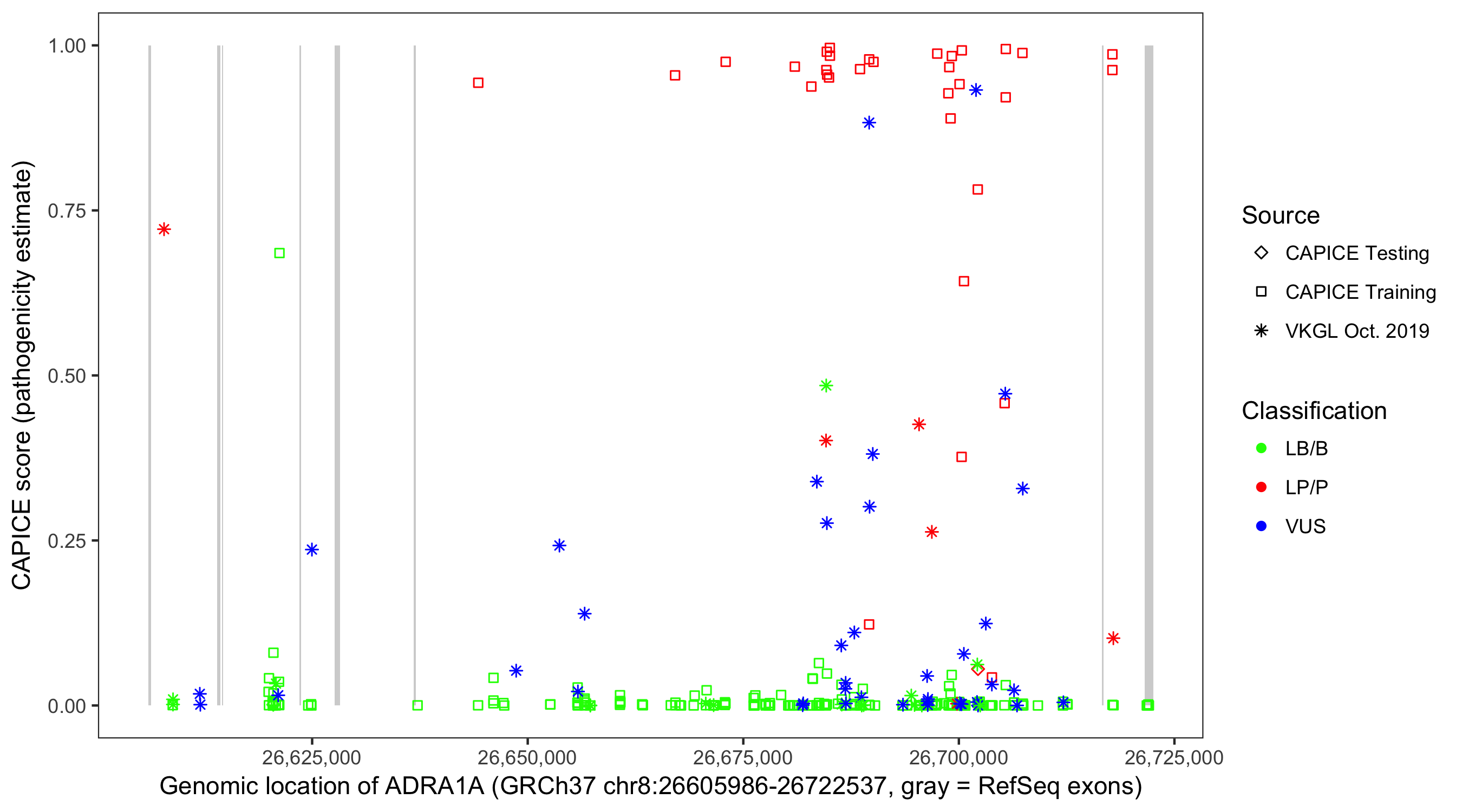 Shown are CAPICE train/test variants plus VKGL Oct 2019.