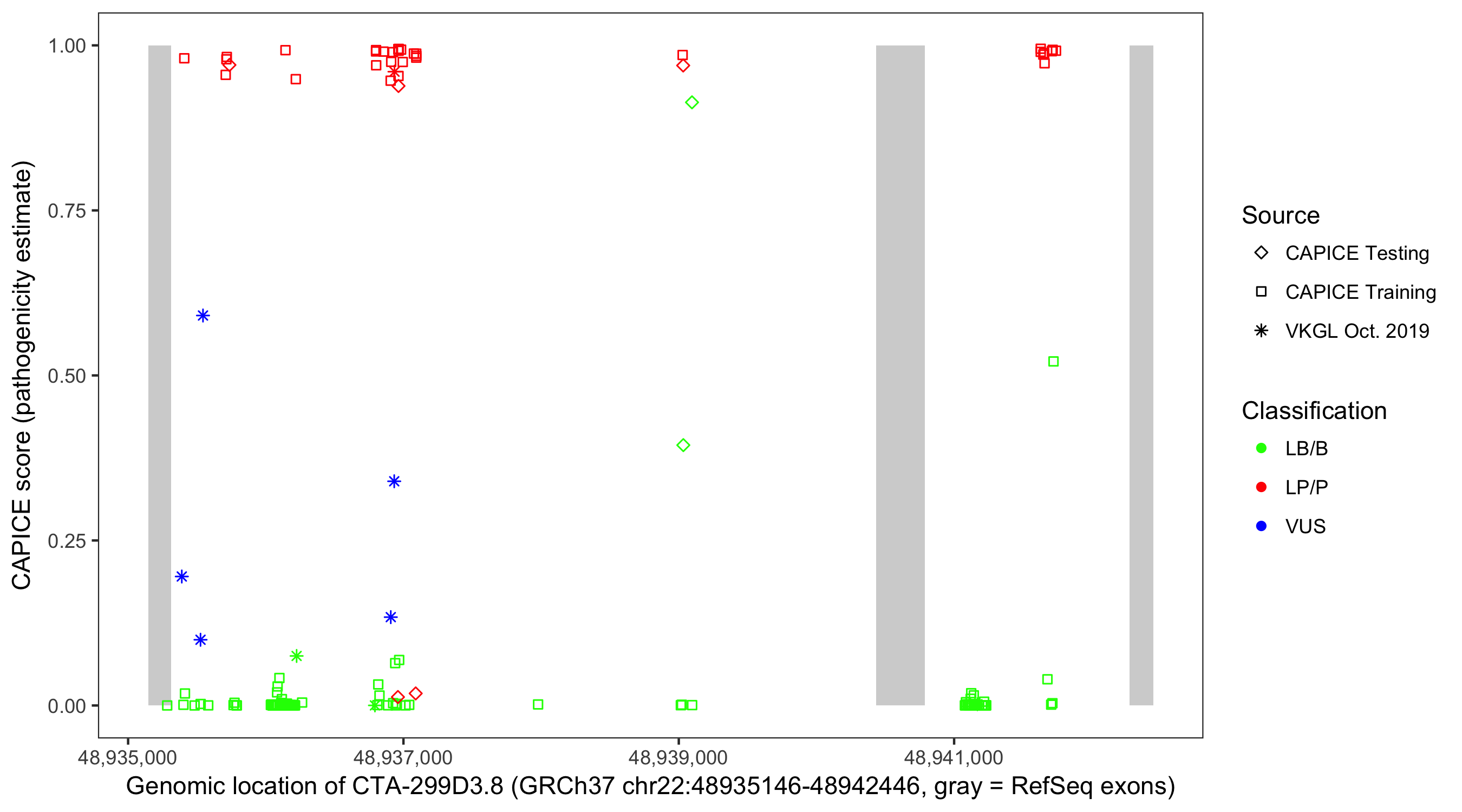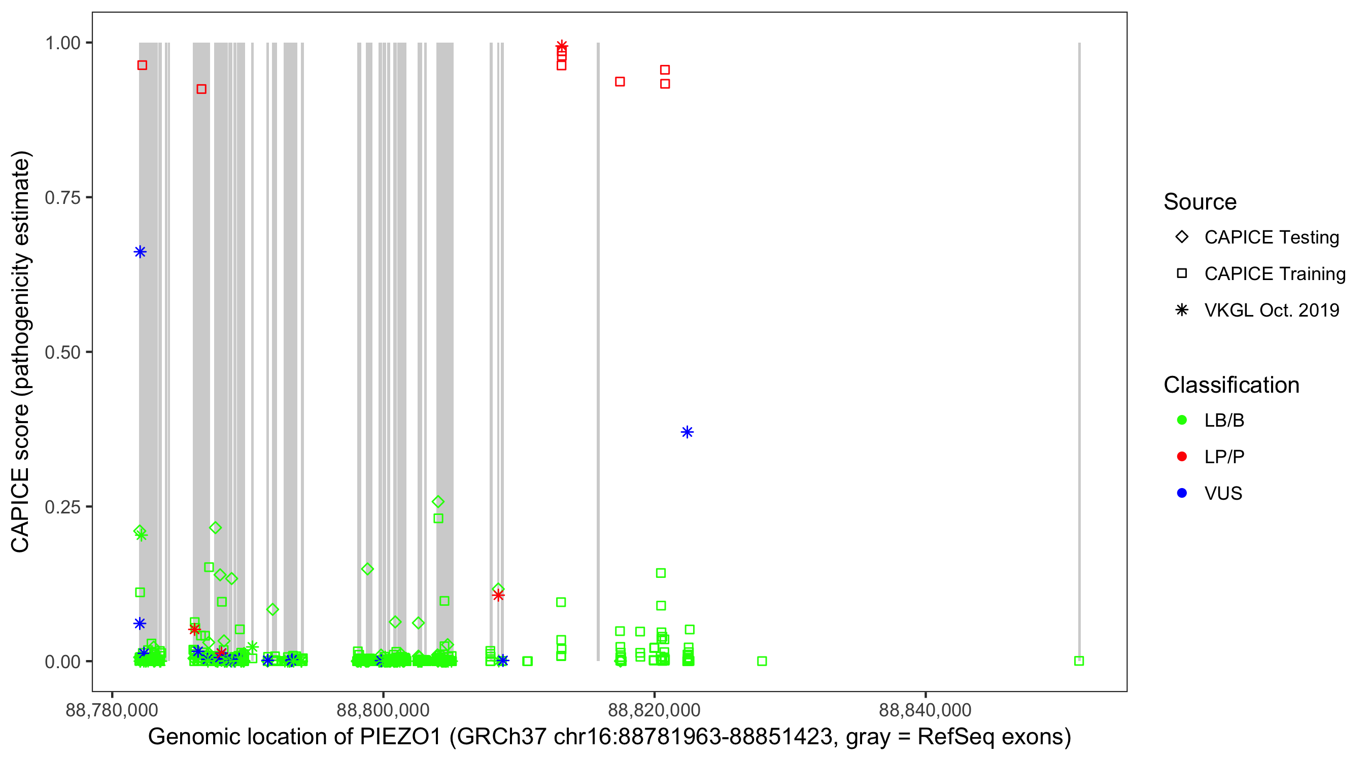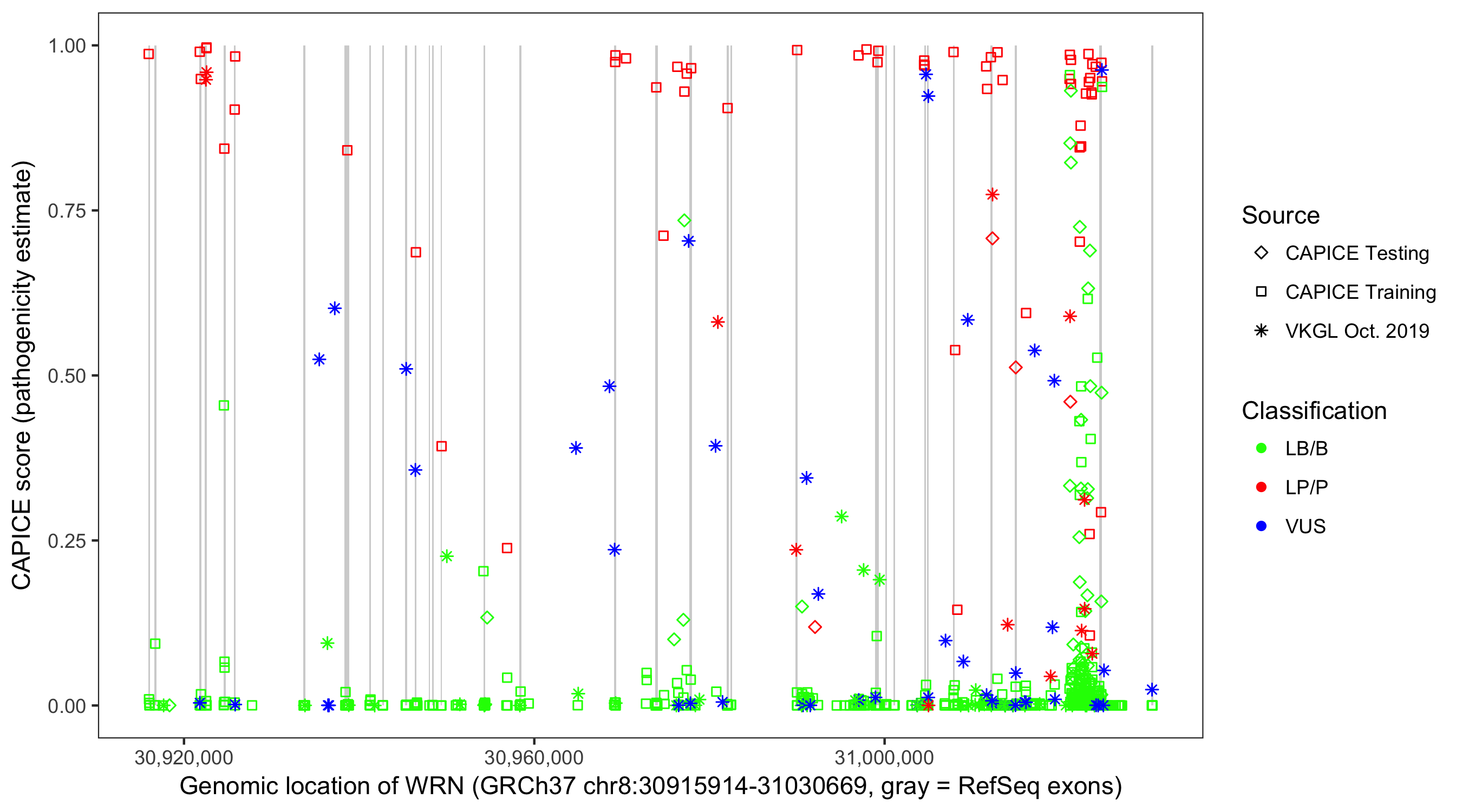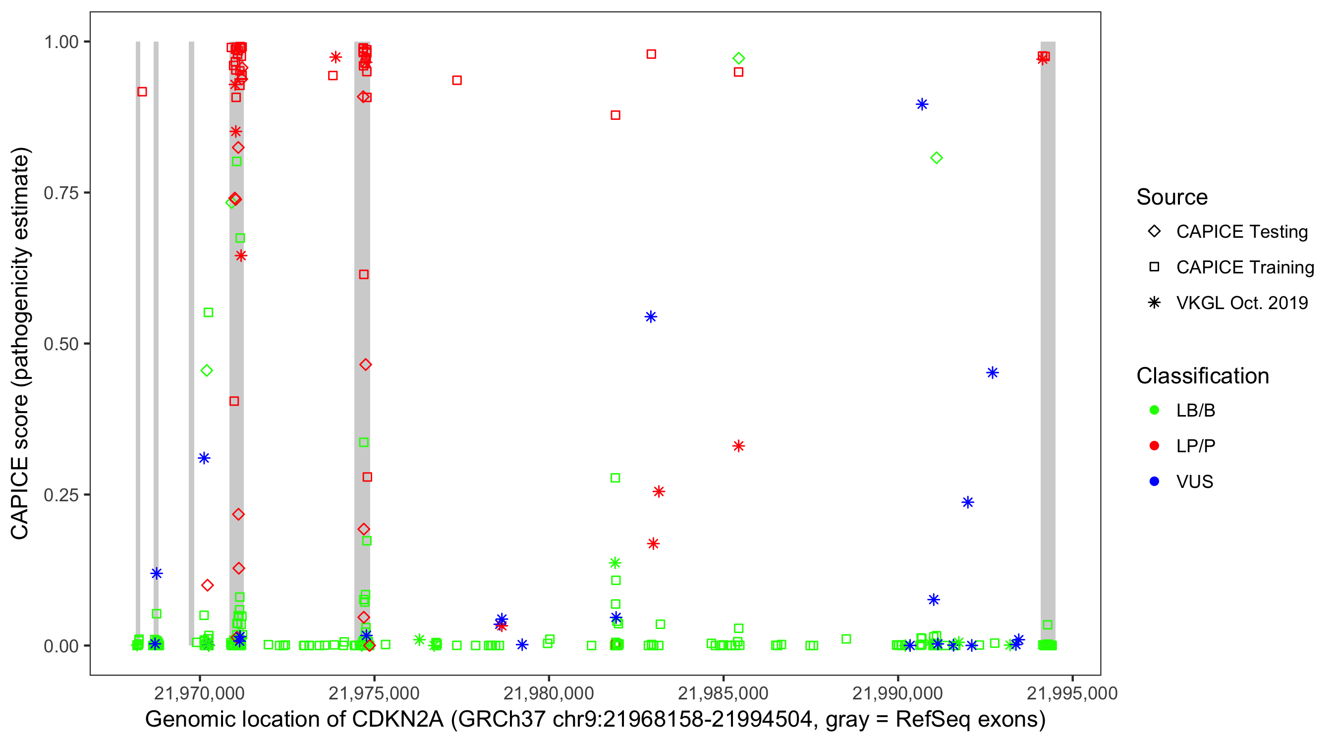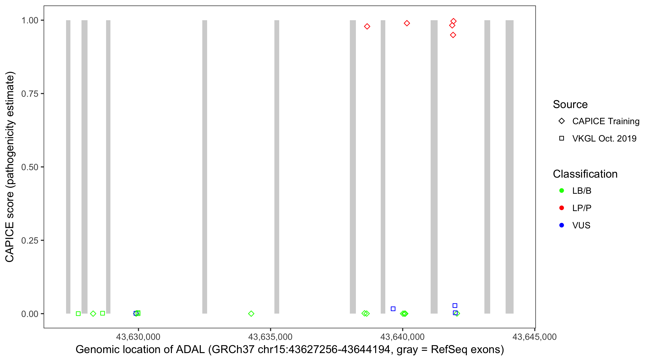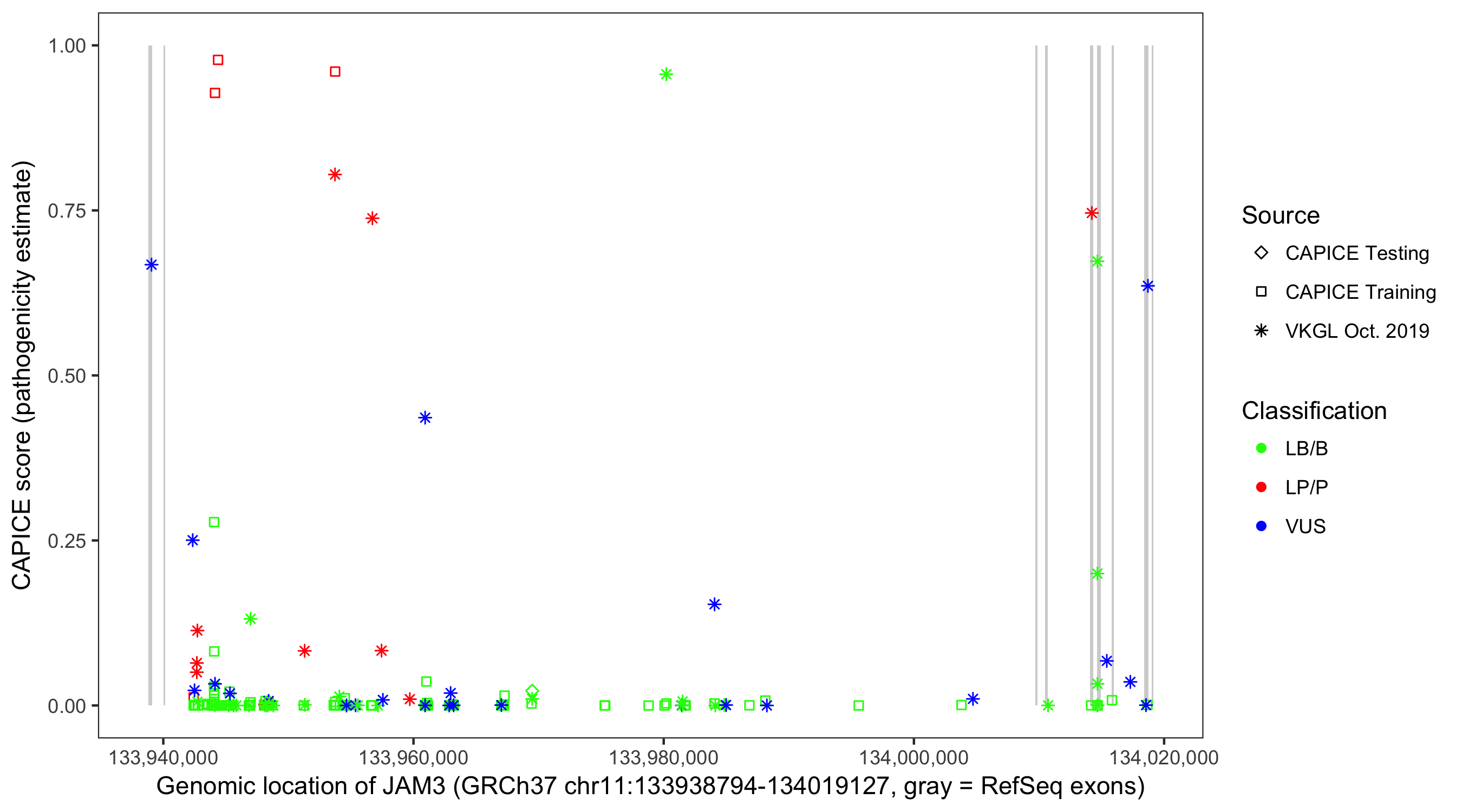 Shown are CAPICE train/test variants plus VKGL Oct 2019.