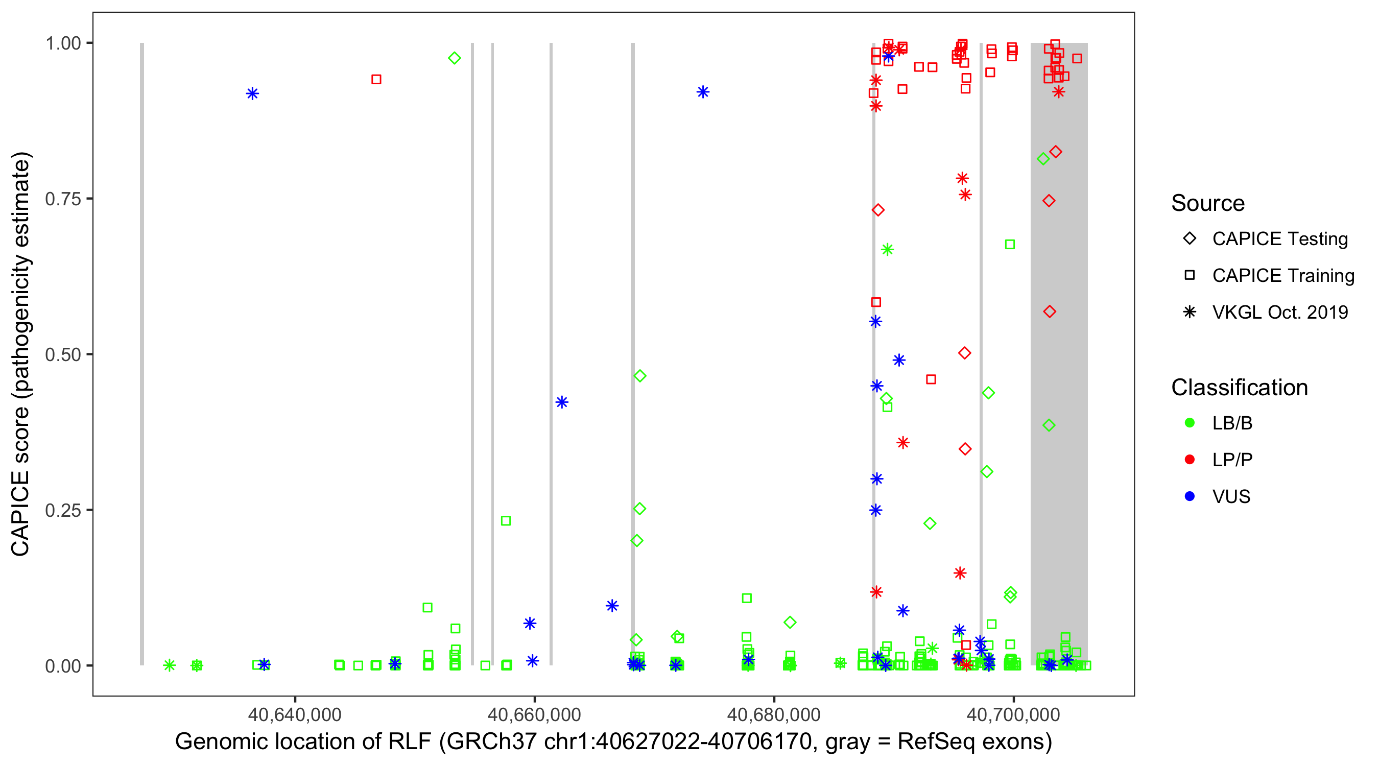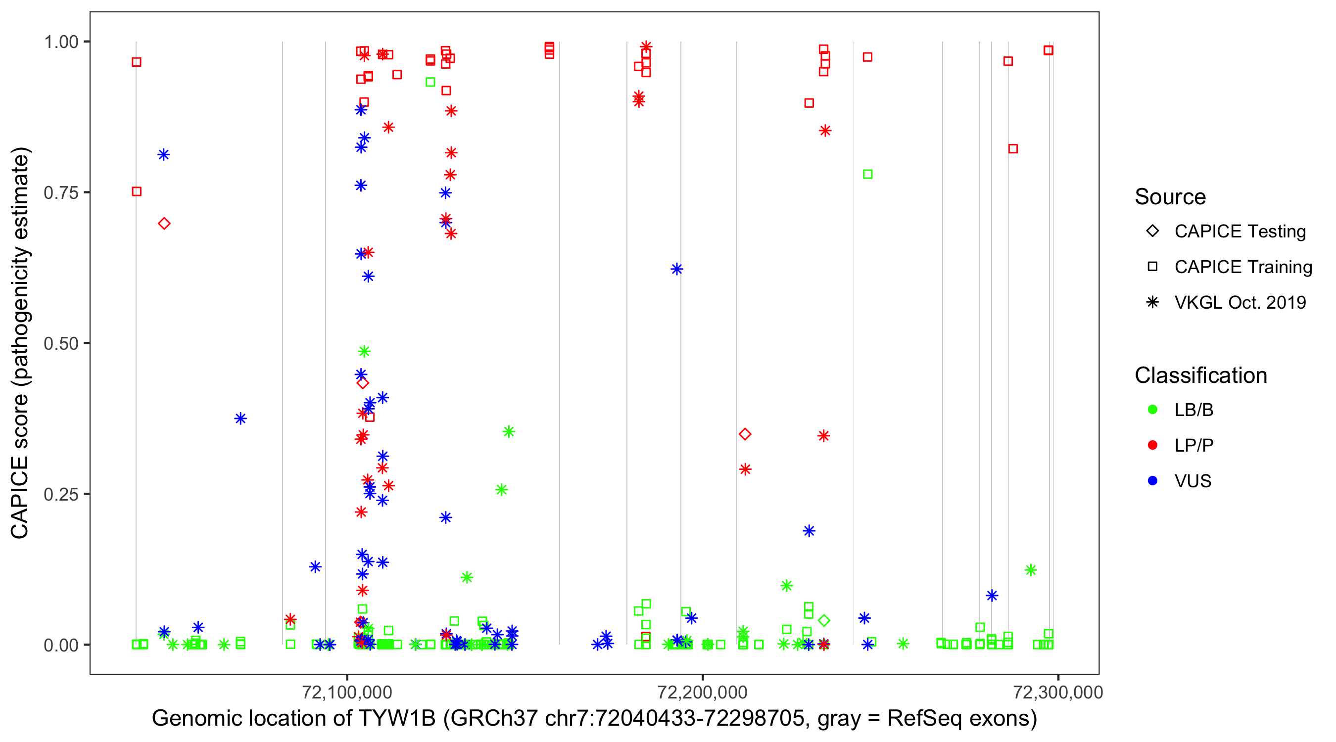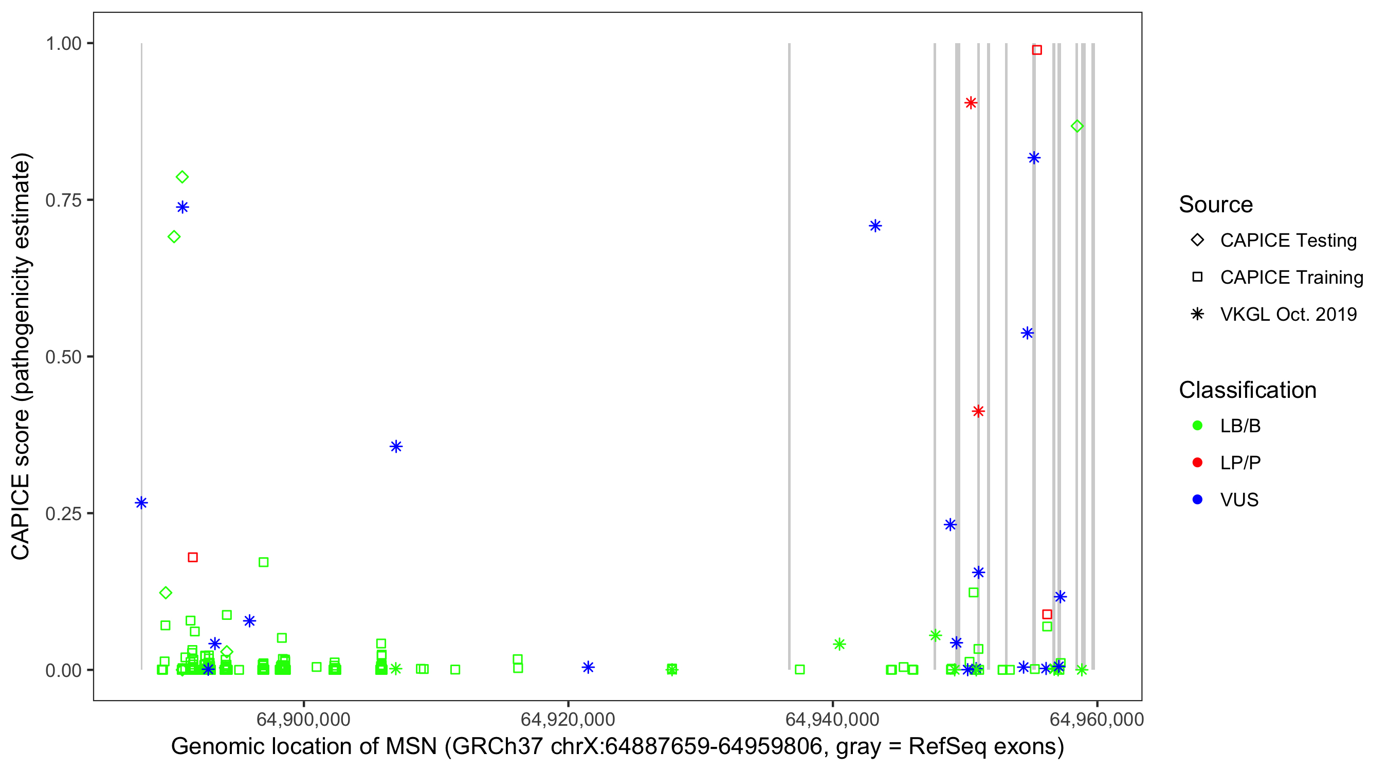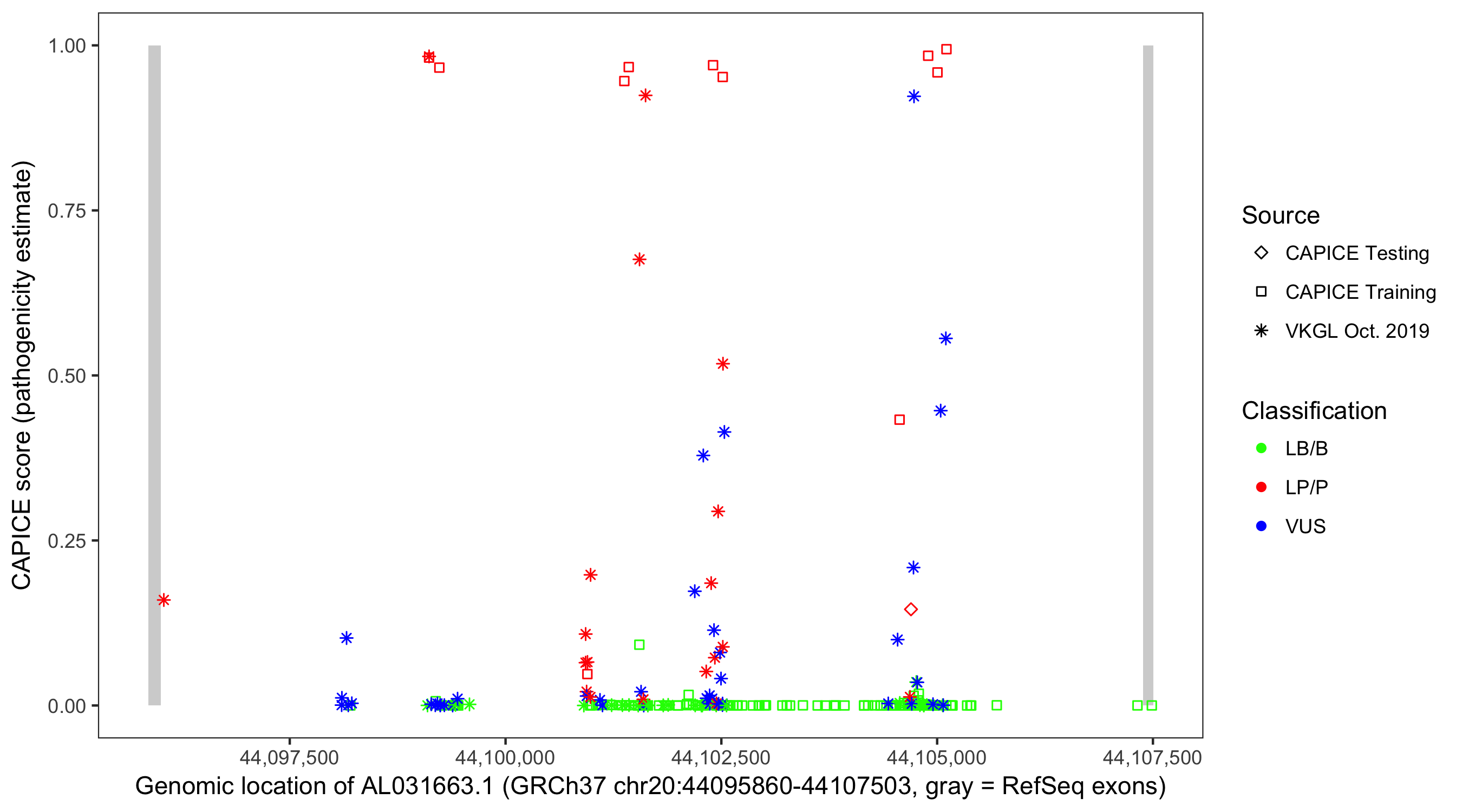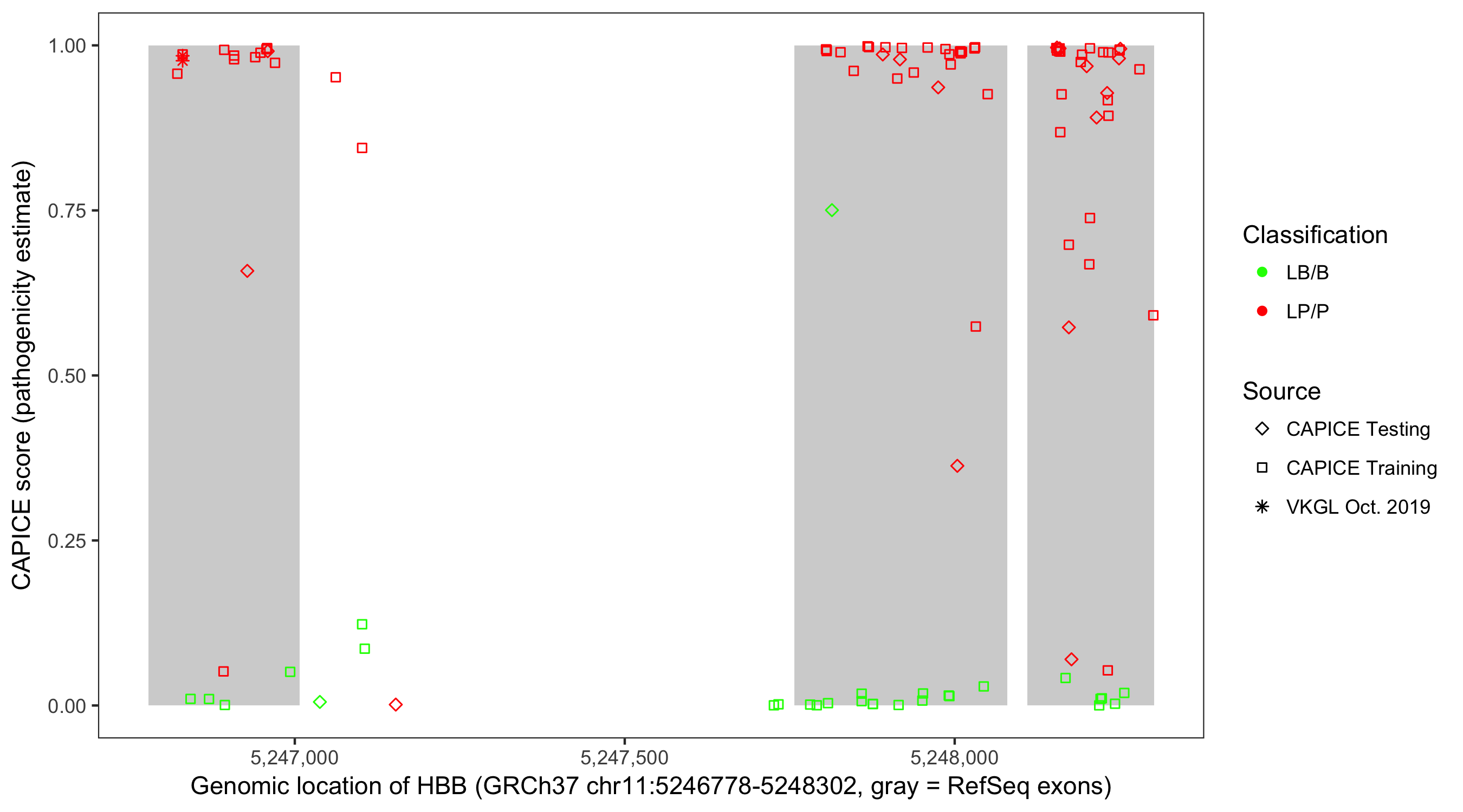 Shown are CAPICE train/test variants plus VKGL Oct 2019.