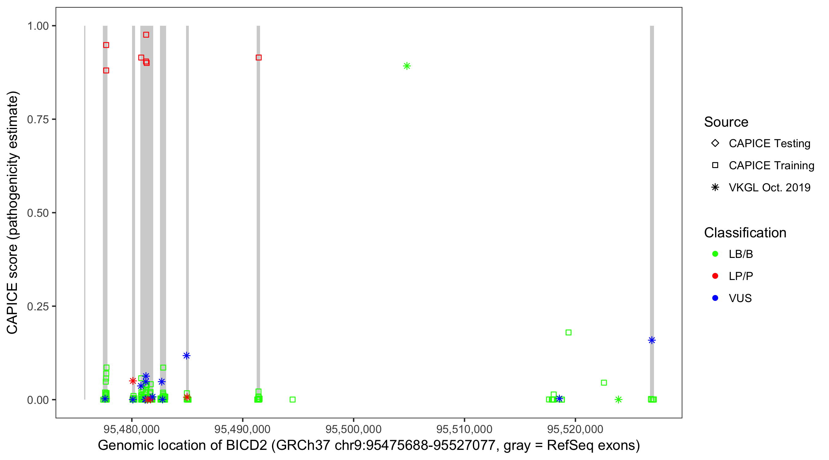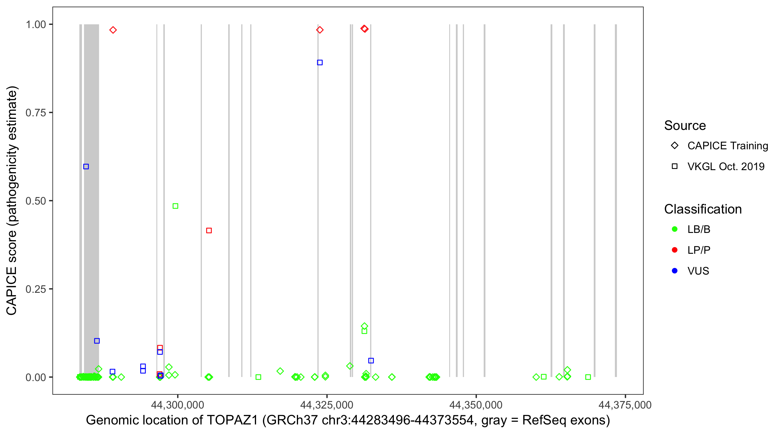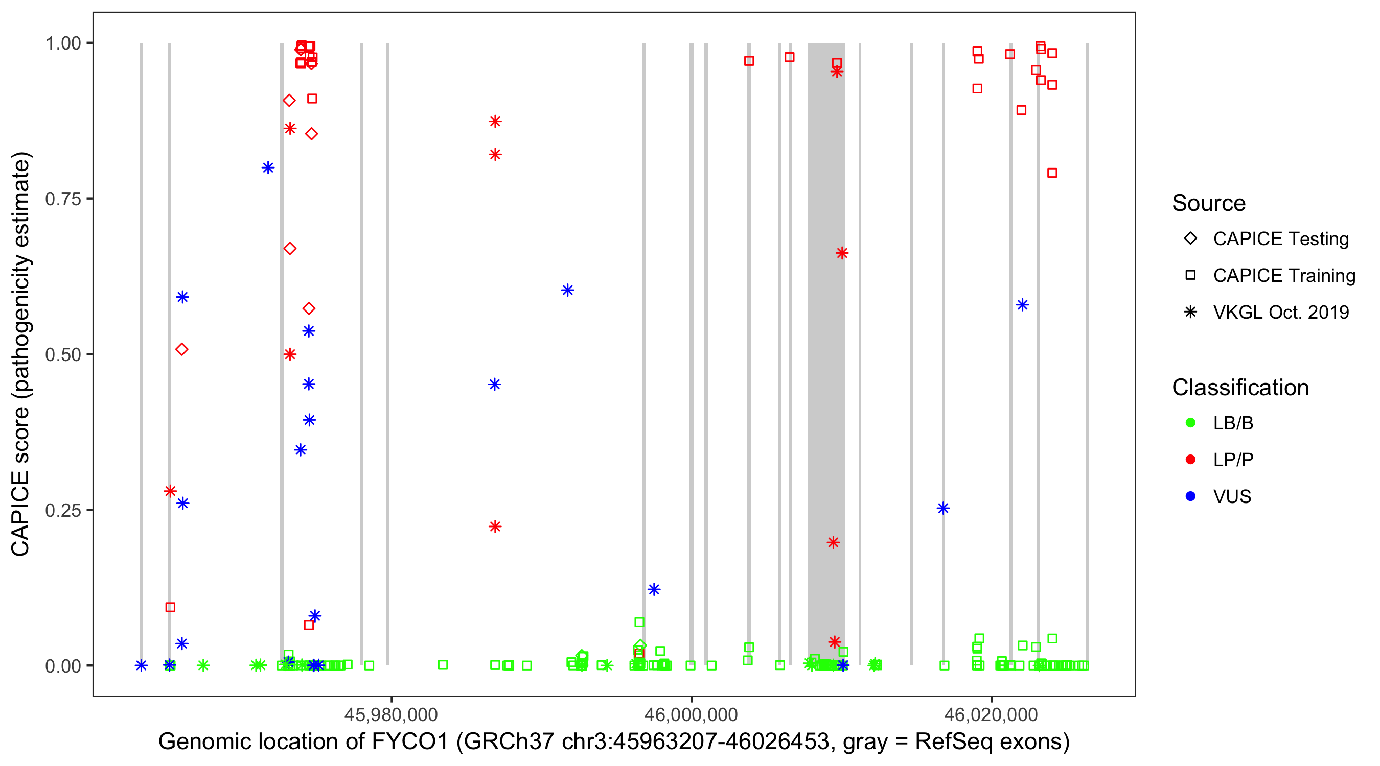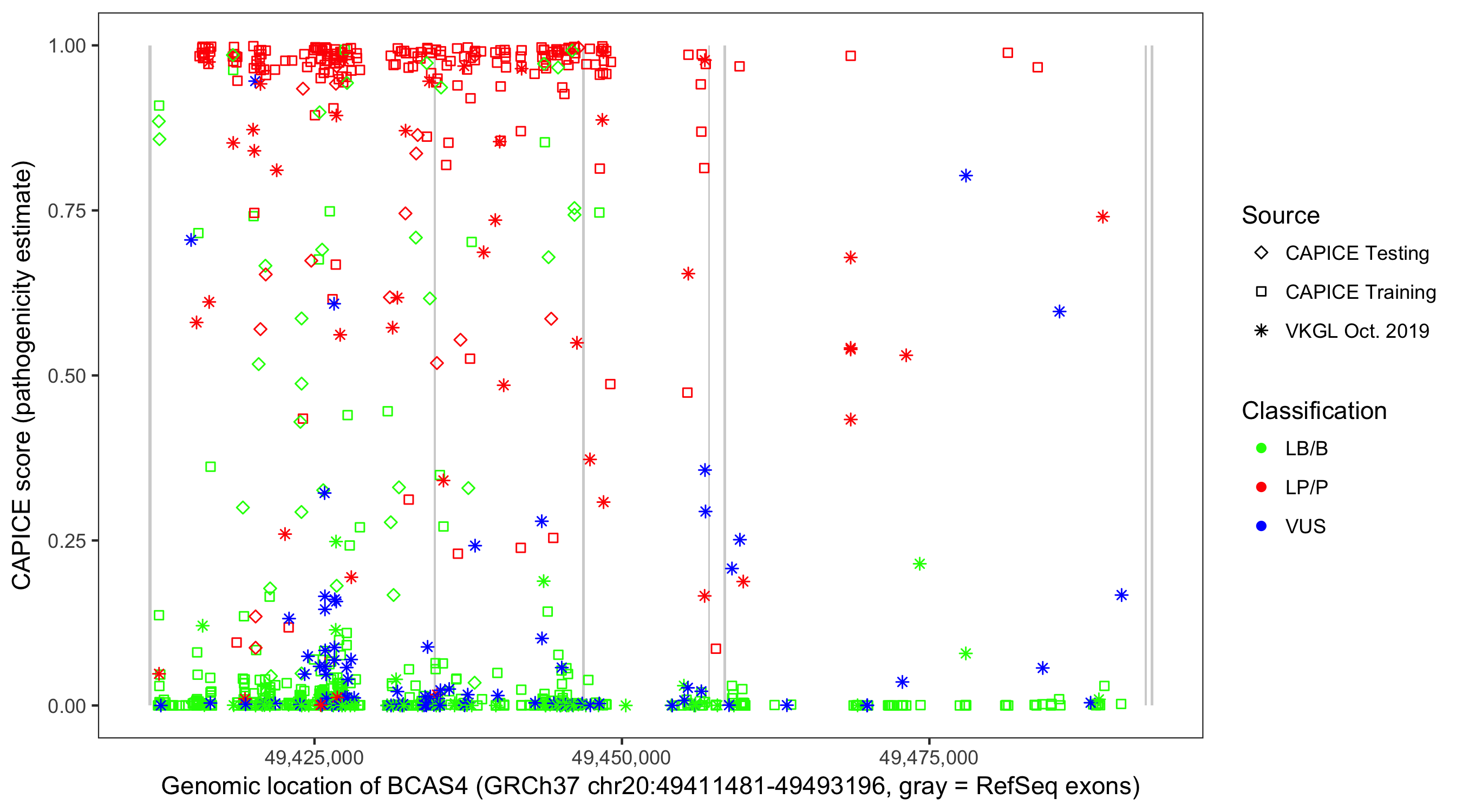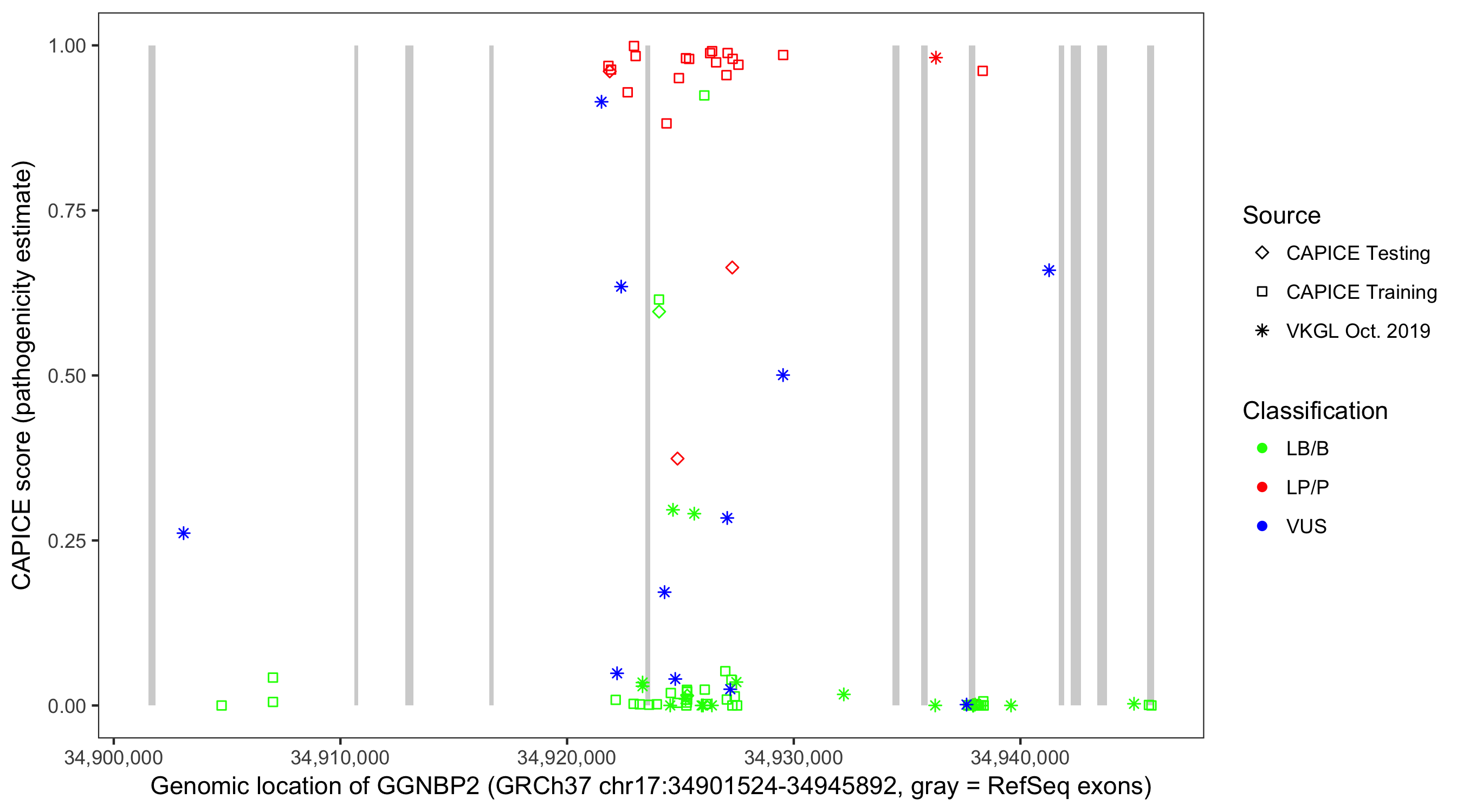 Shown are CAPICE train/test variants plus VKGL Oct 2019.