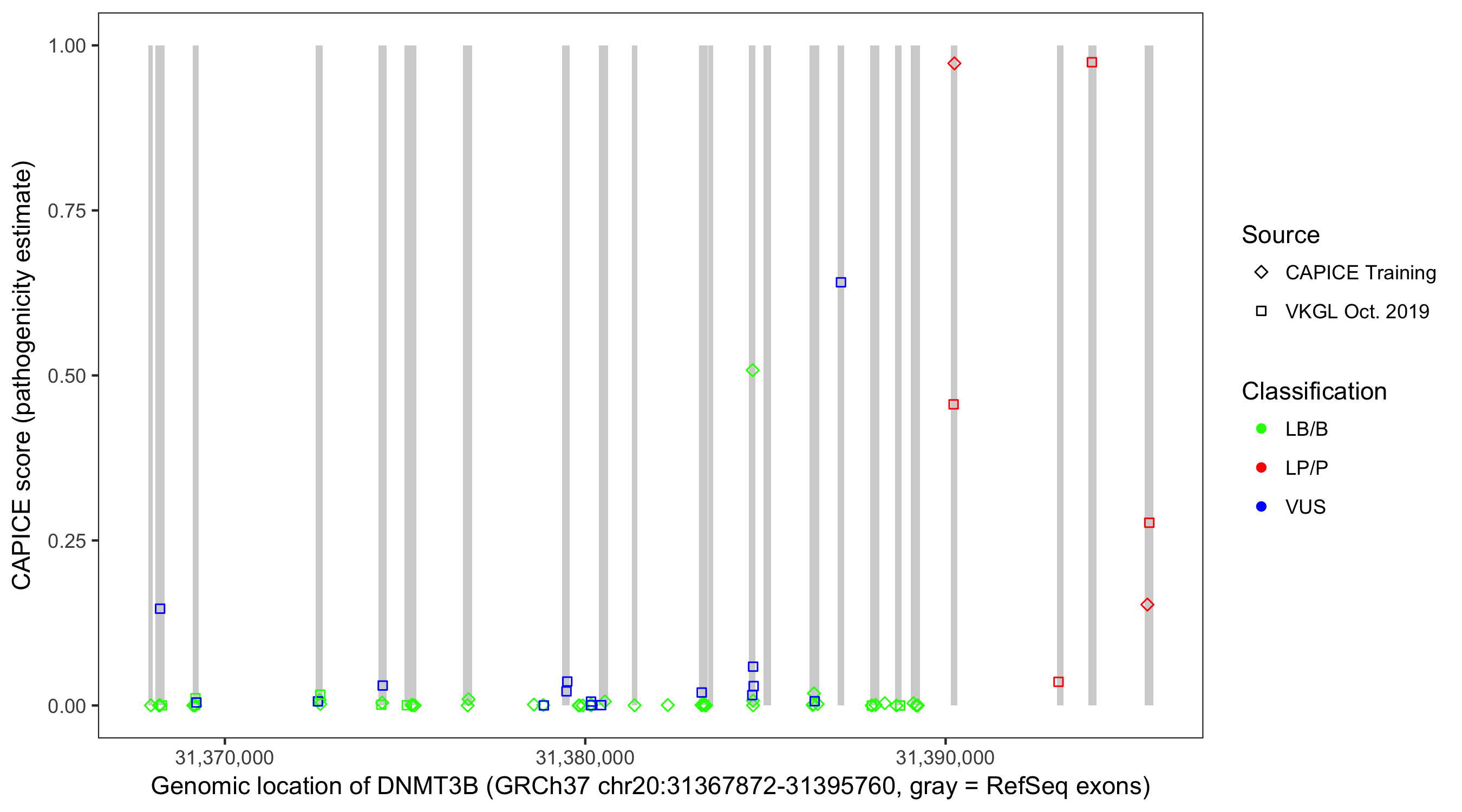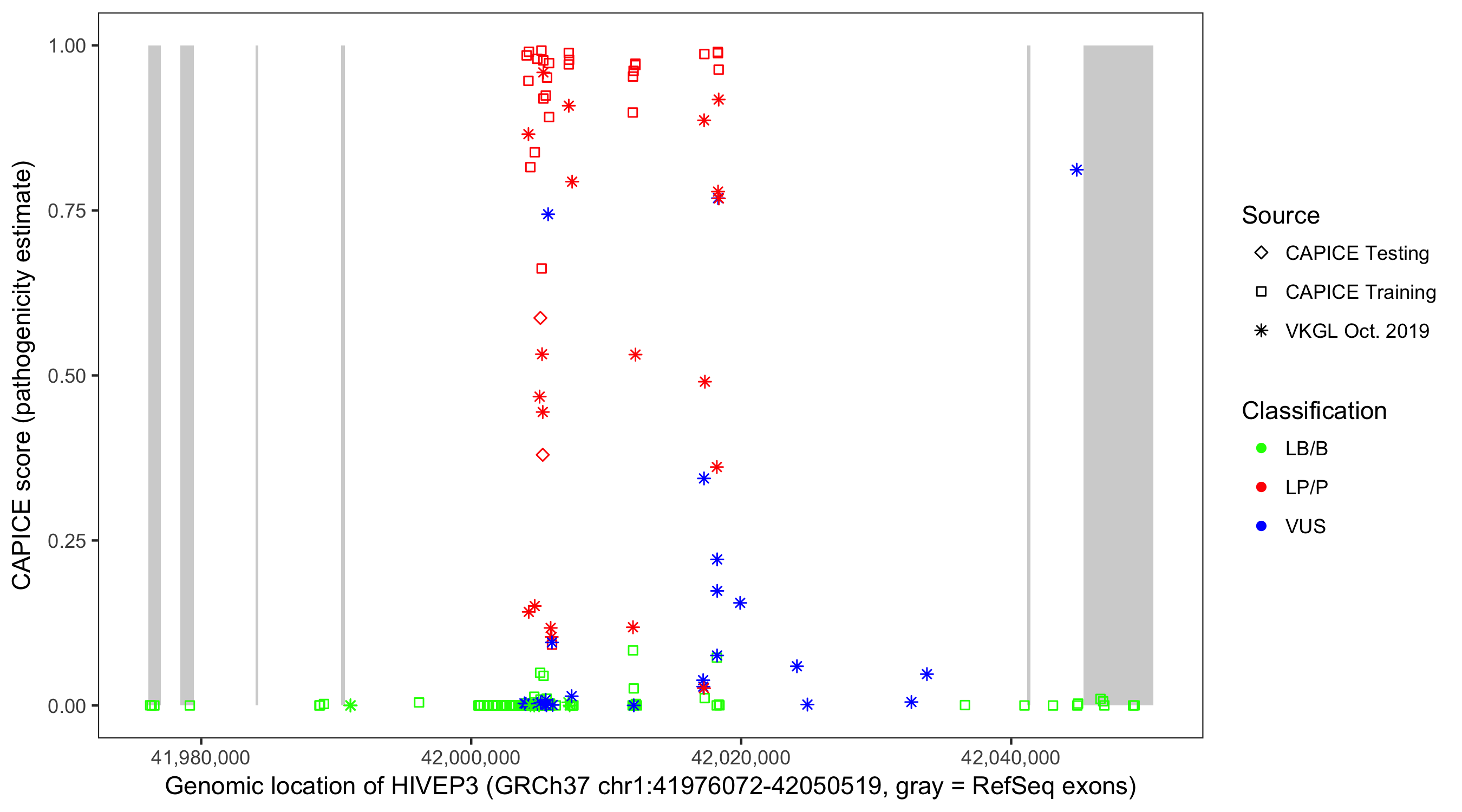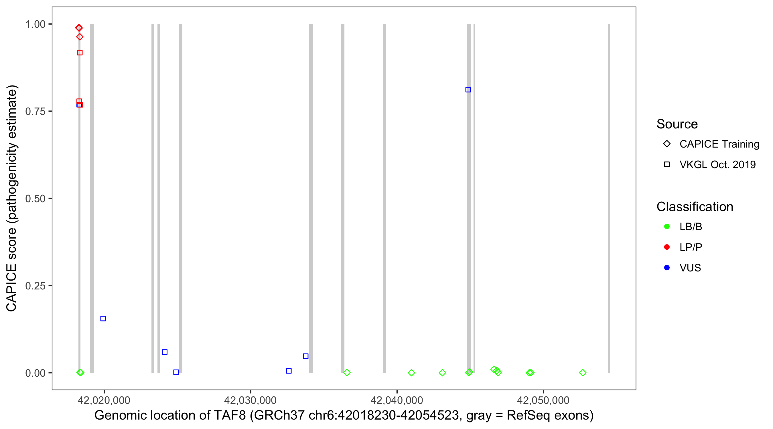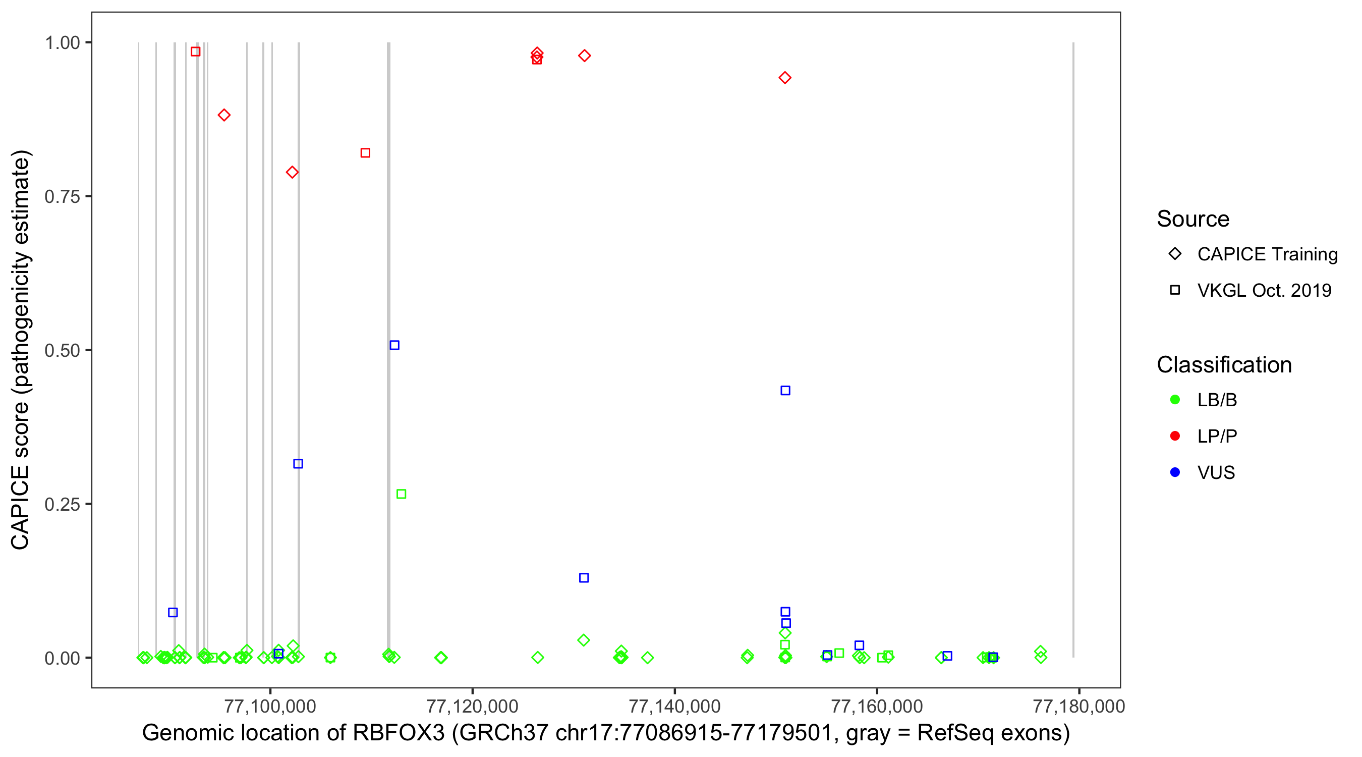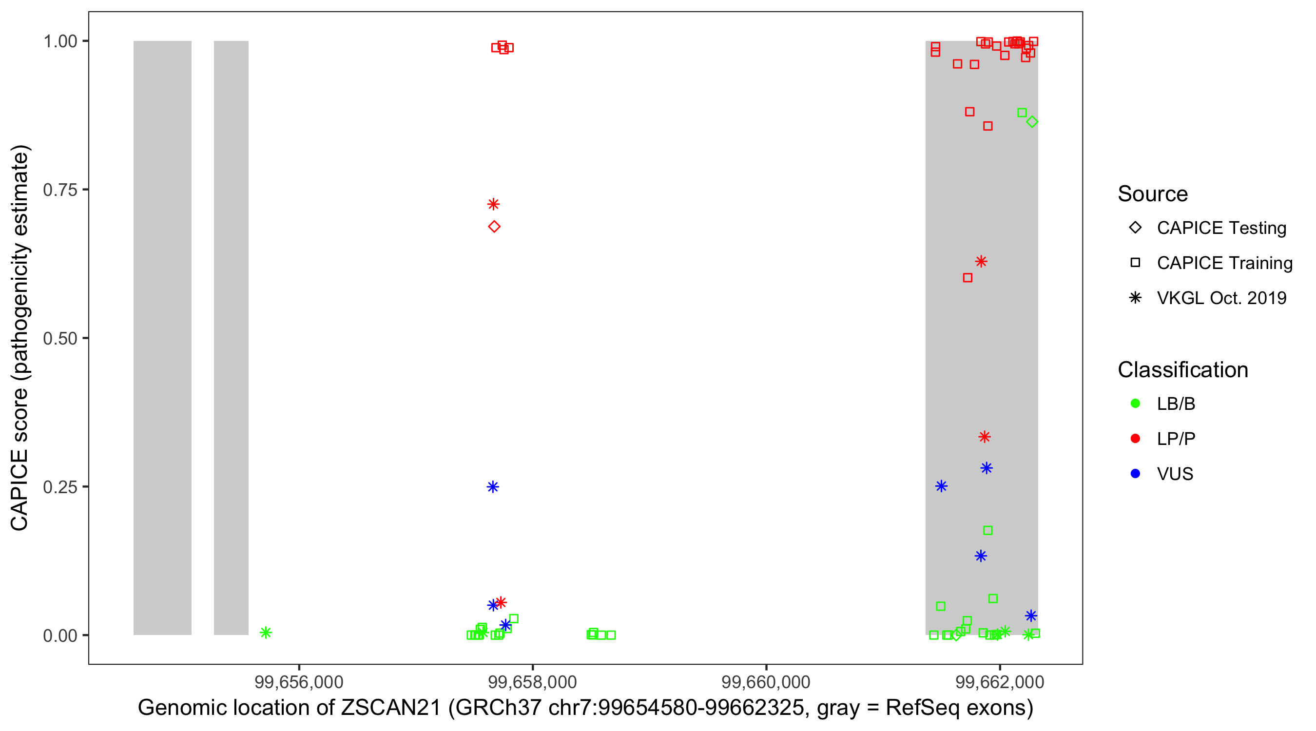 Shown are CAPICE train/test variants plus VKGL Oct 2019.