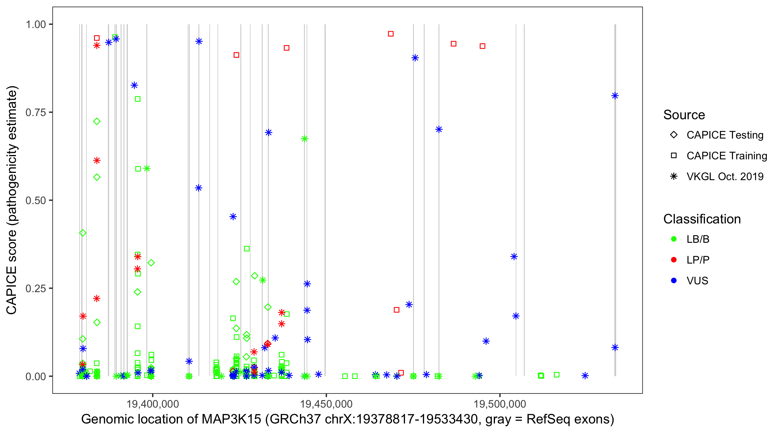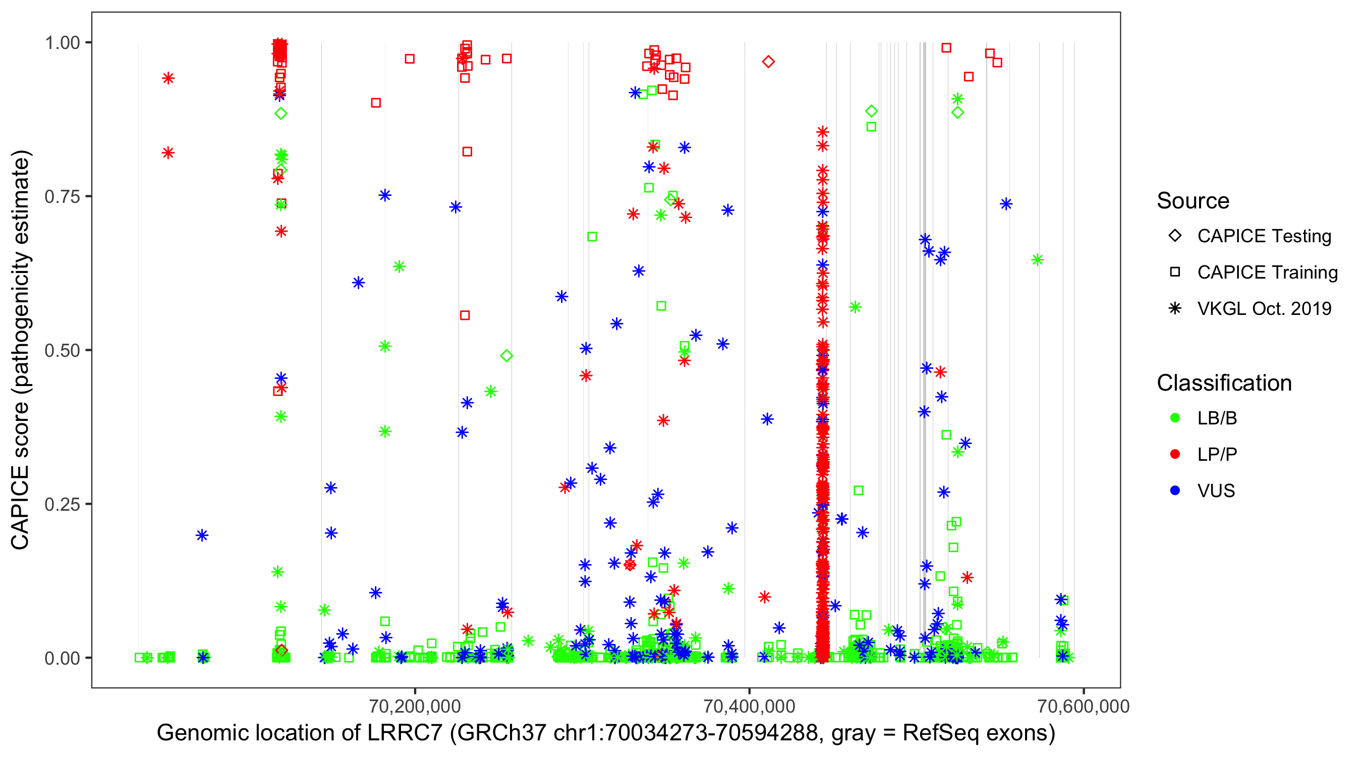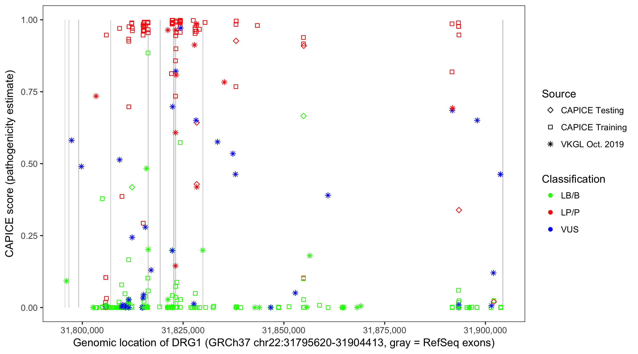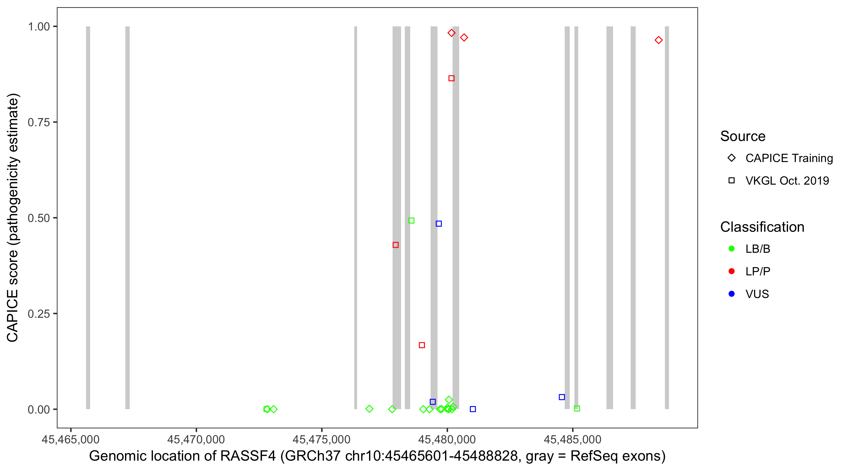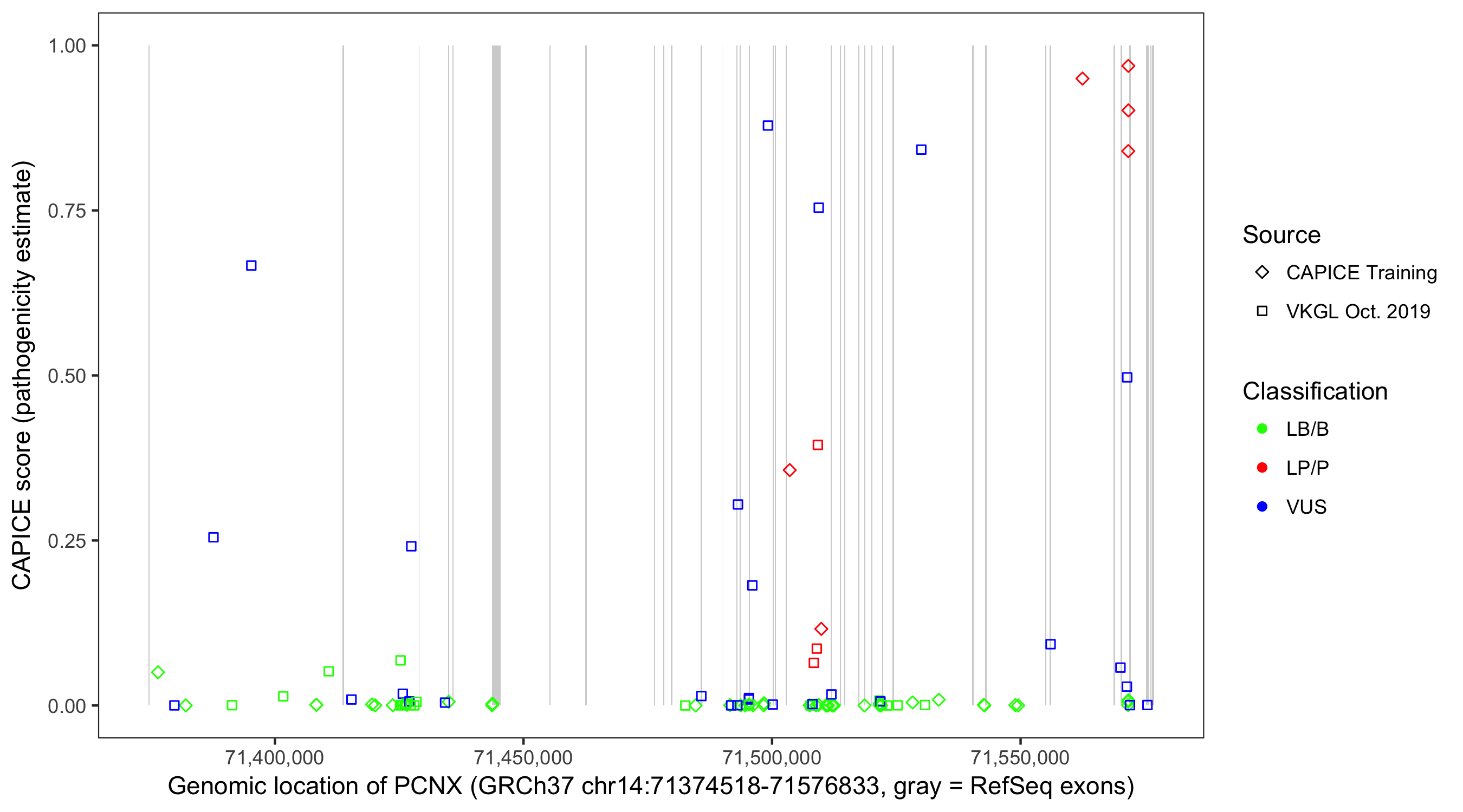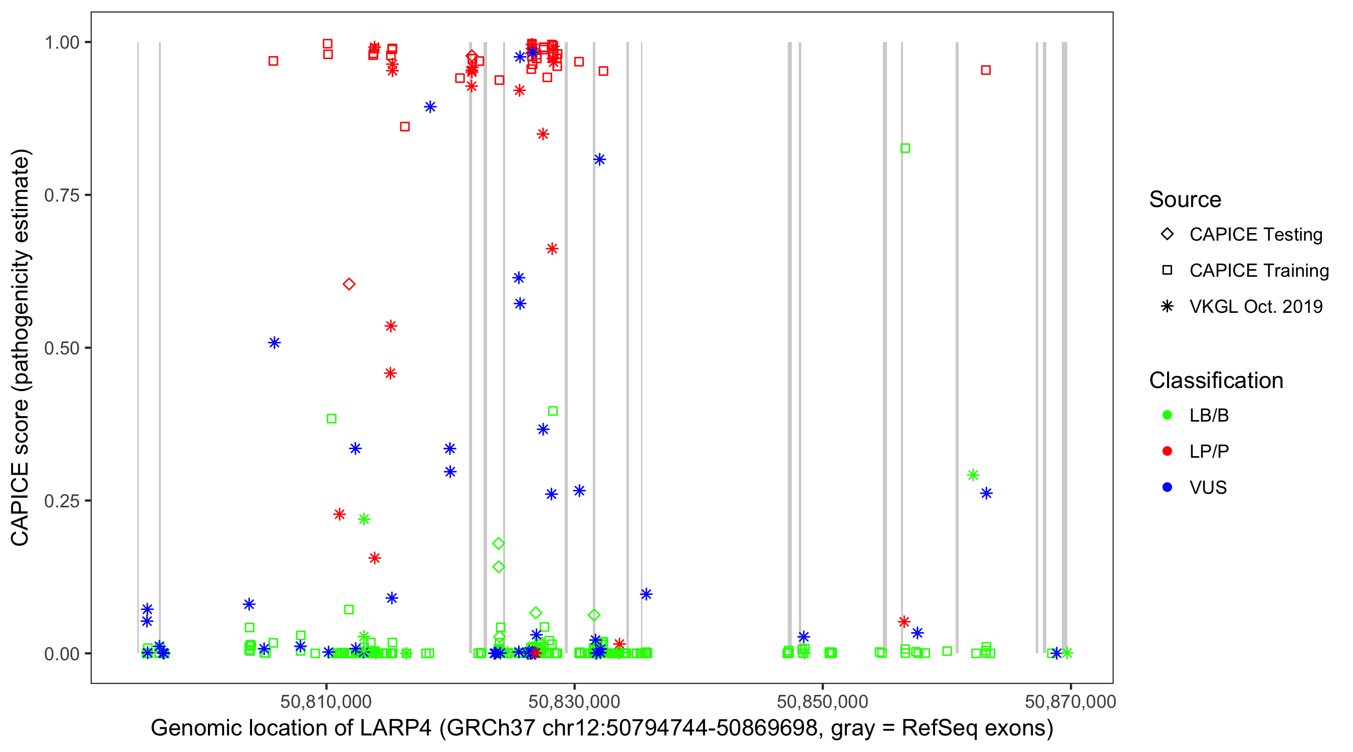 Shown are CAPICE train/test variants plus VKGL Oct 2019.