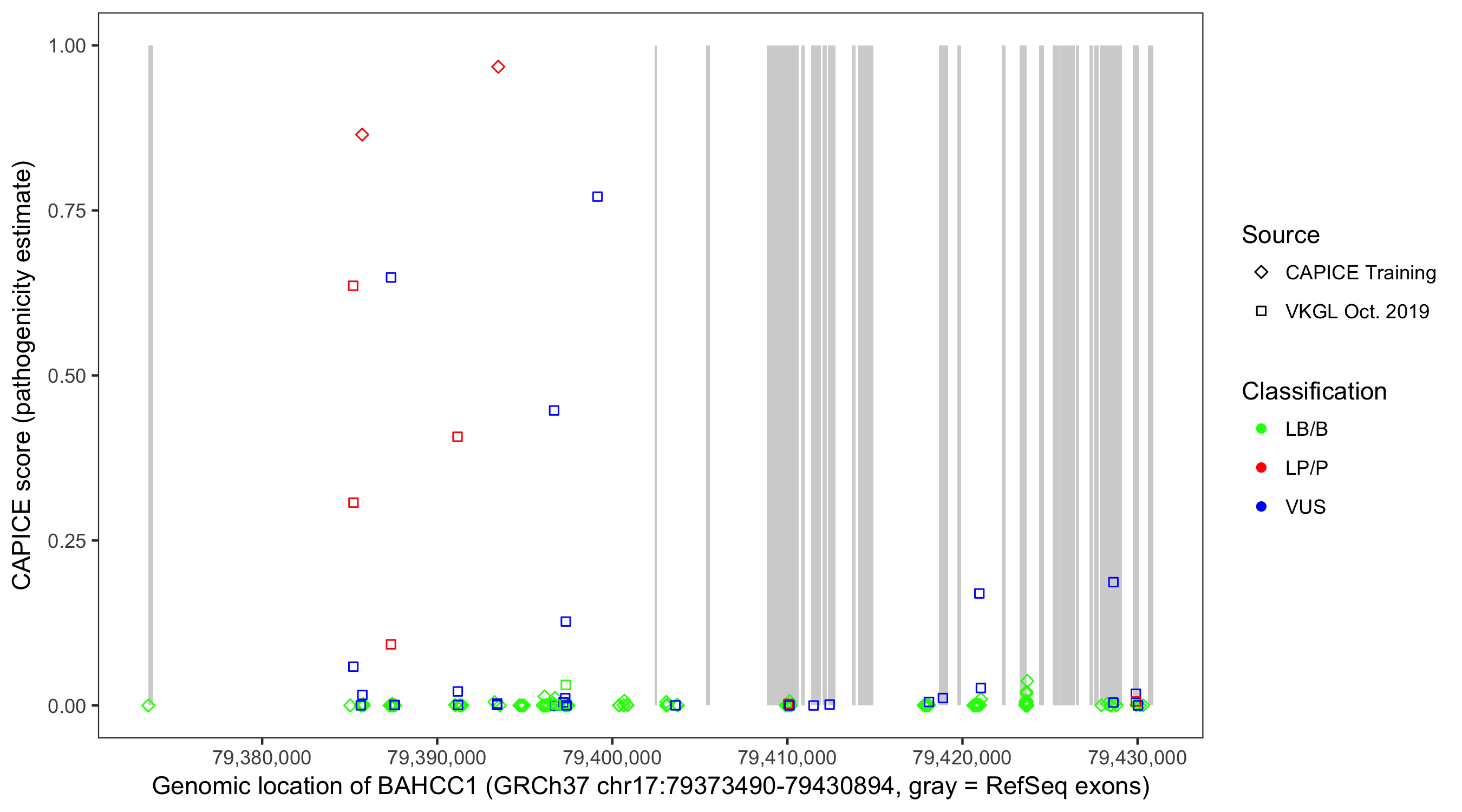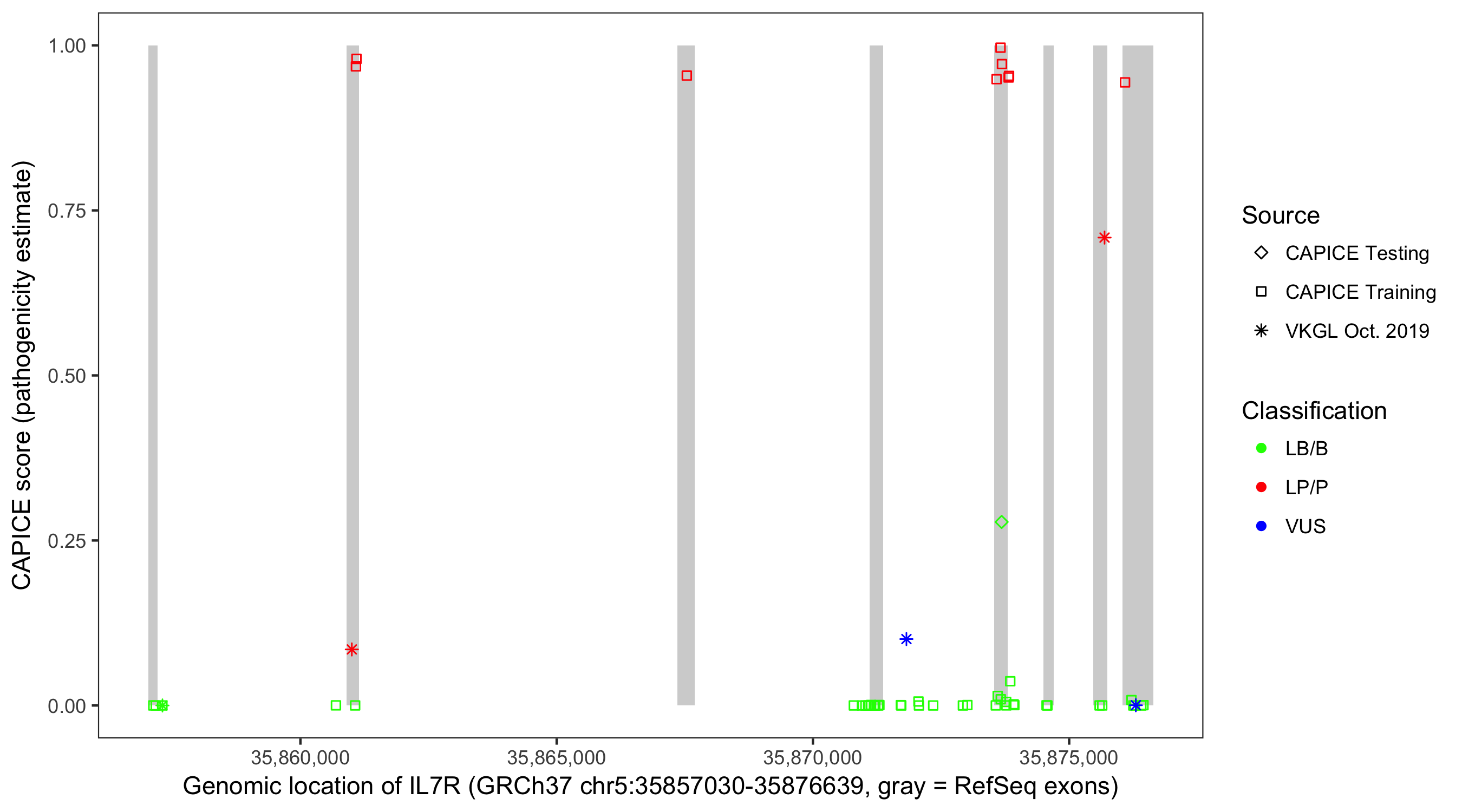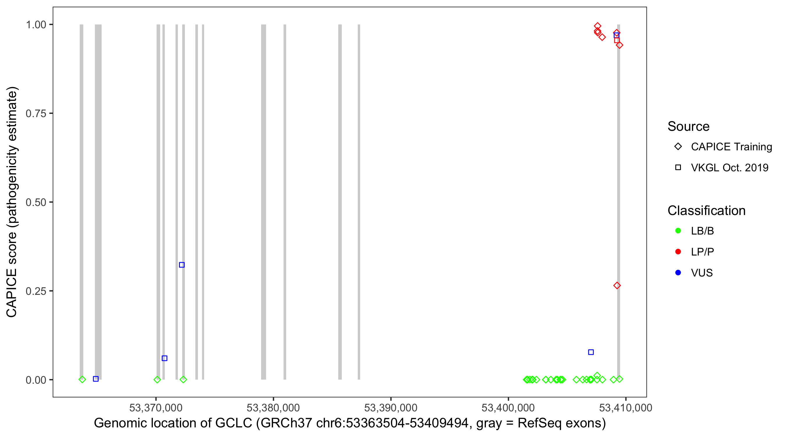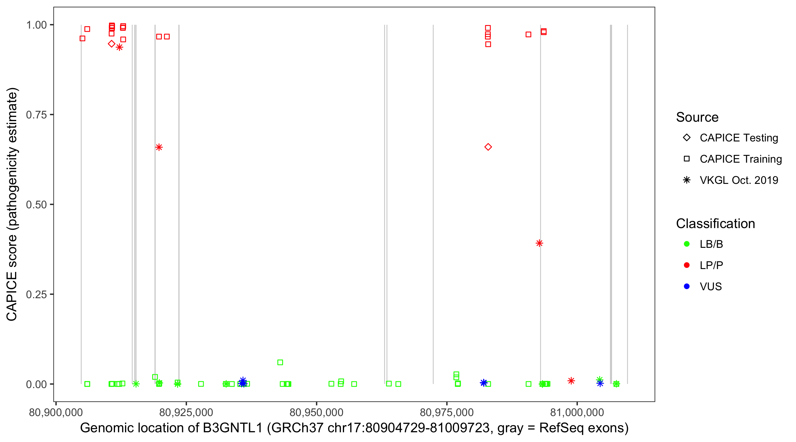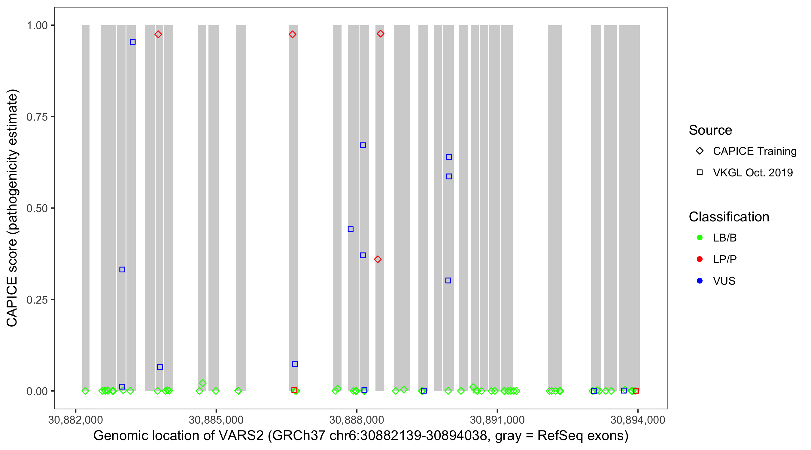 Shown are CAPICE train/test variants plus VKGL Oct 2019.