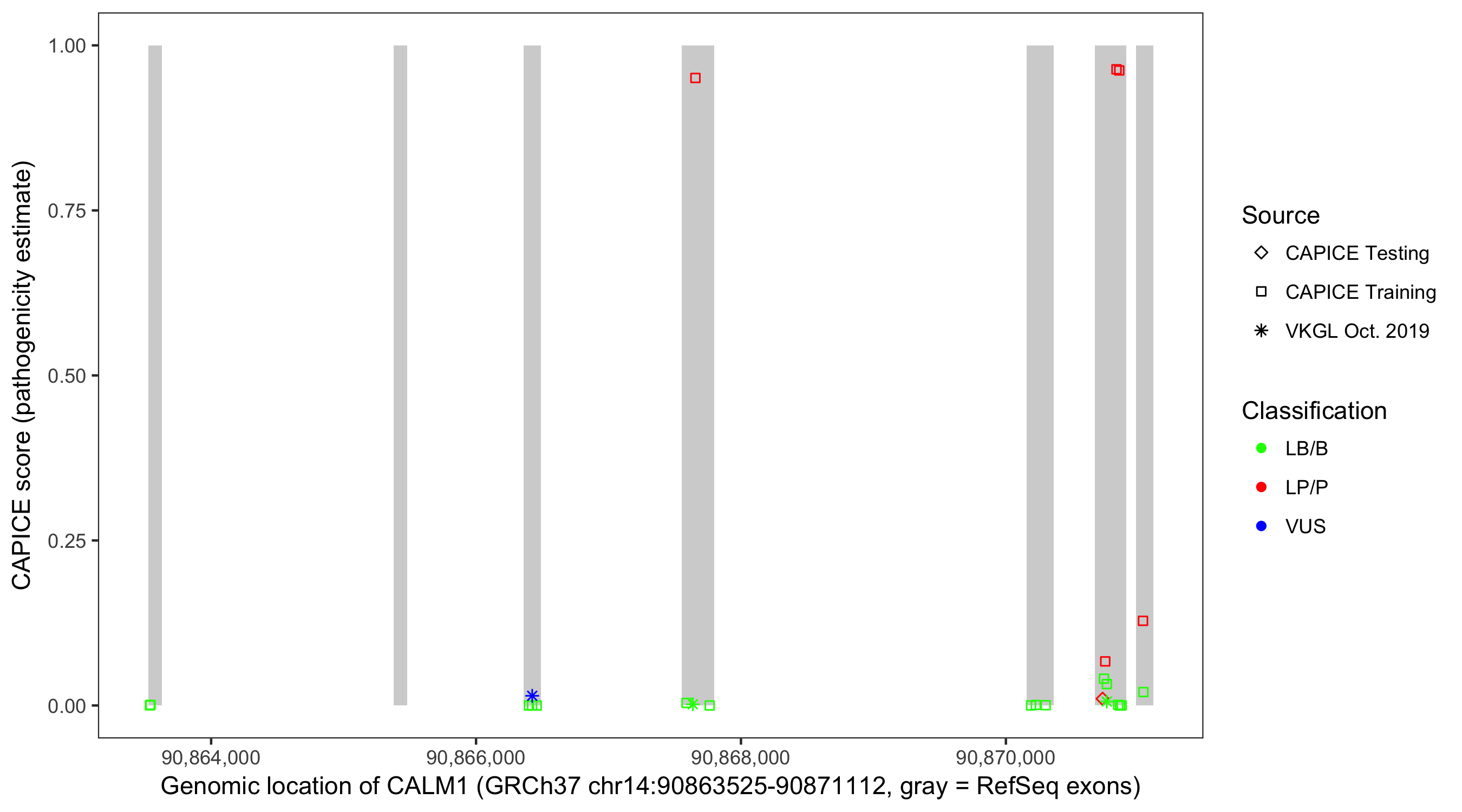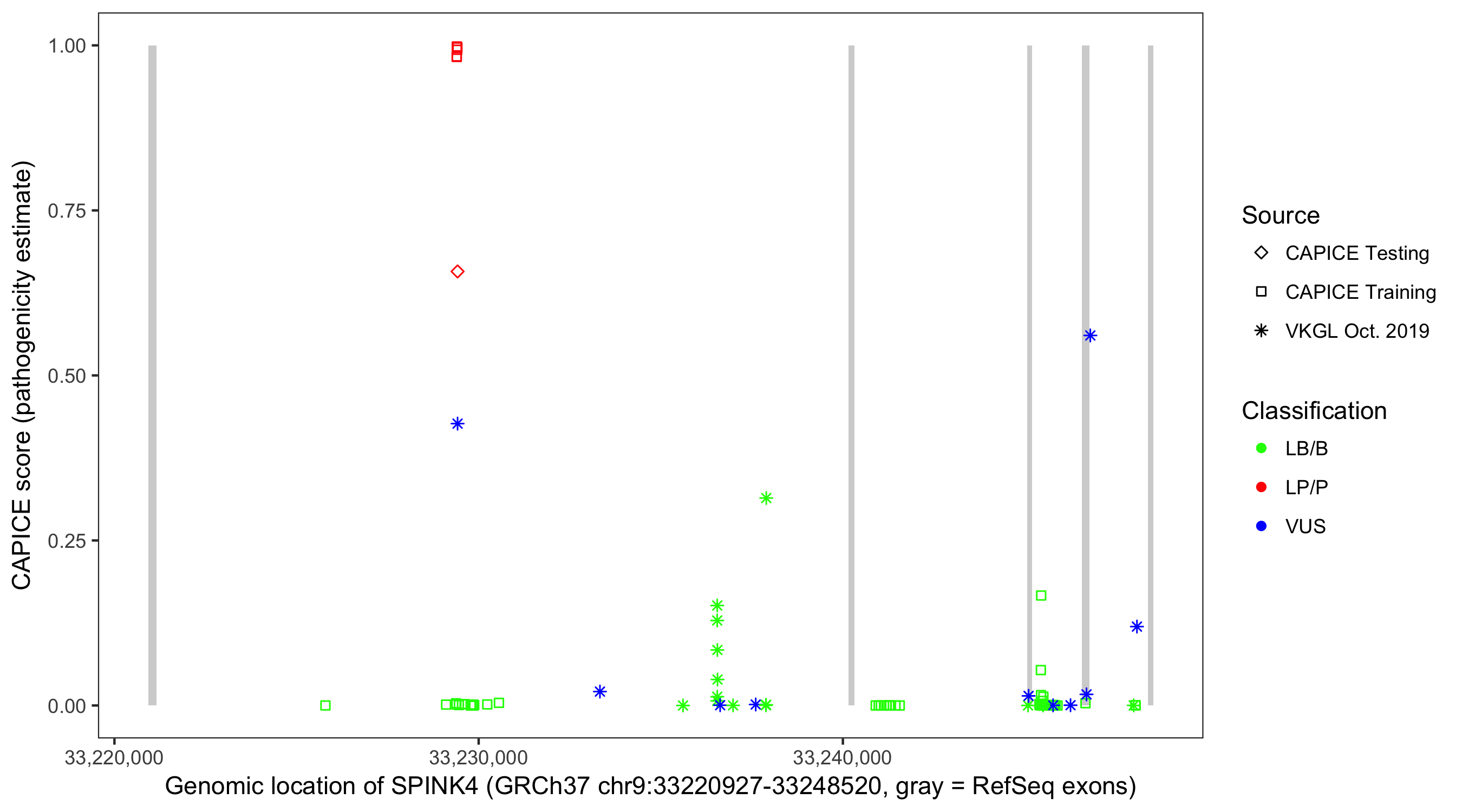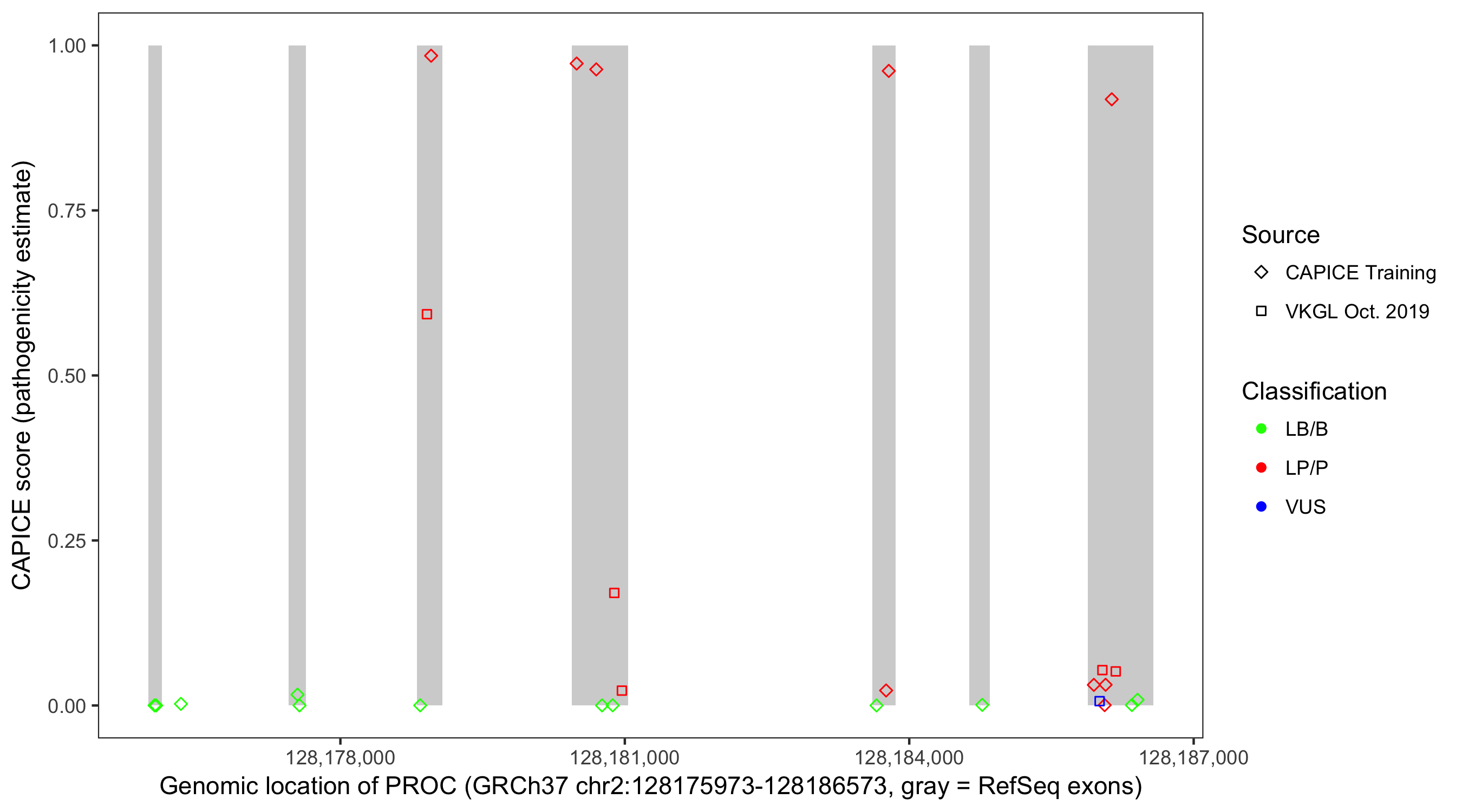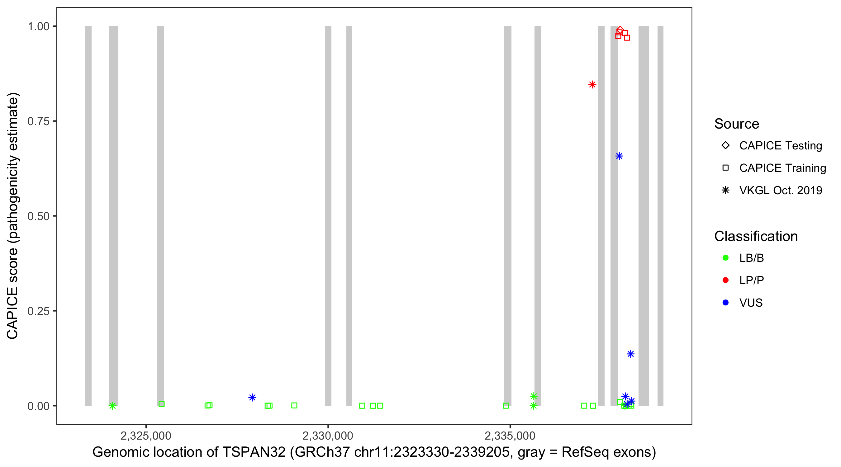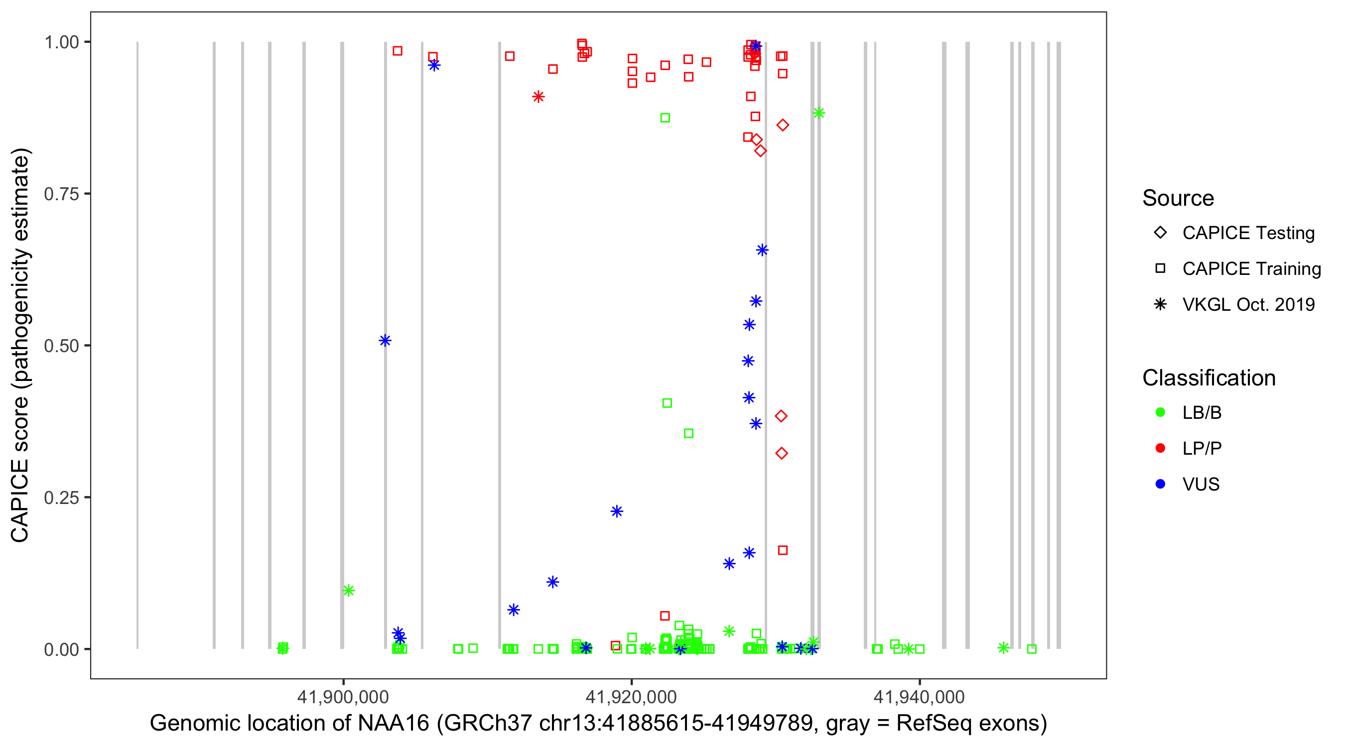 Shown are CAPICE train/test variants plus VKGL Oct 2019.