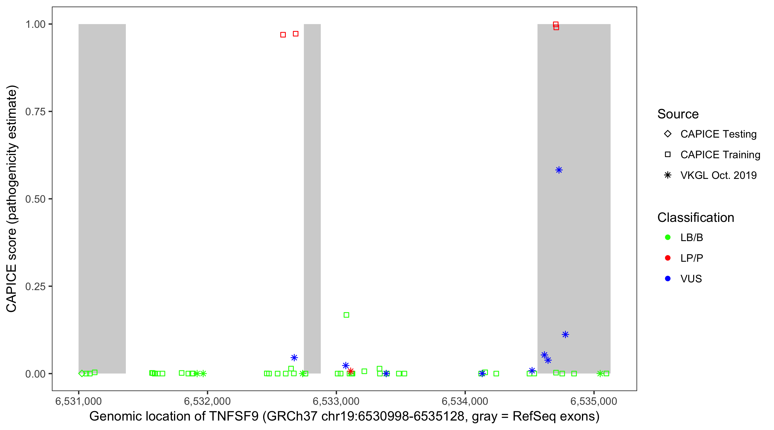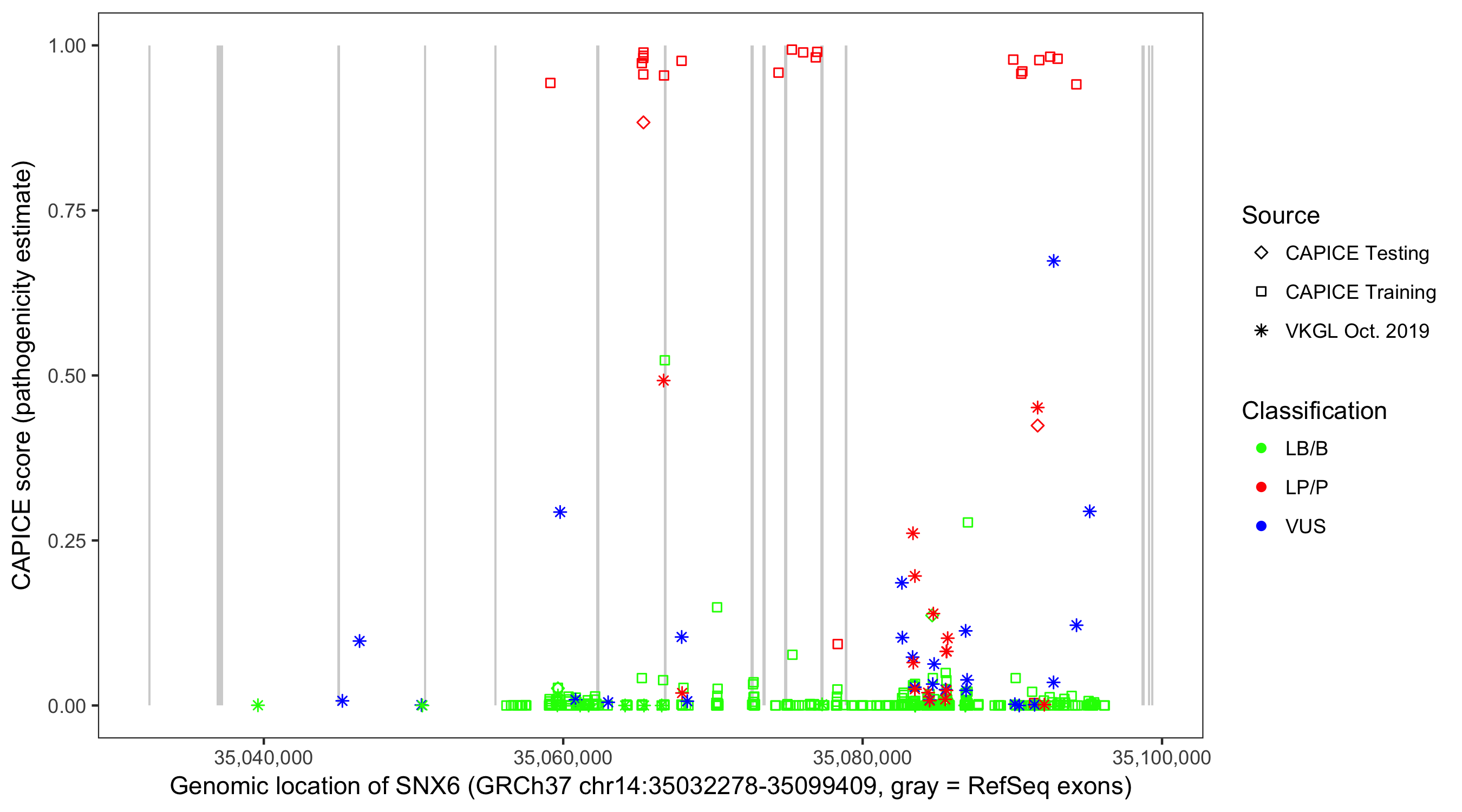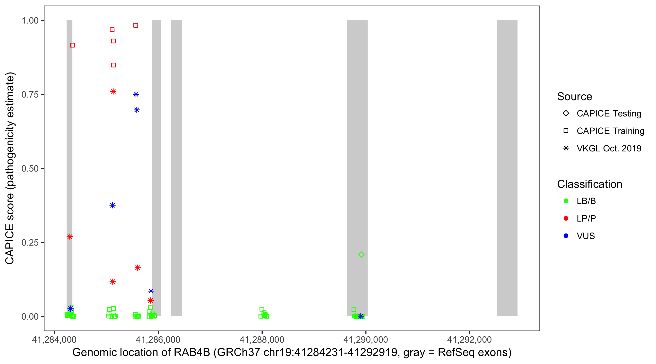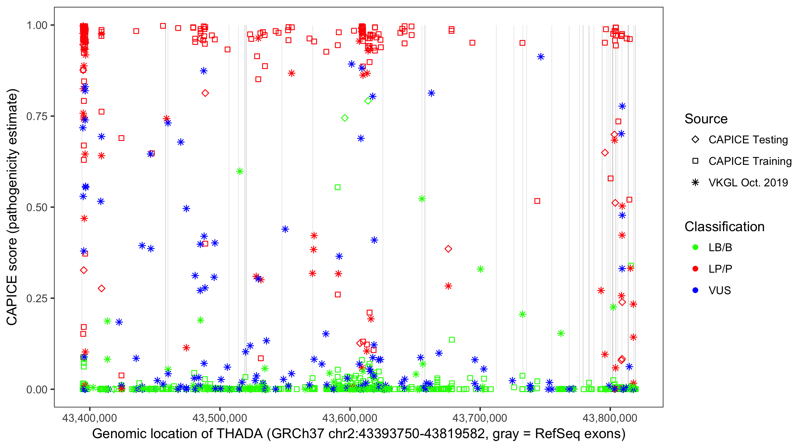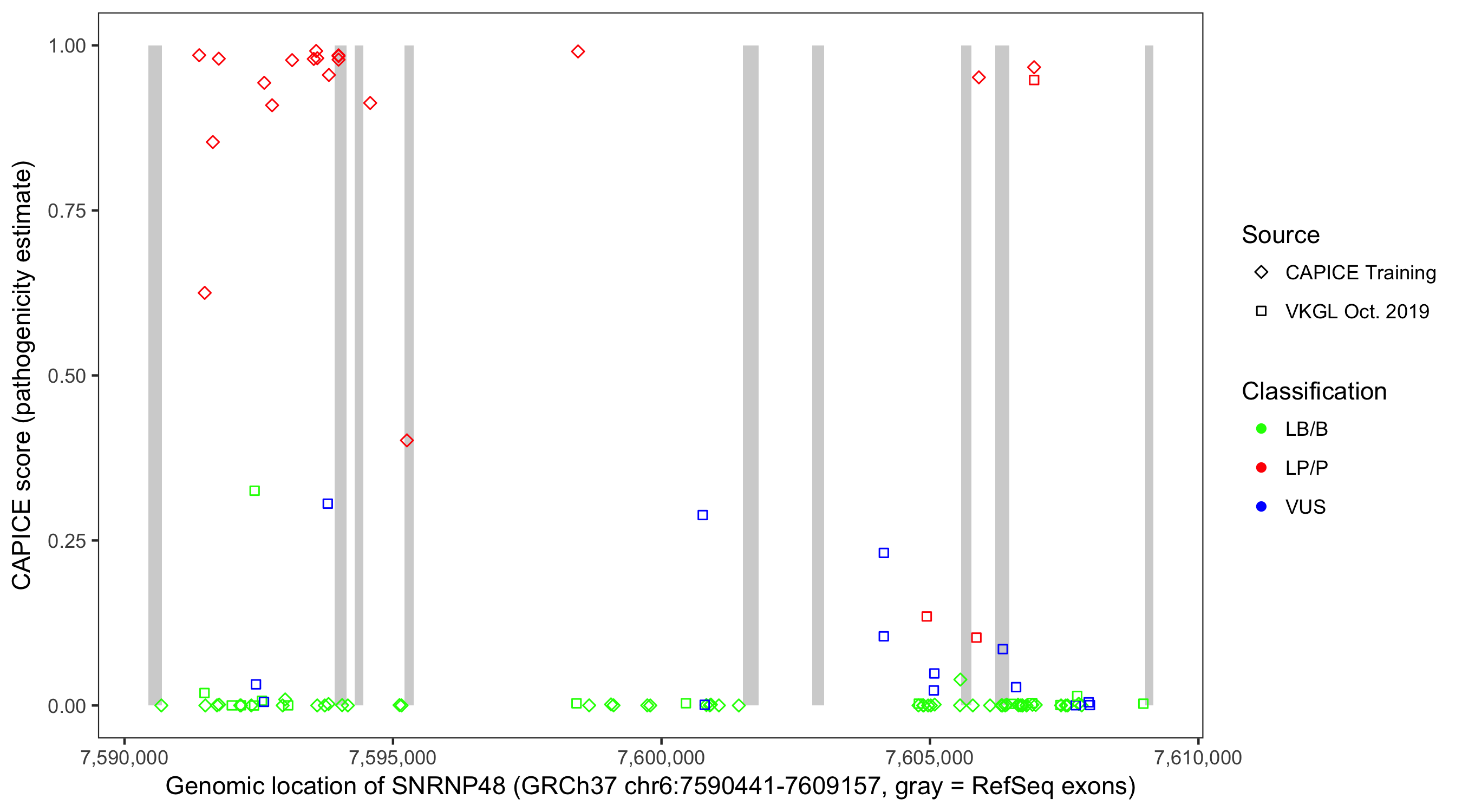 Shown are CAPICE train/test variants plus VKGL Oct 2019.