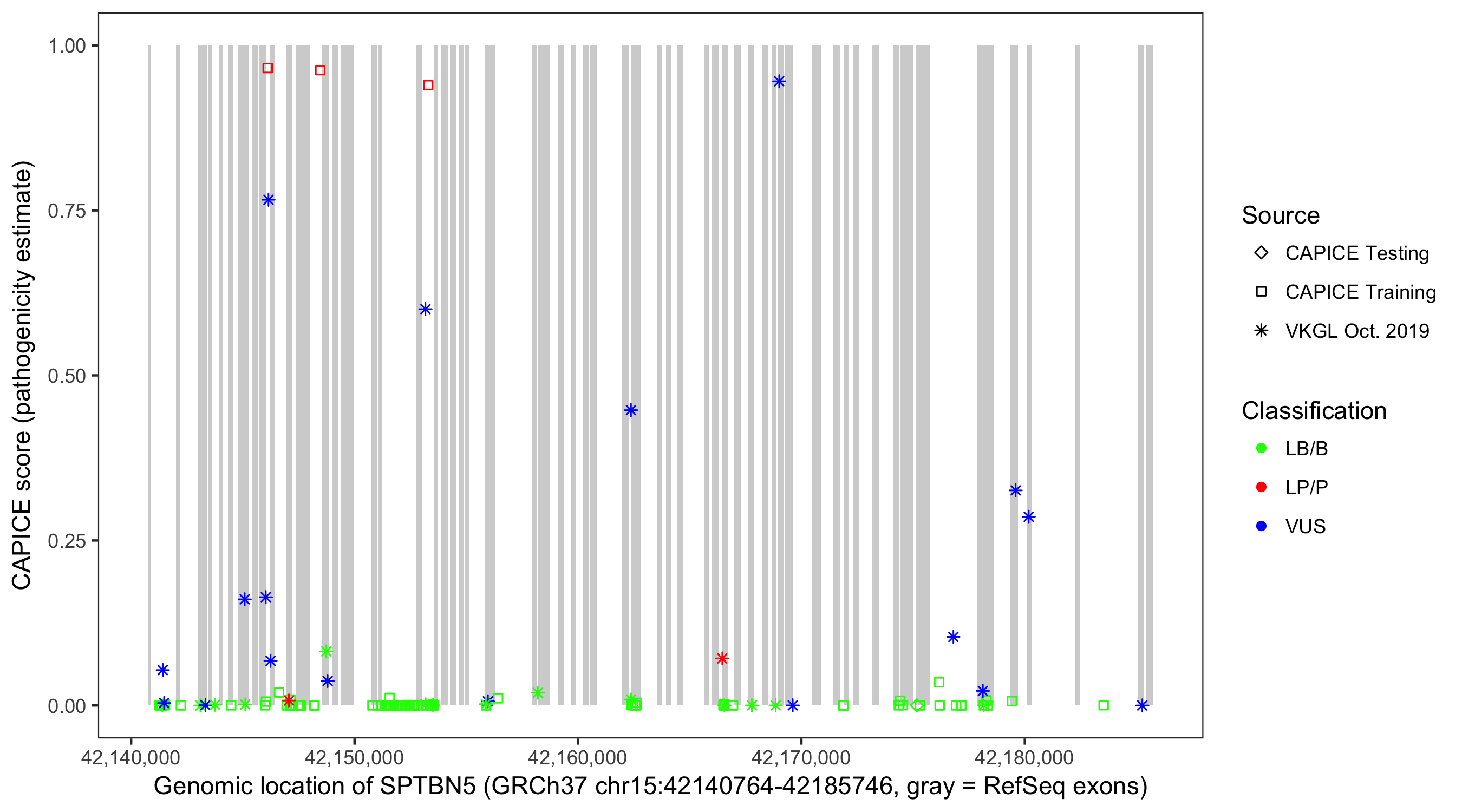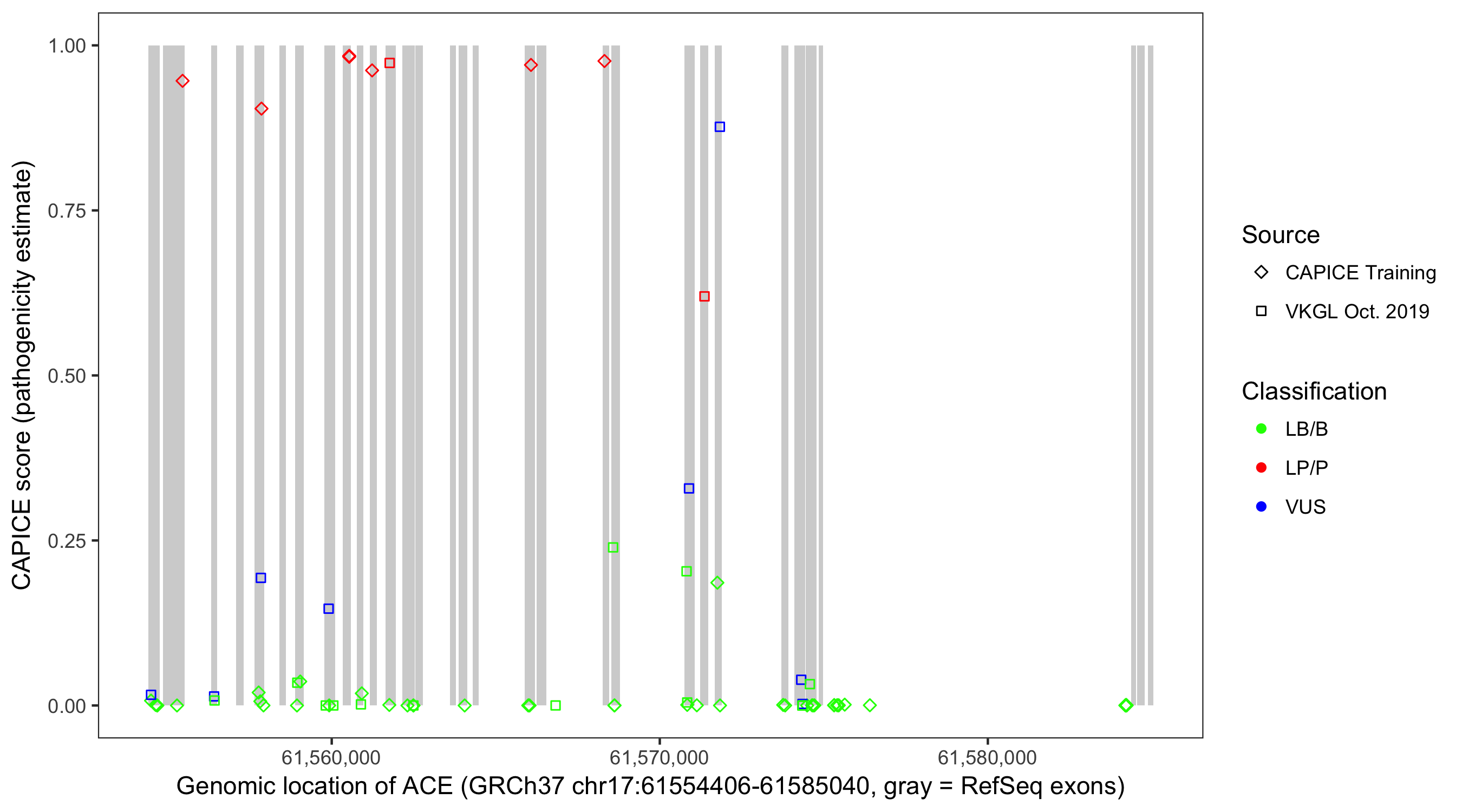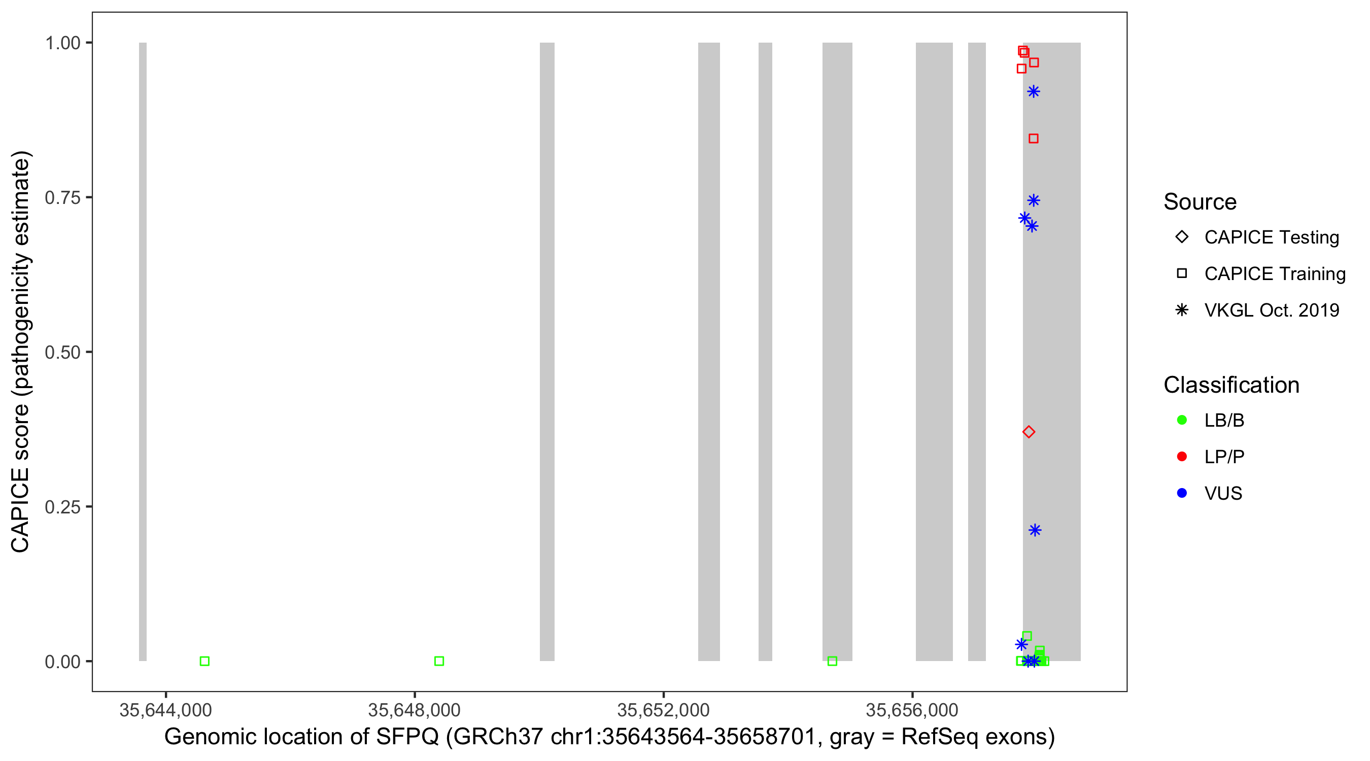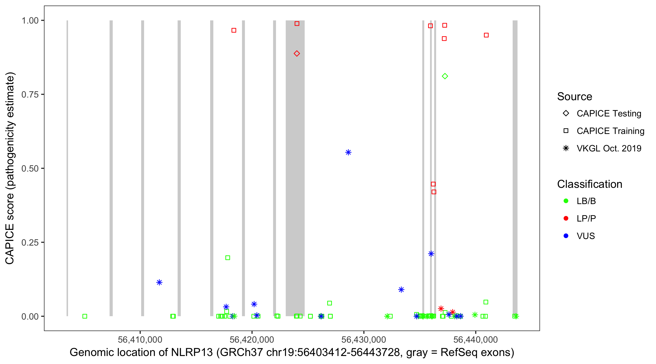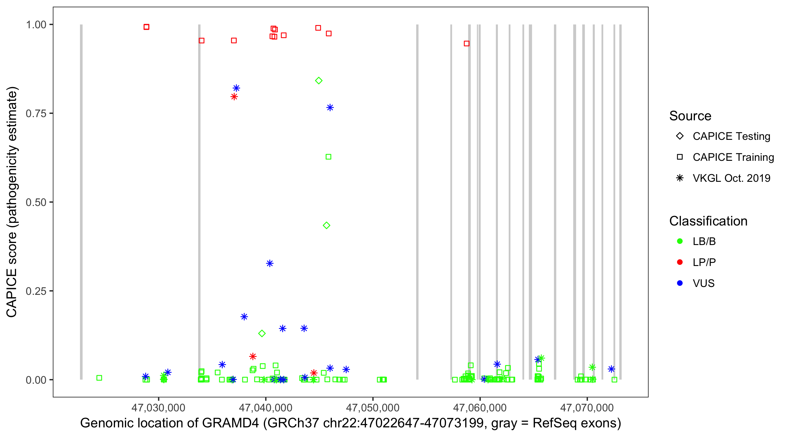 Shown are CAPICE train/test variants plus VKGL Oct 2019.