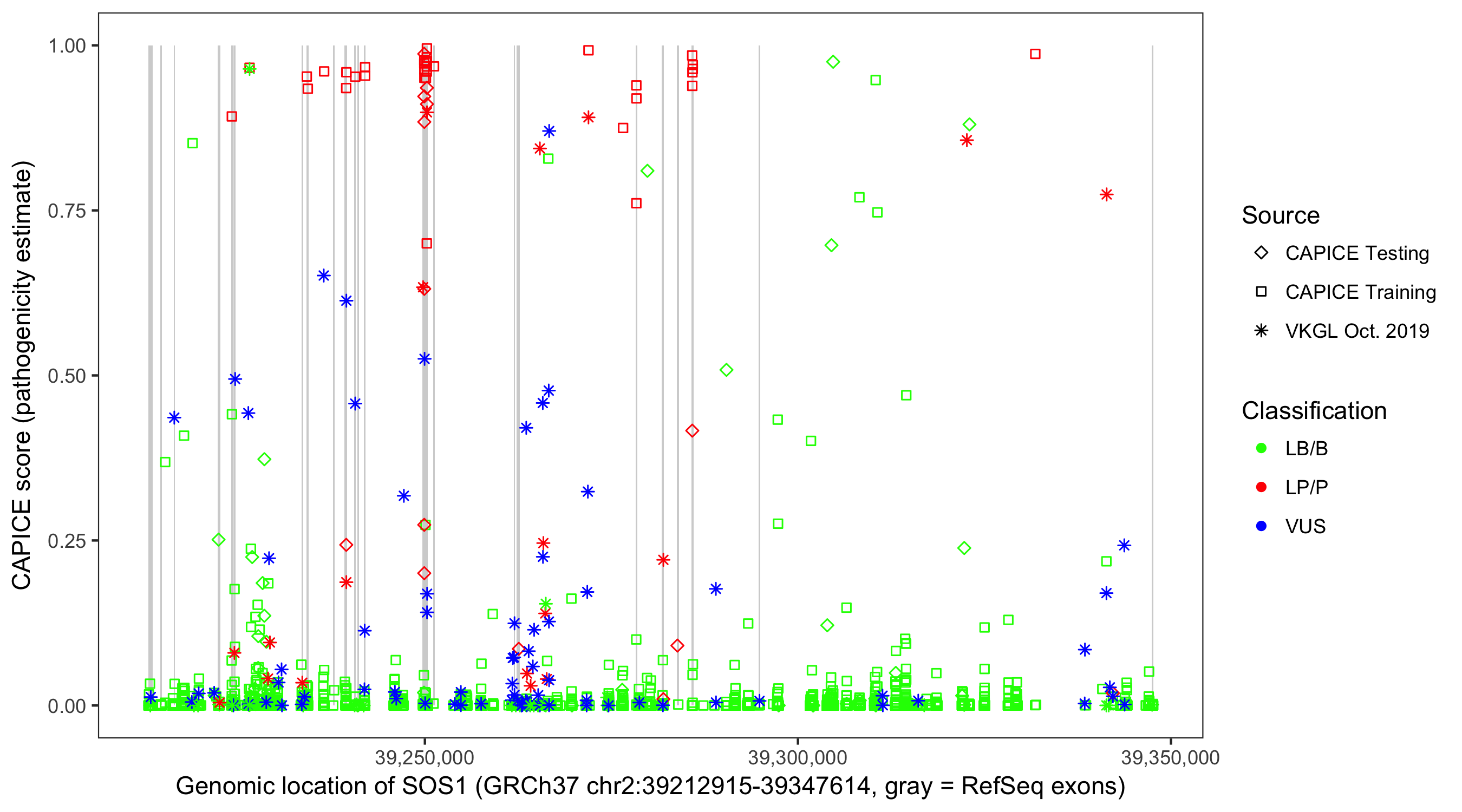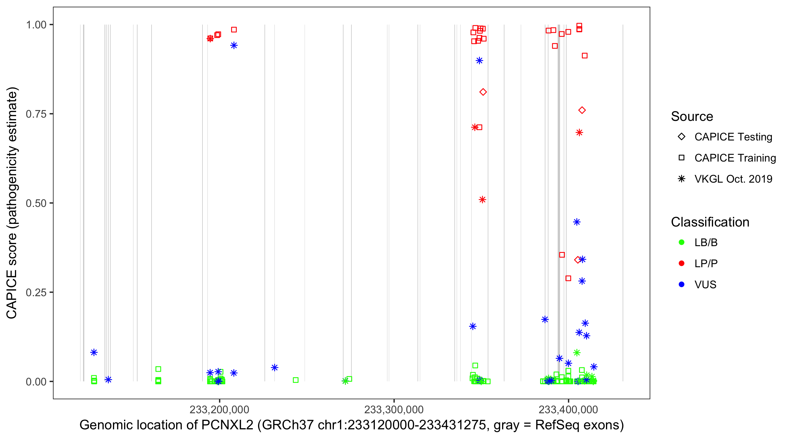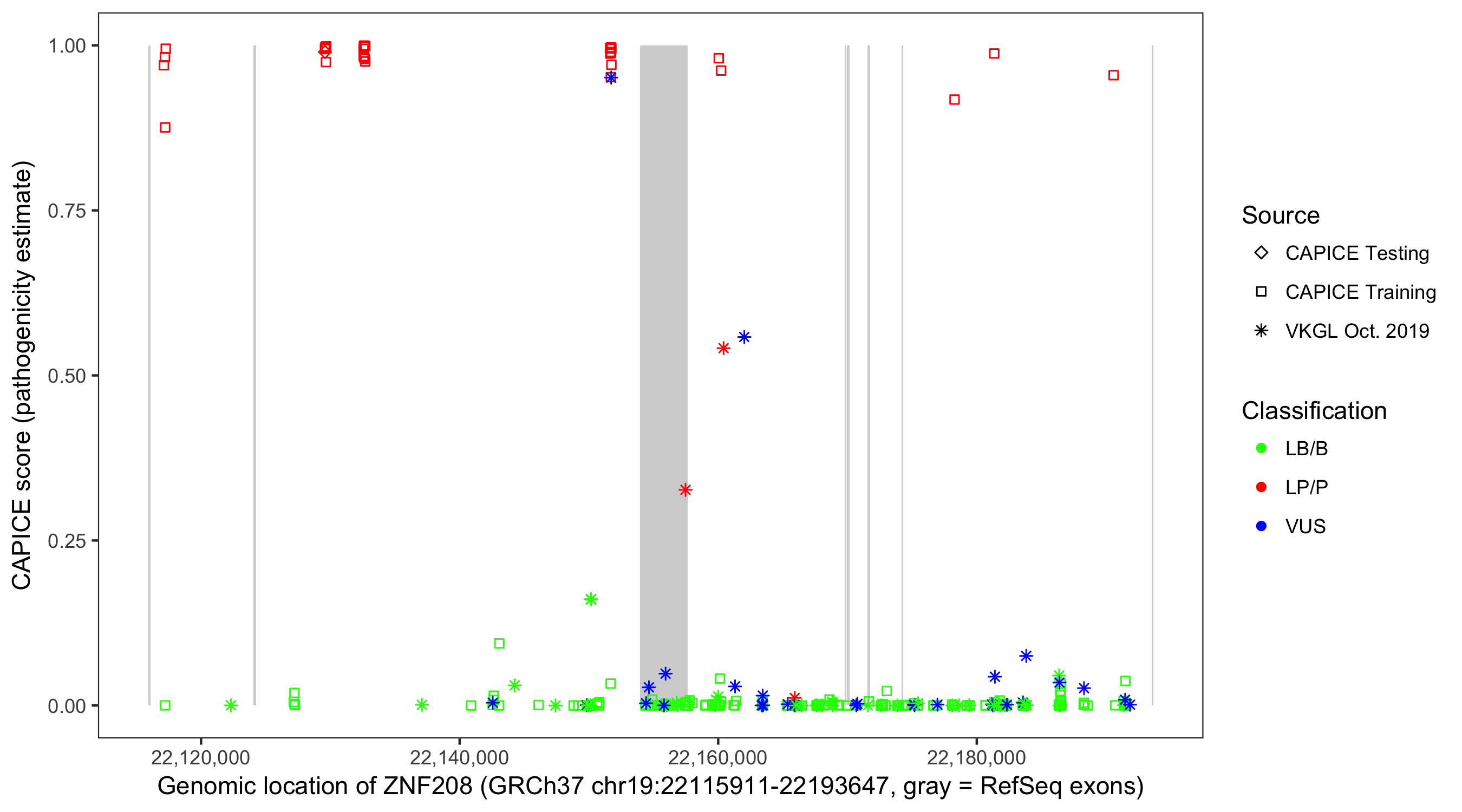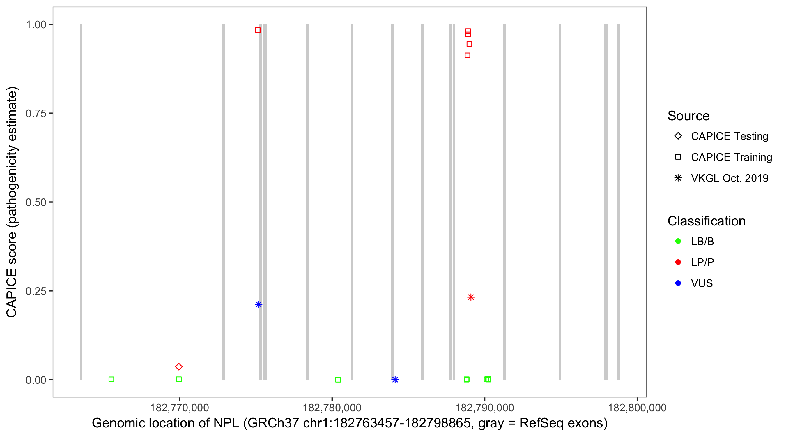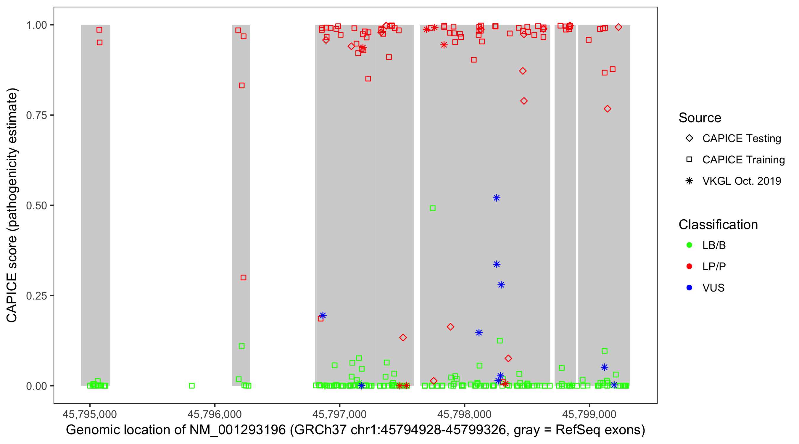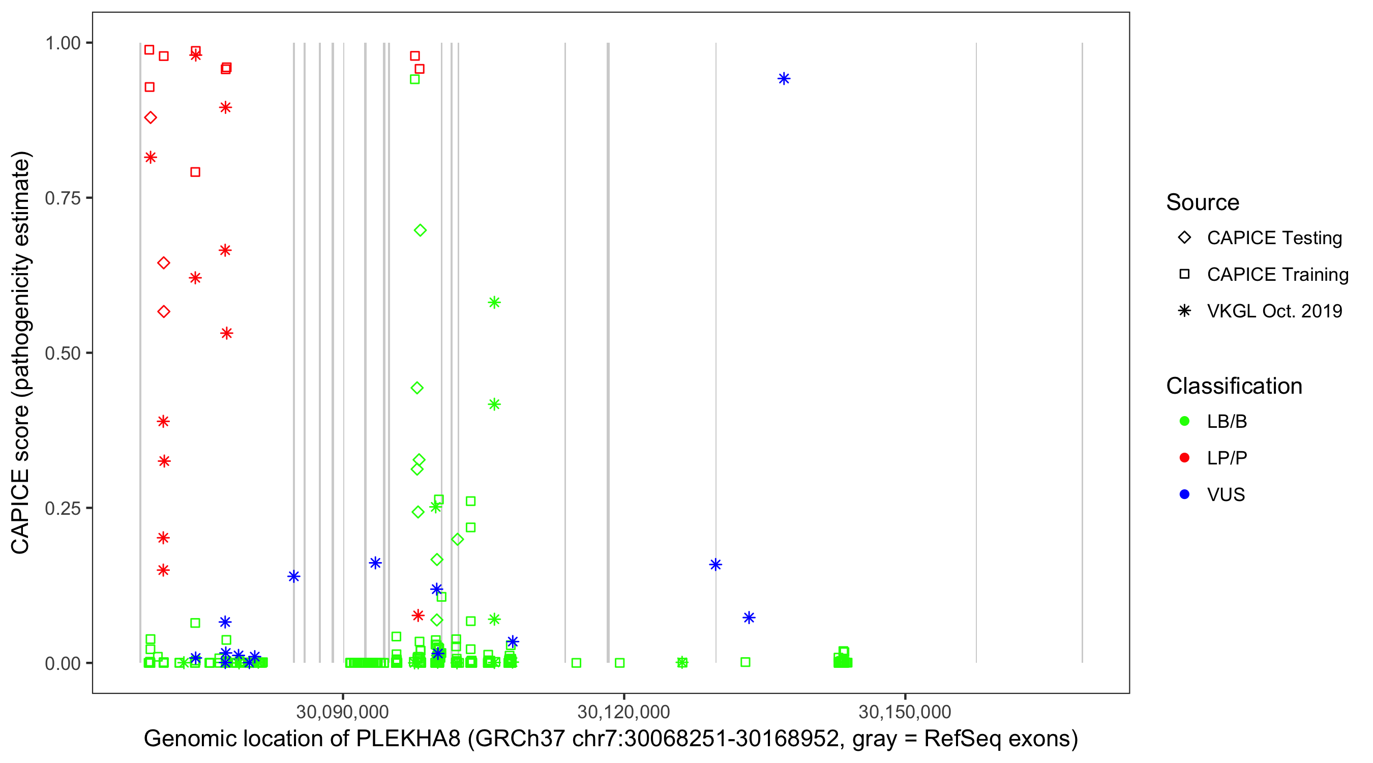 Shown are CAPICE train/test variants plus VKGL Oct 2019.