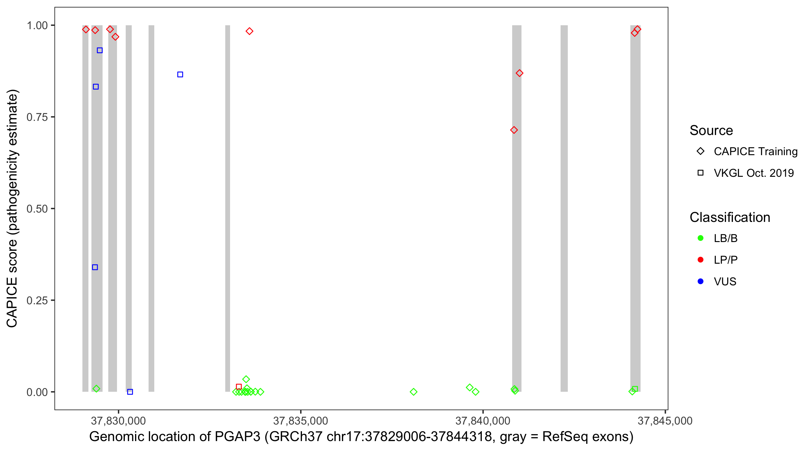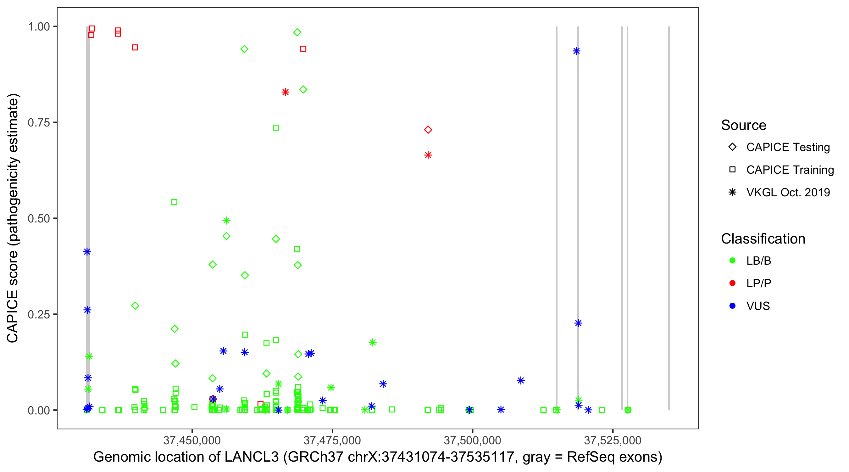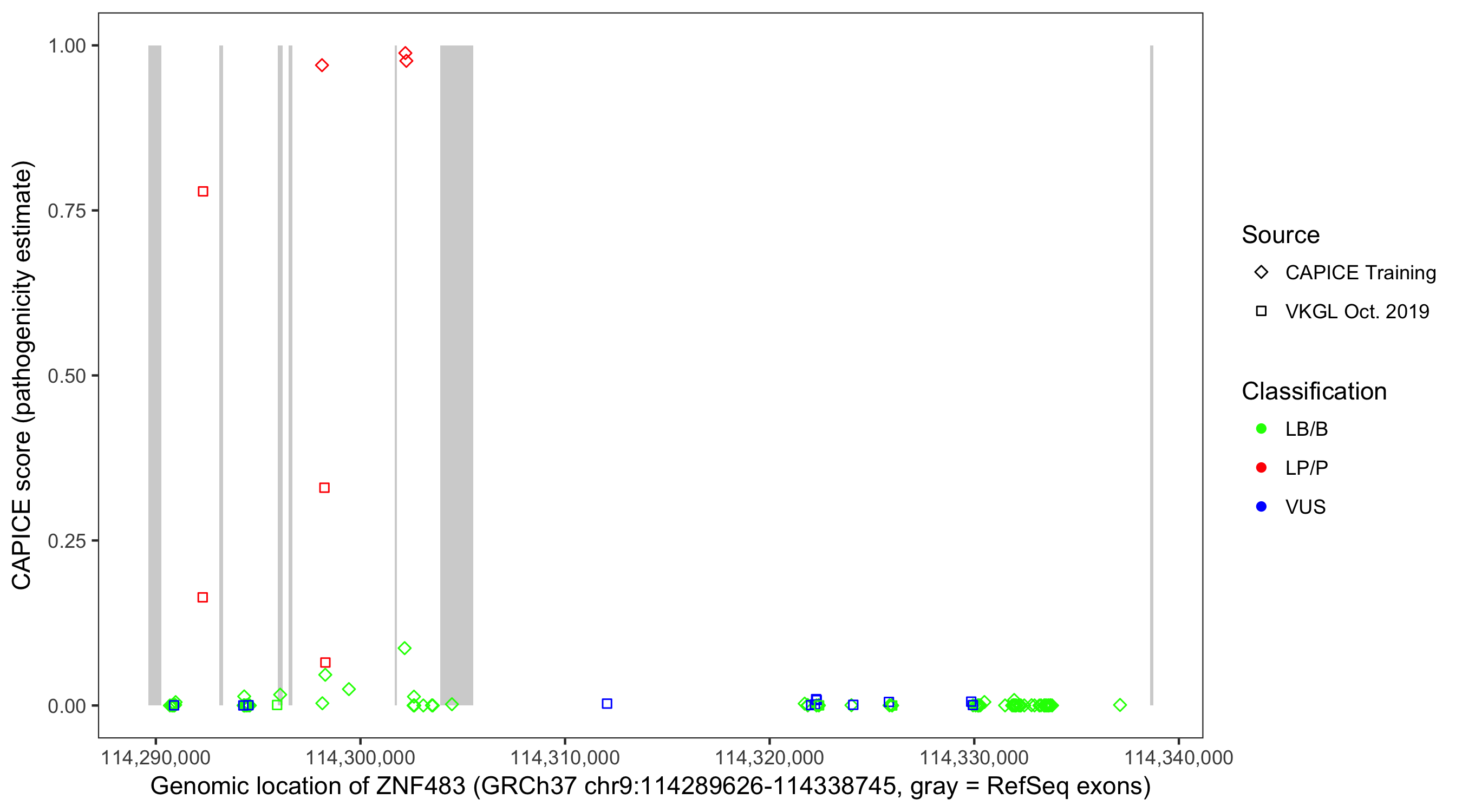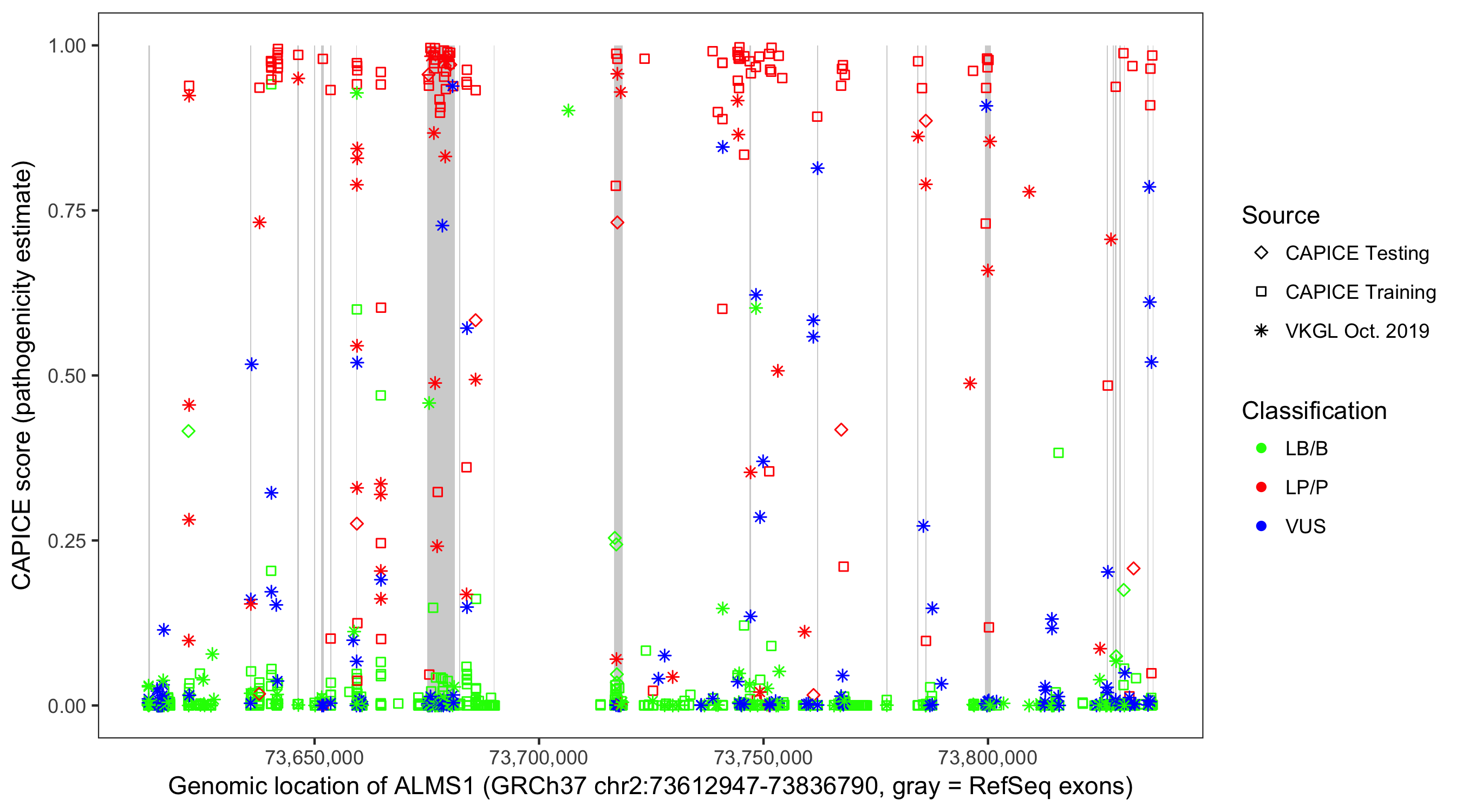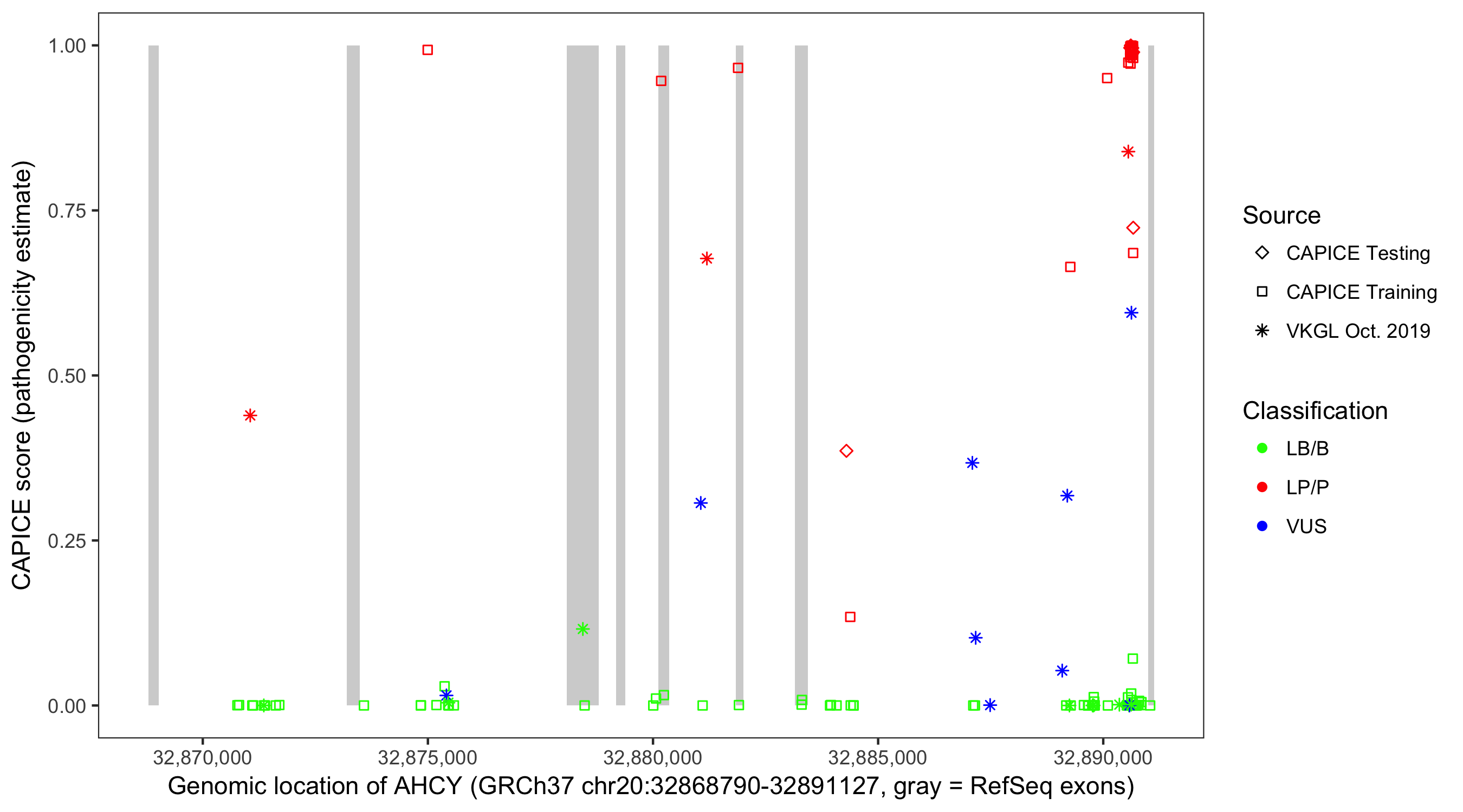 Shown are CAPICE train/test variants plus VKGL Oct 2019.