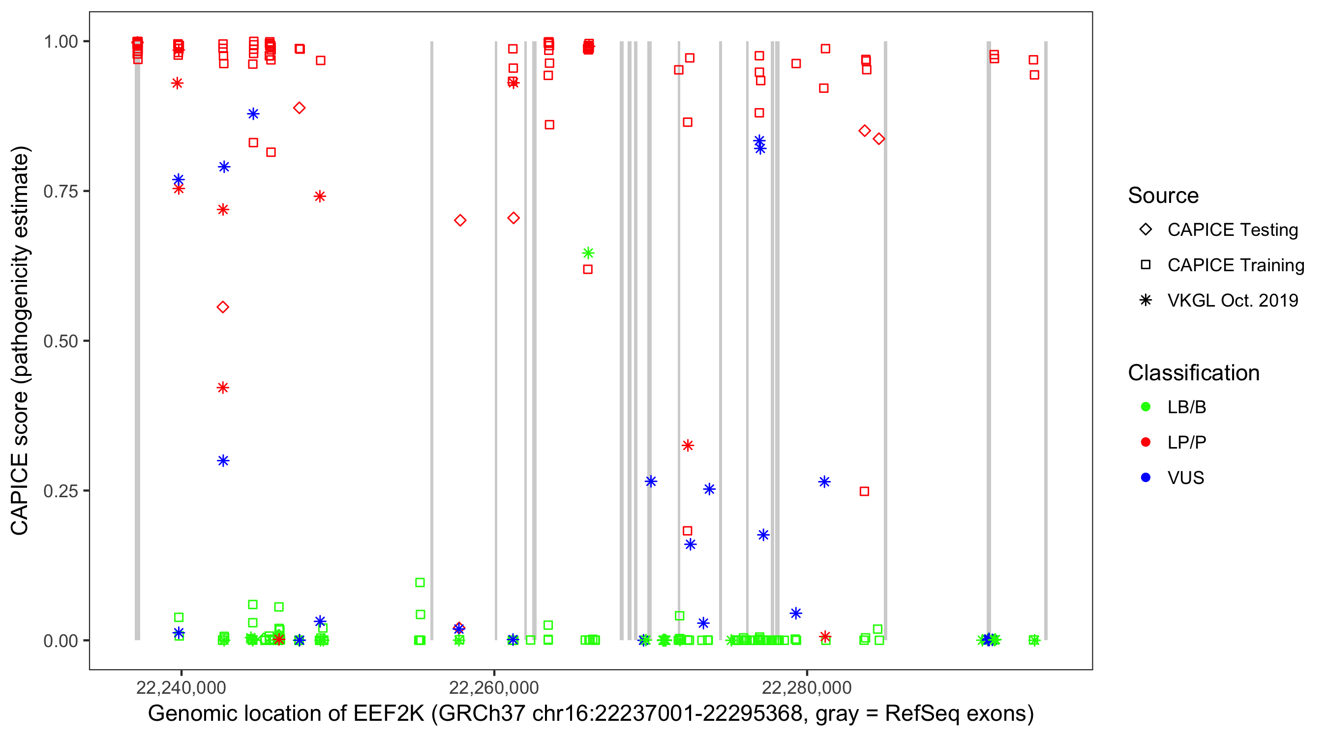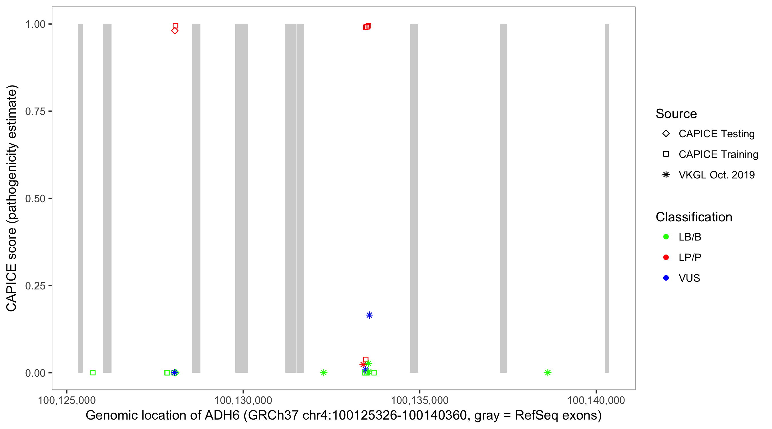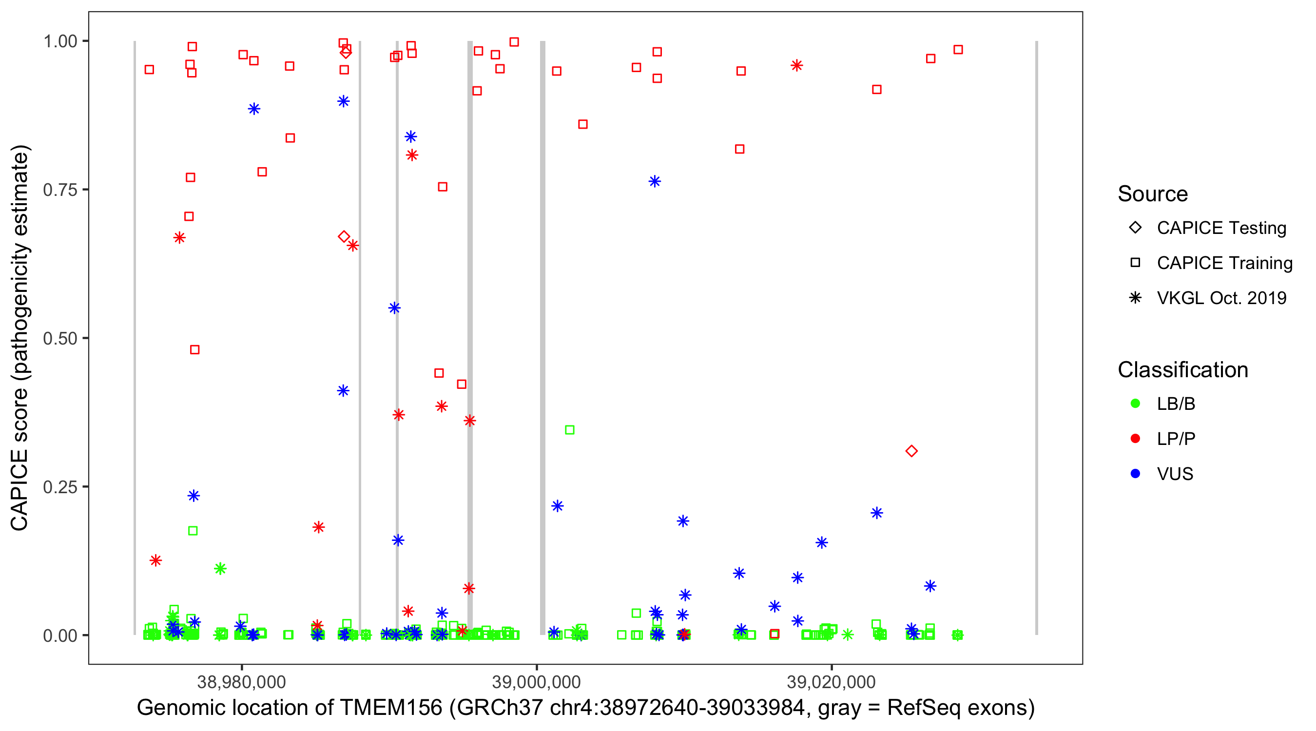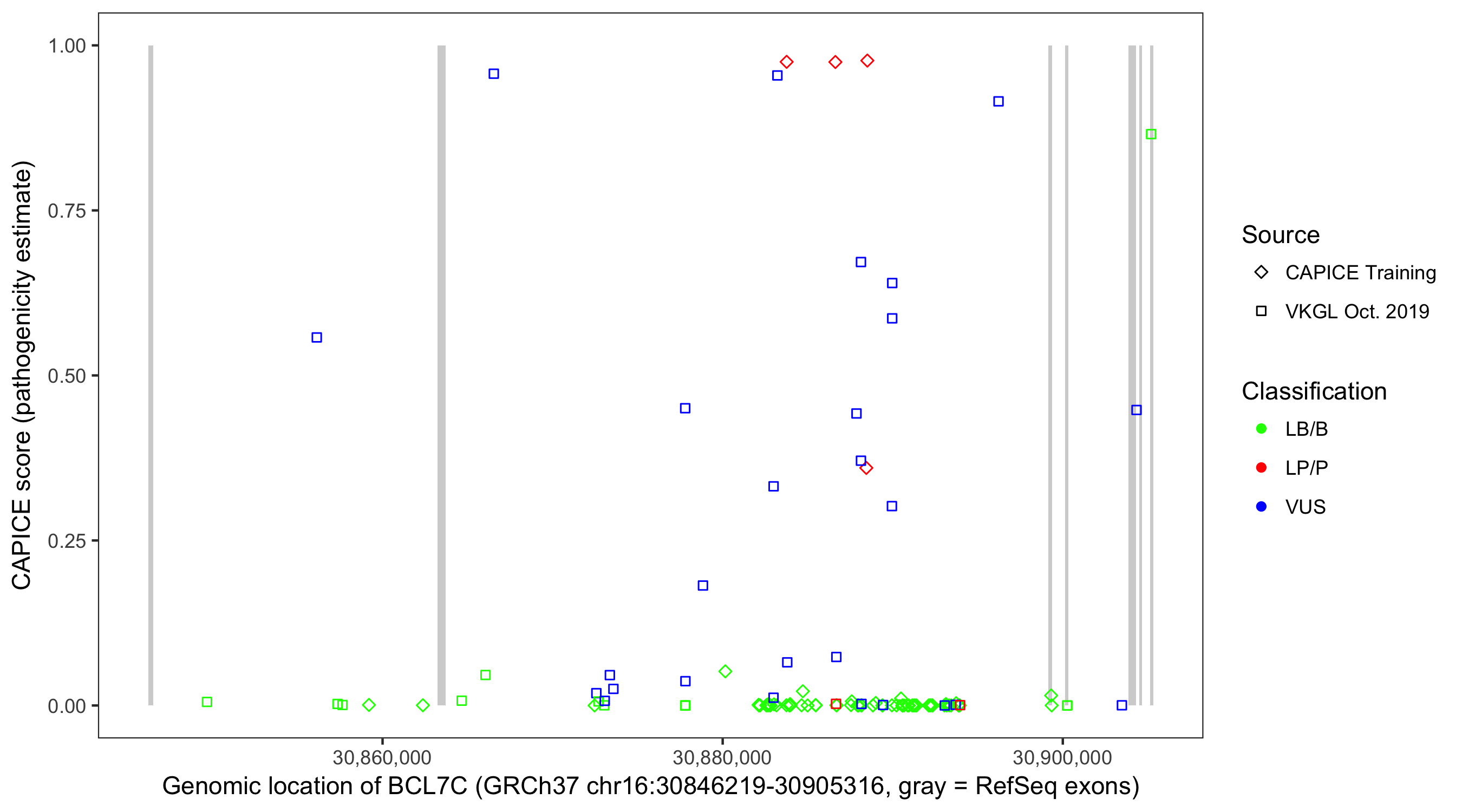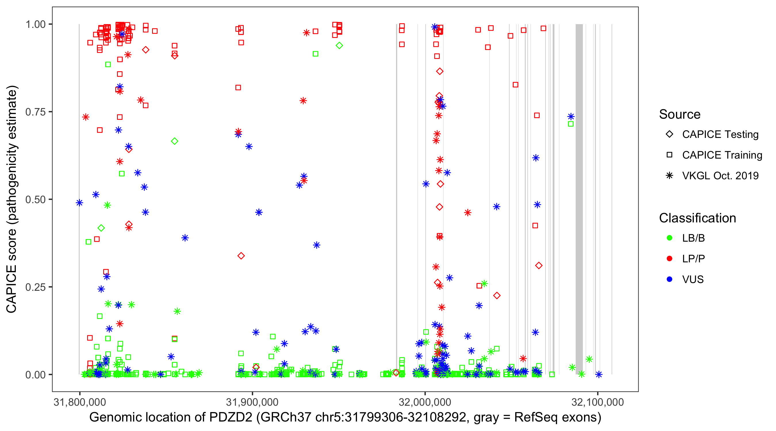 Shown are CAPICE train/test variants plus VKGL Oct 2019.