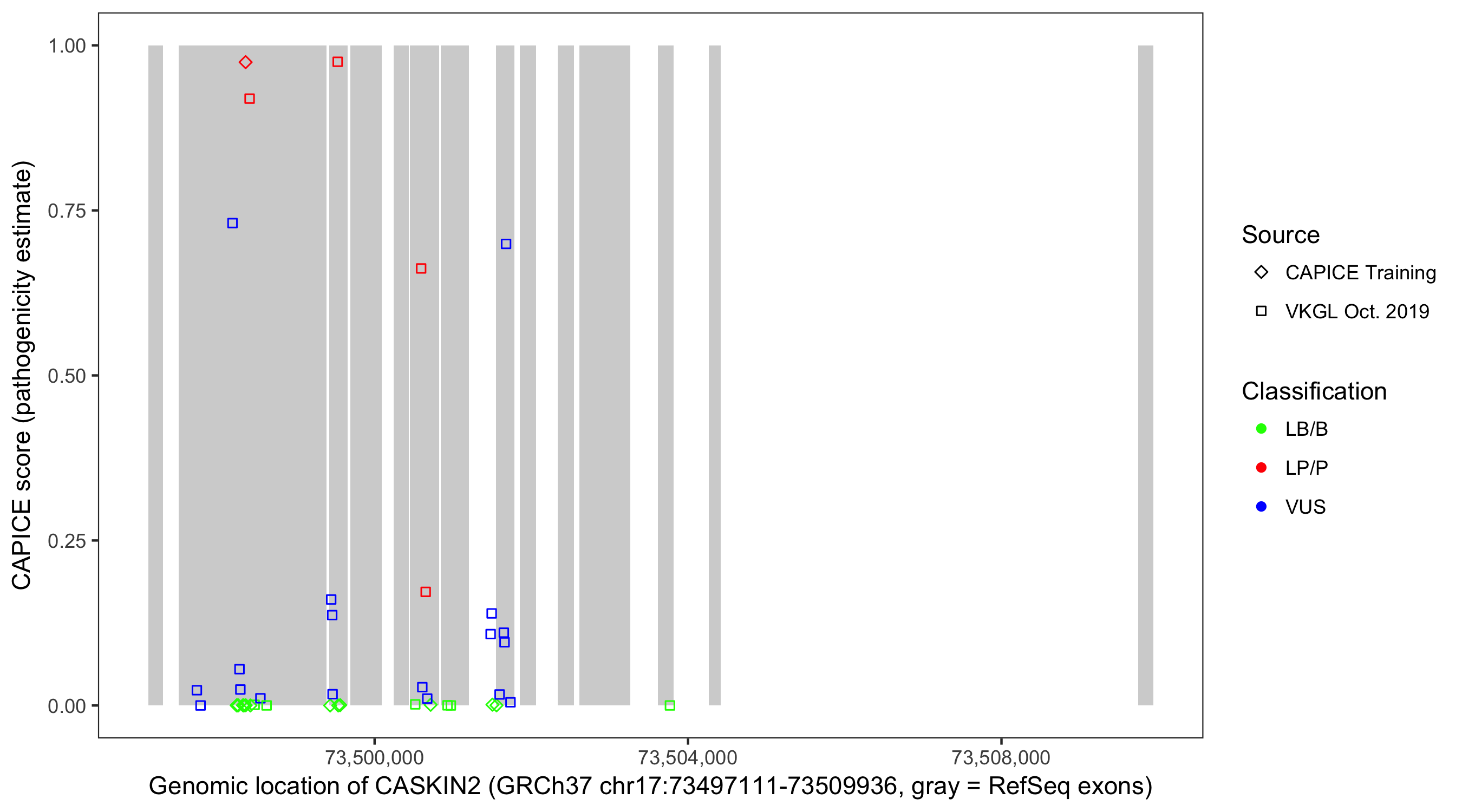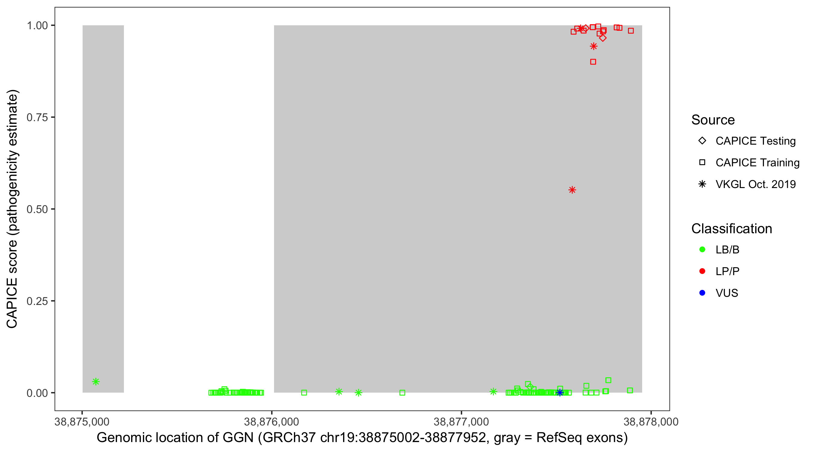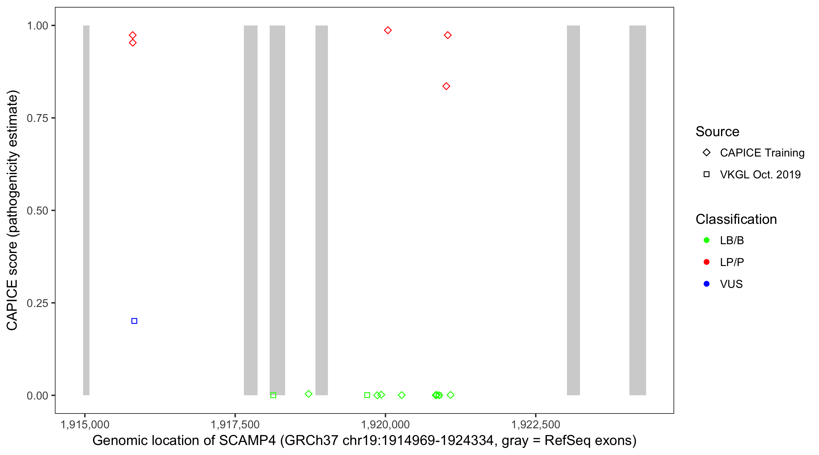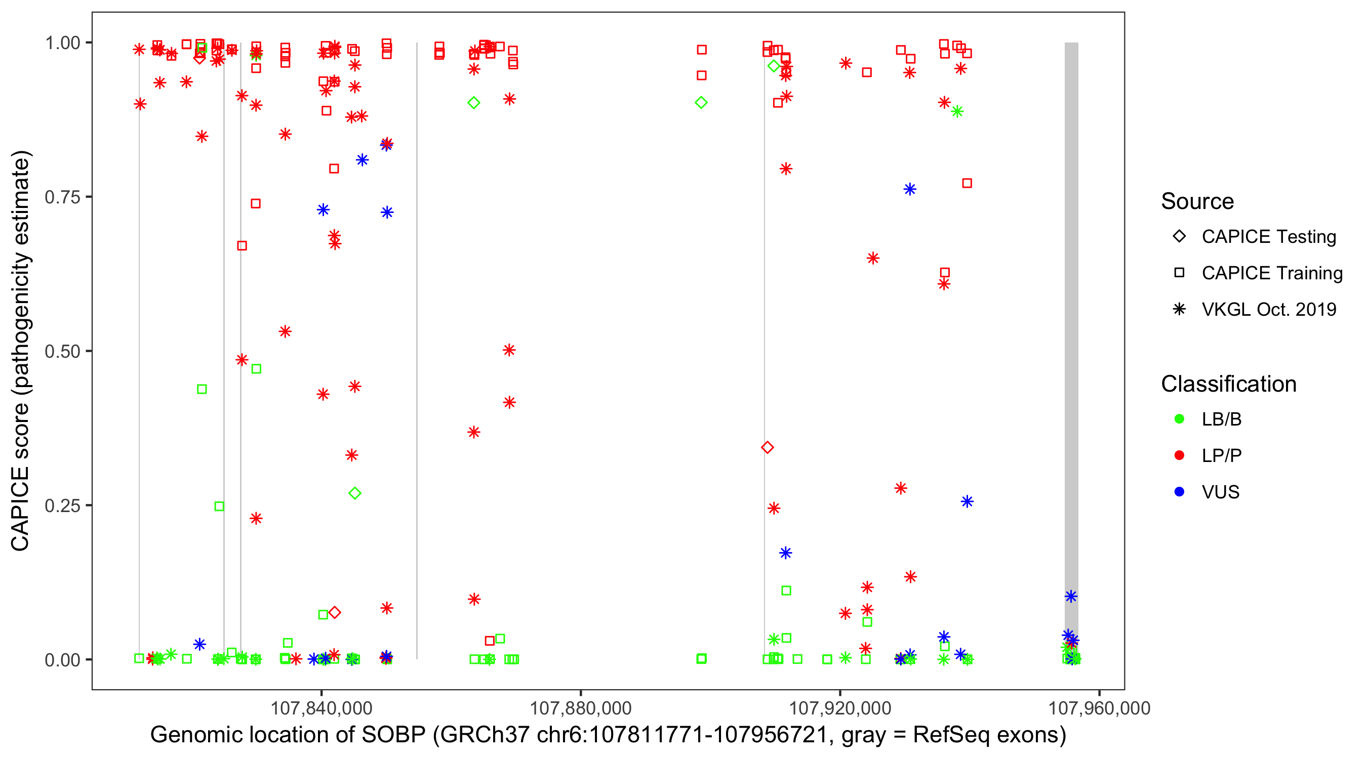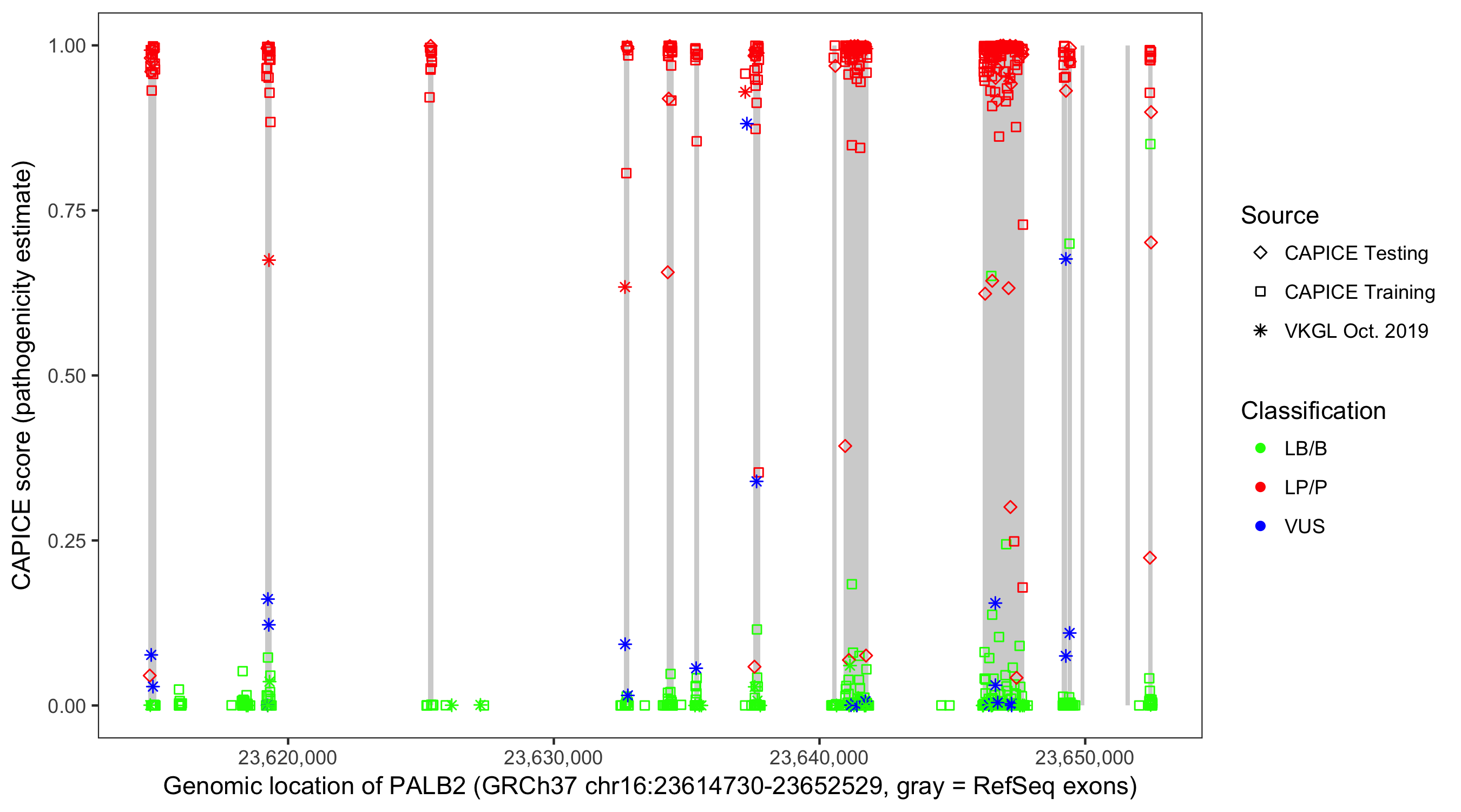 Shown are CAPICE train/test variants plus VKGL Oct 2019.