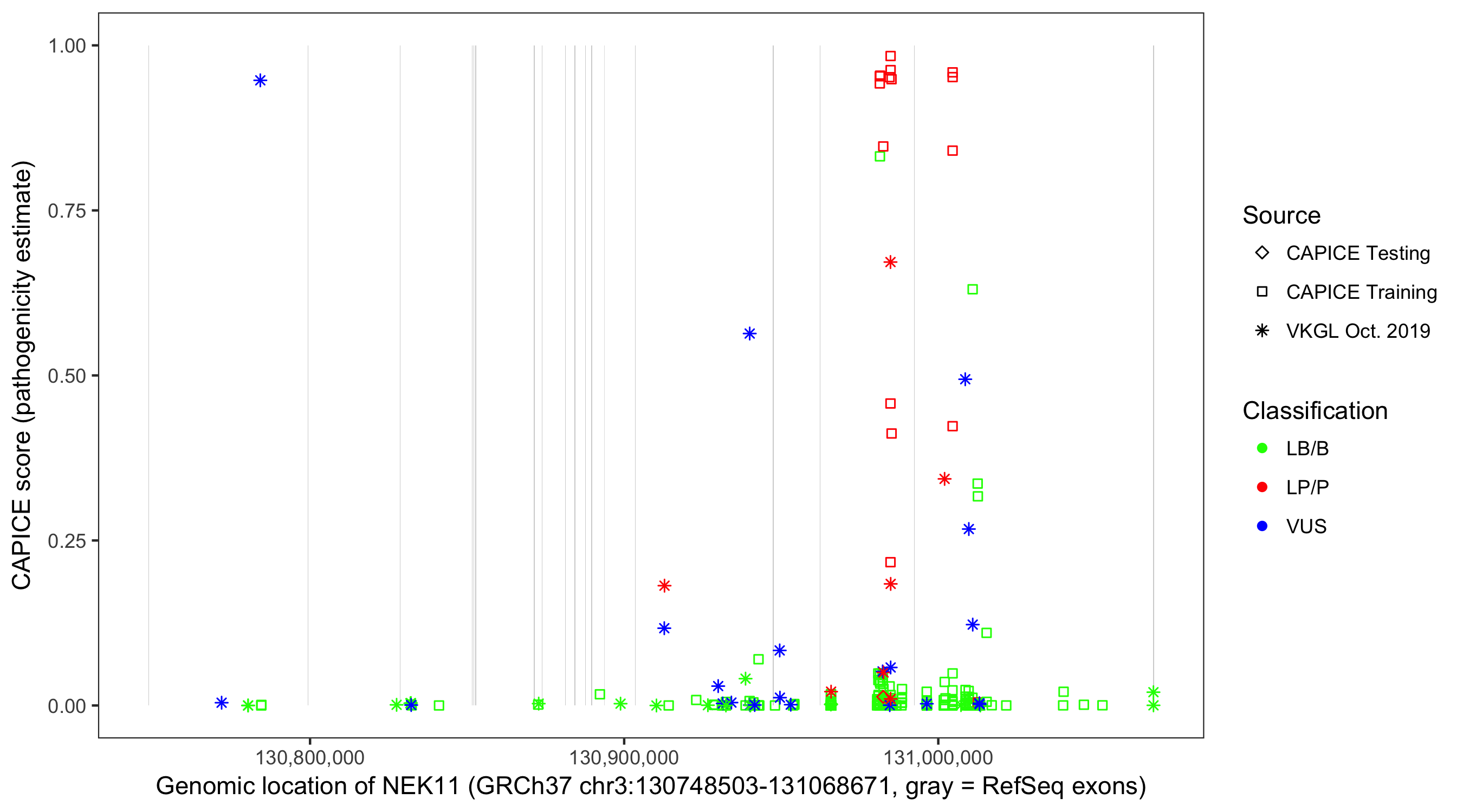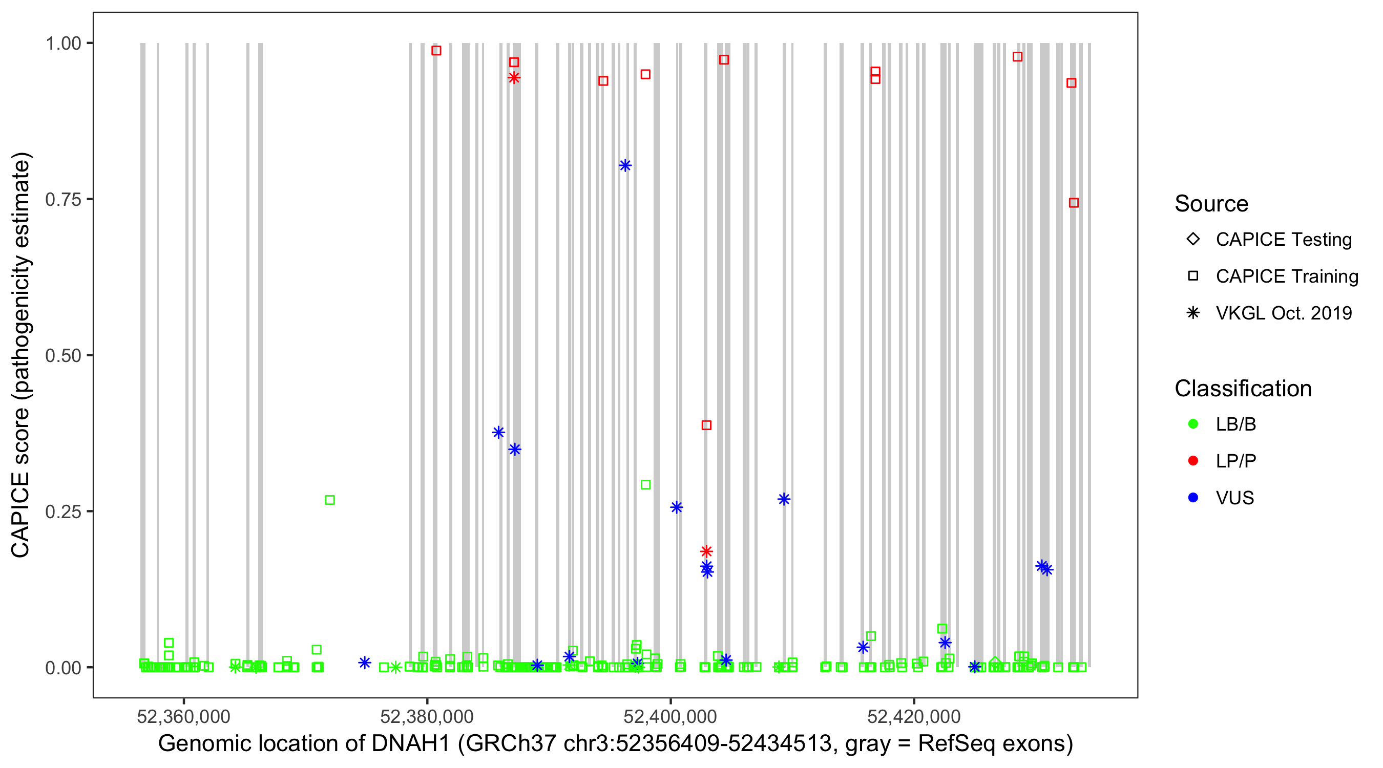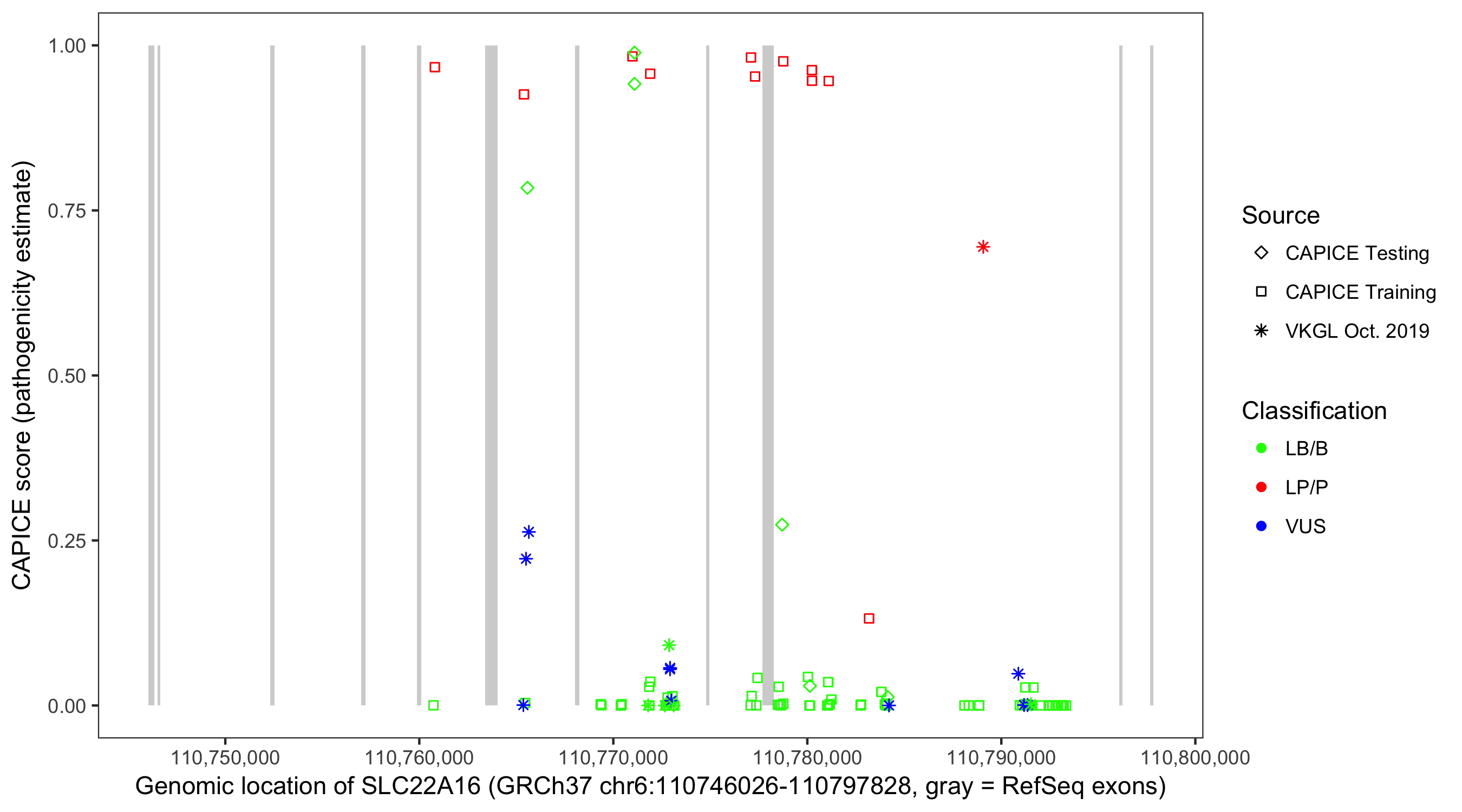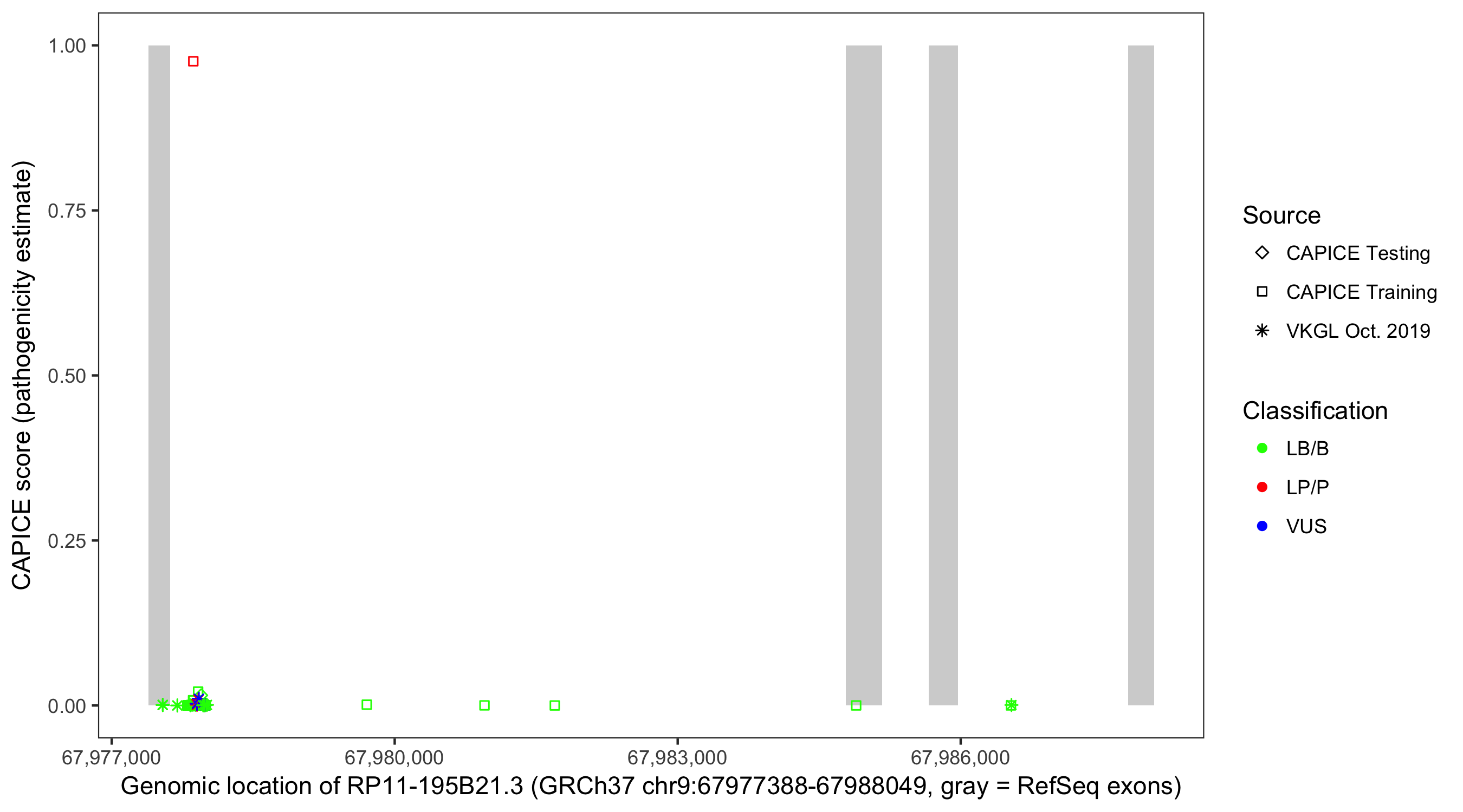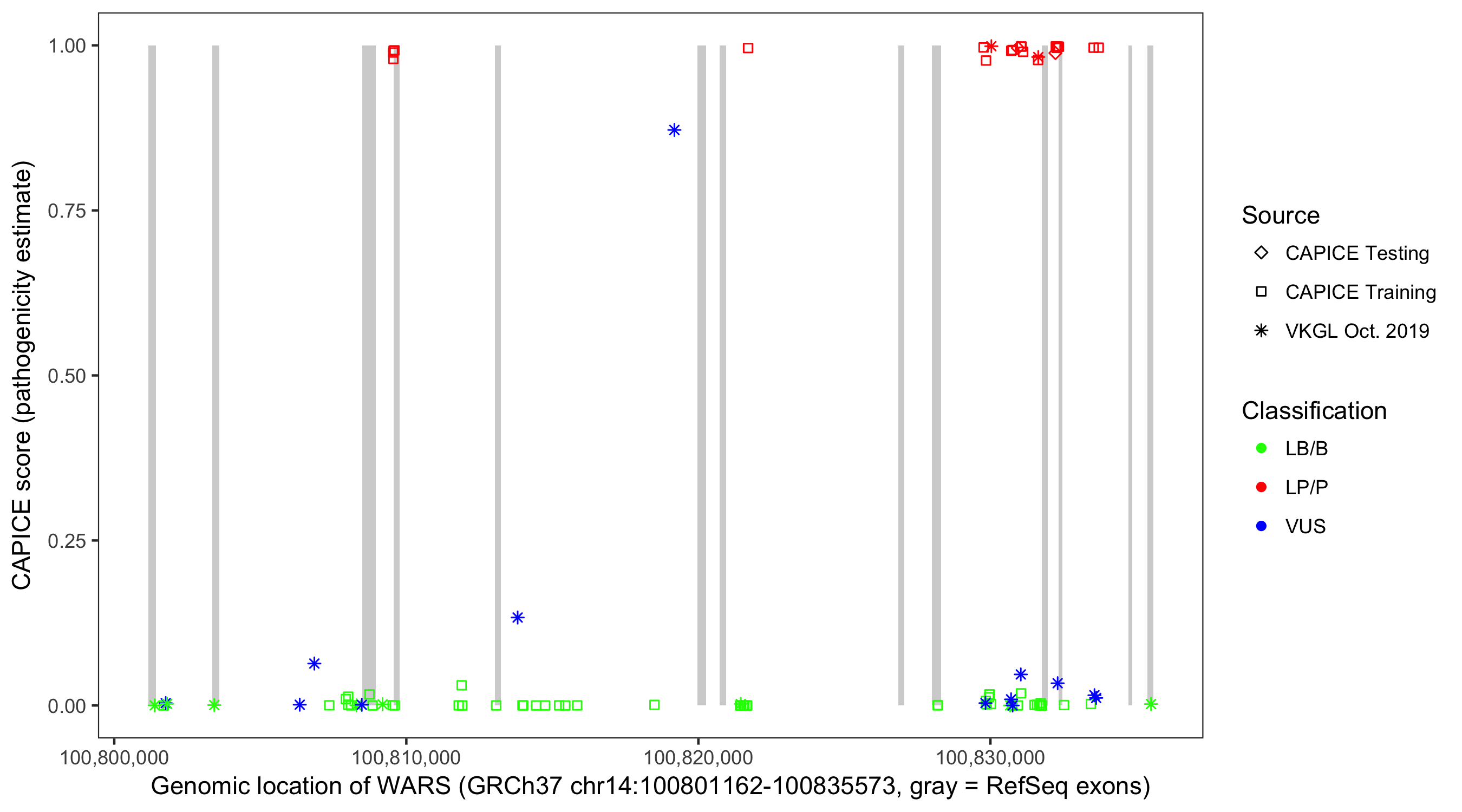 Shown are CAPICE train/test variants plus VKGL Oct 2019.