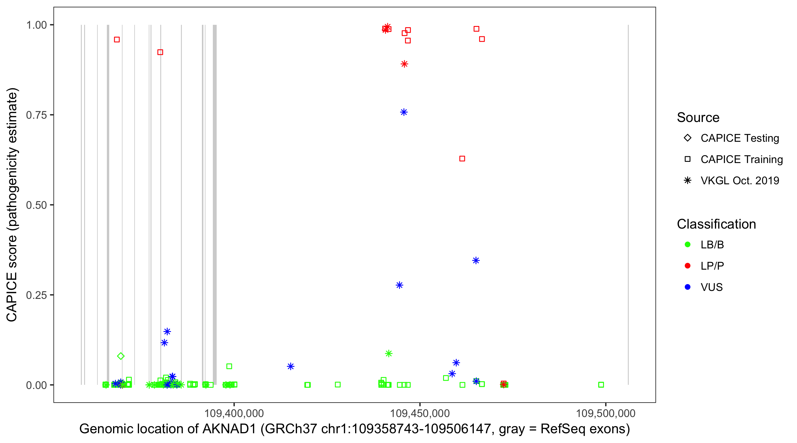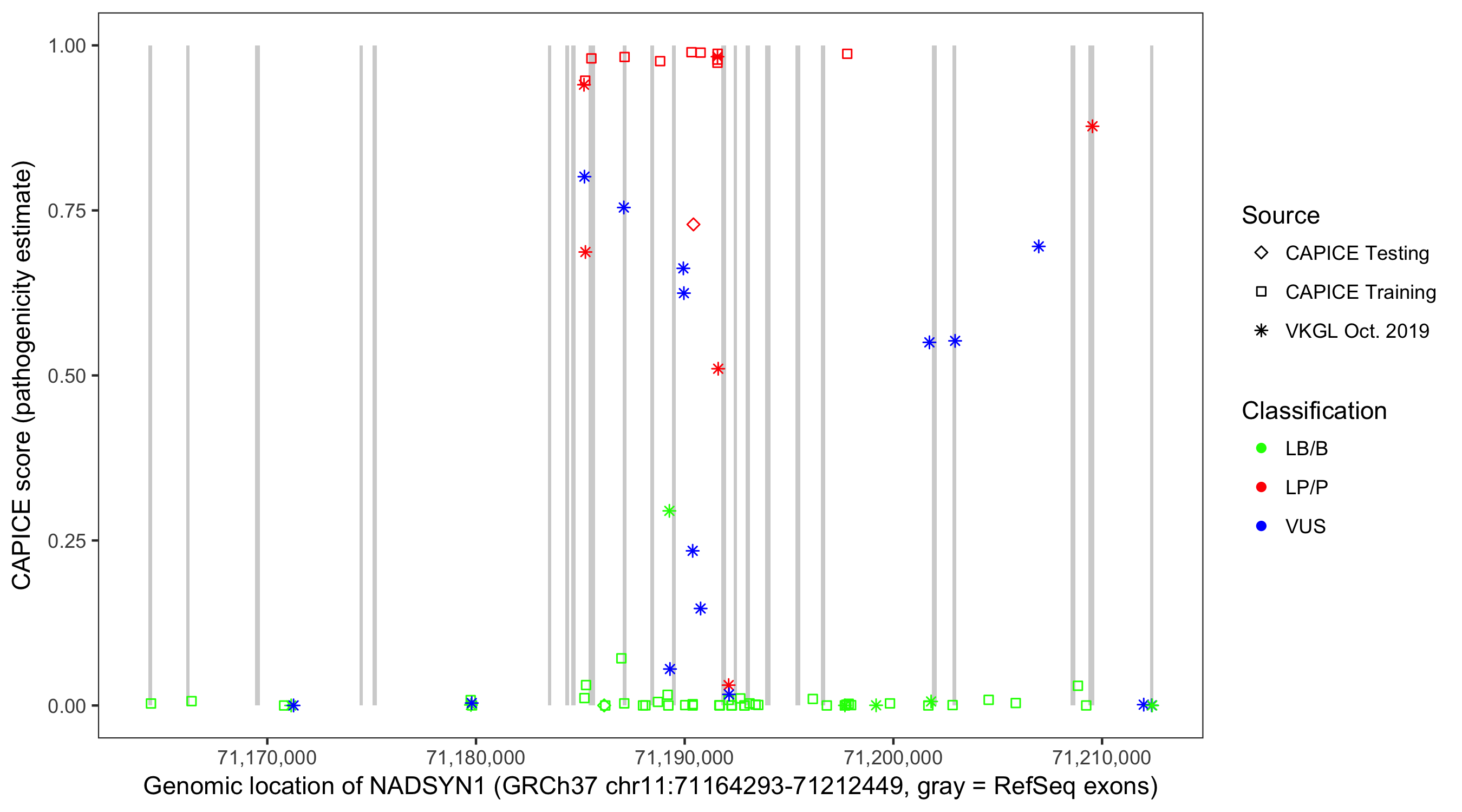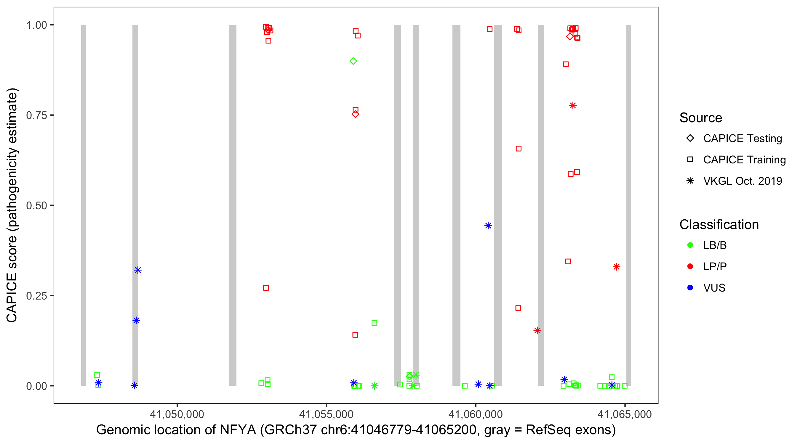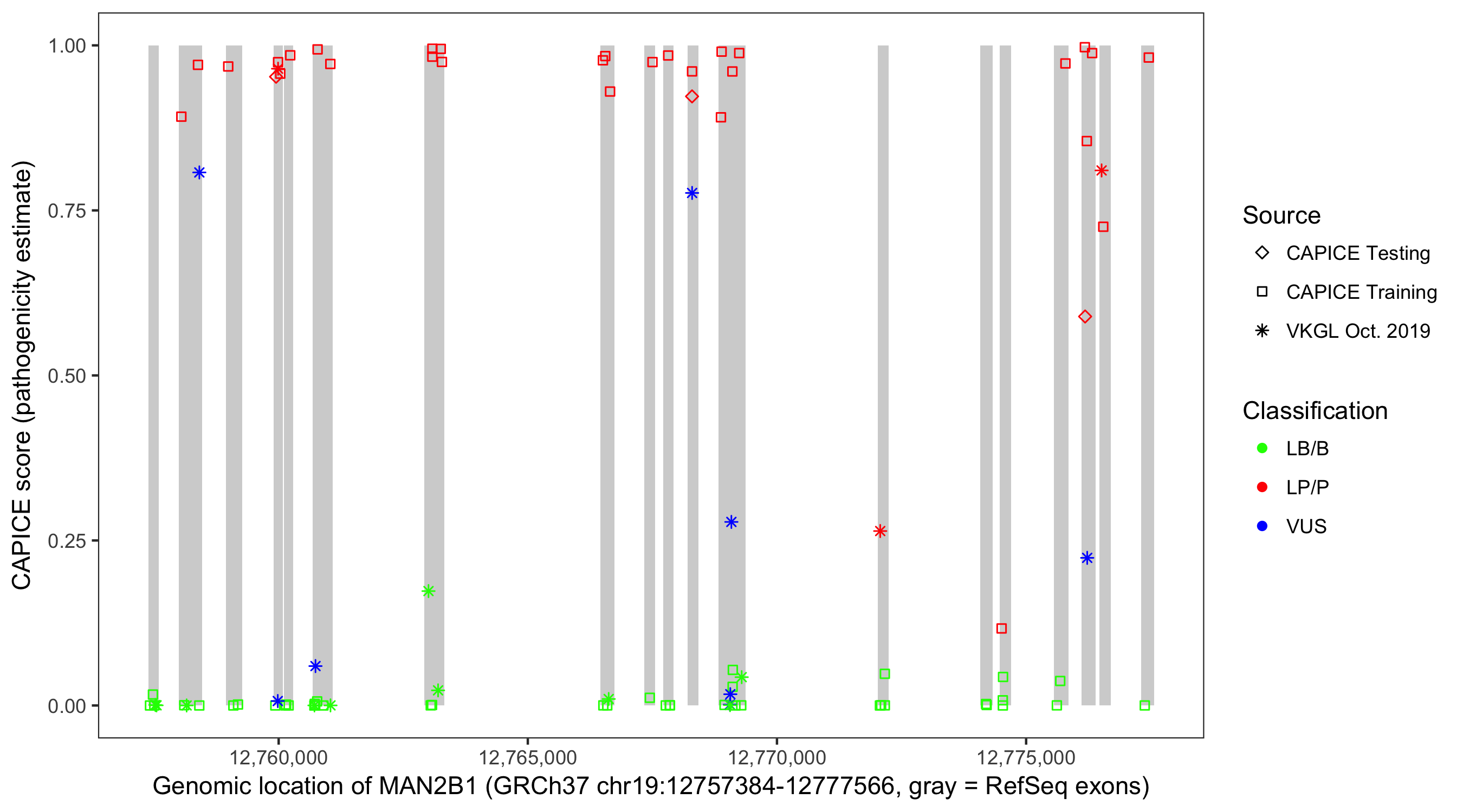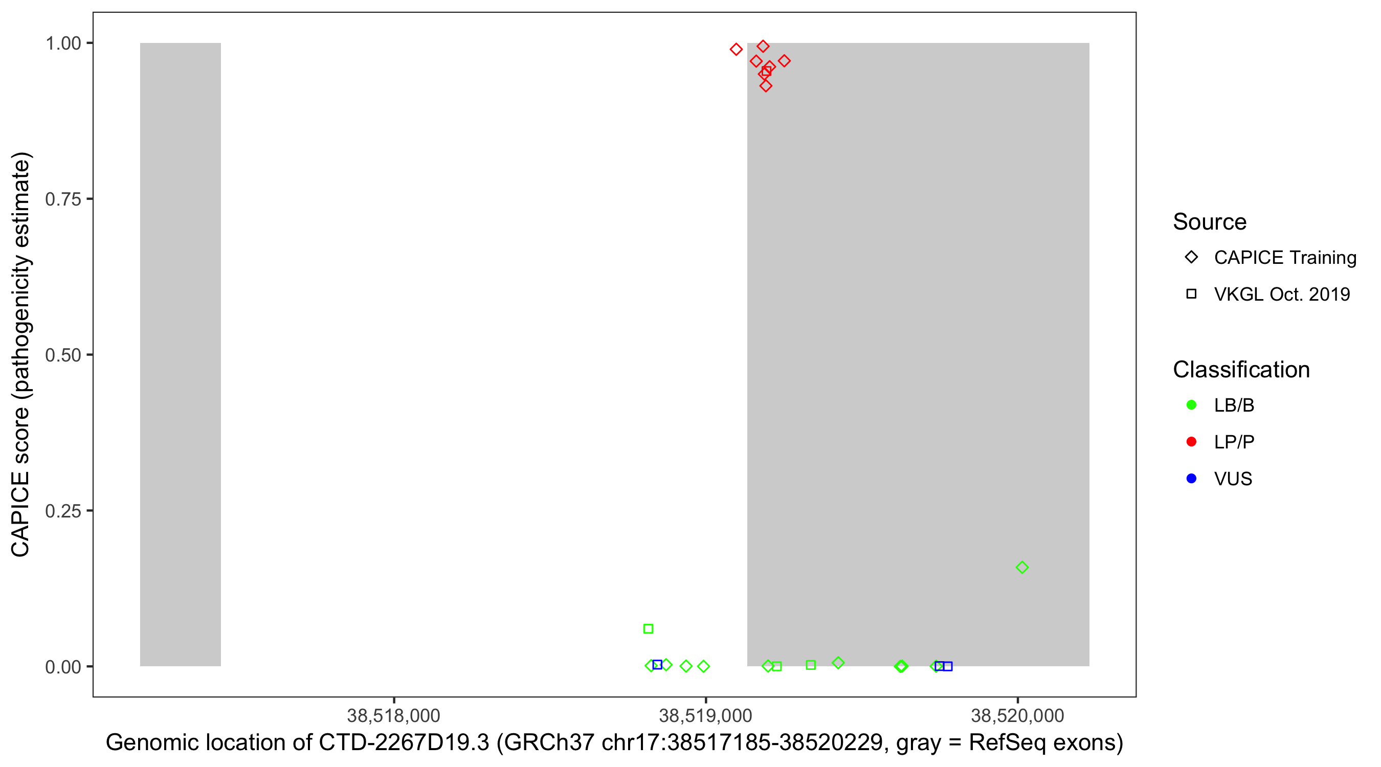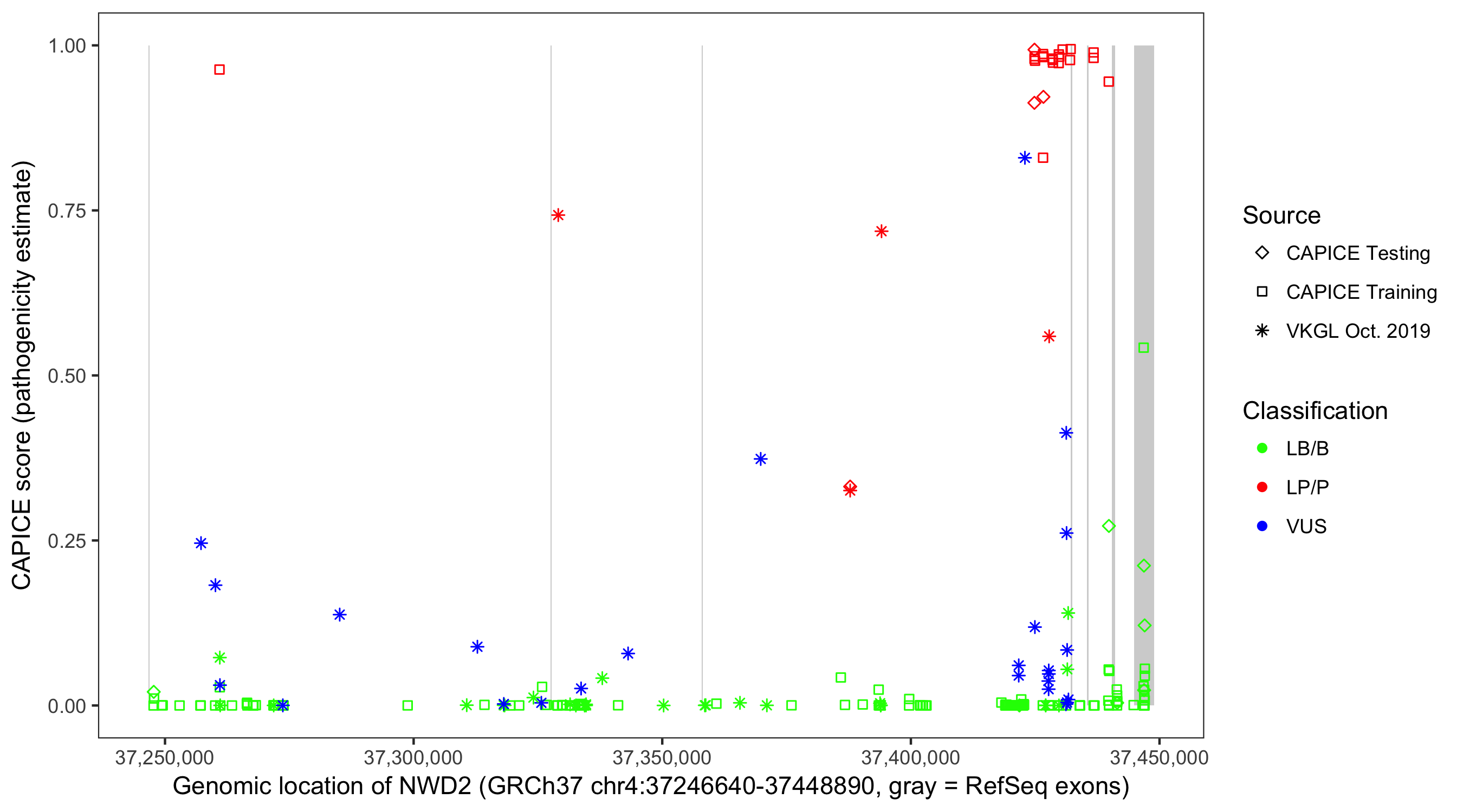 Shown are CAPICE train/test variants plus VKGL Oct 2019.