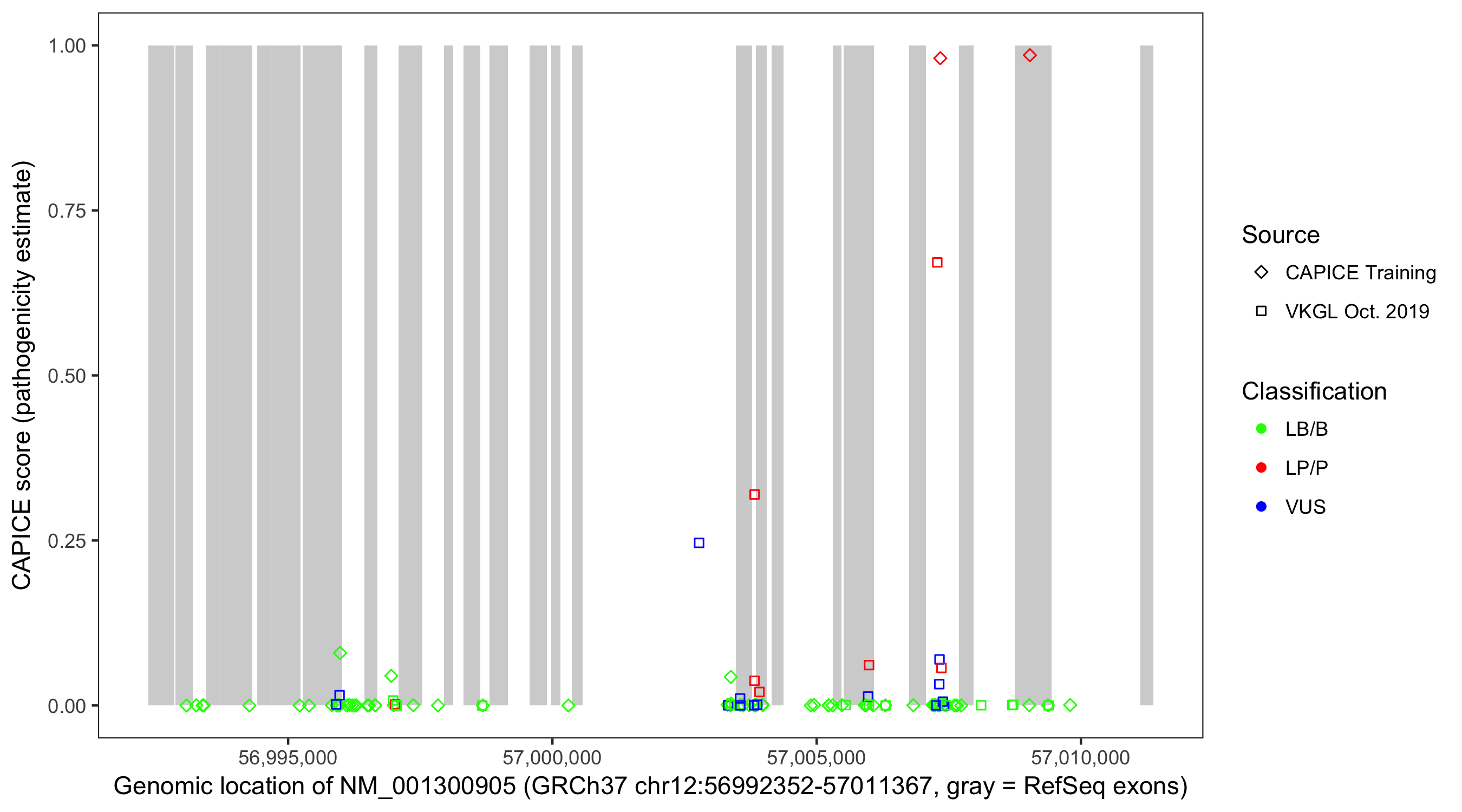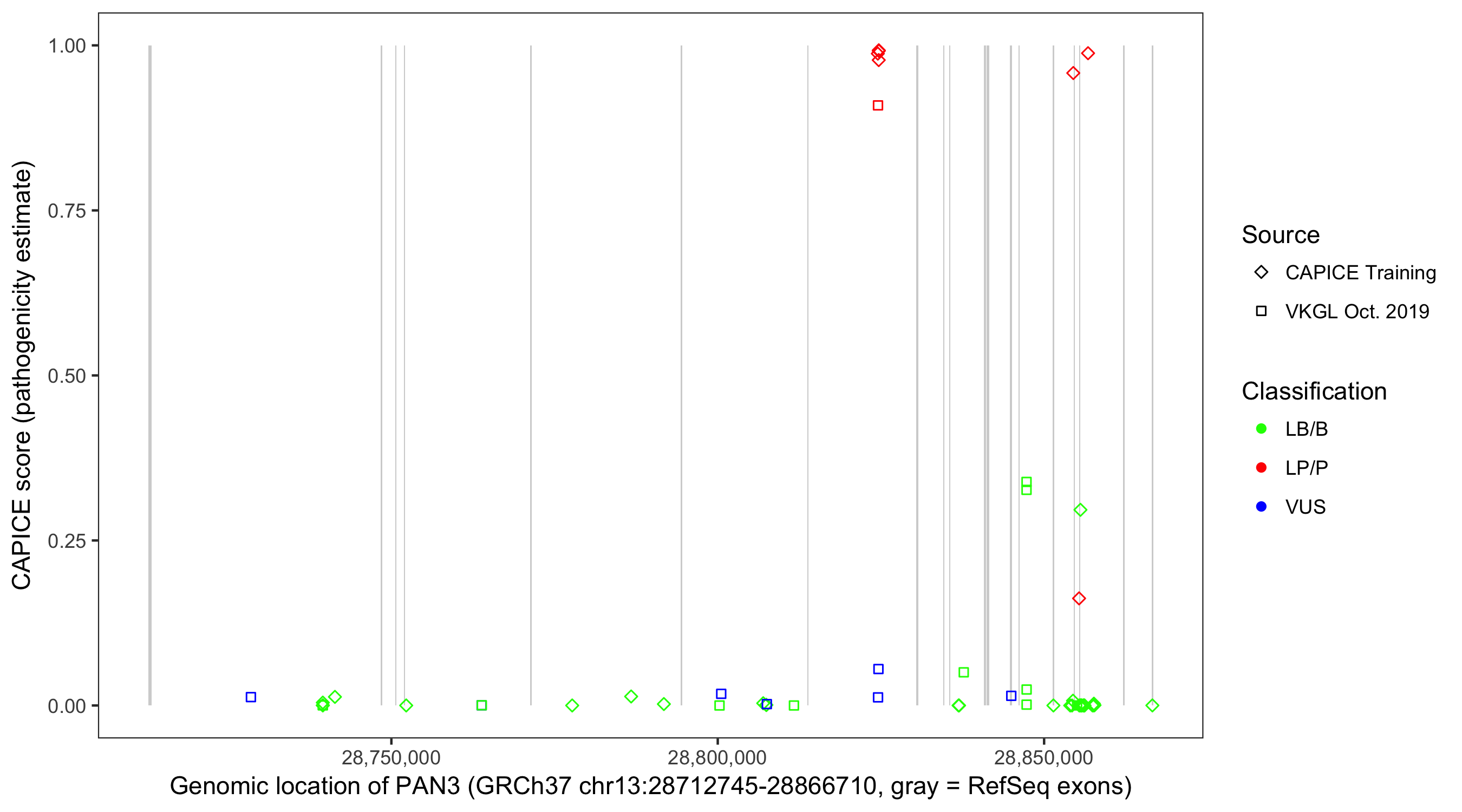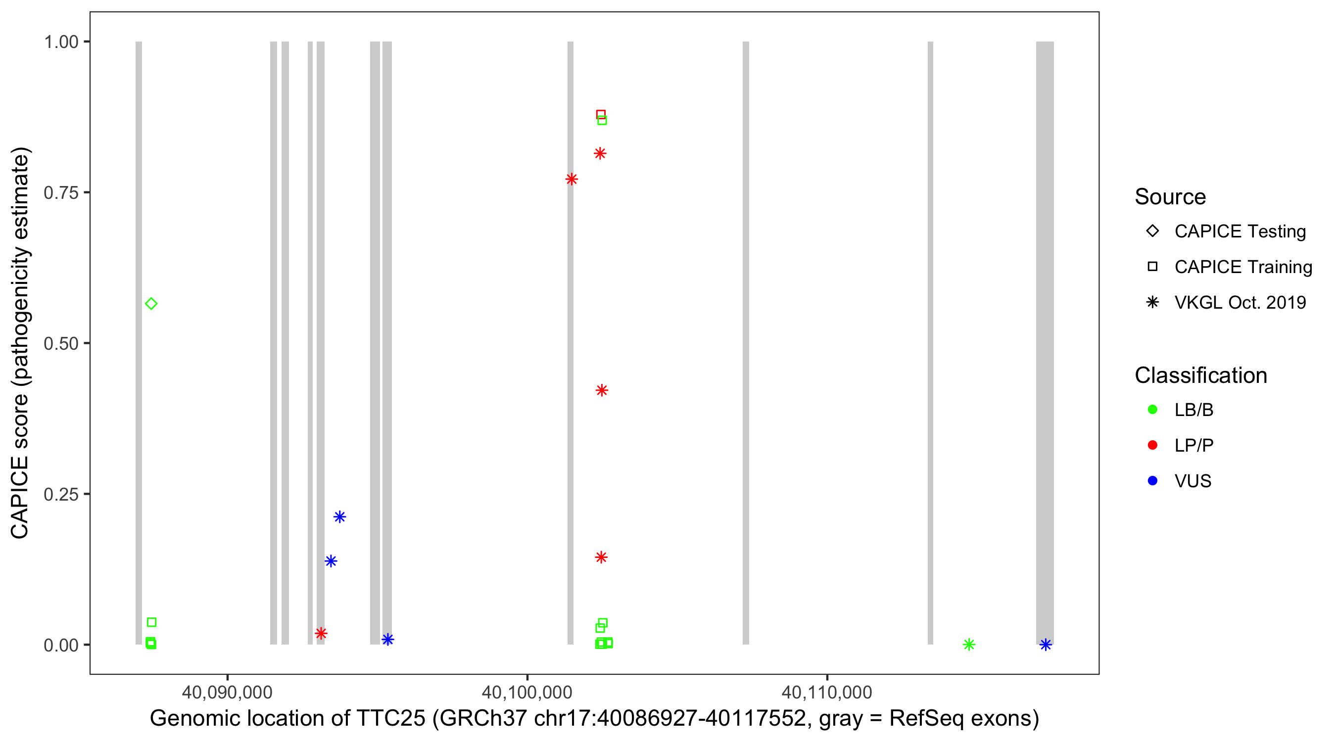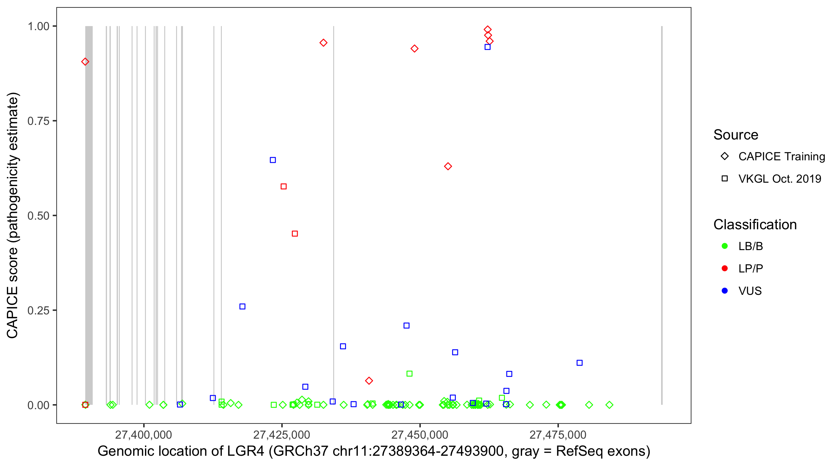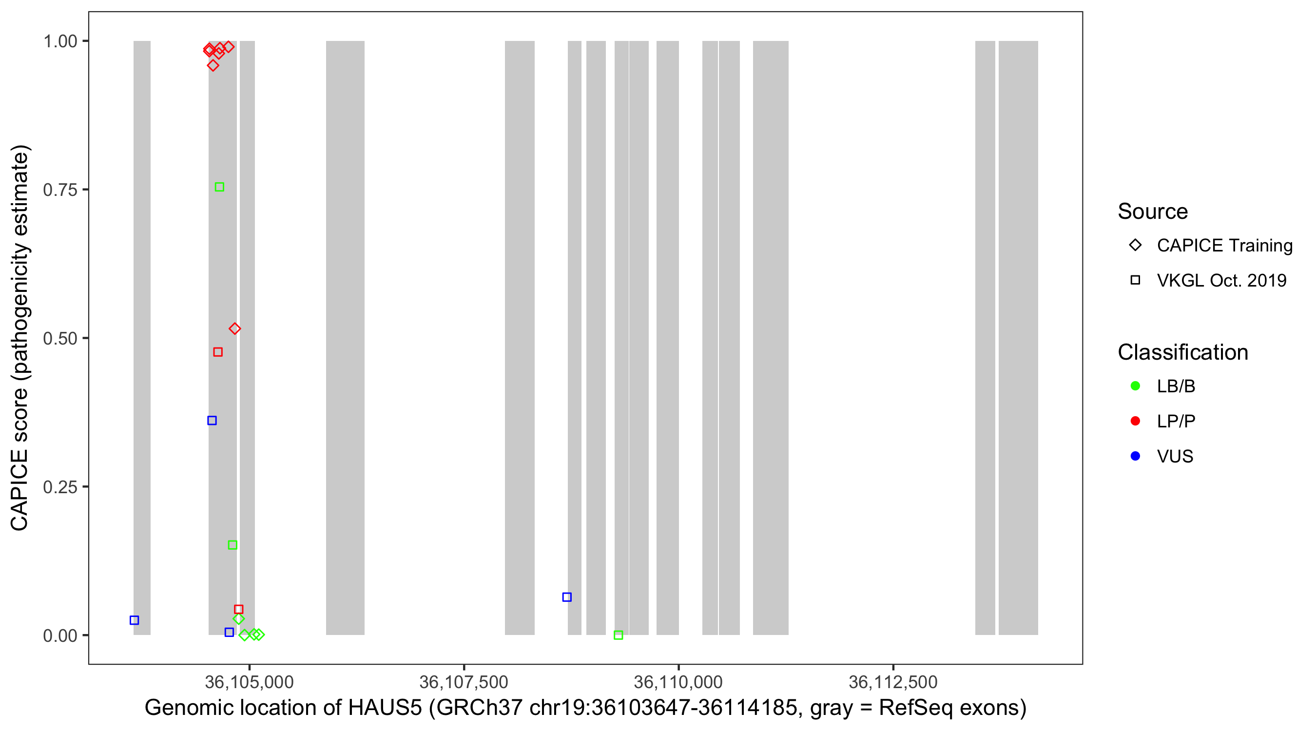 Shown are CAPICE train/test variants plus VKGL Oct 2019.
