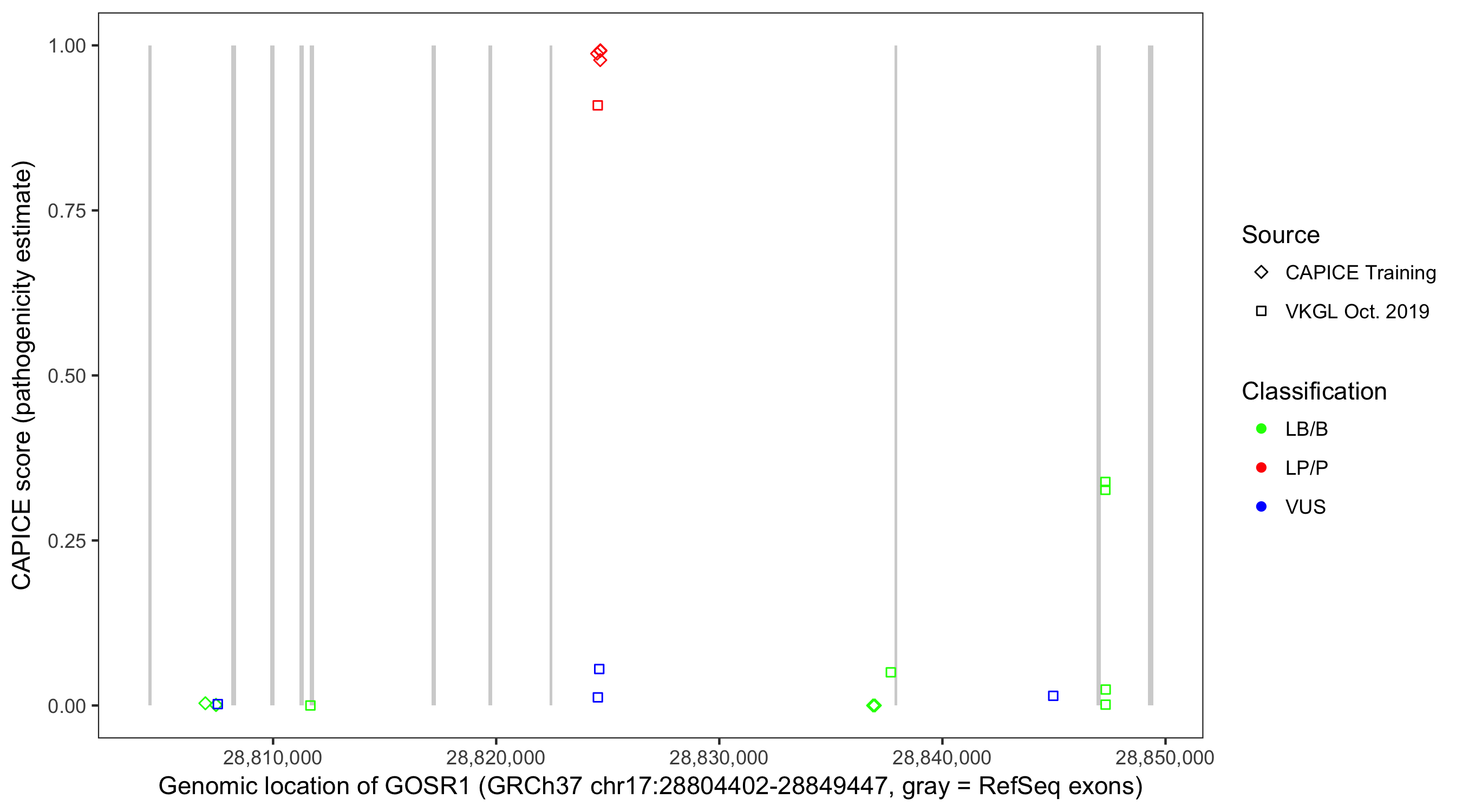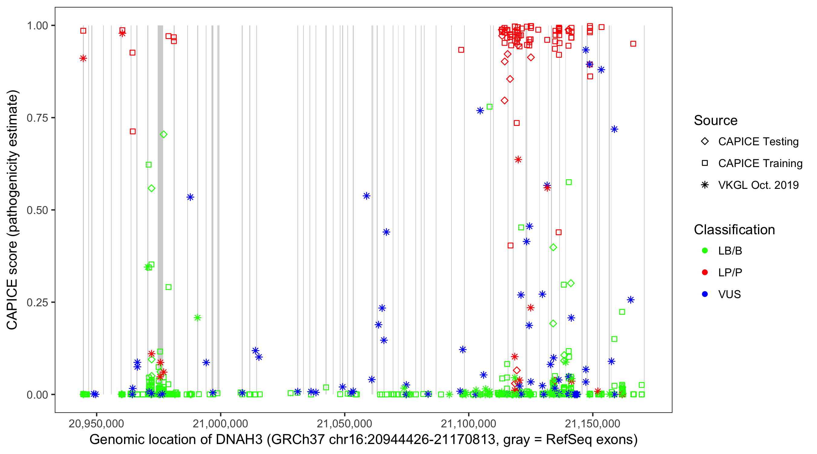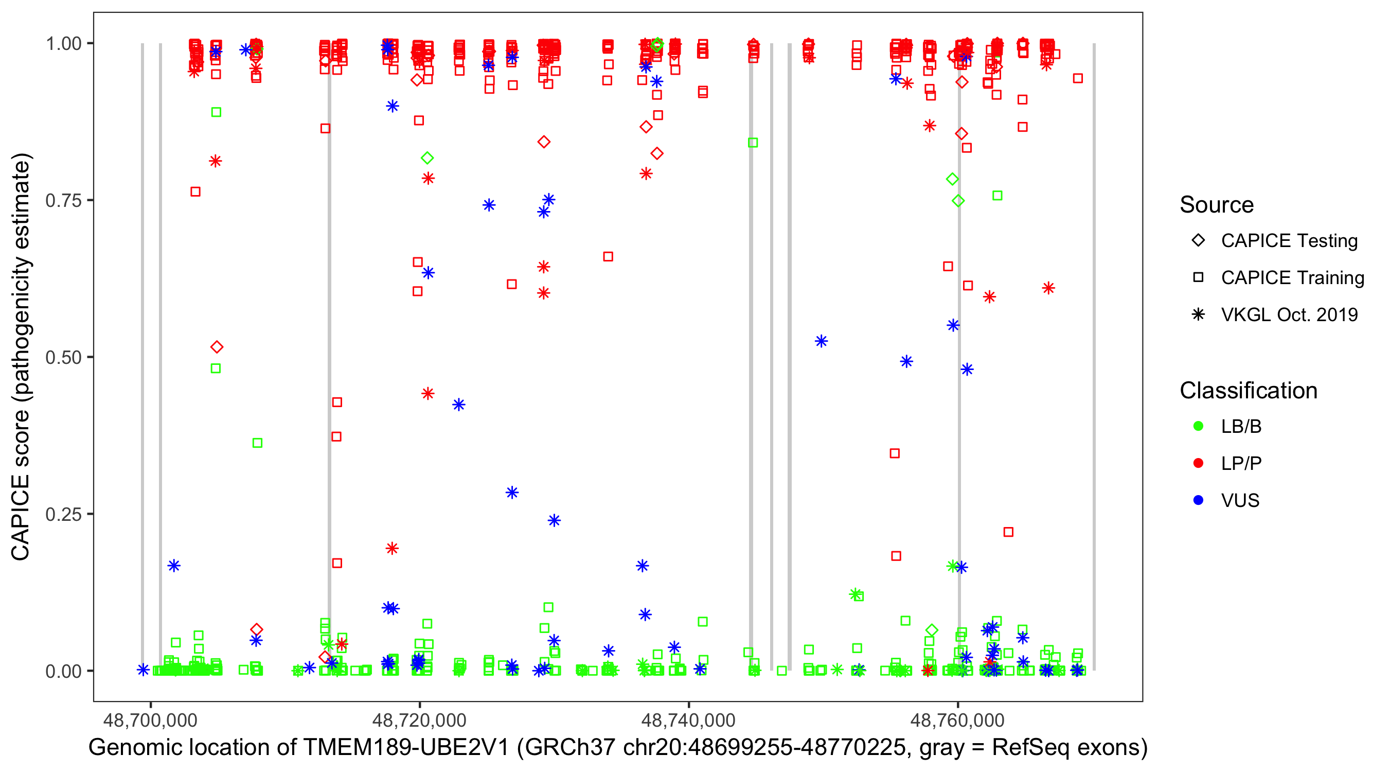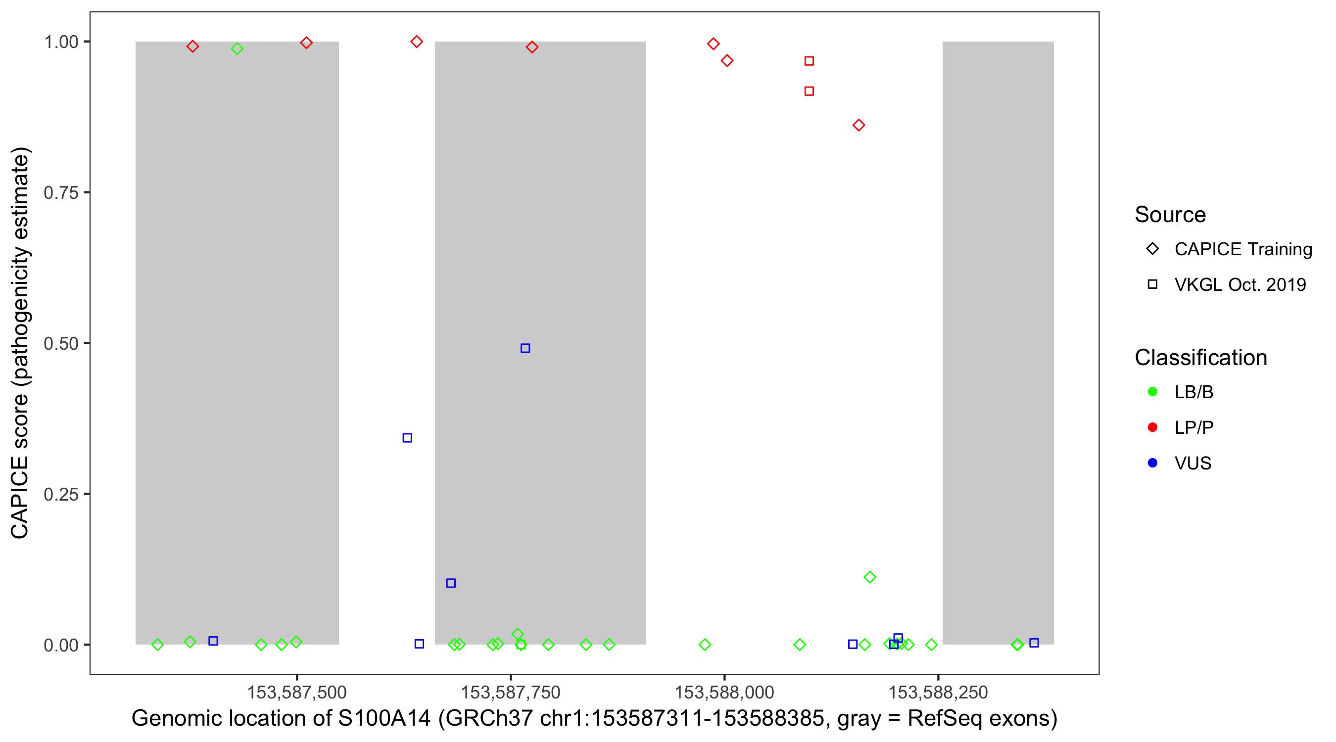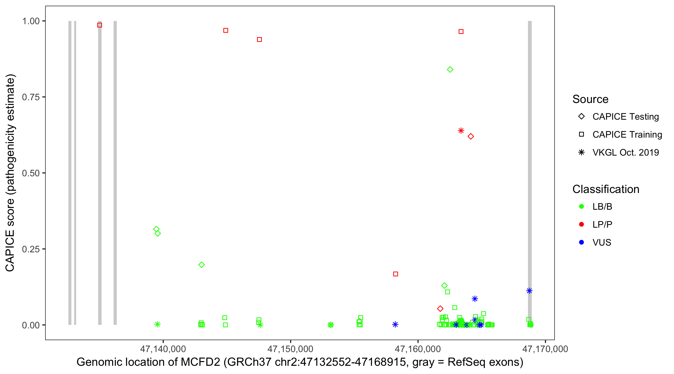 Shown are CAPICE train/test variants plus VKGL Oct 2019.