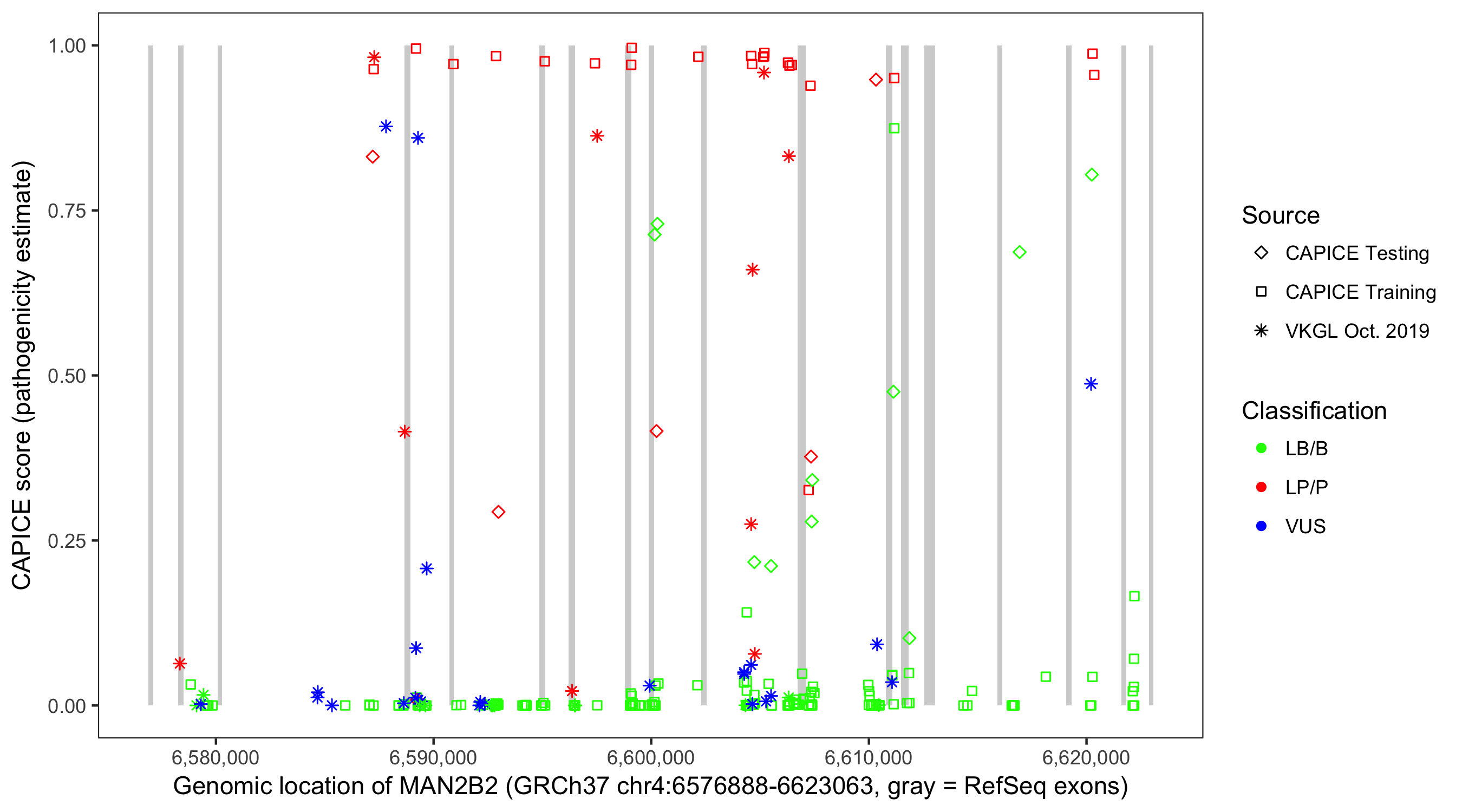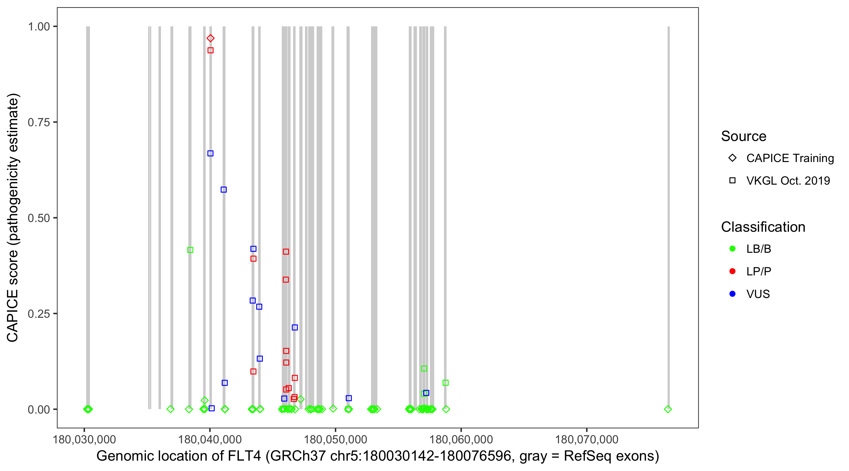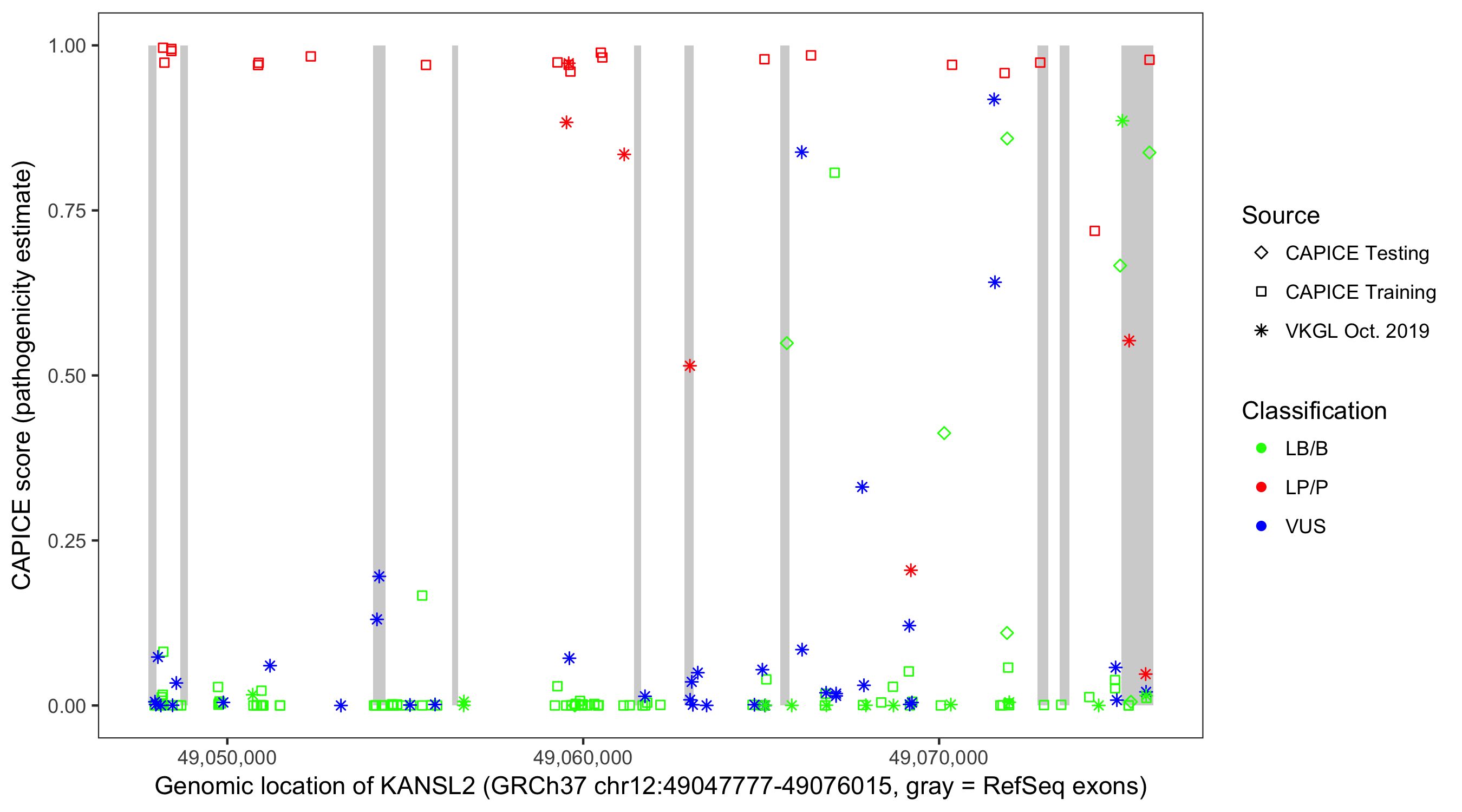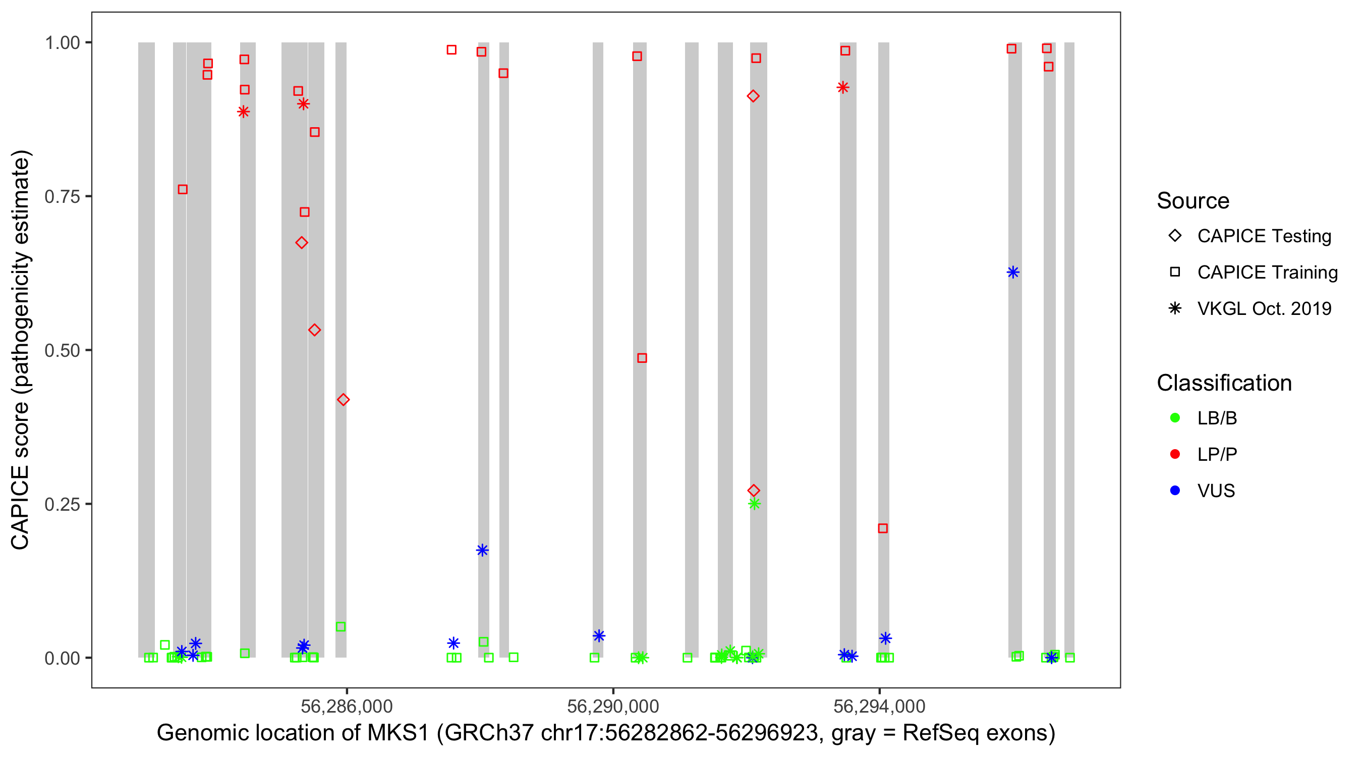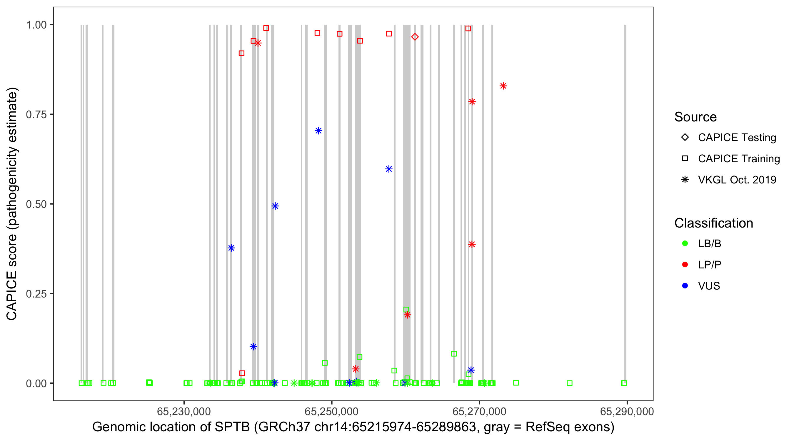 Shown are CAPICE train/test variants plus VKGL Oct 2019.