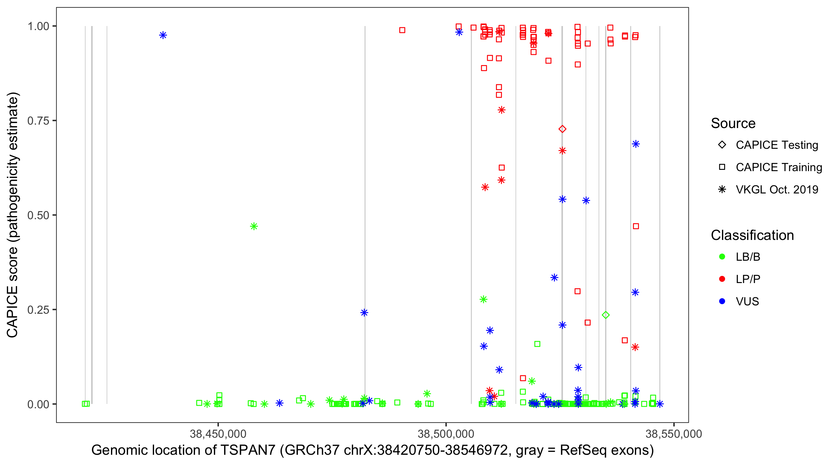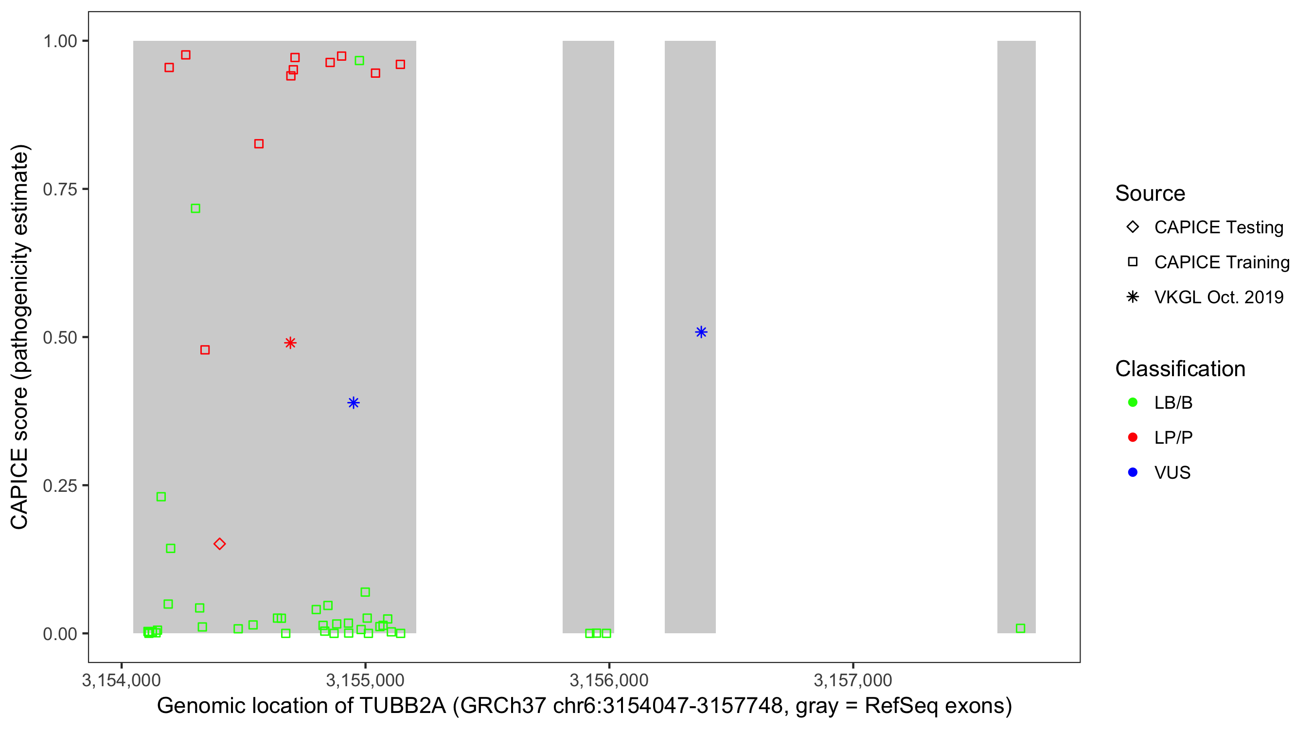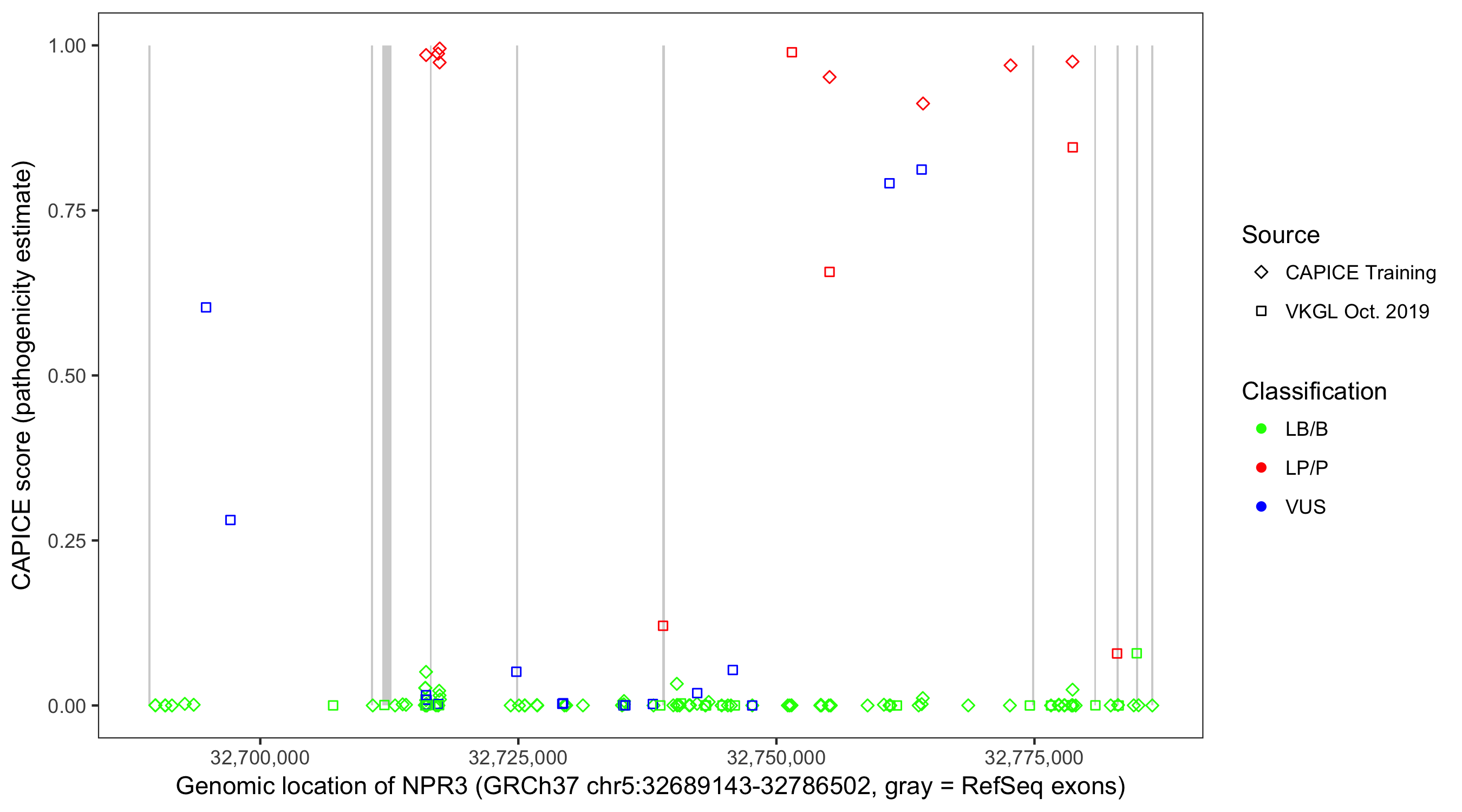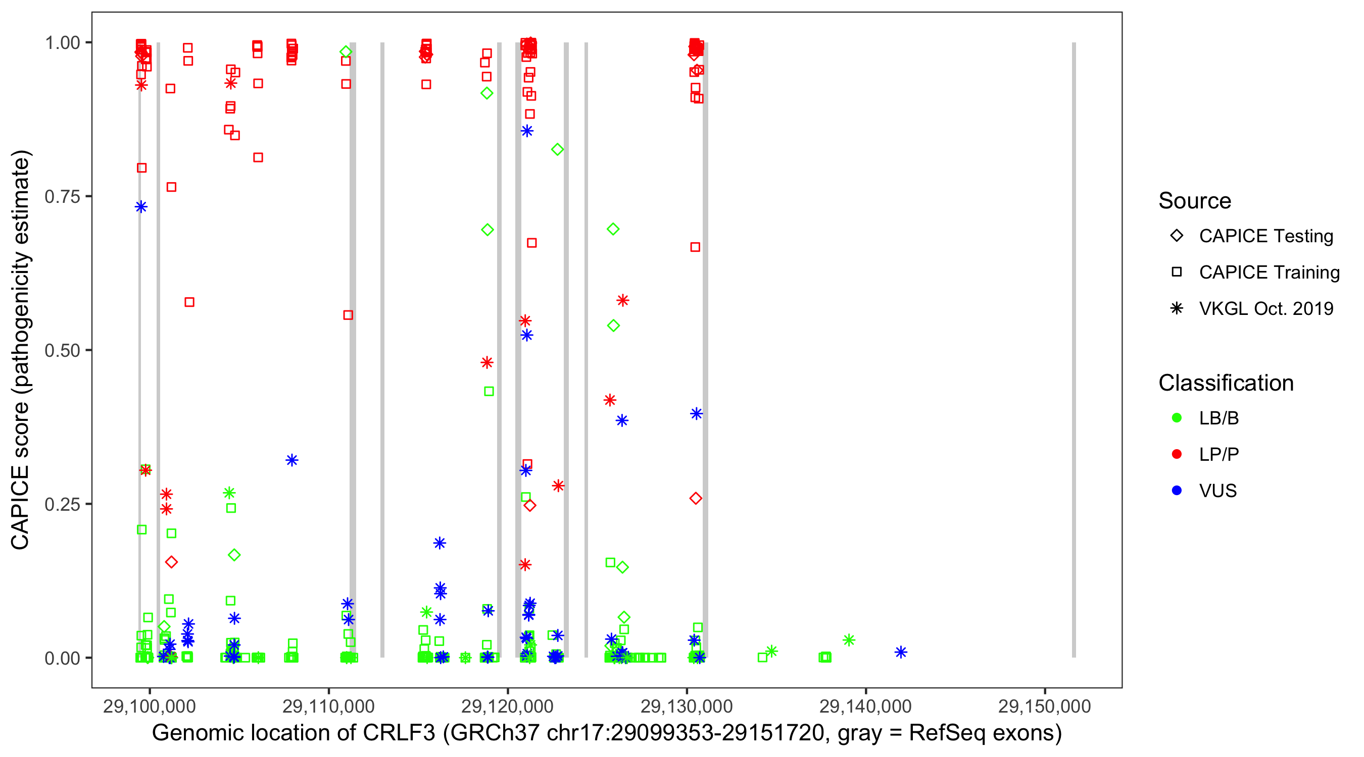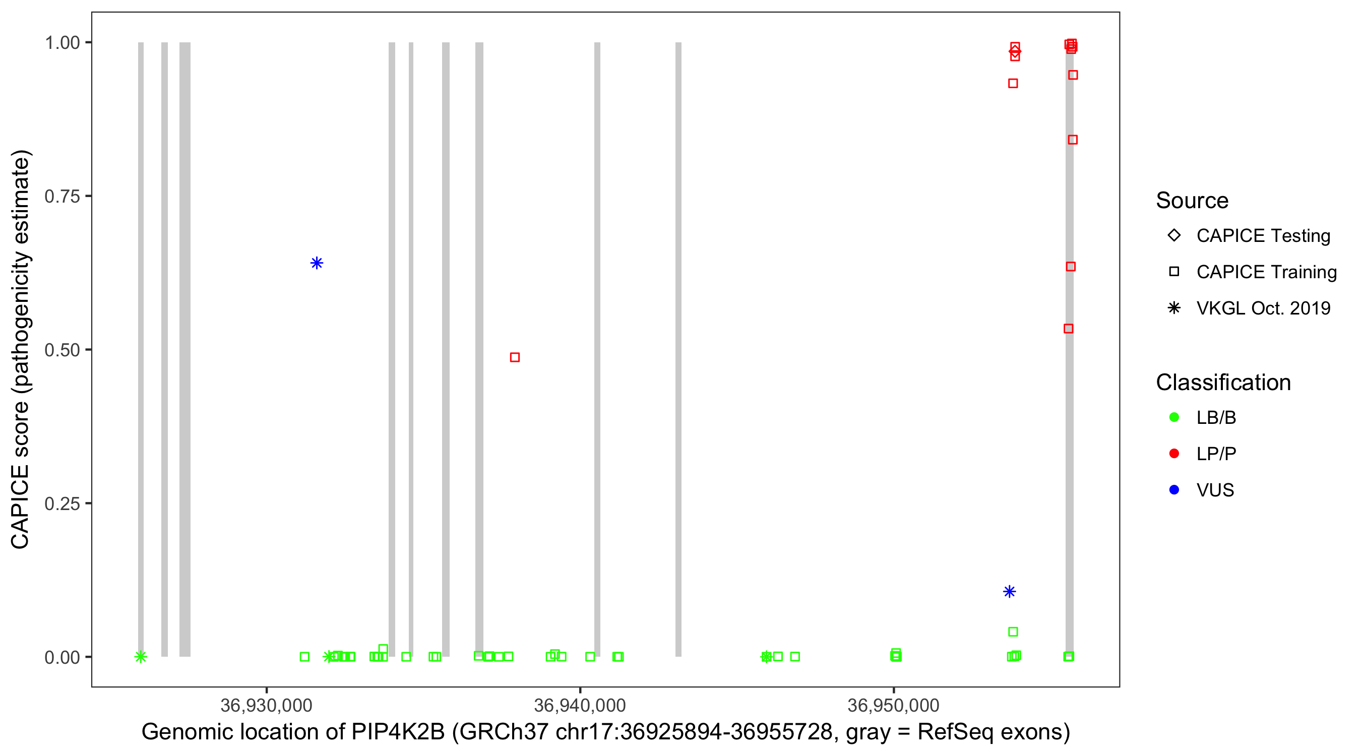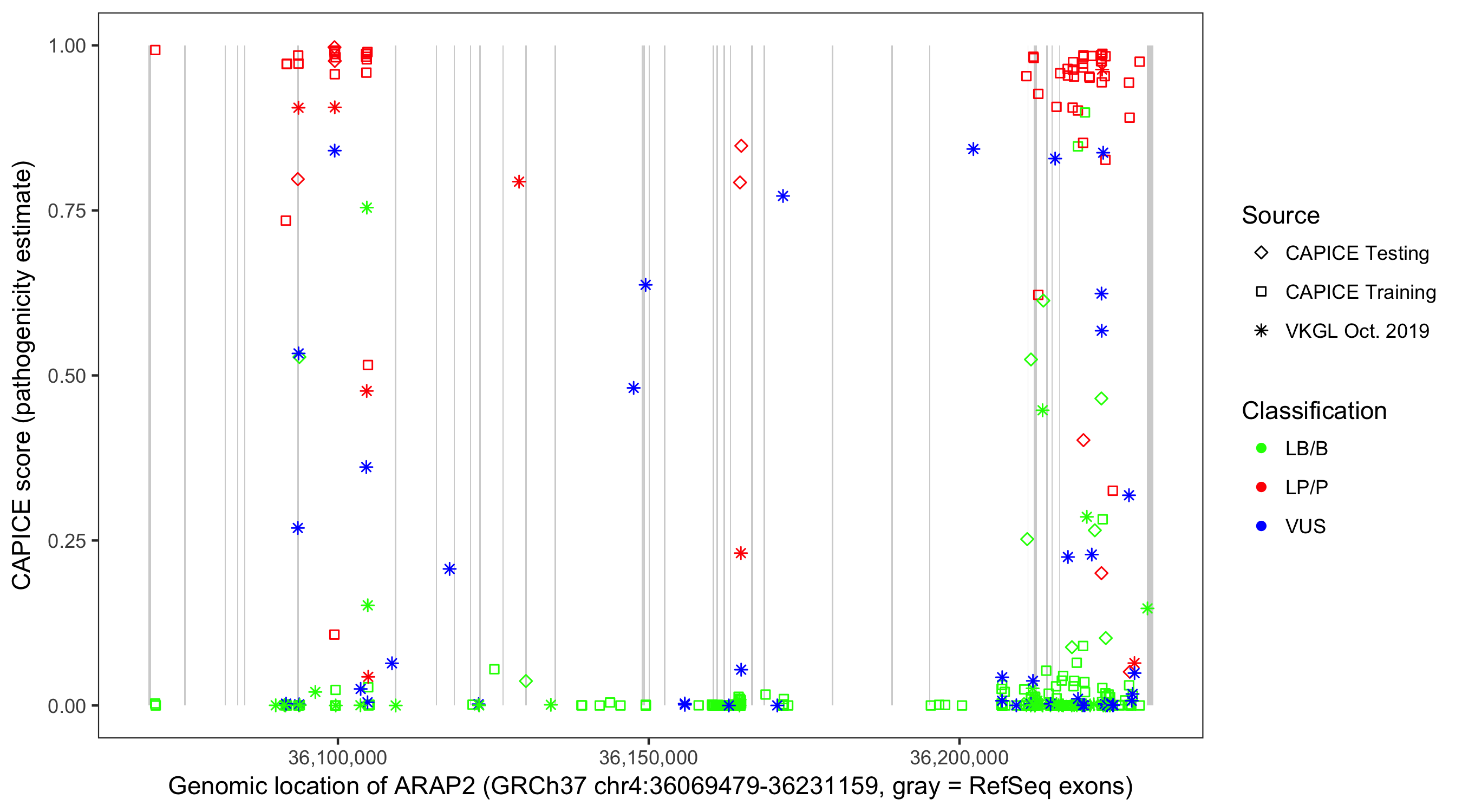 Shown are CAPICE train/test variants plus VKGL Oct 2019.