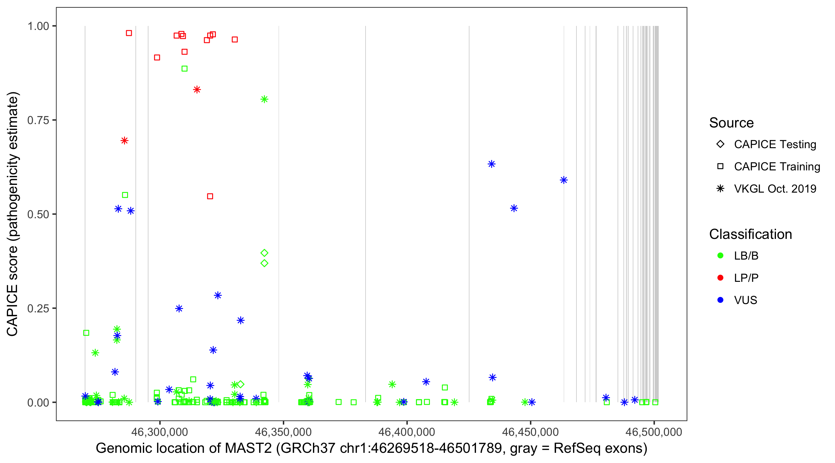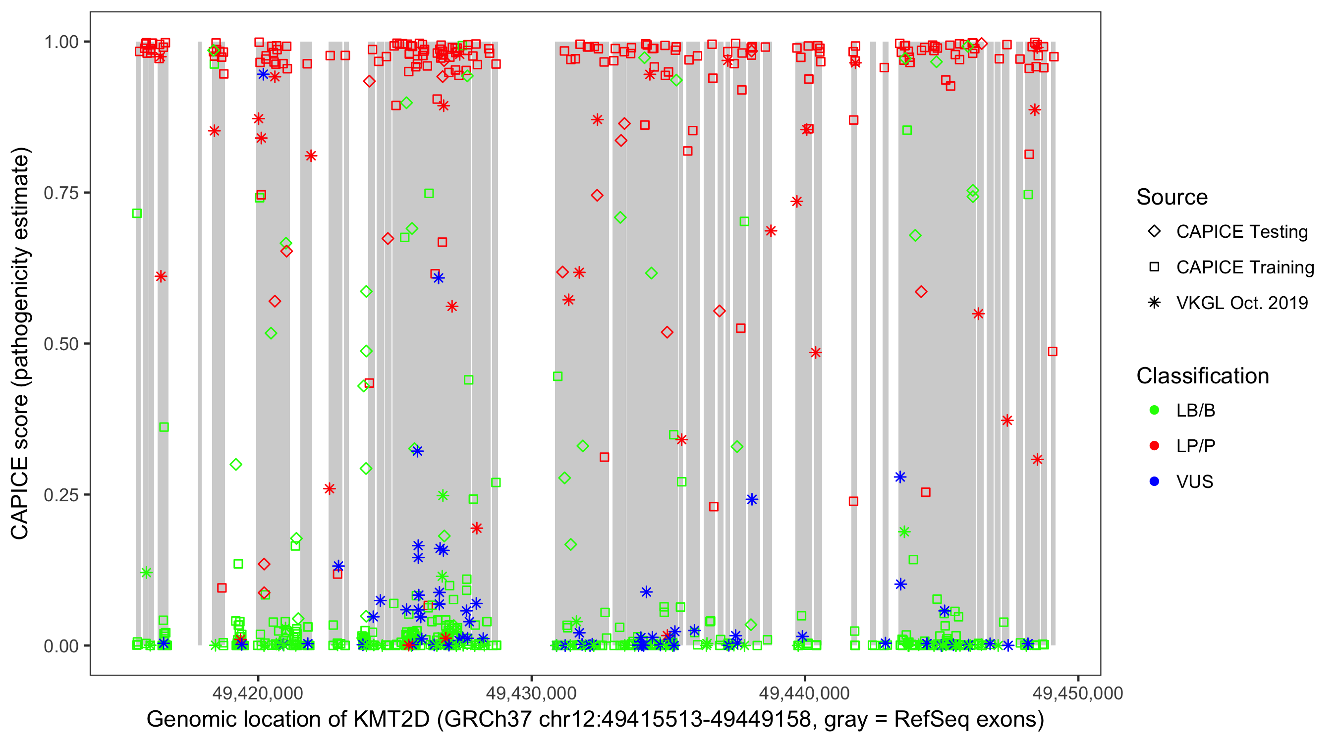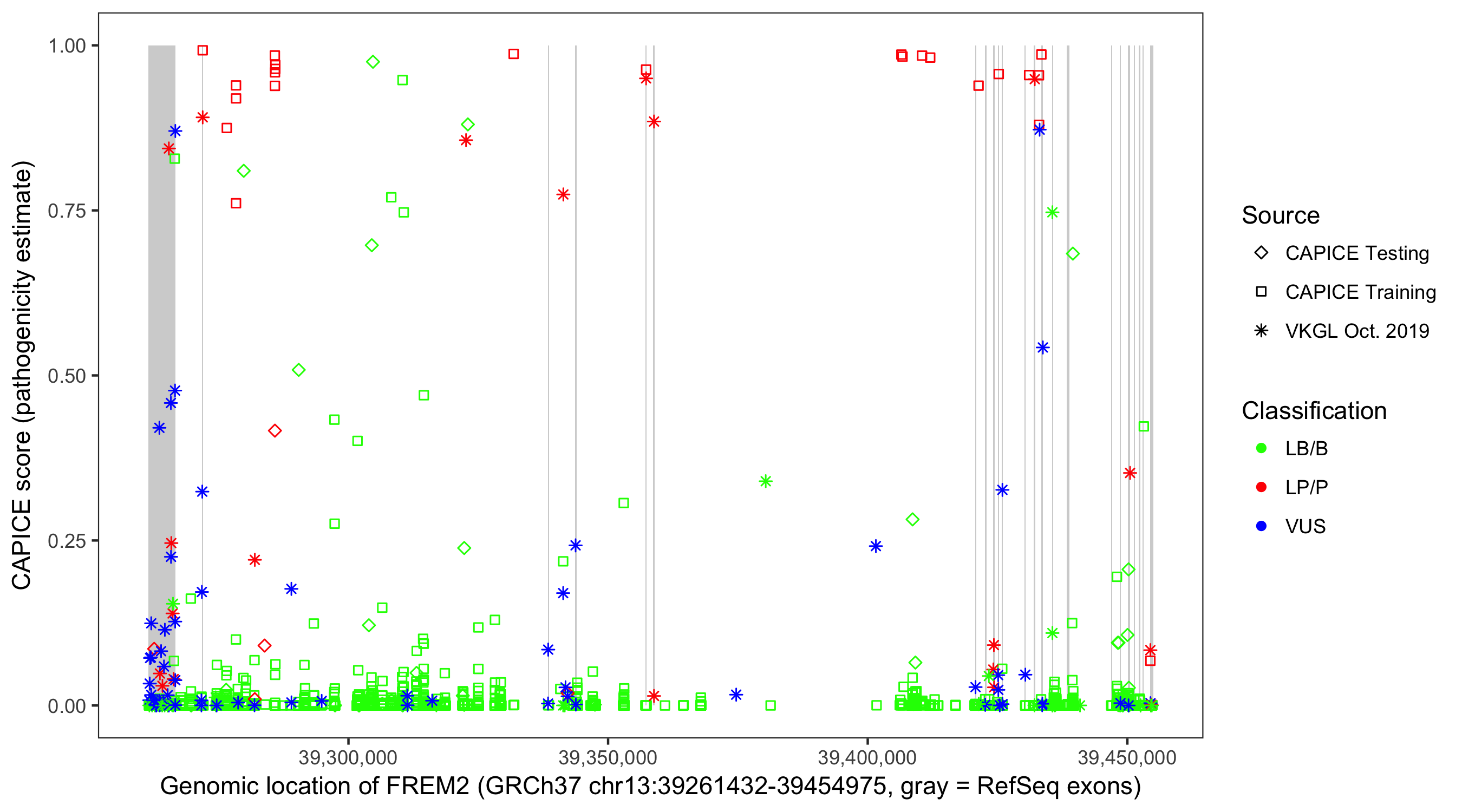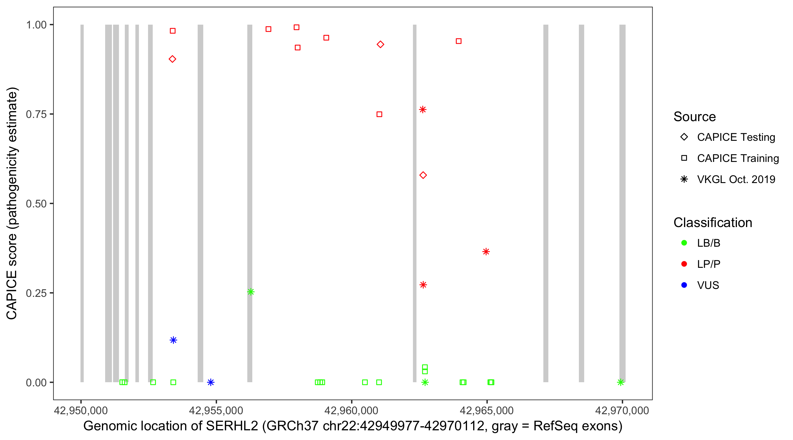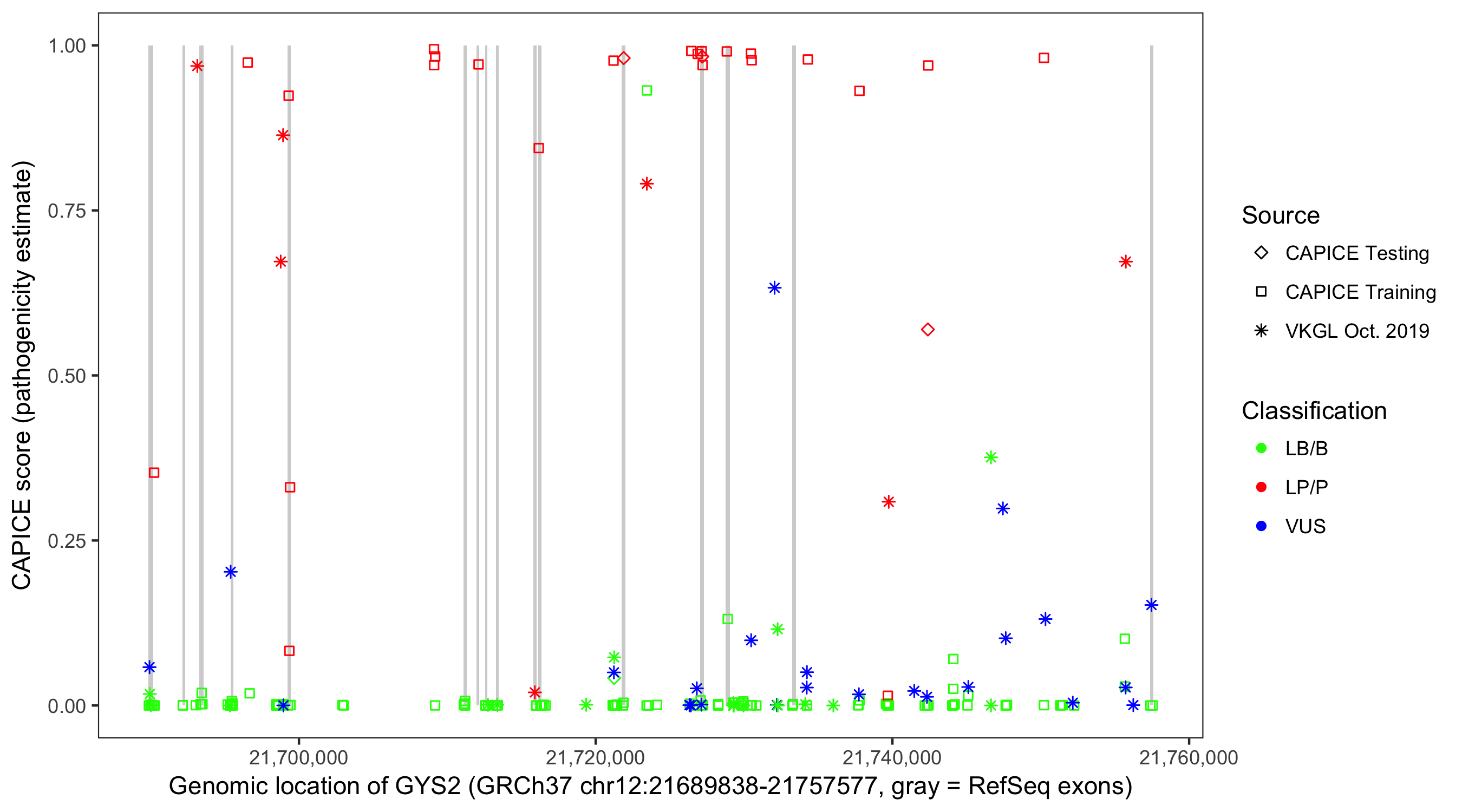 Shown are CAPICE train/test variants plus VKGL Oct 2019.