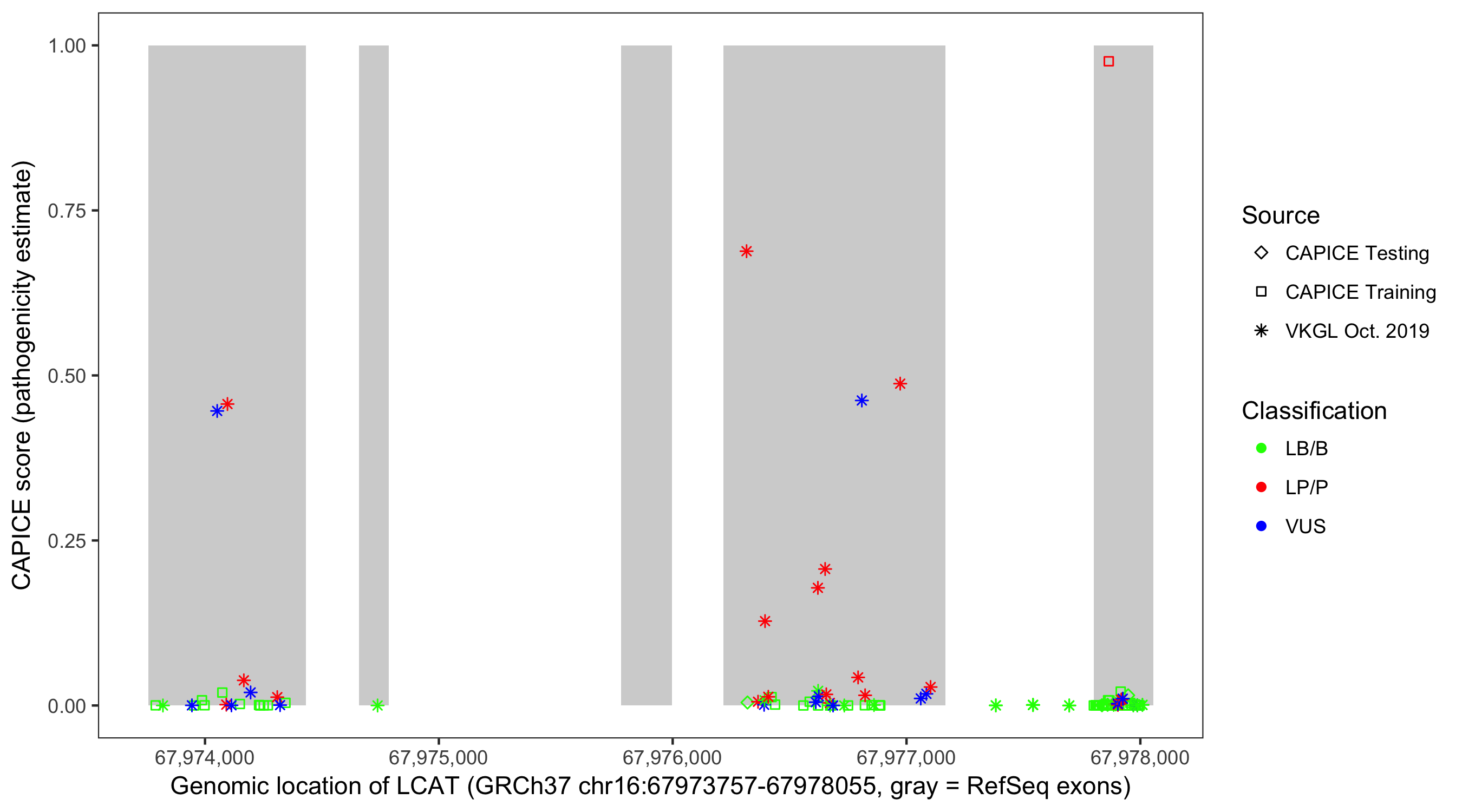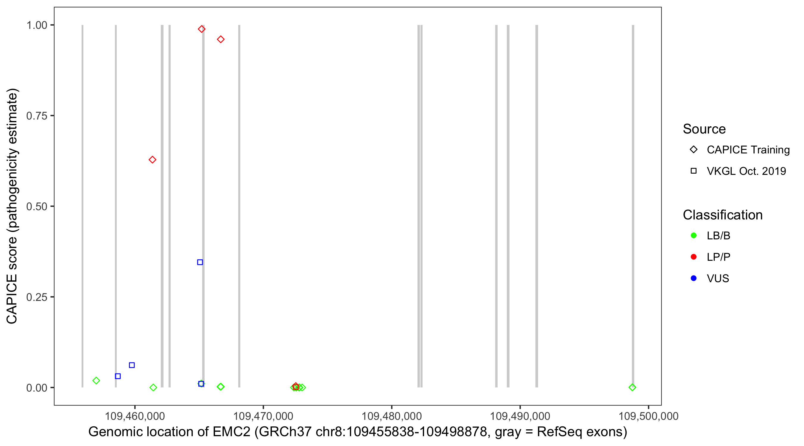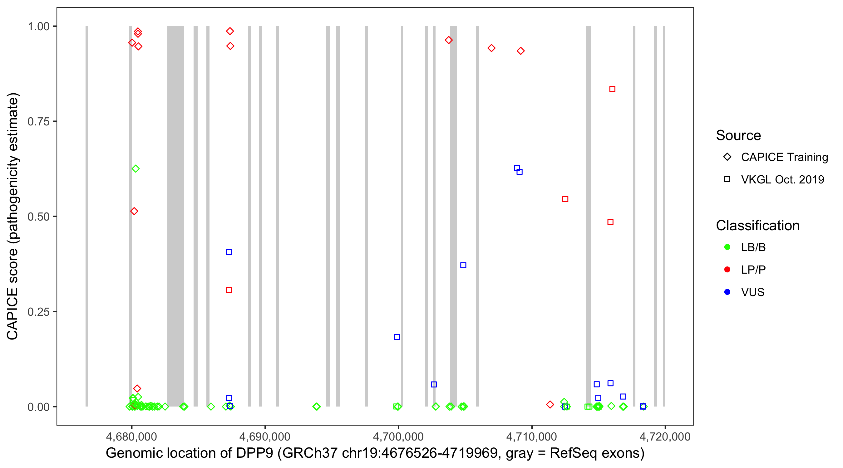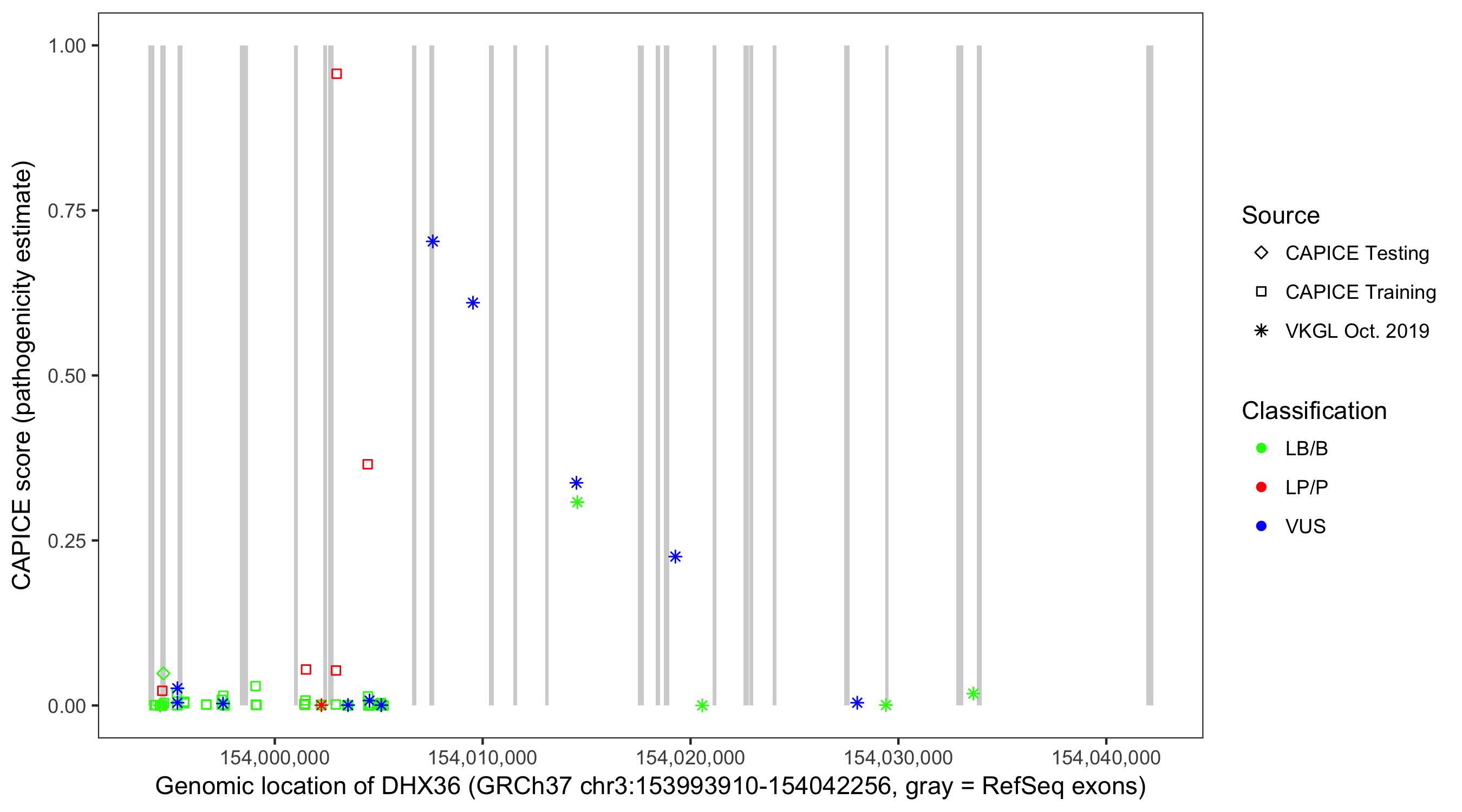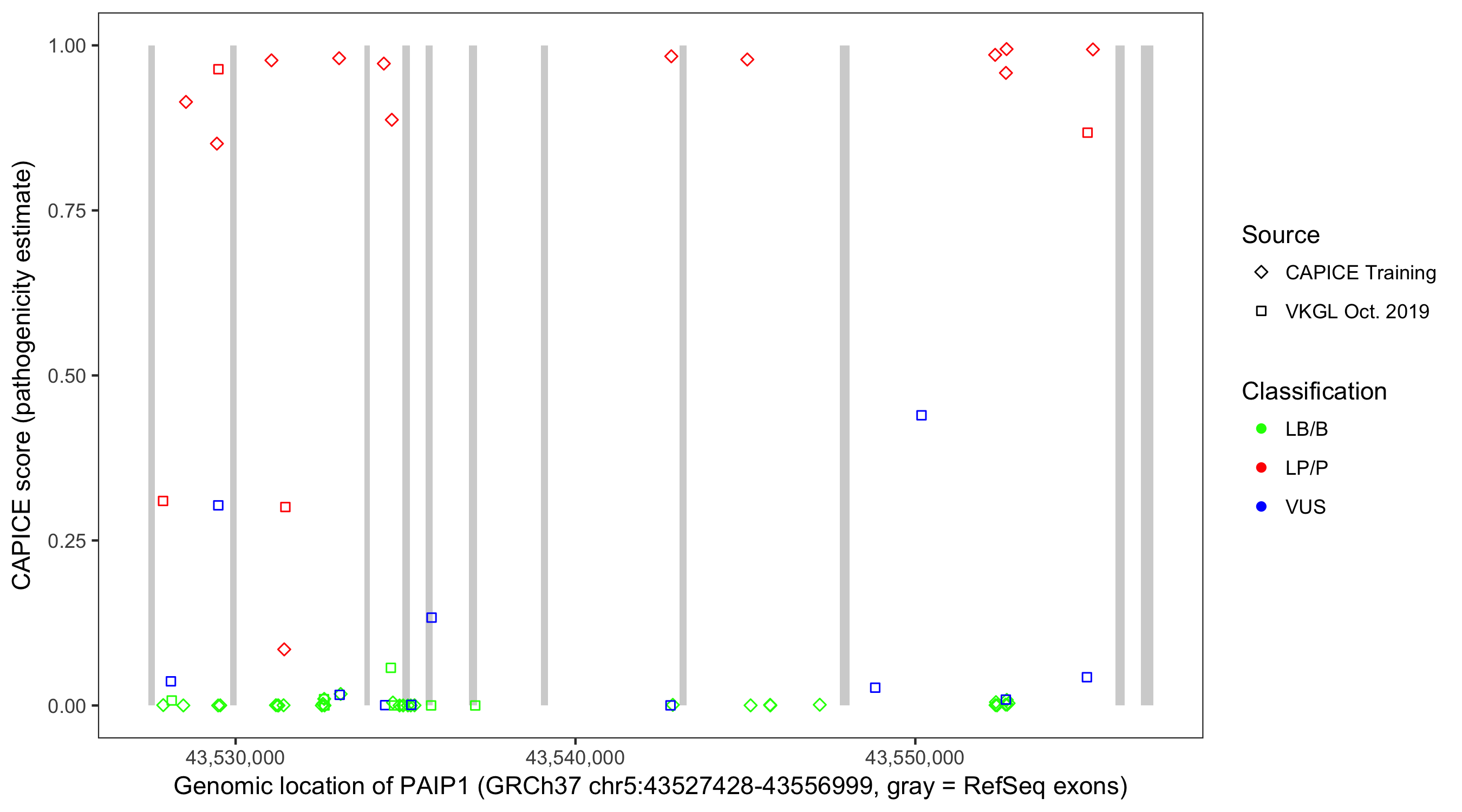 Shown are CAPICE train/test variants plus VKGL Oct 2019.