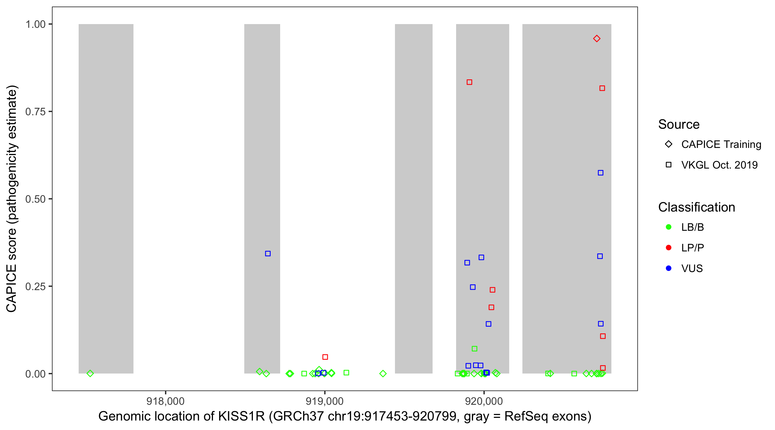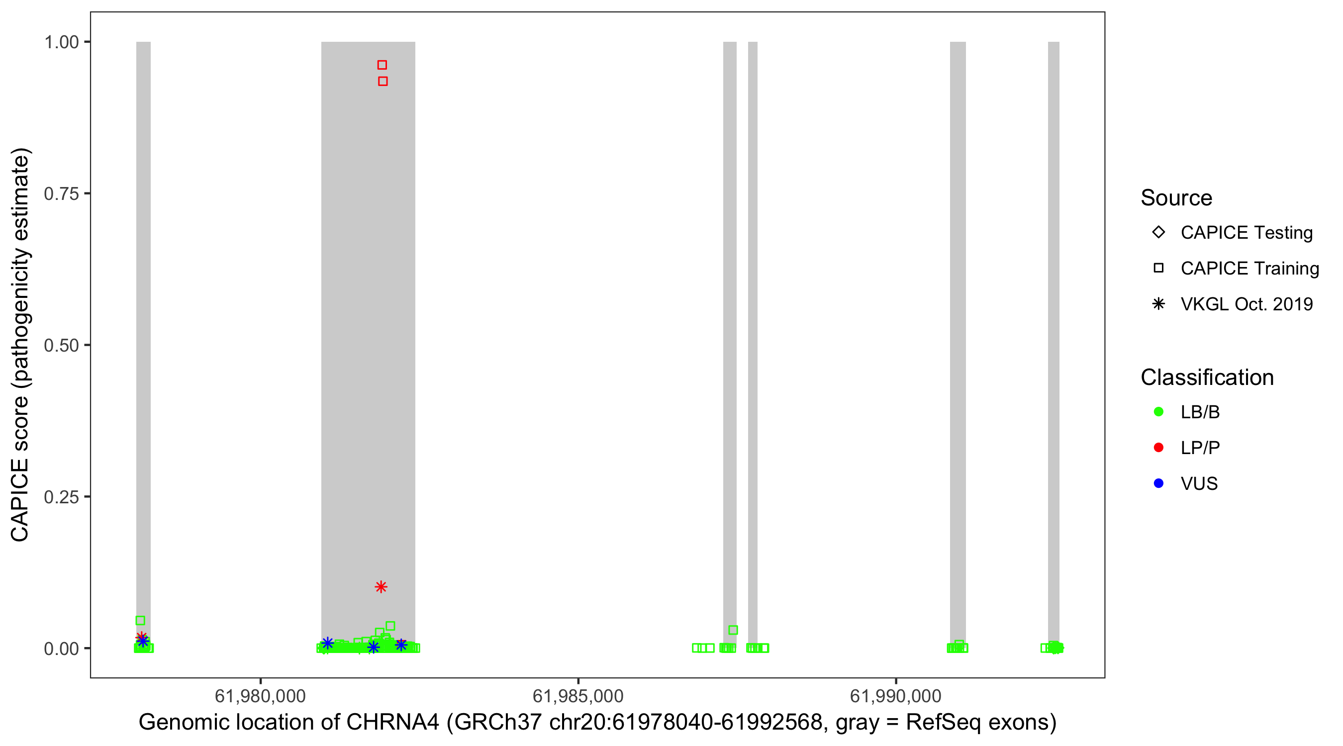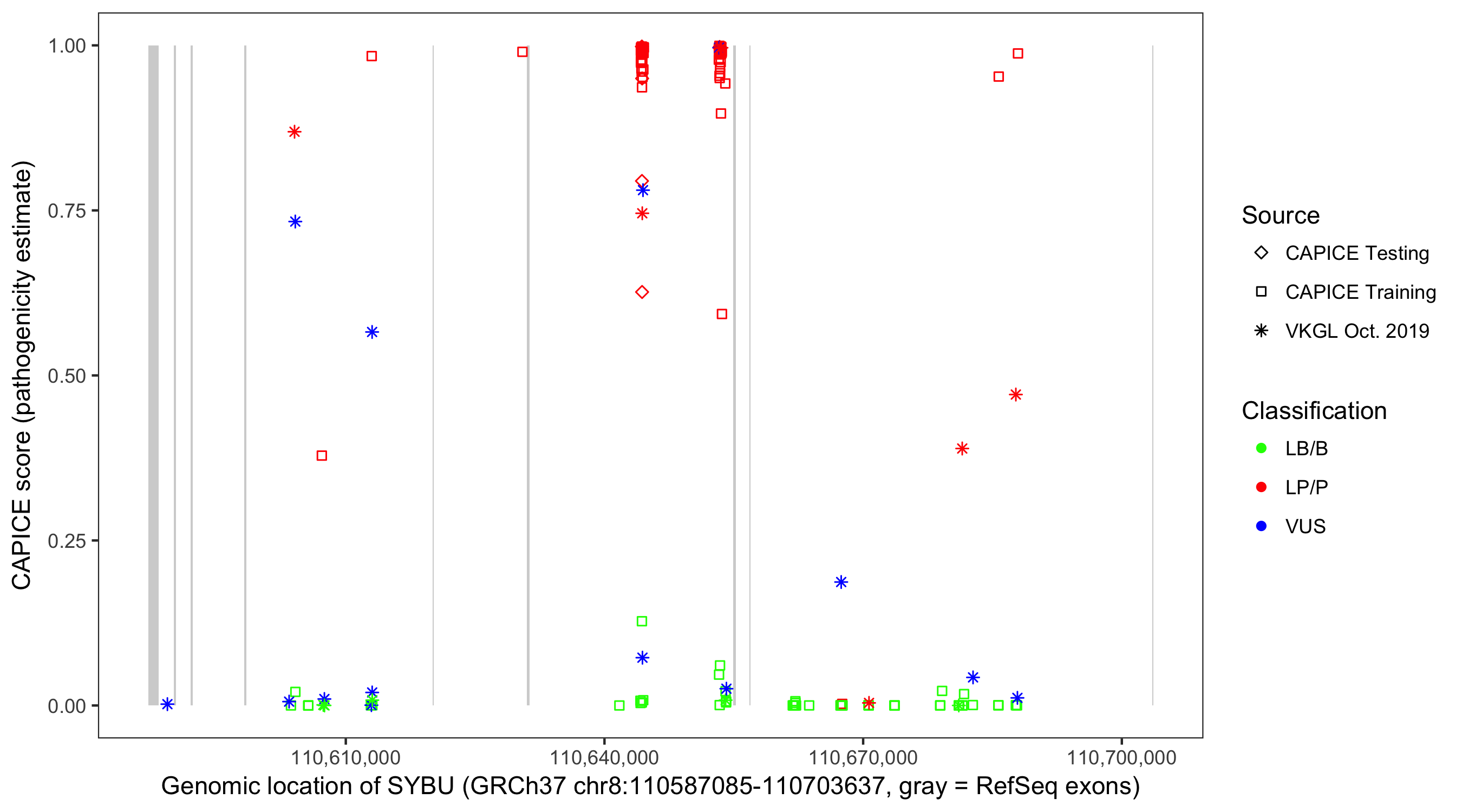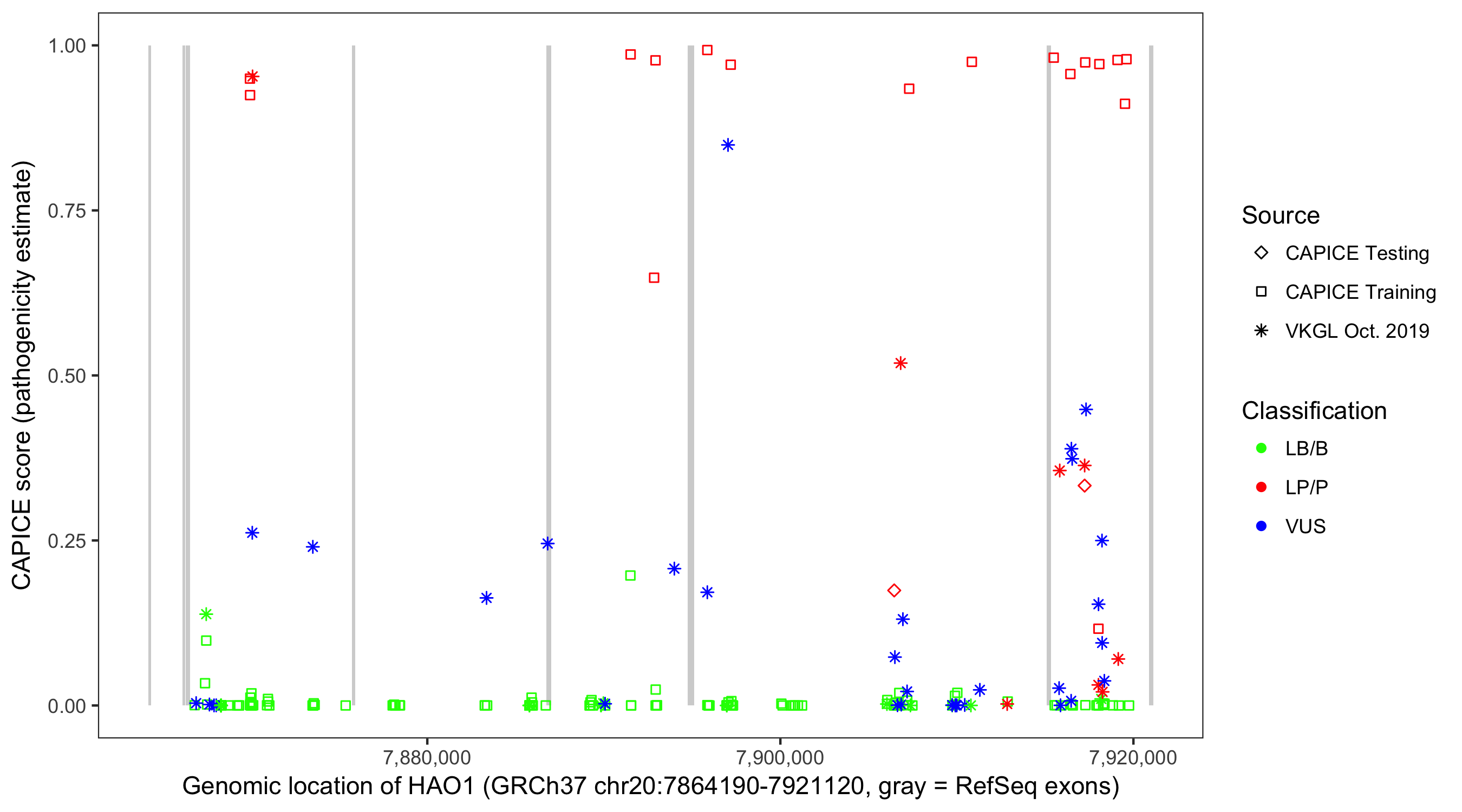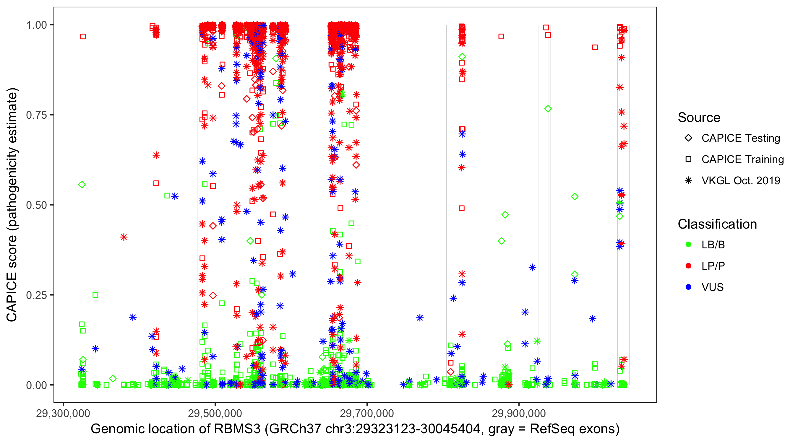 Shown are CAPICE train/test variants plus VKGL Oct 2019.