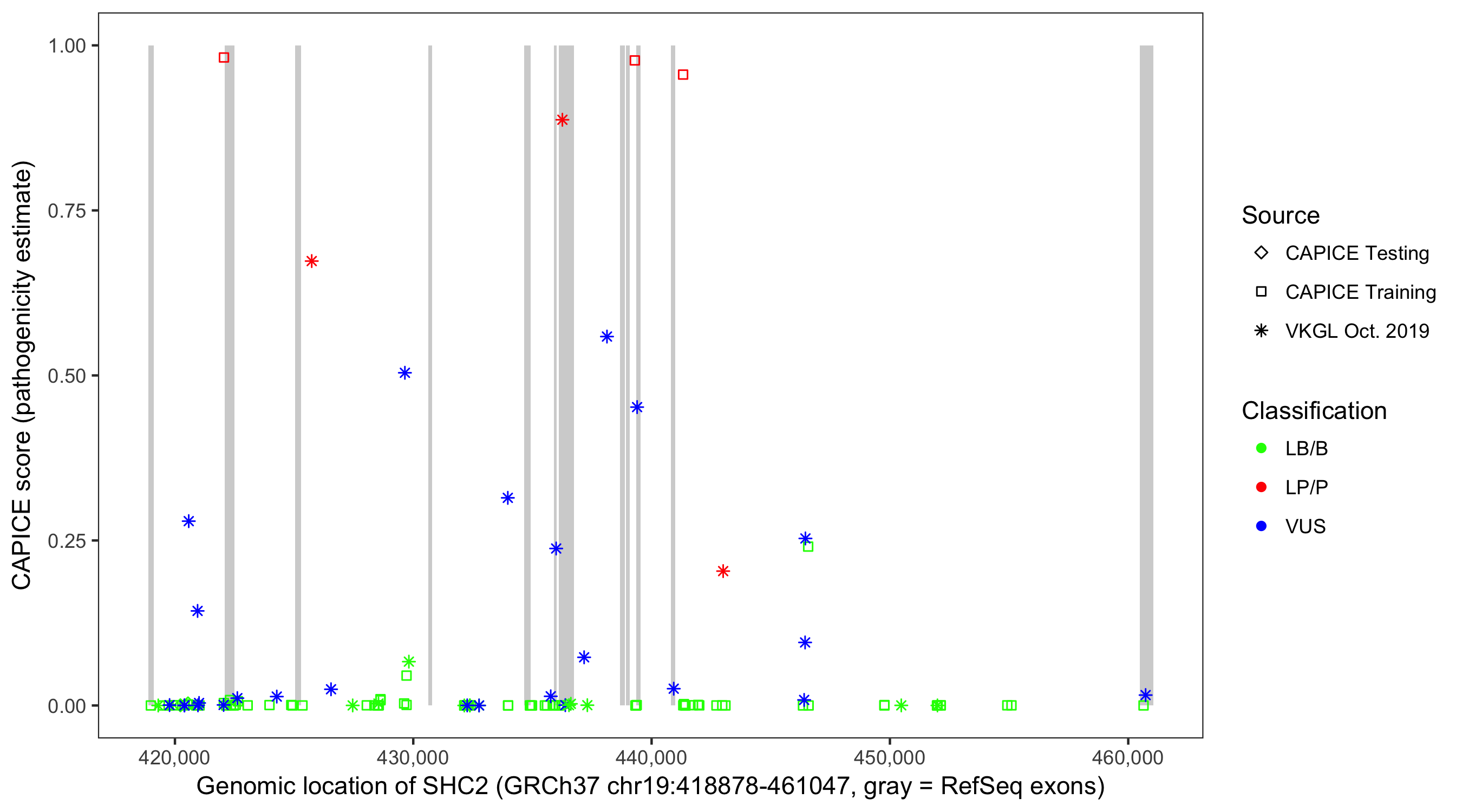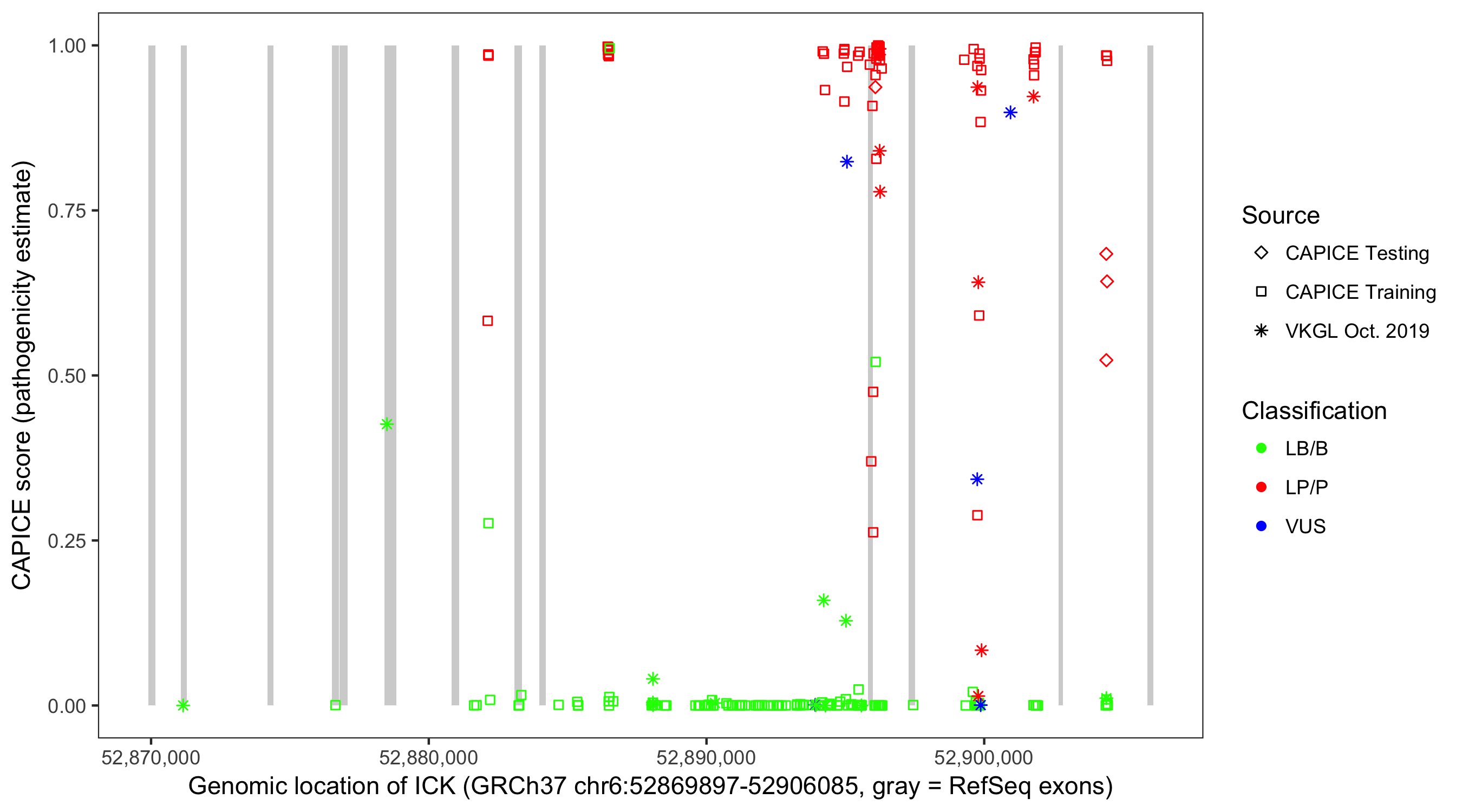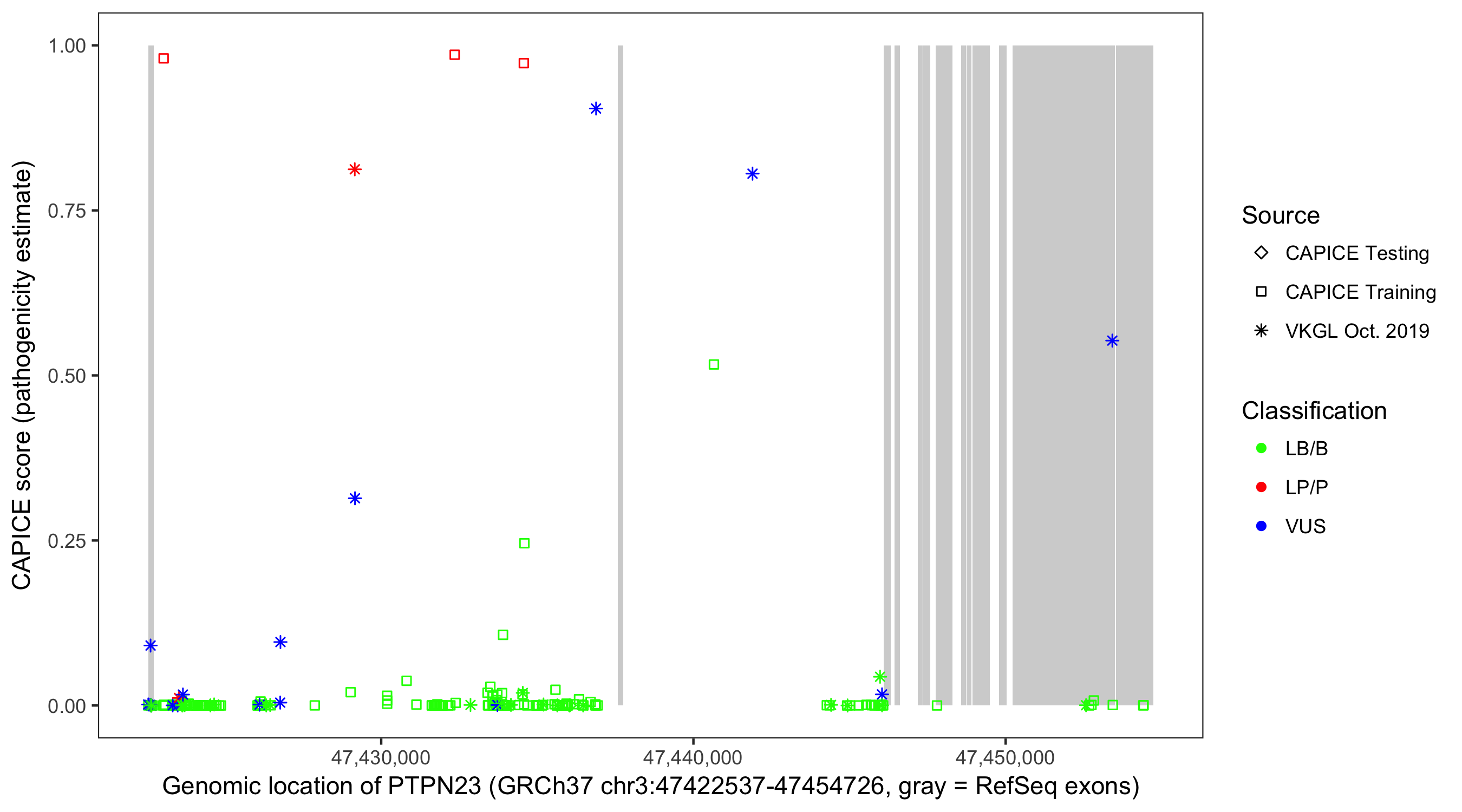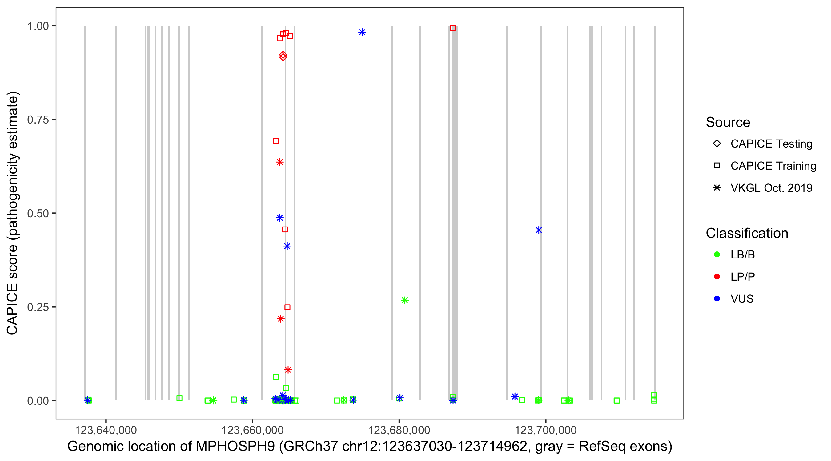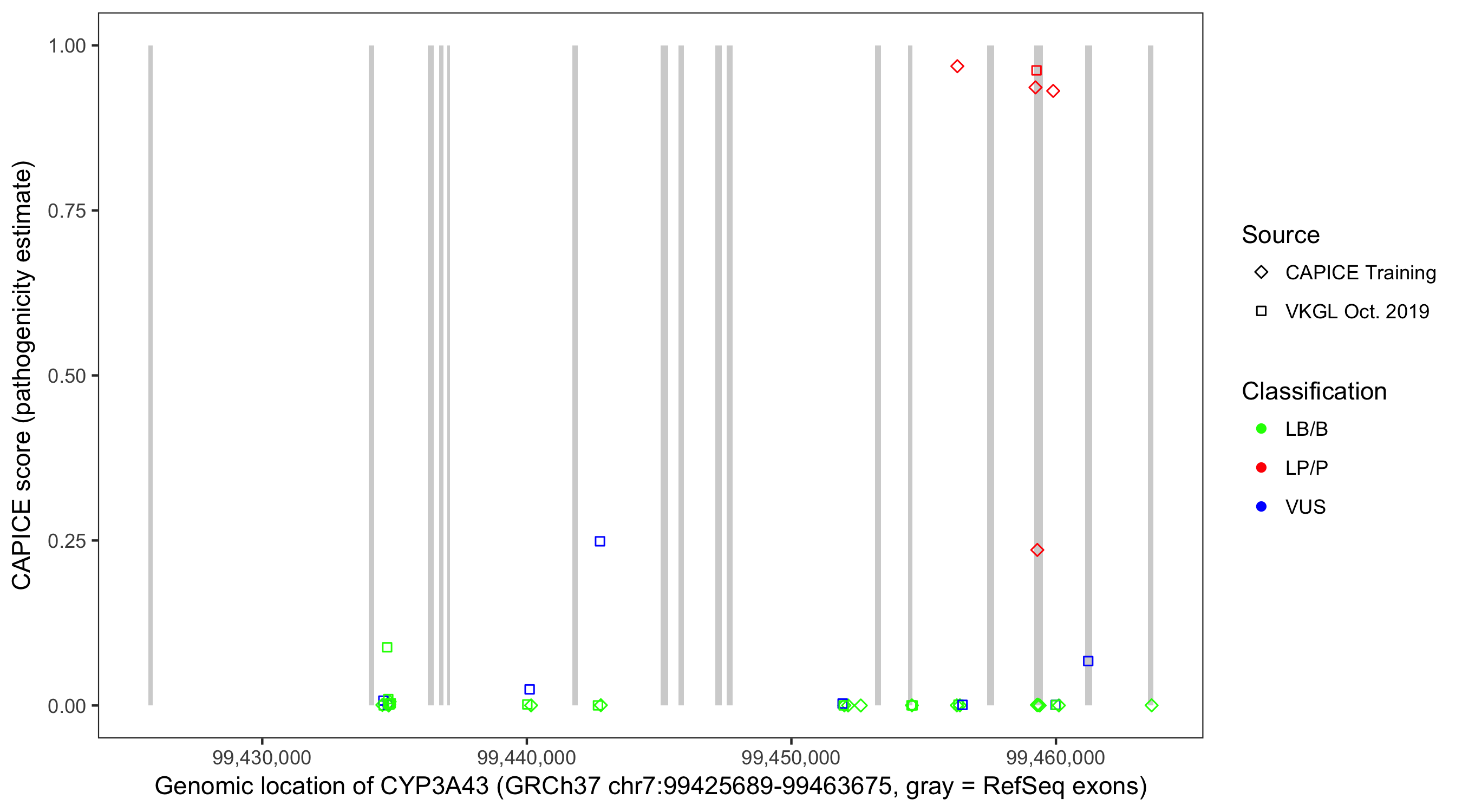 Shown are CAPICE train/test variants plus VKGL Oct 2019.