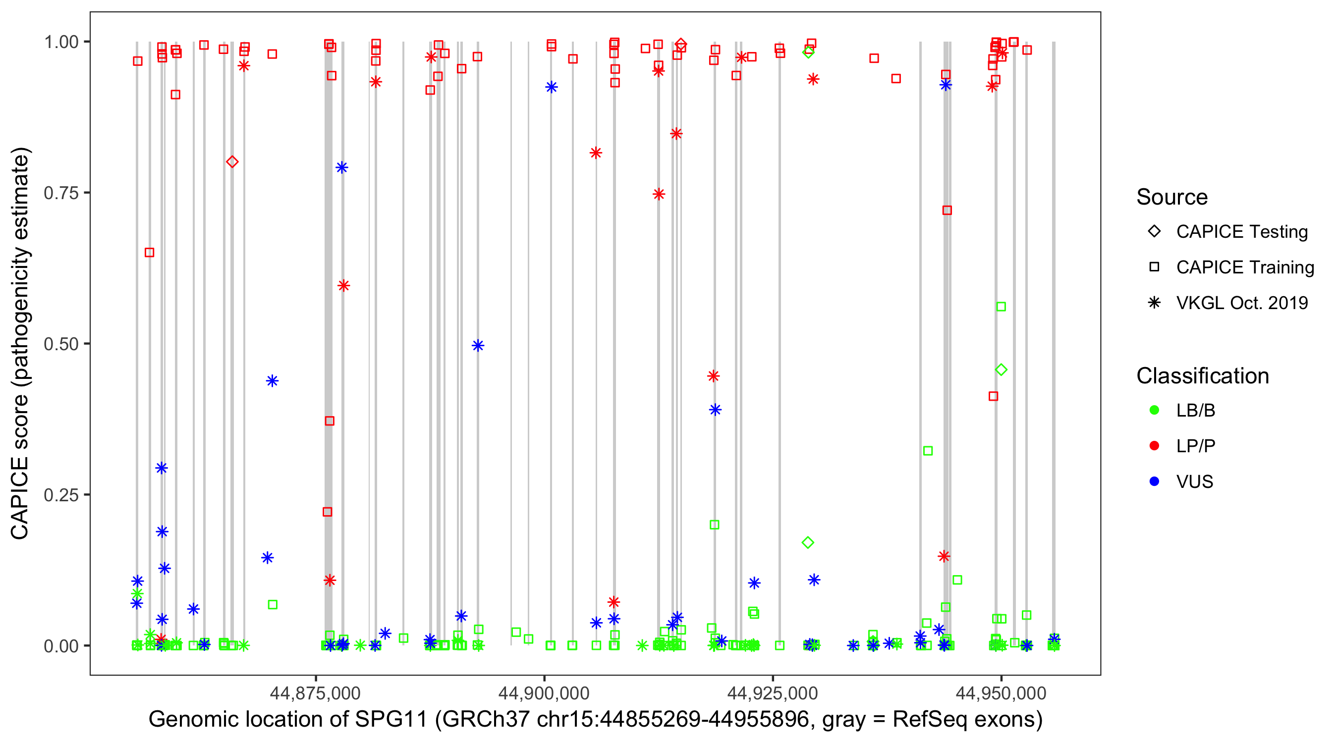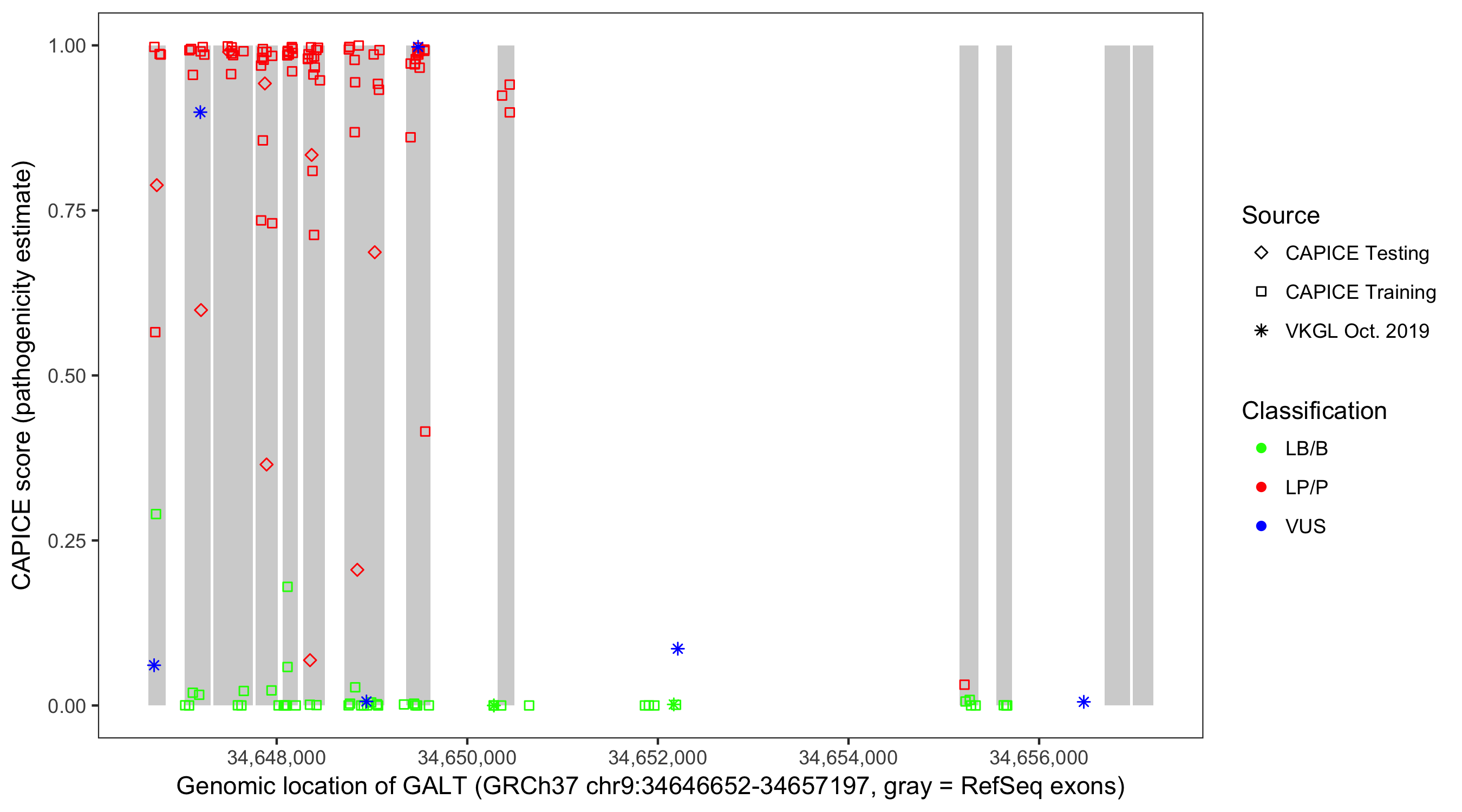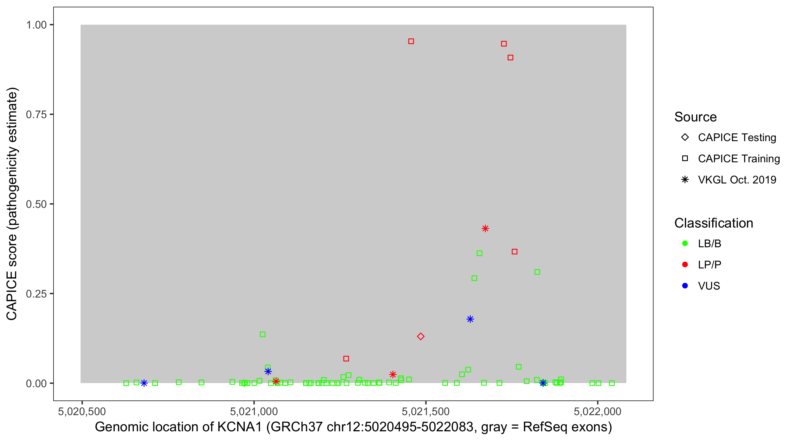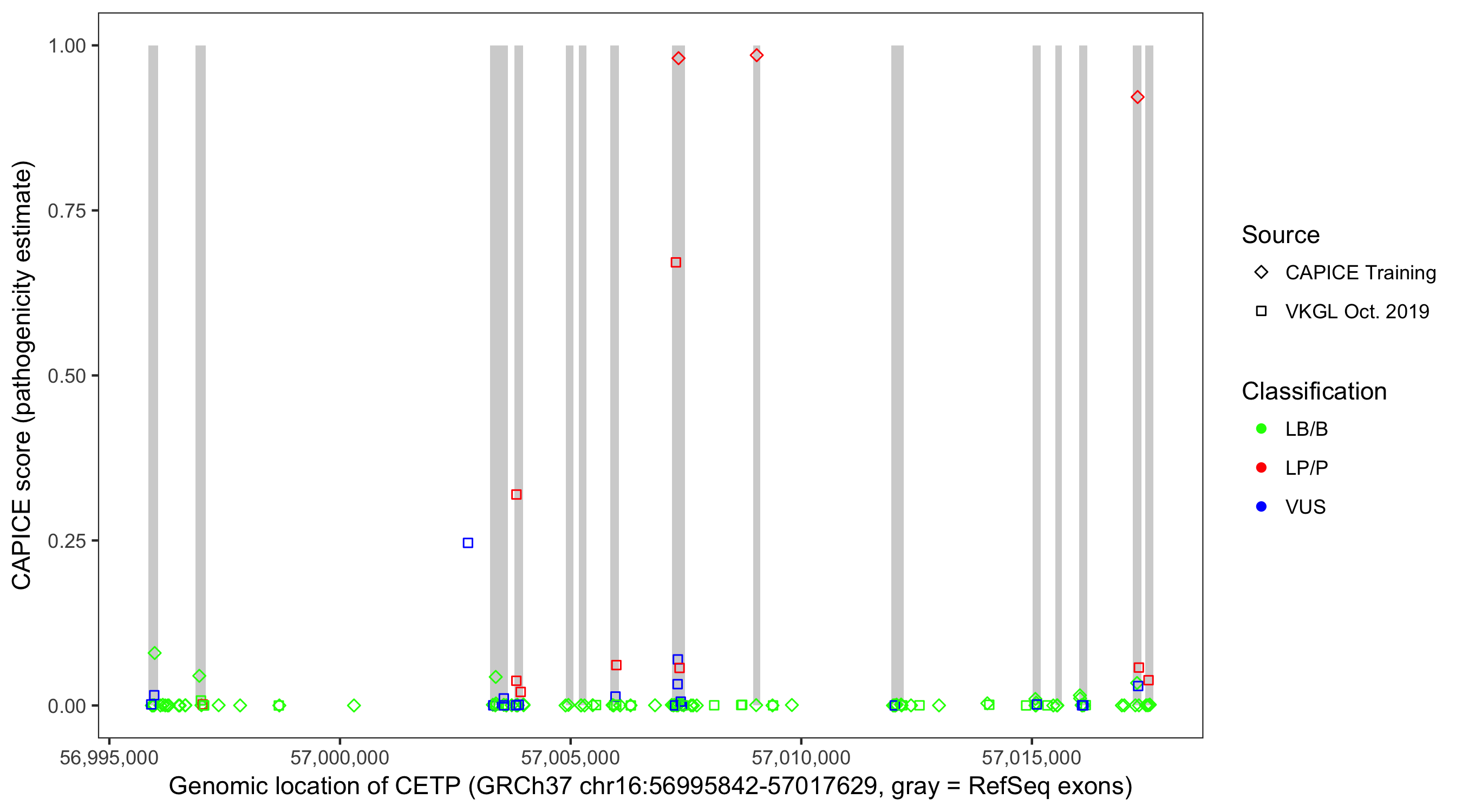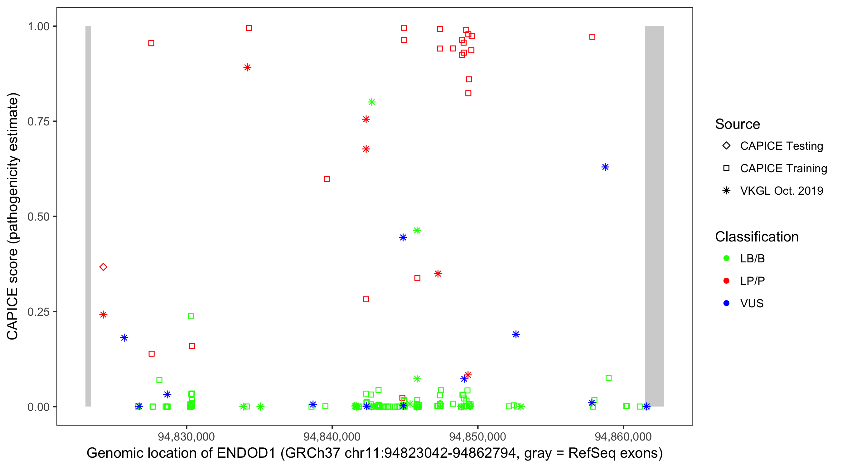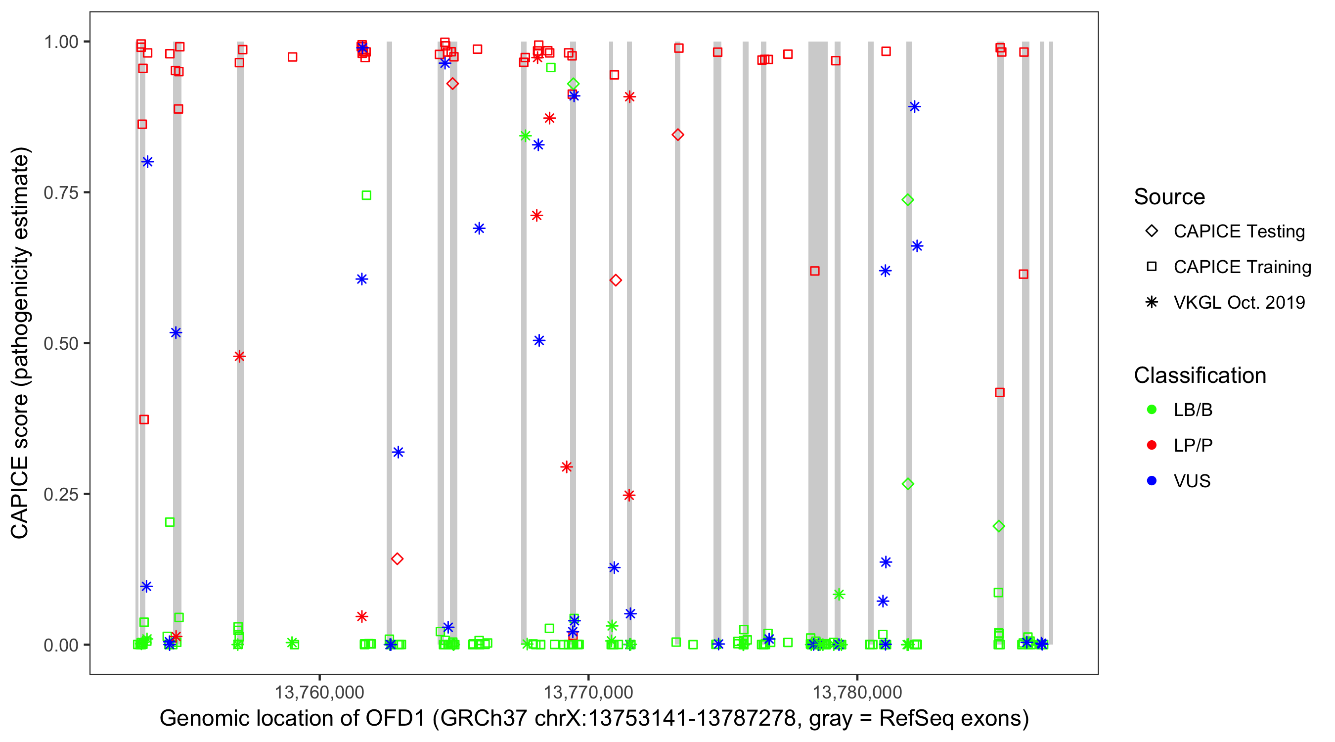 Shown are CAPICE train/test variants plus VKGL Oct 2019.