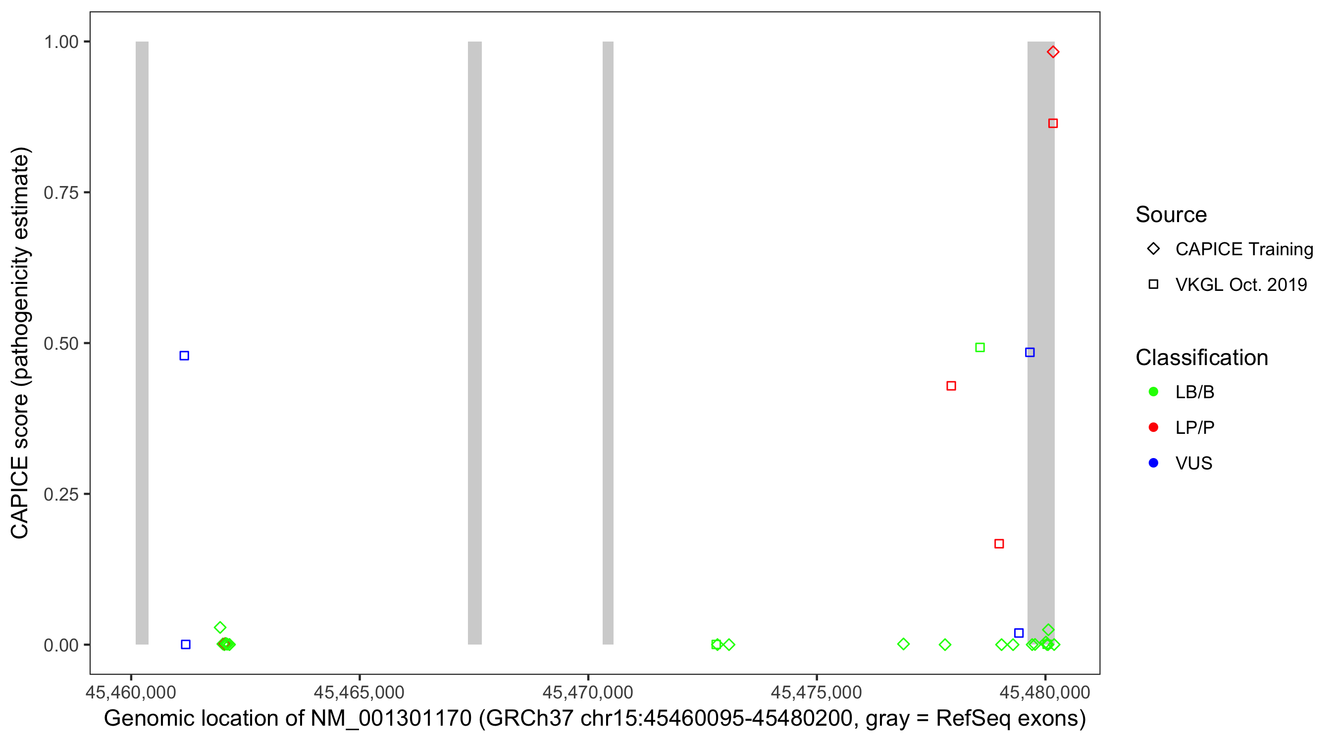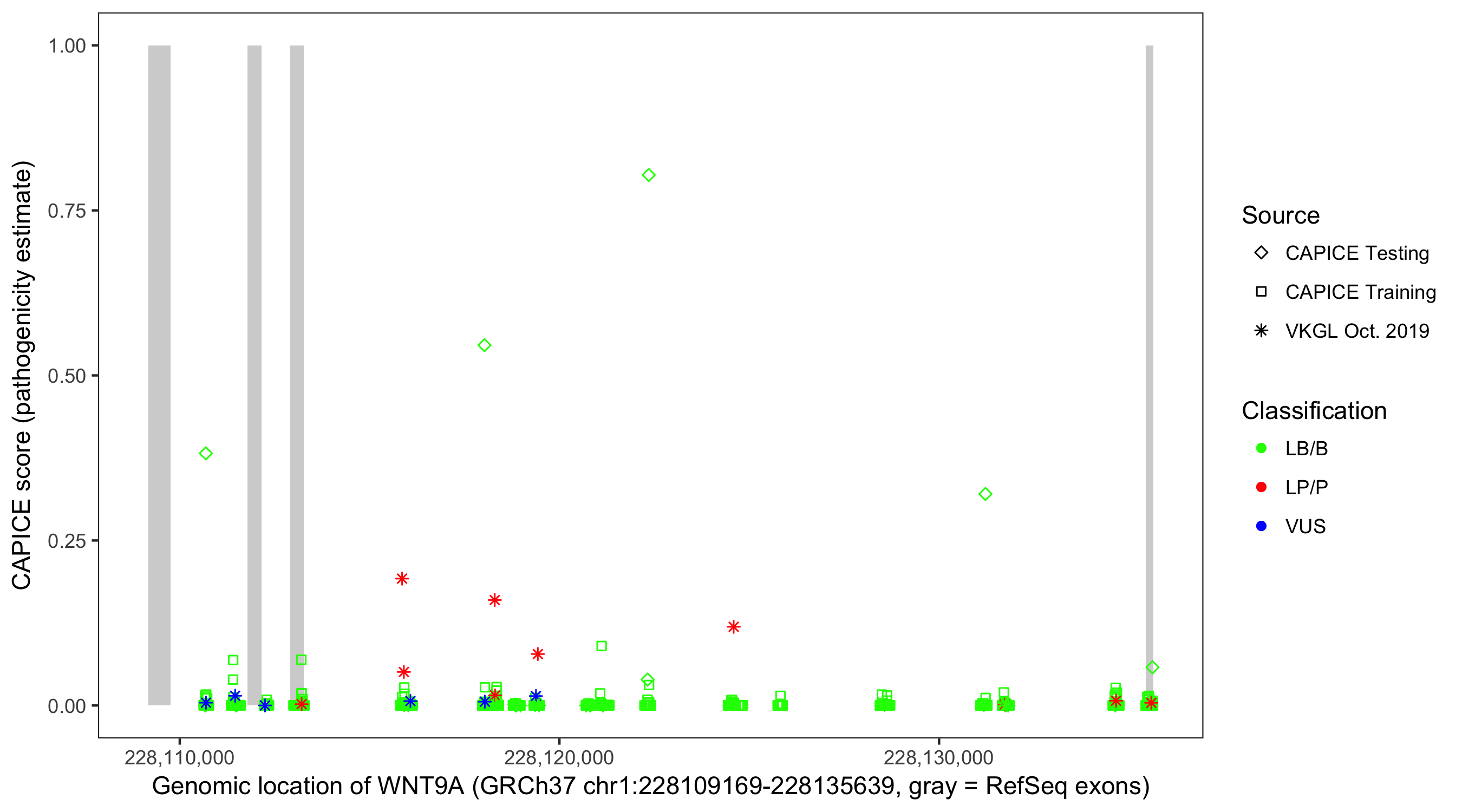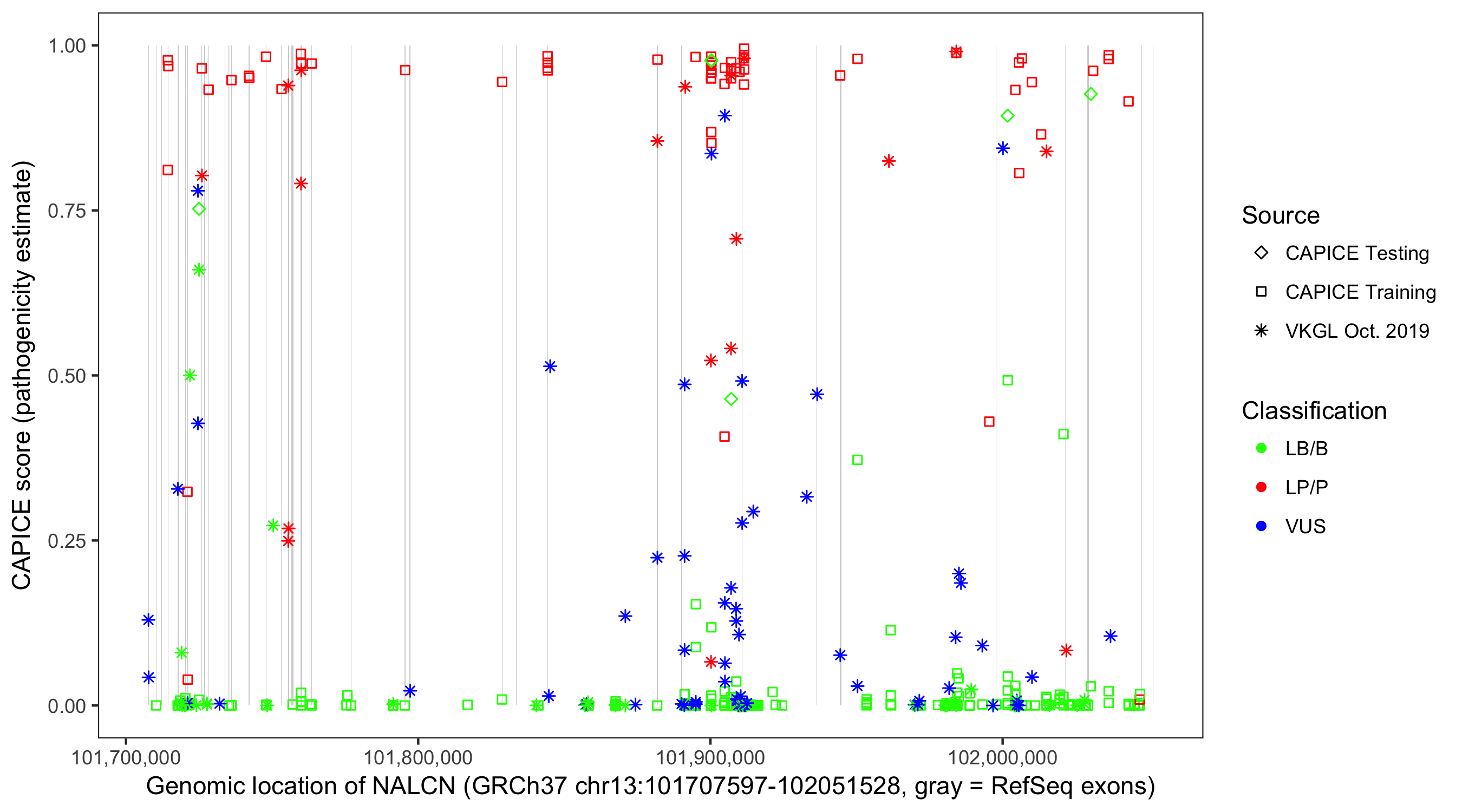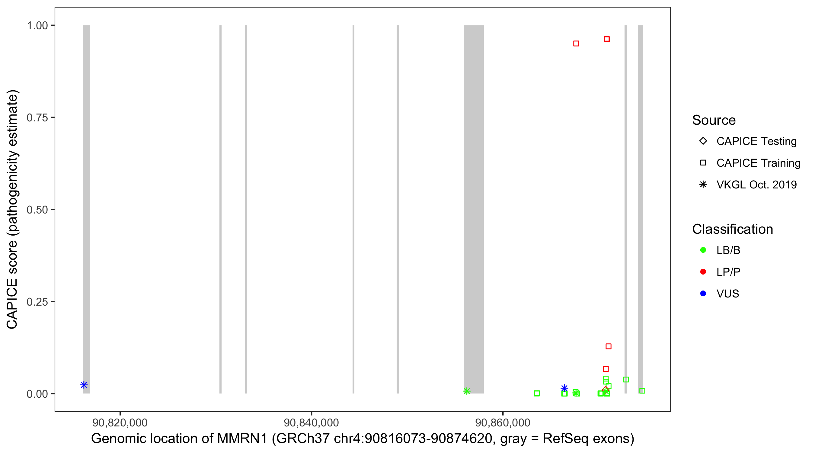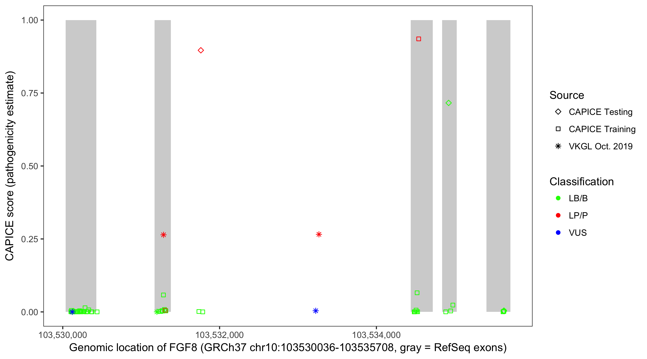 Shown are CAPICE train/test variants plus VKGL Oct 2019.