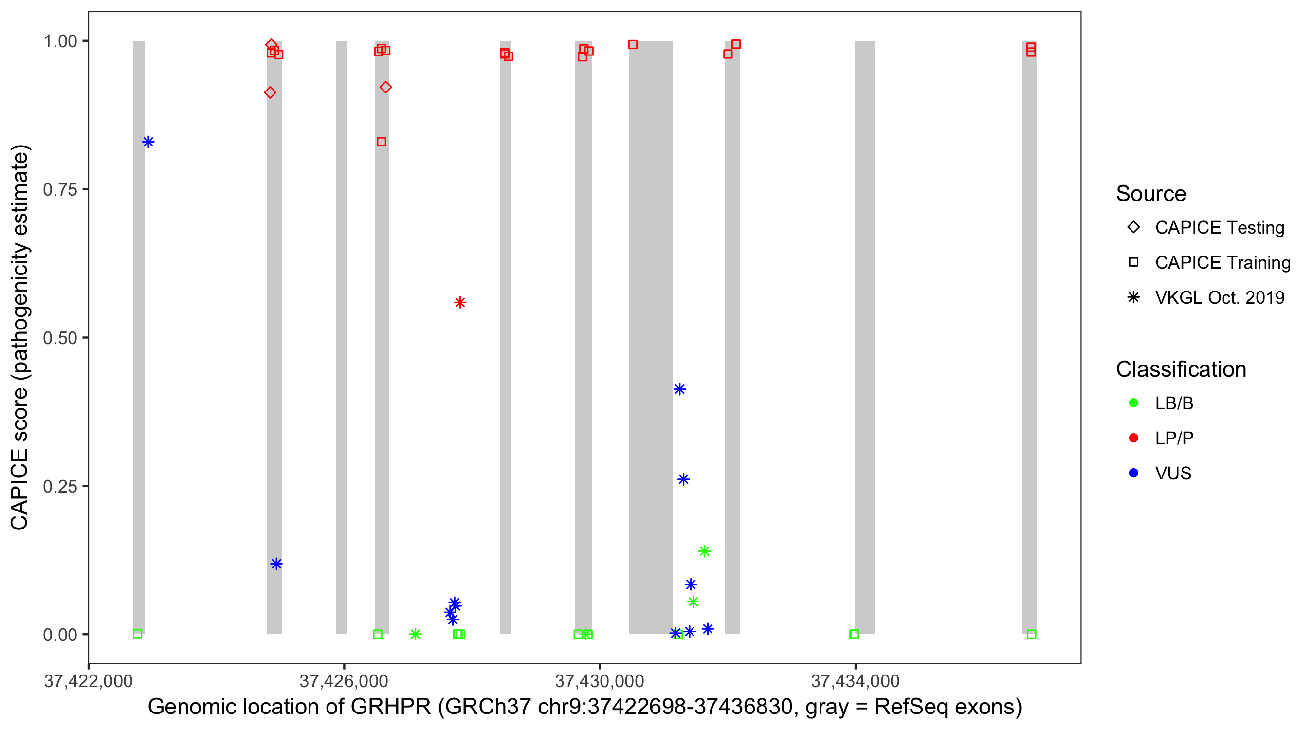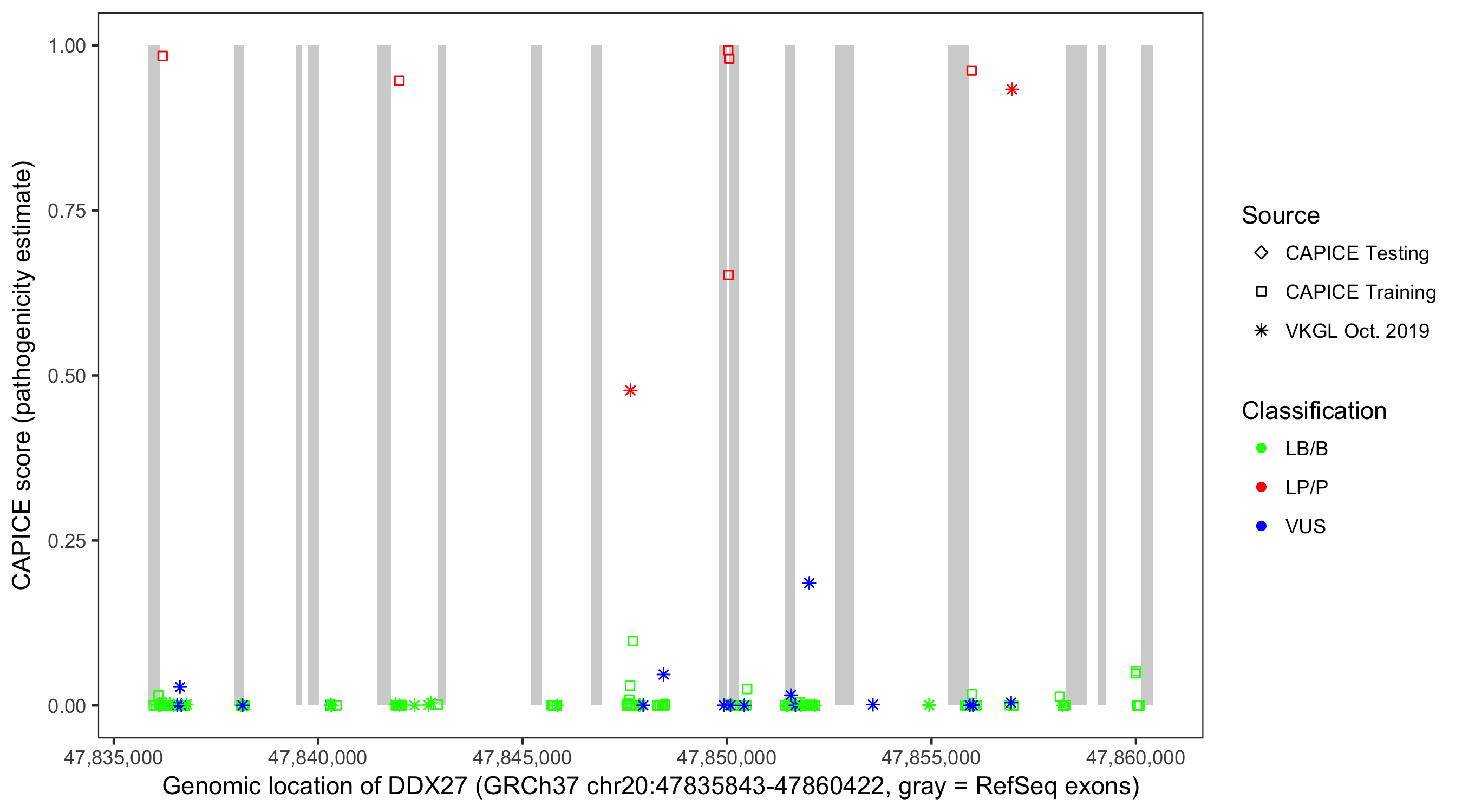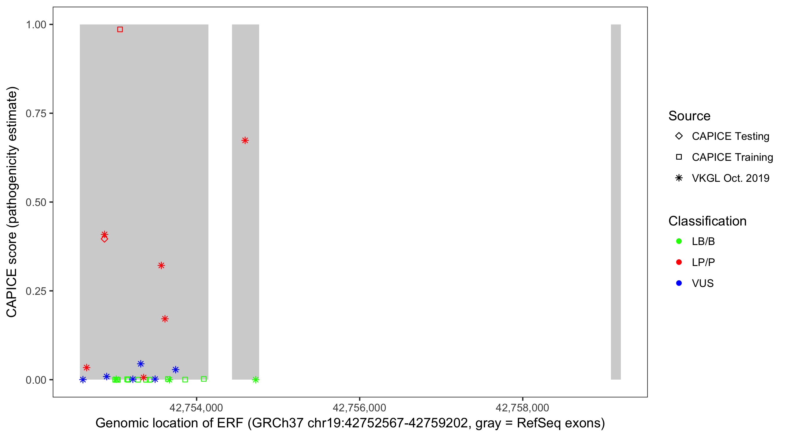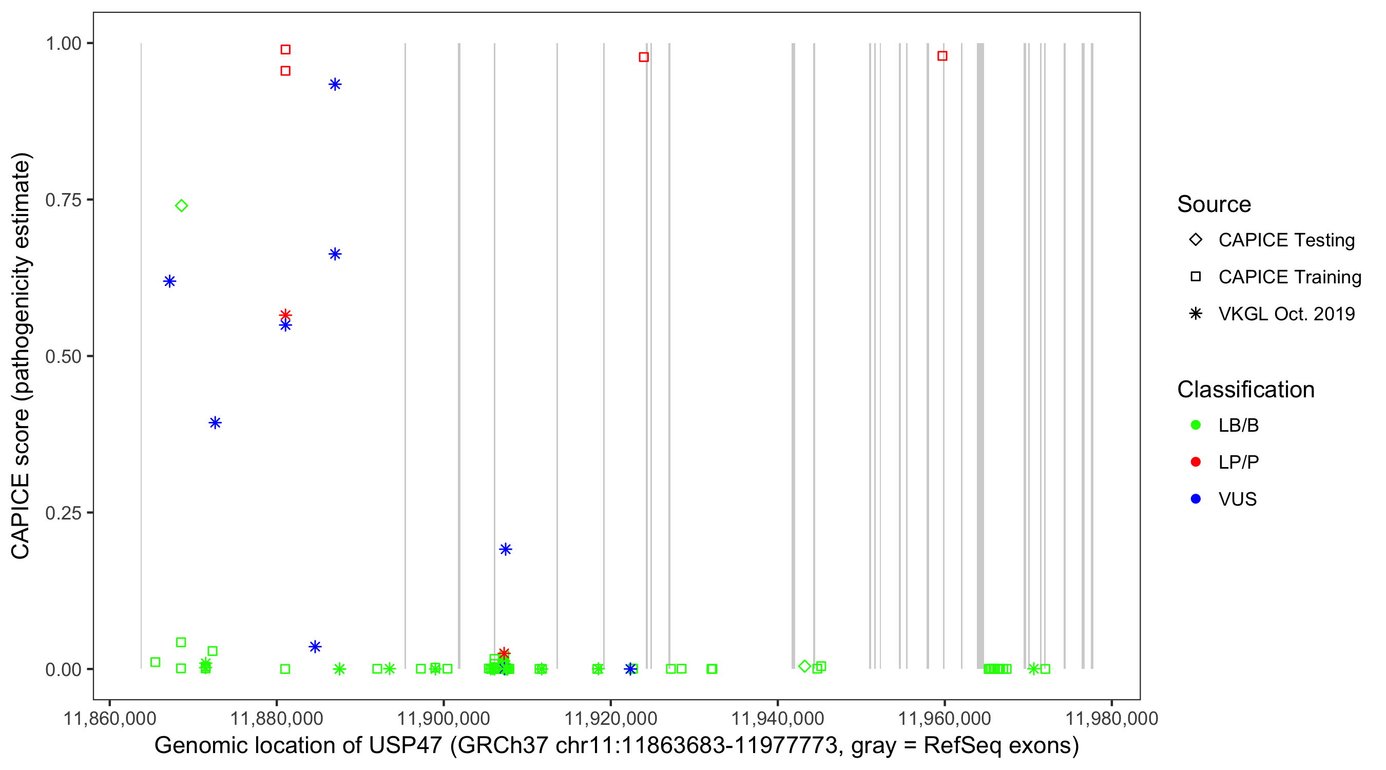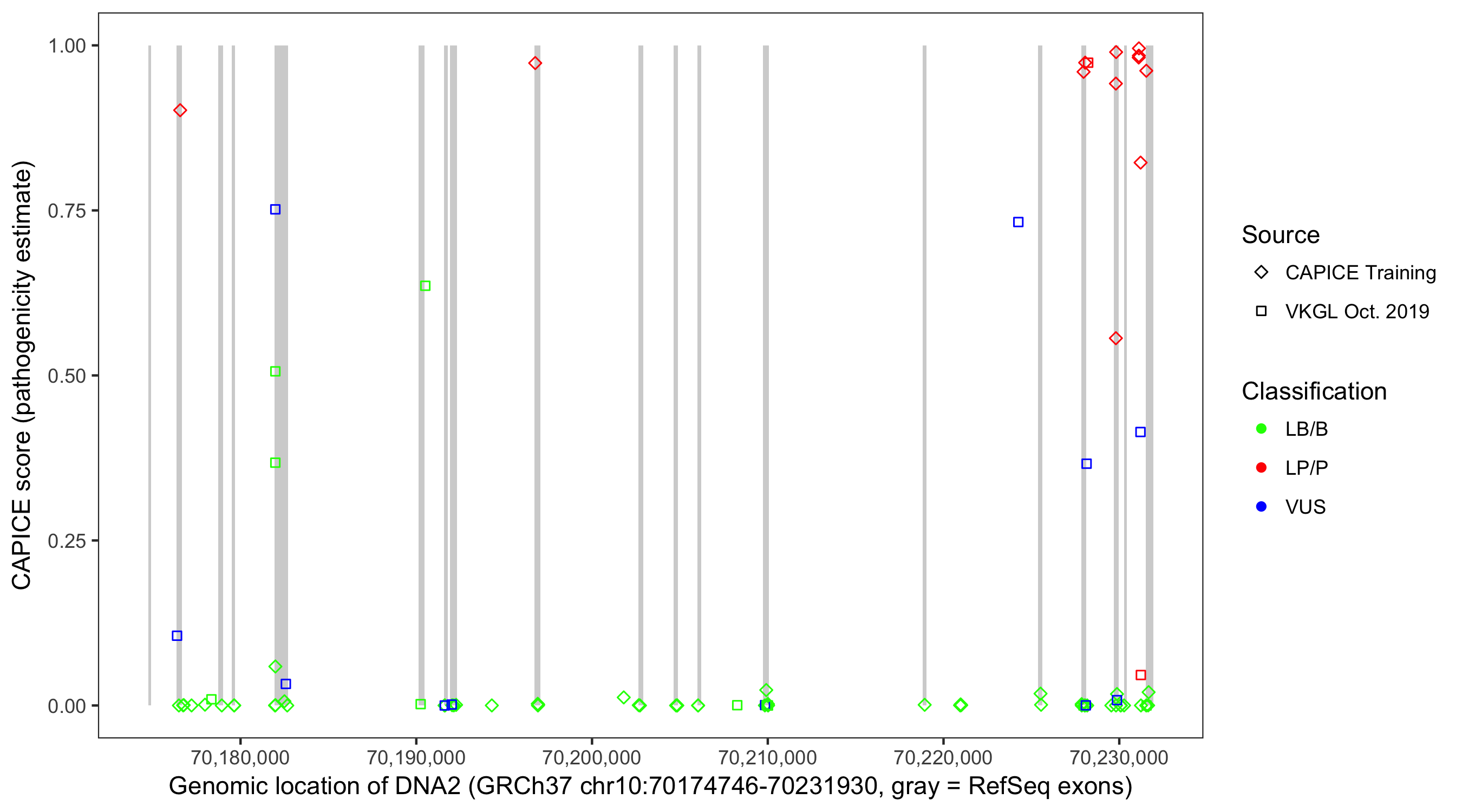 Shown are CAPICE train/test variants plus VKGL Oct 2019.