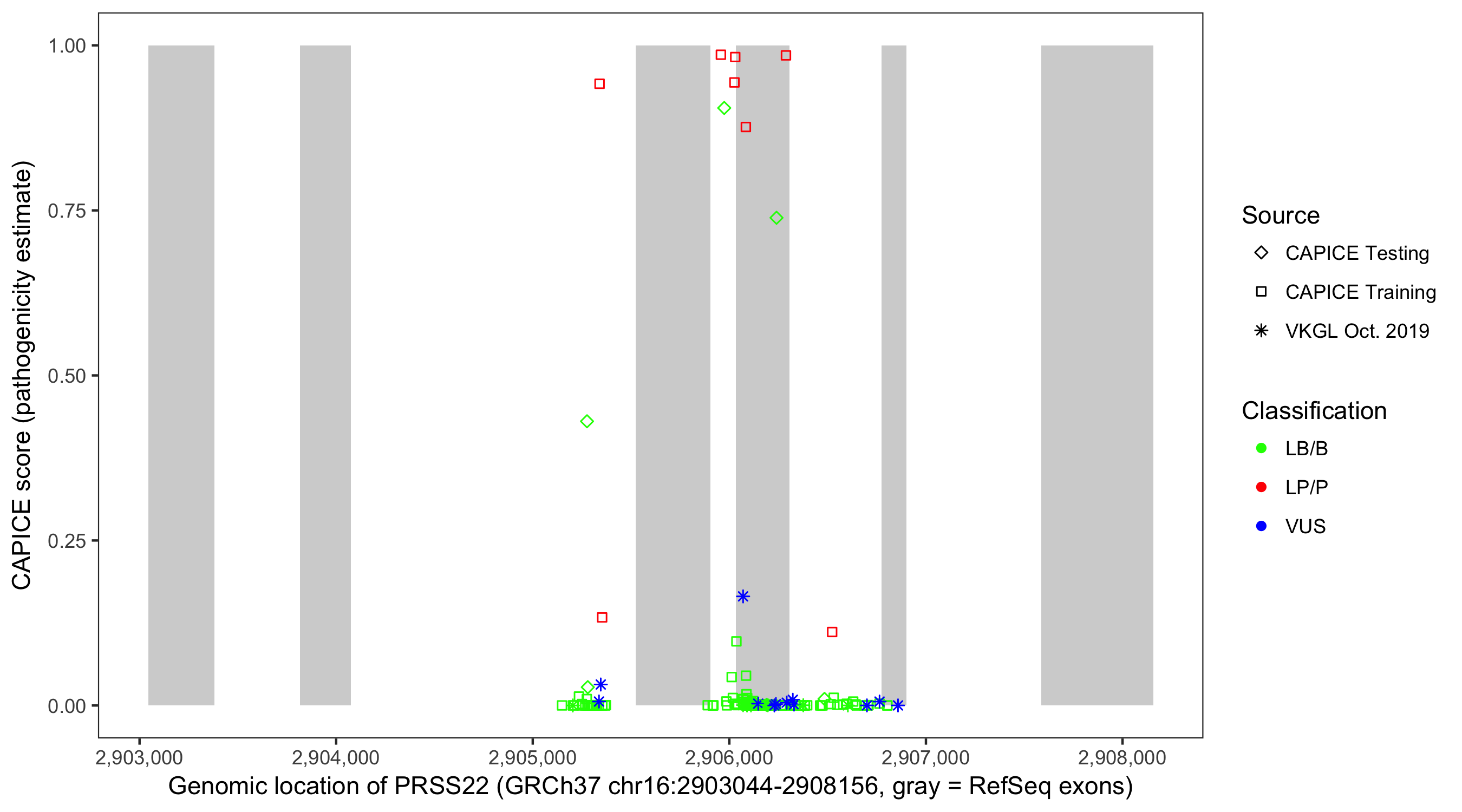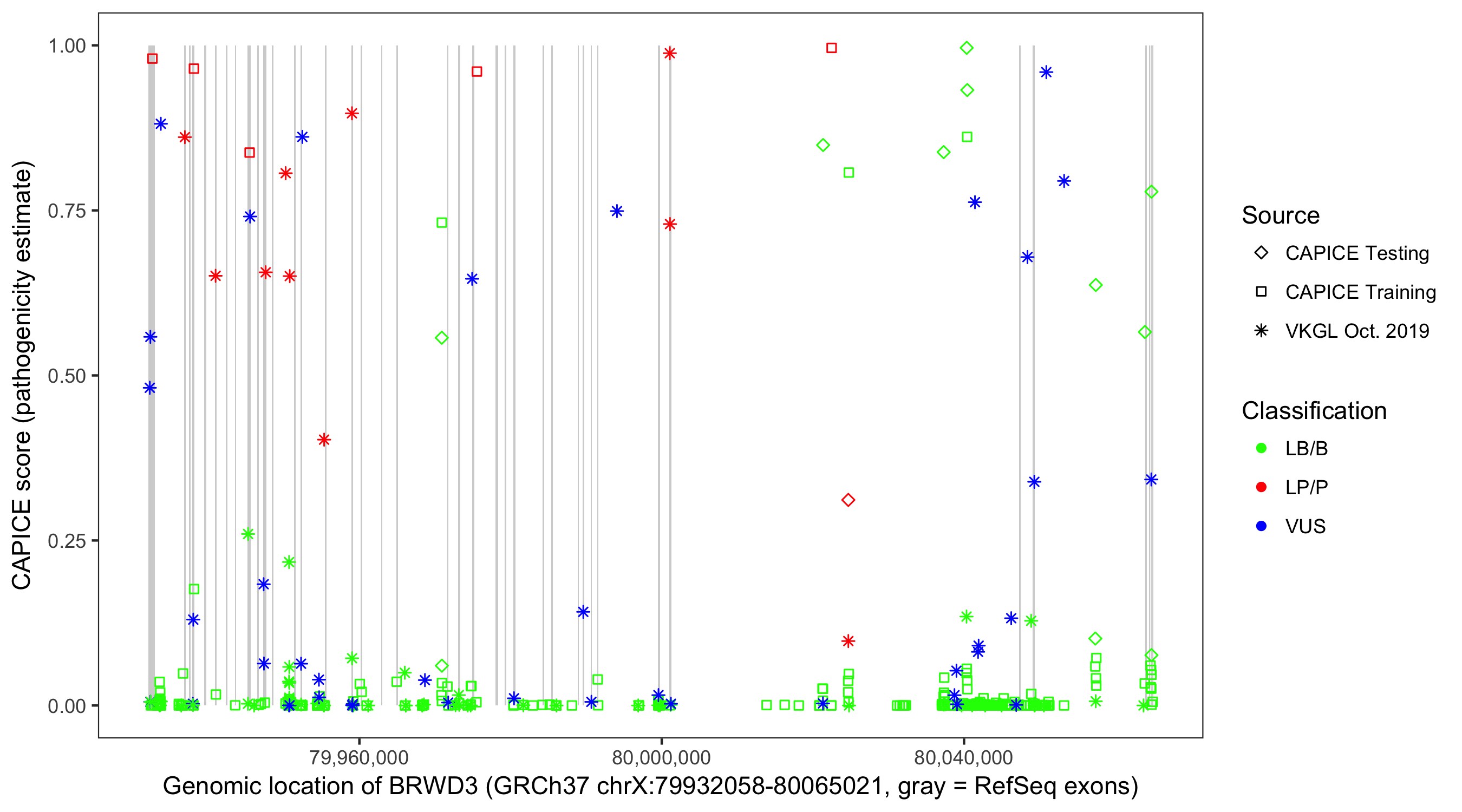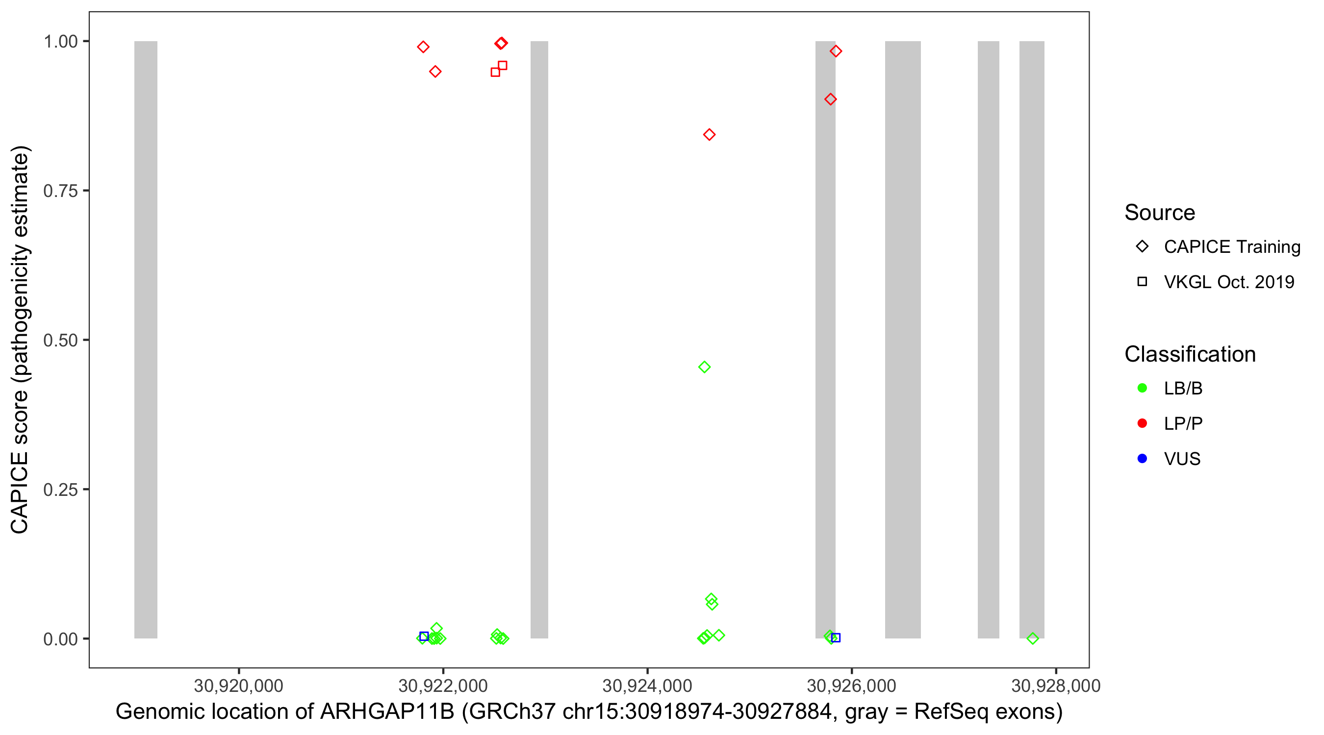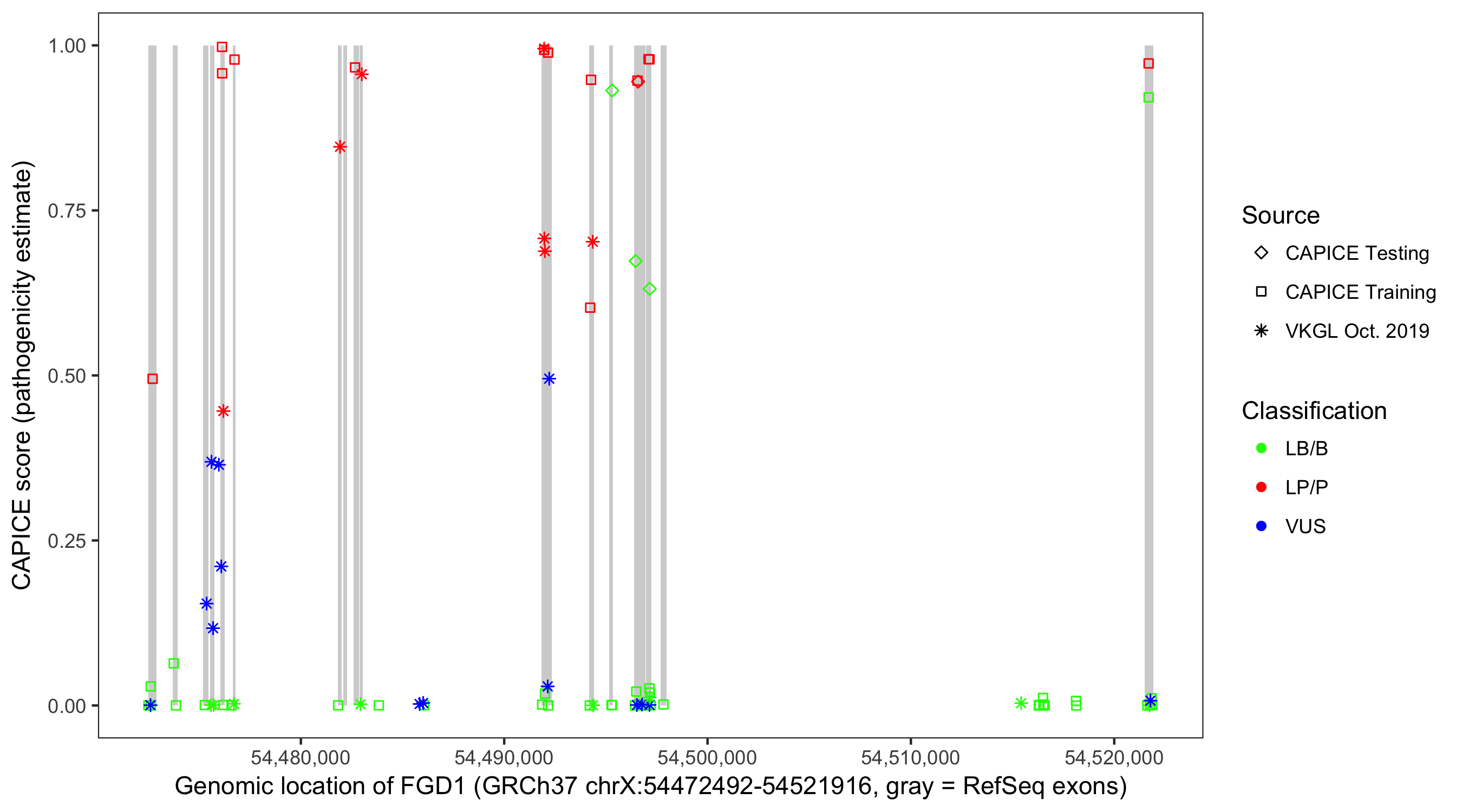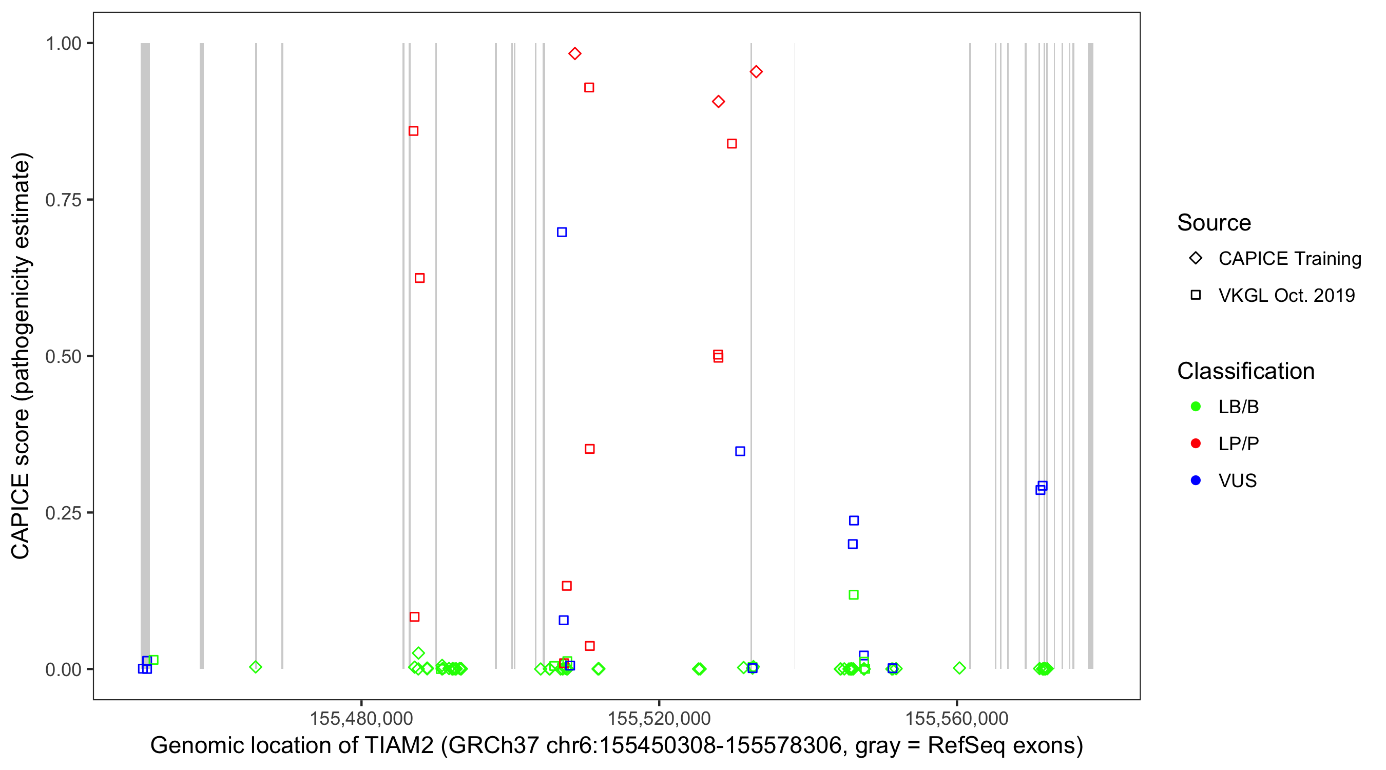 Shown are CAPICE train/test variants plus VKGL Oct 2019.