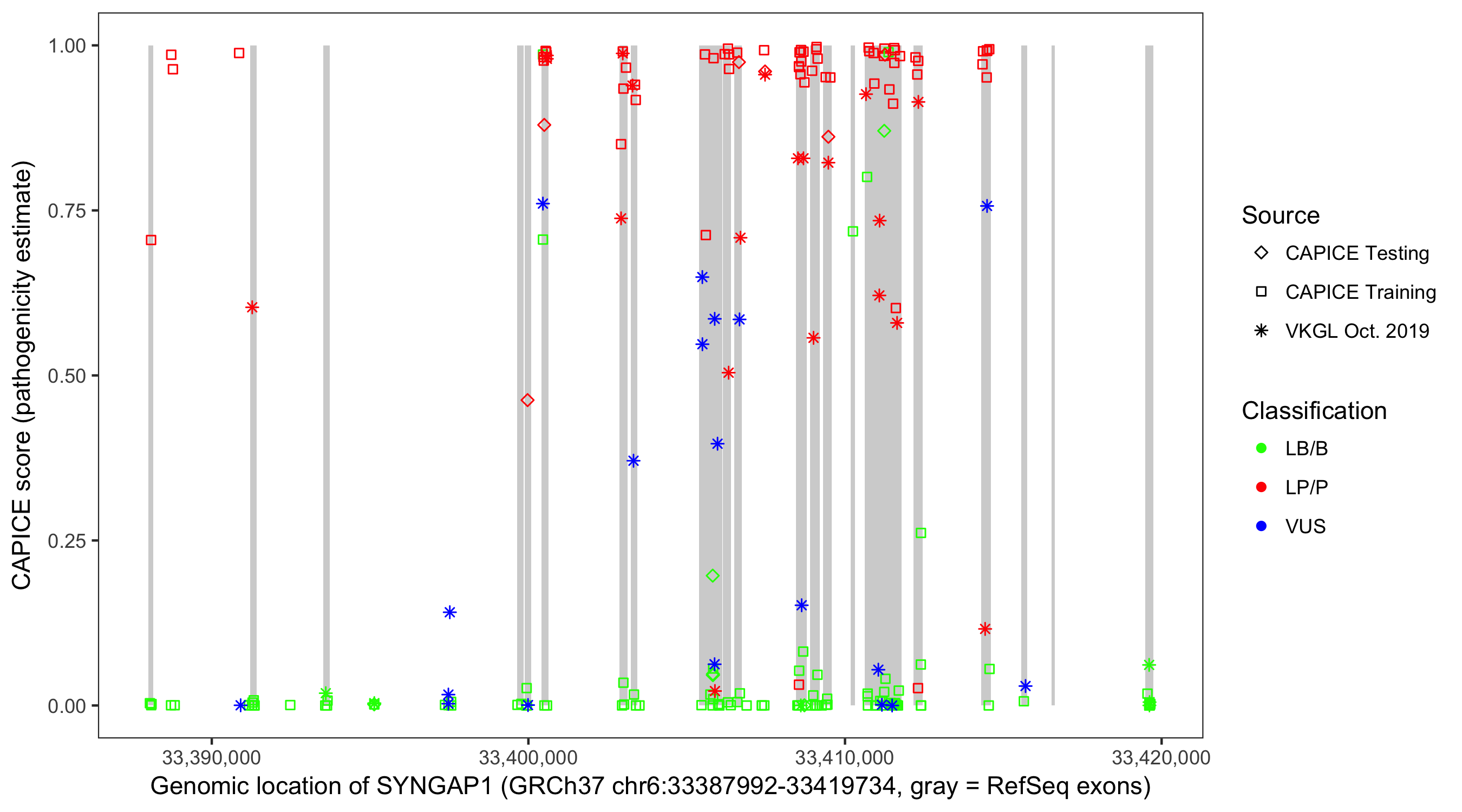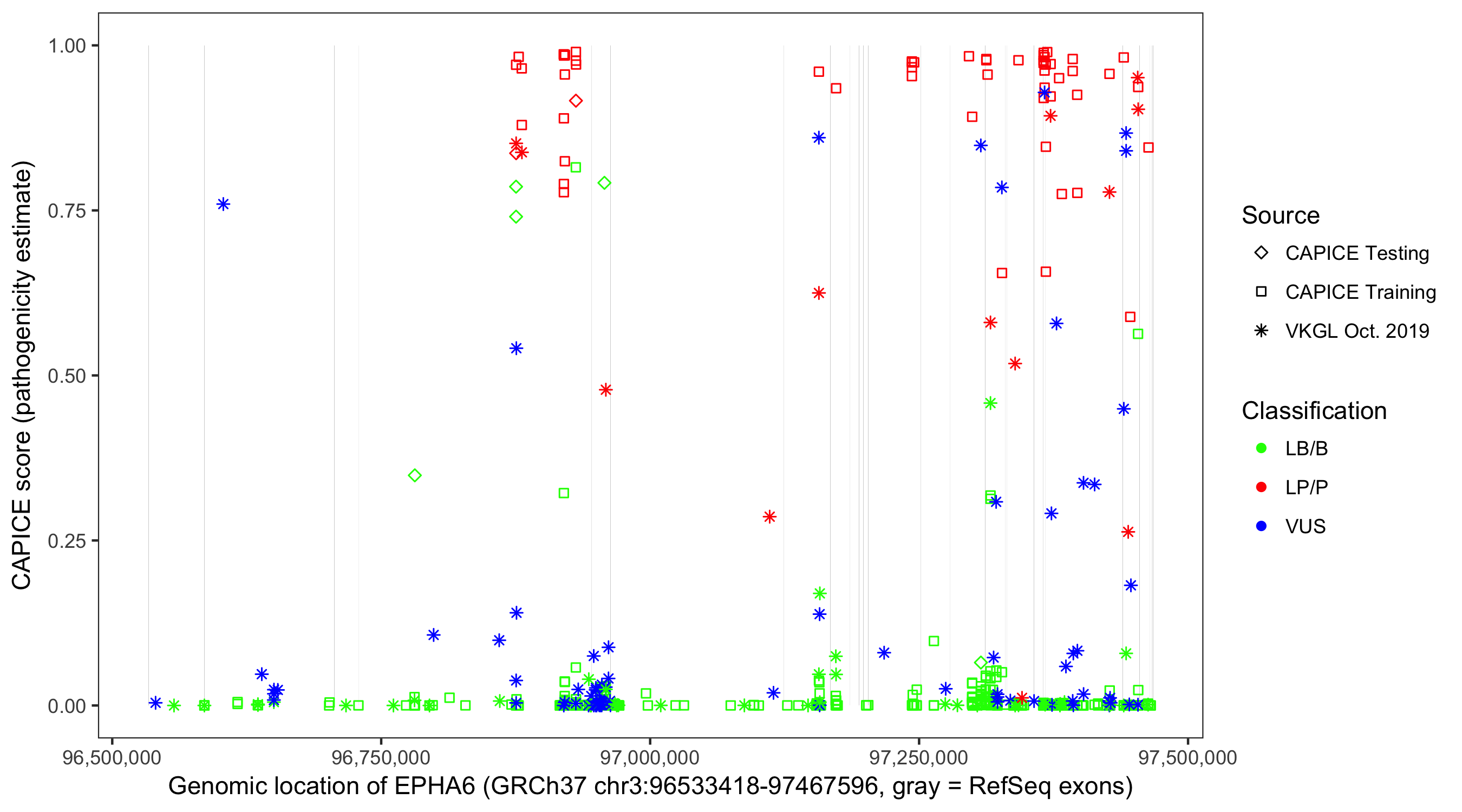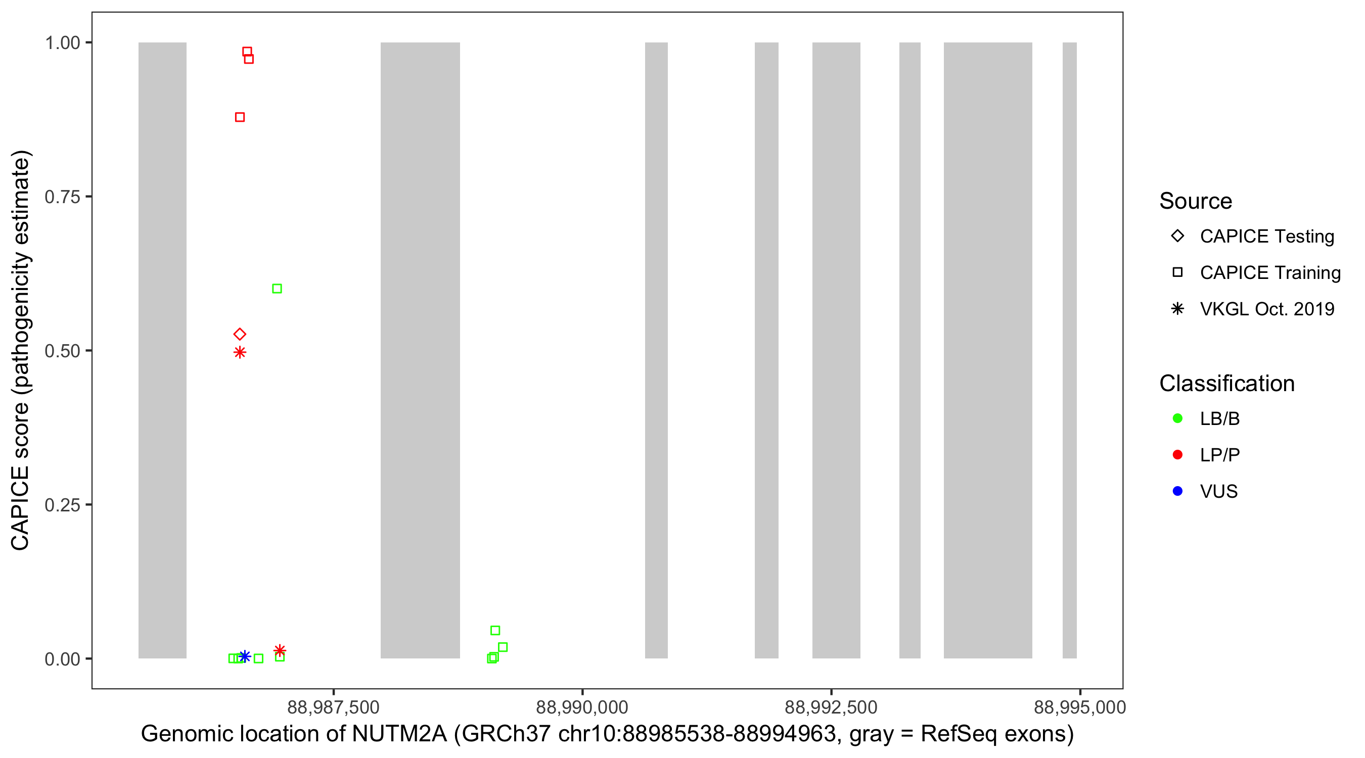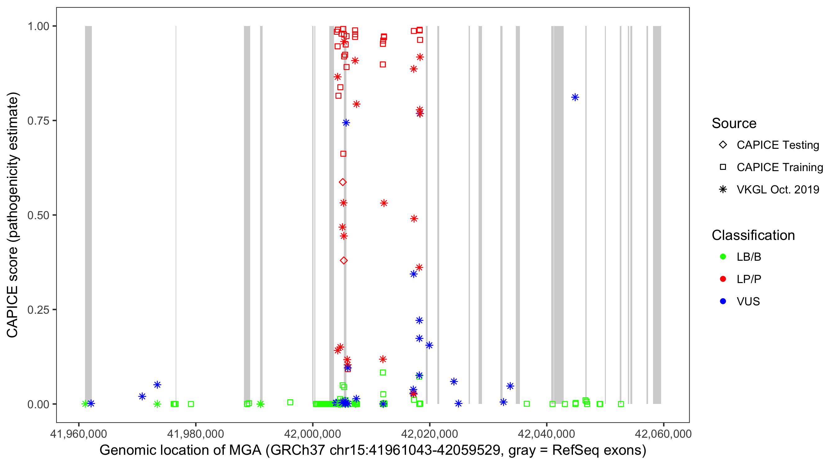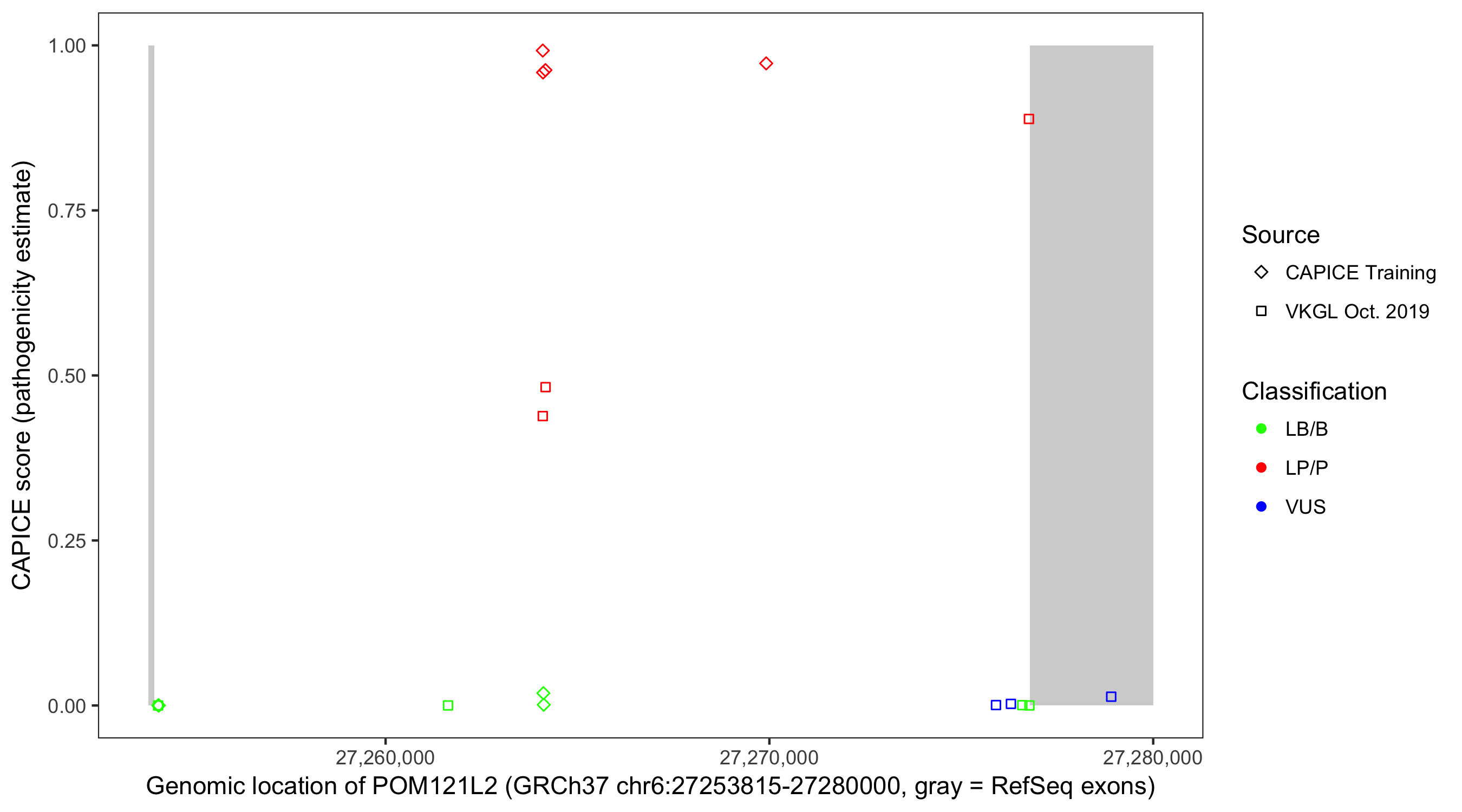 Shown are CAPICE train/test variants plus VKGL Oct 2019.