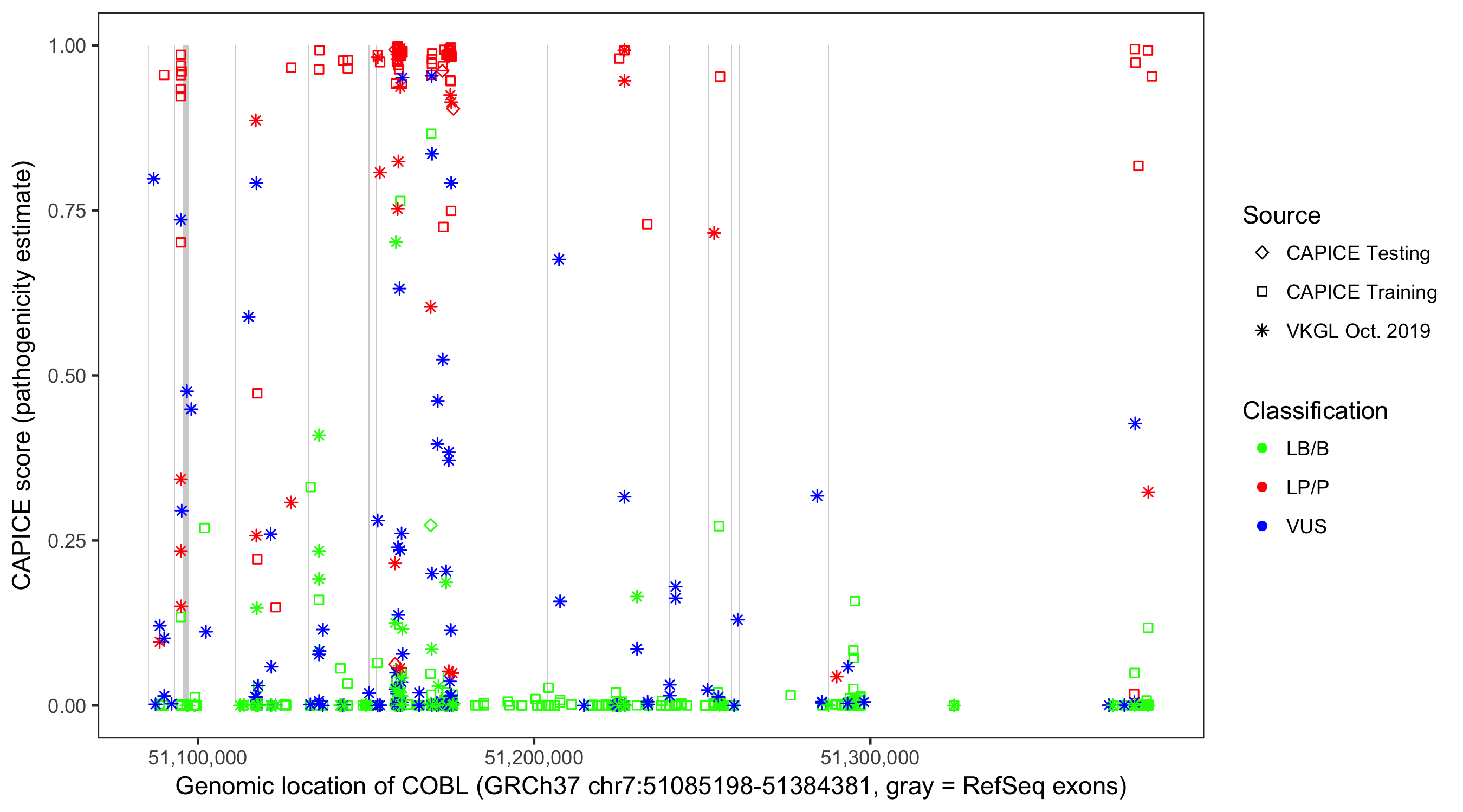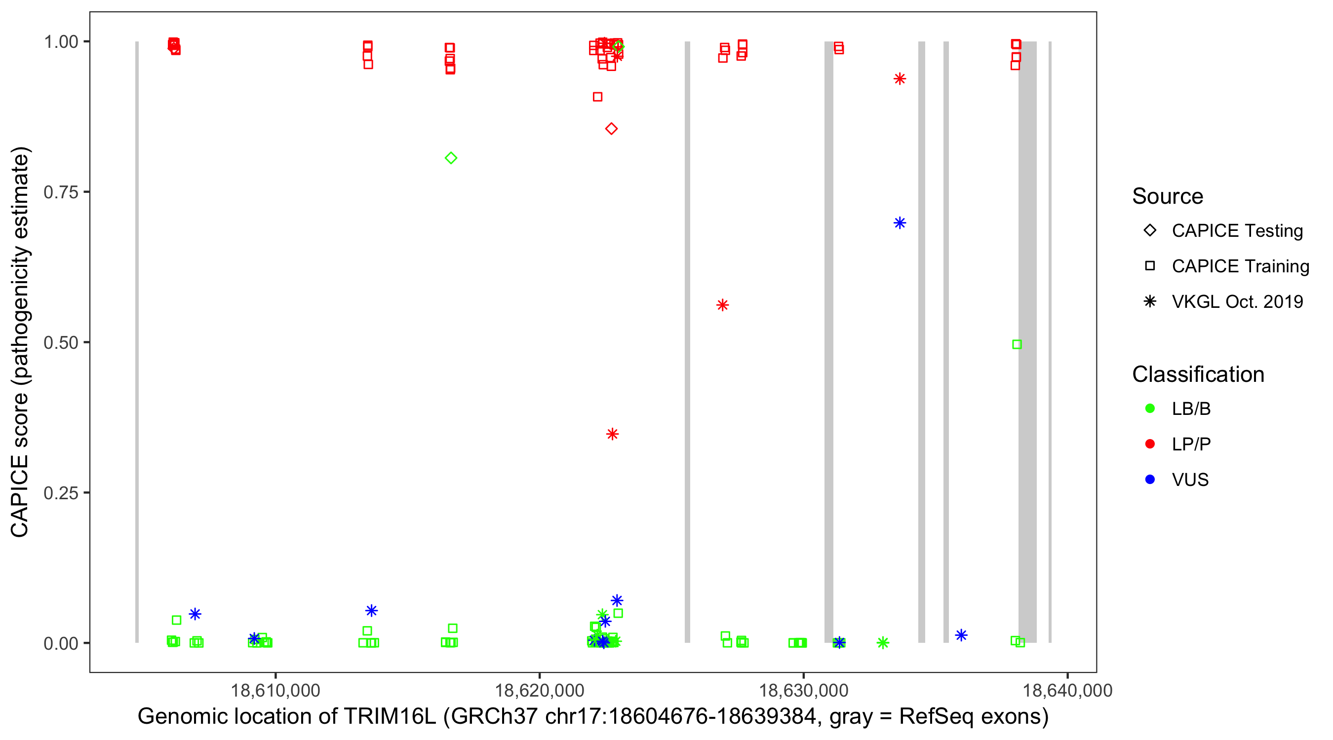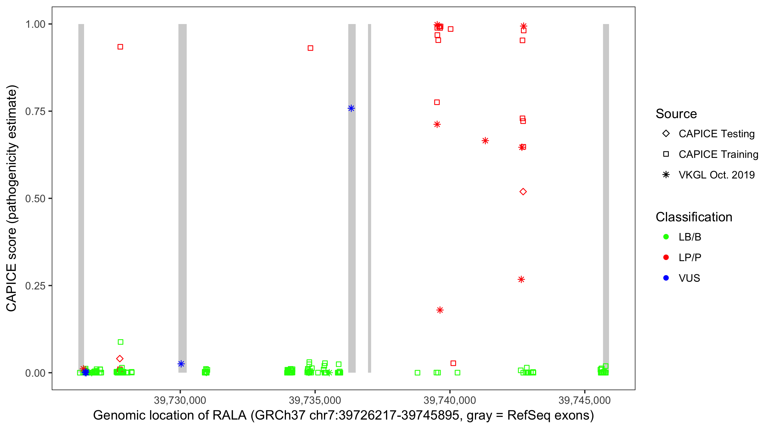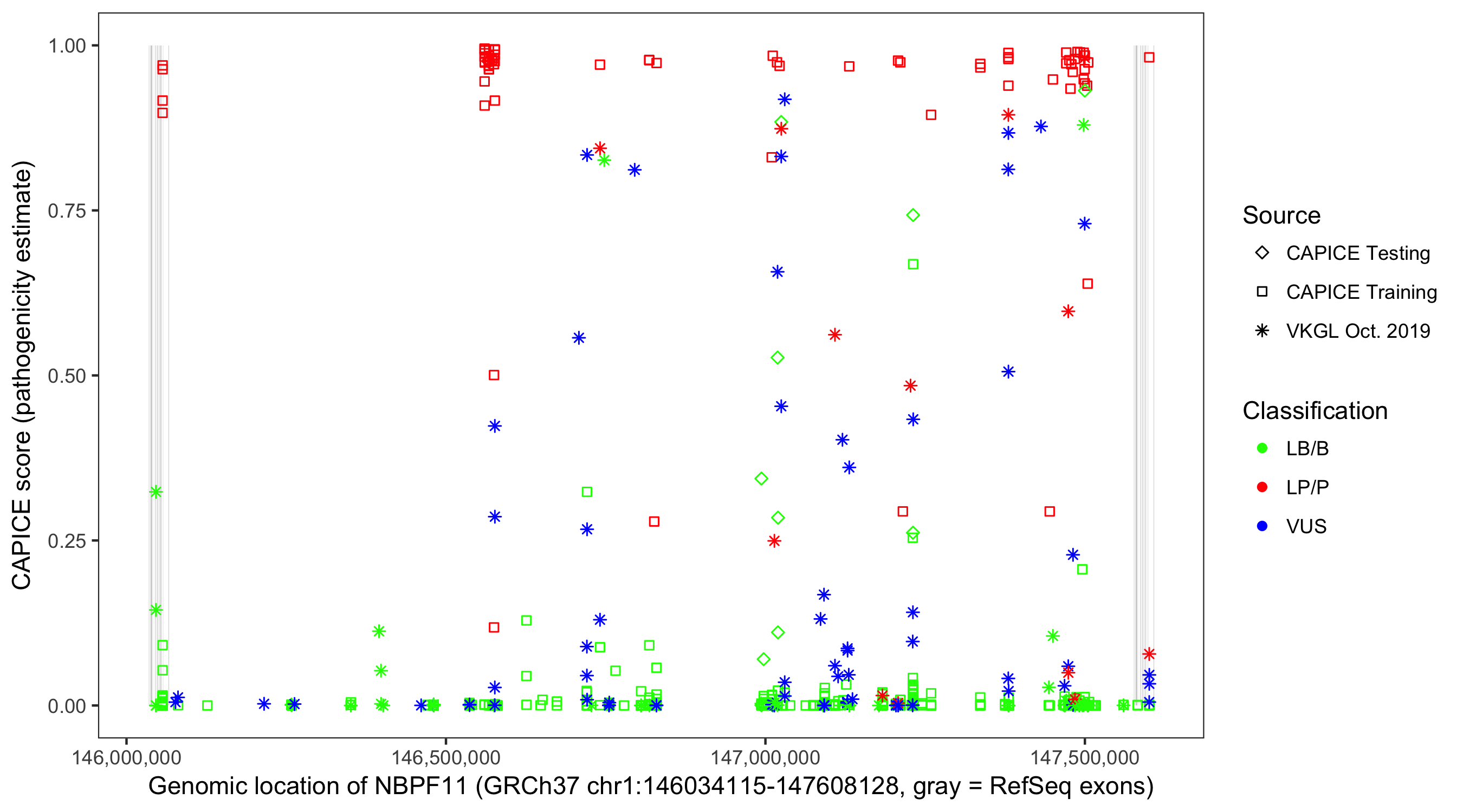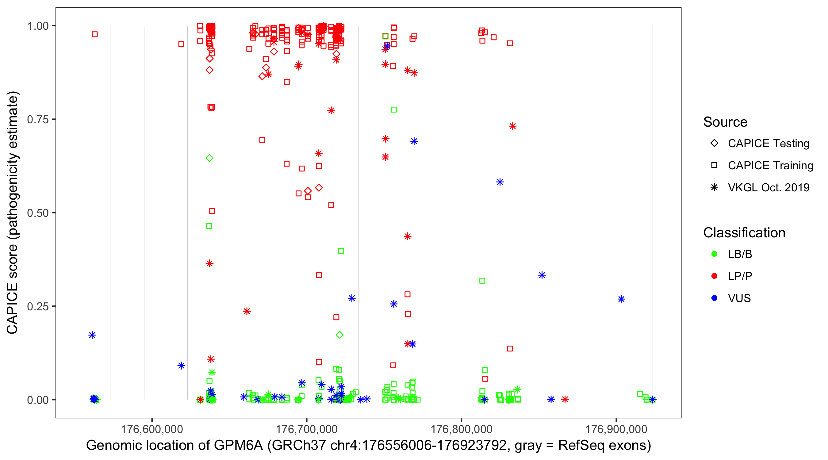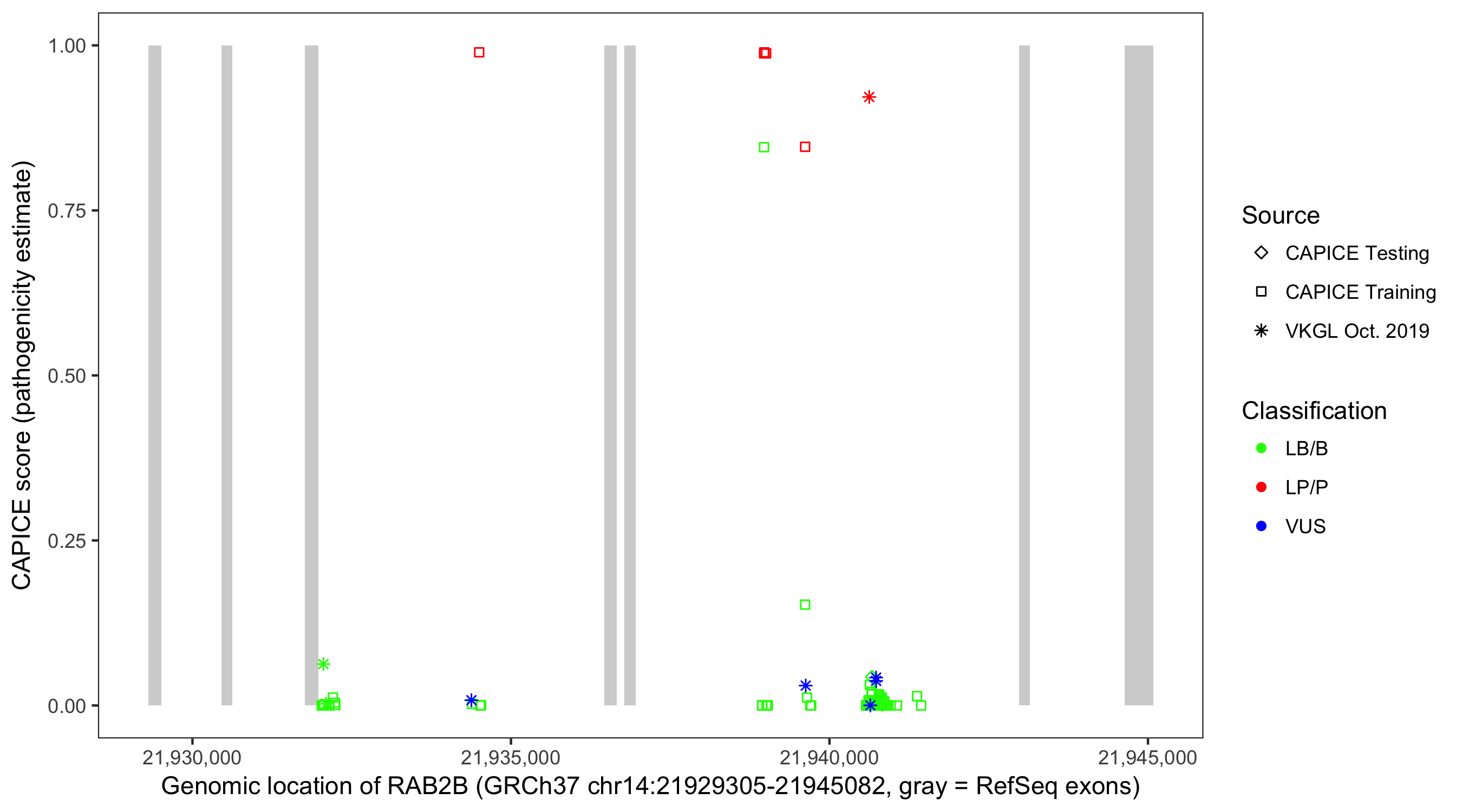 Shown are CAPICE train/test variants plus VKGL Oct 2019.