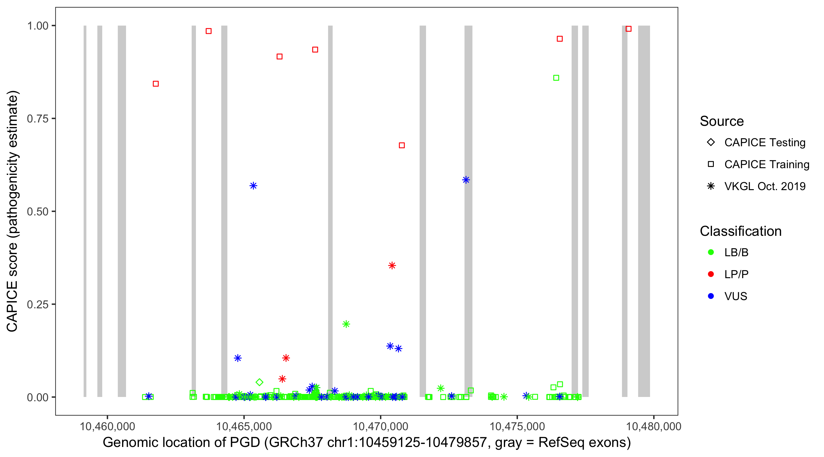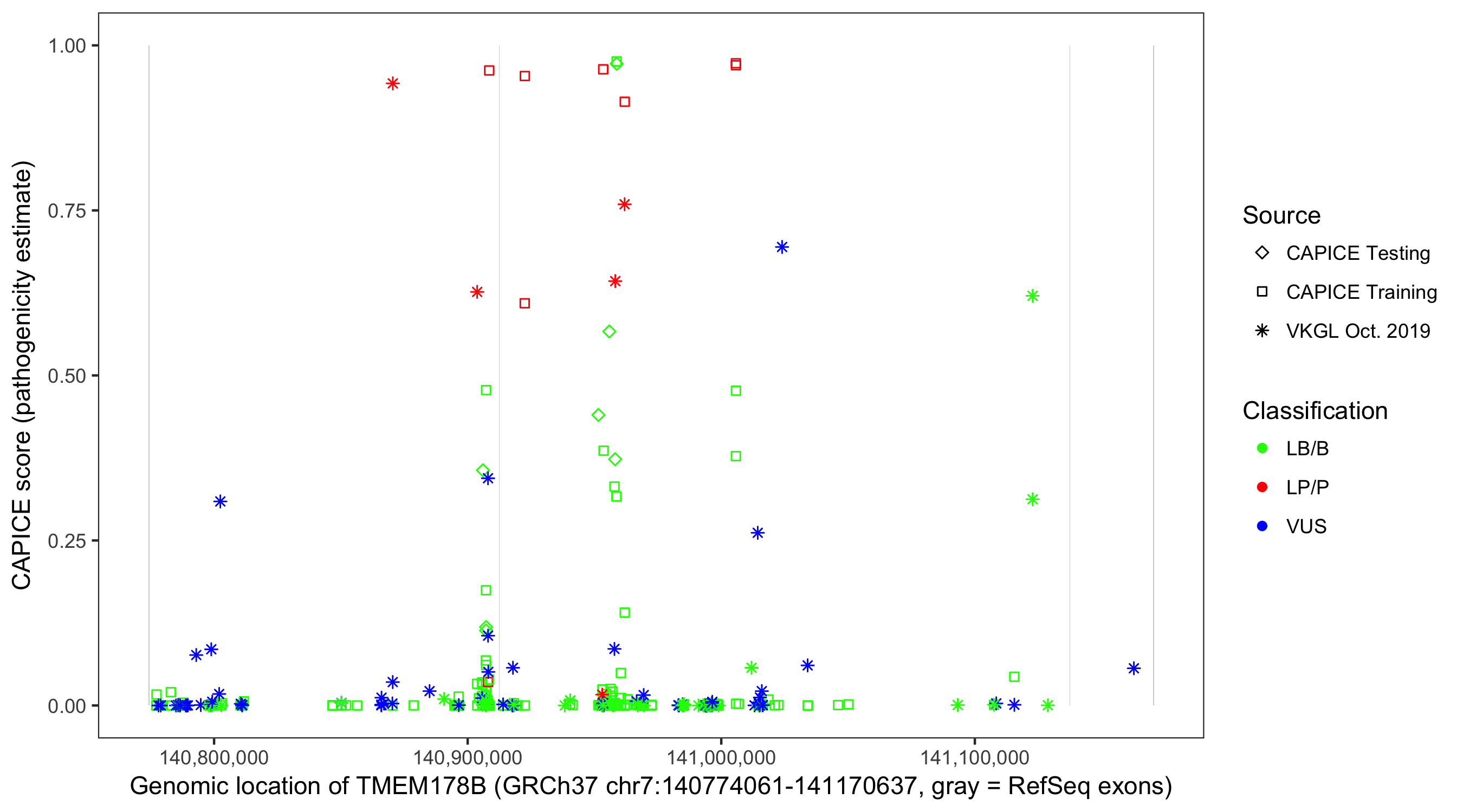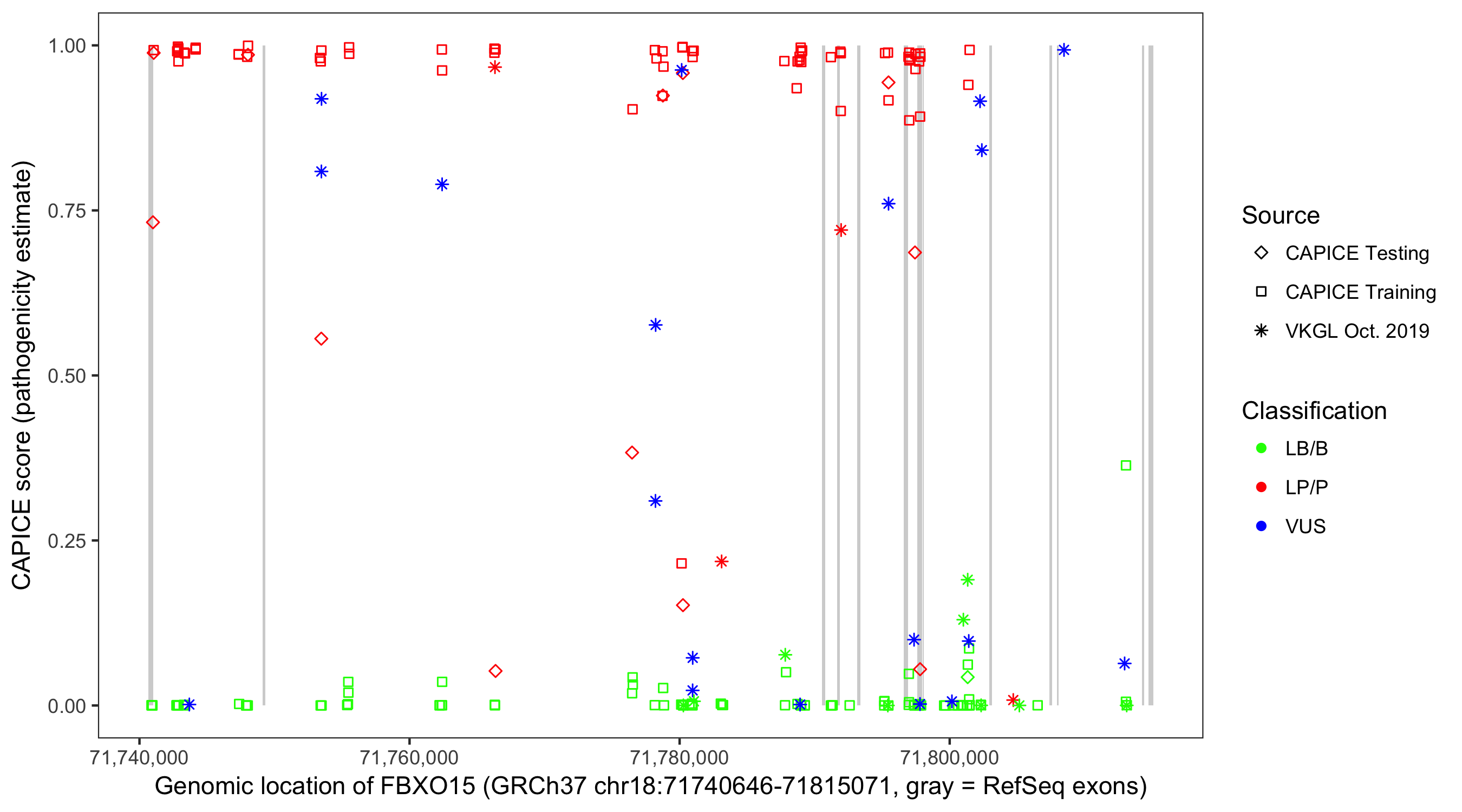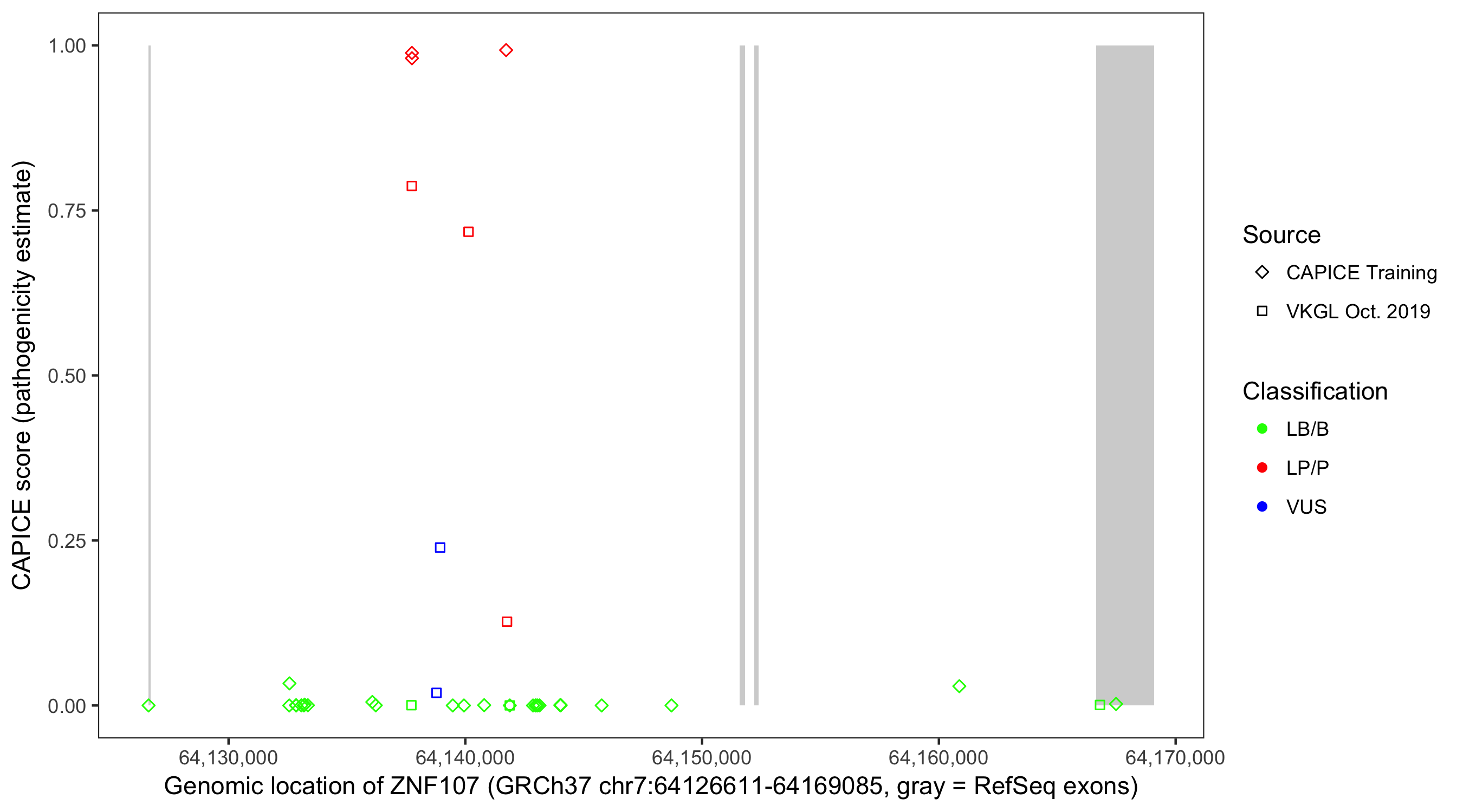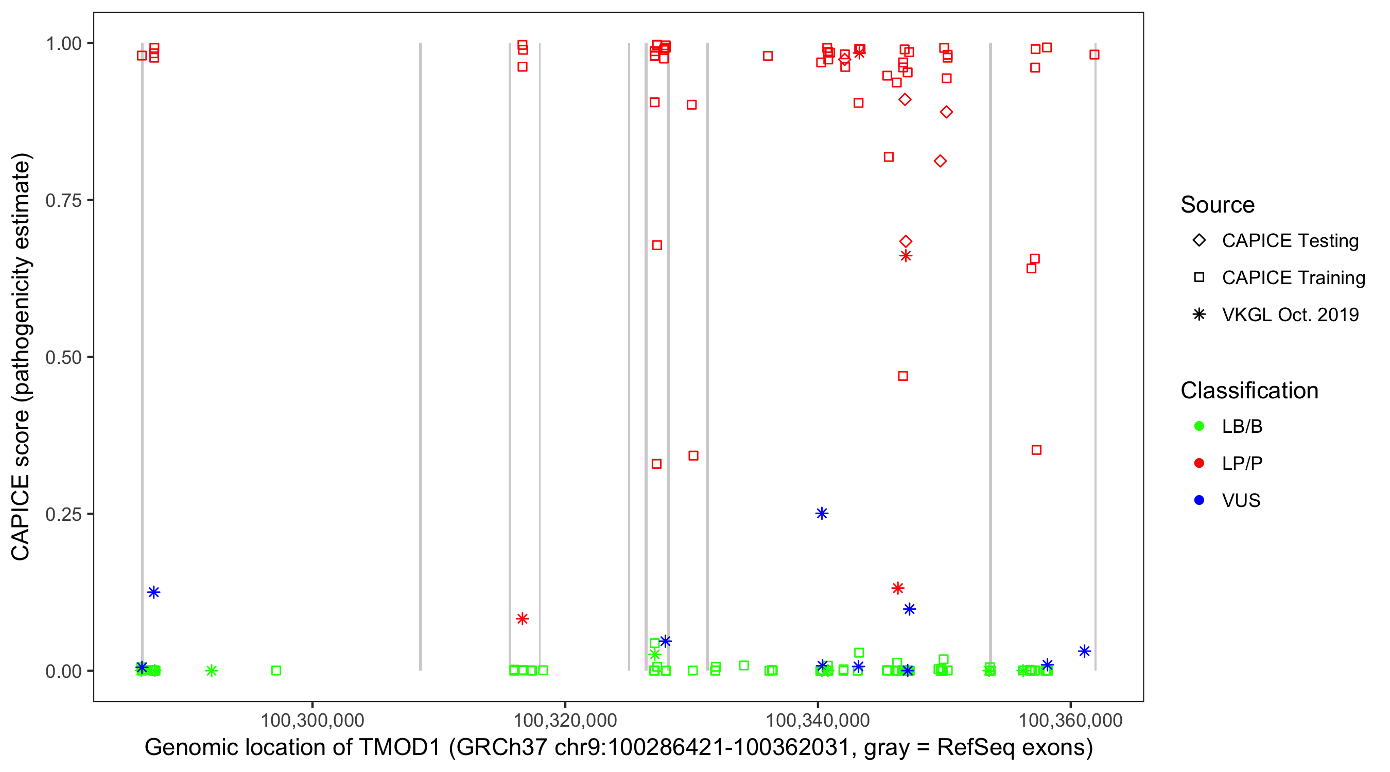 Shown are CAPICE train/test variants plus VKGL Oct 2019.