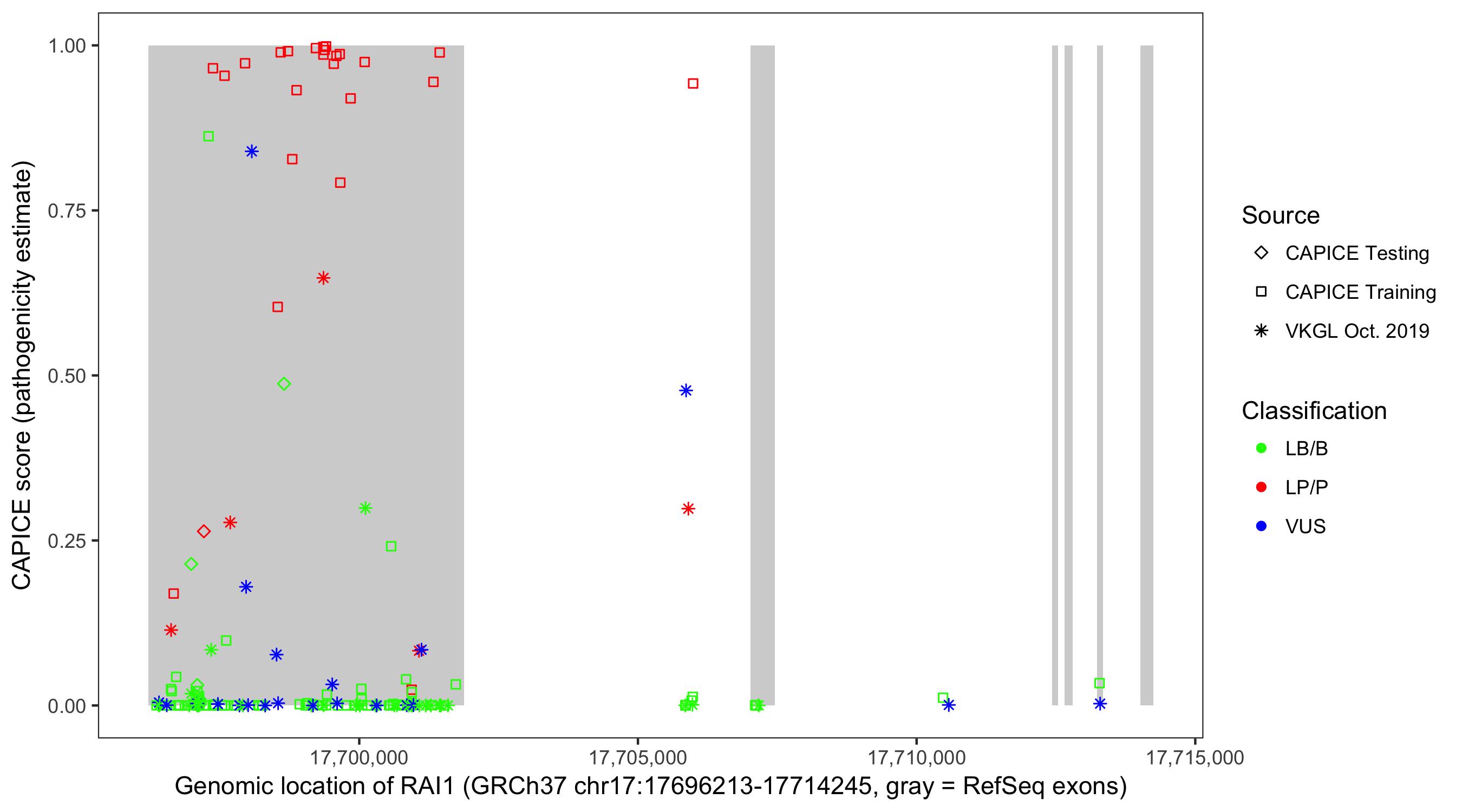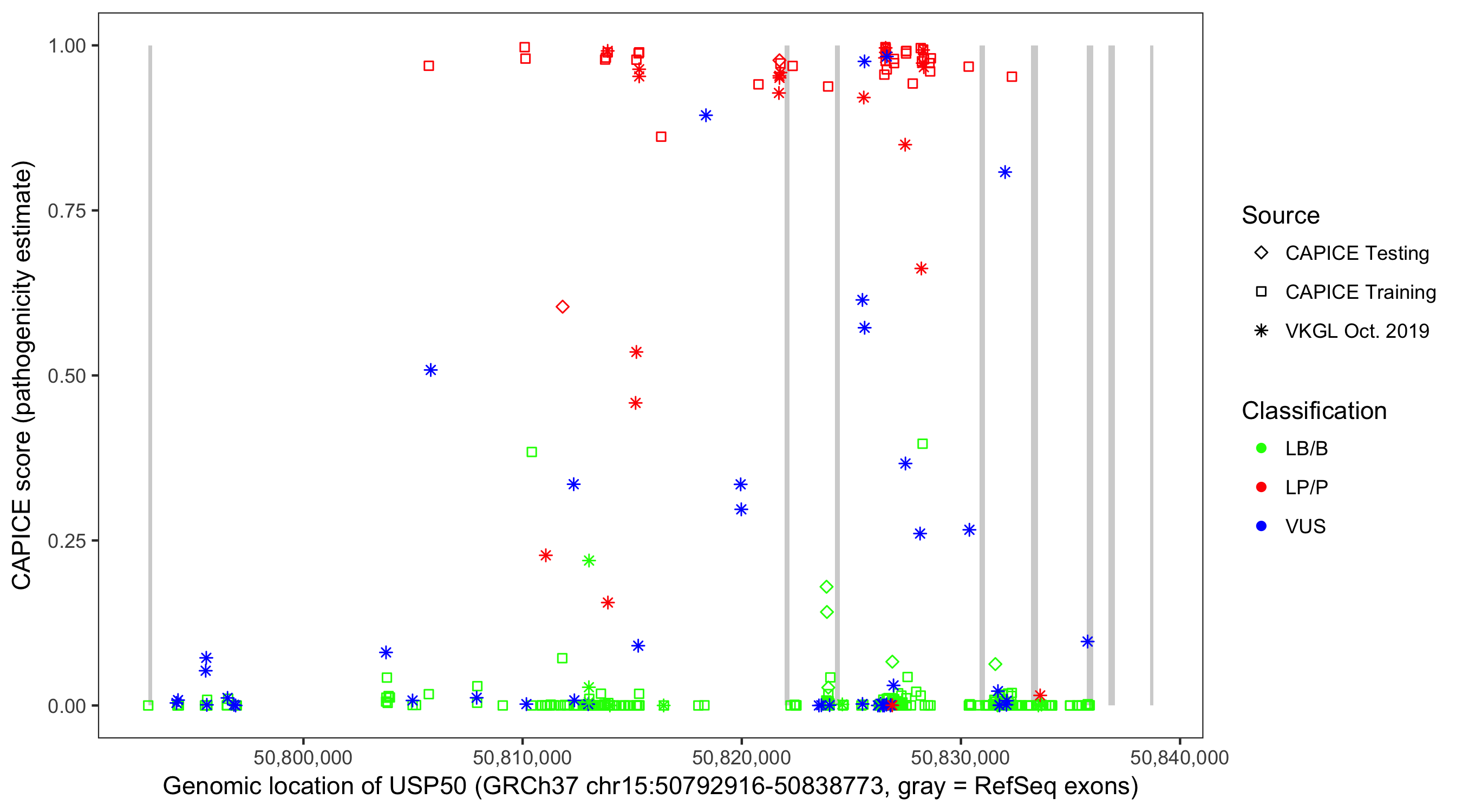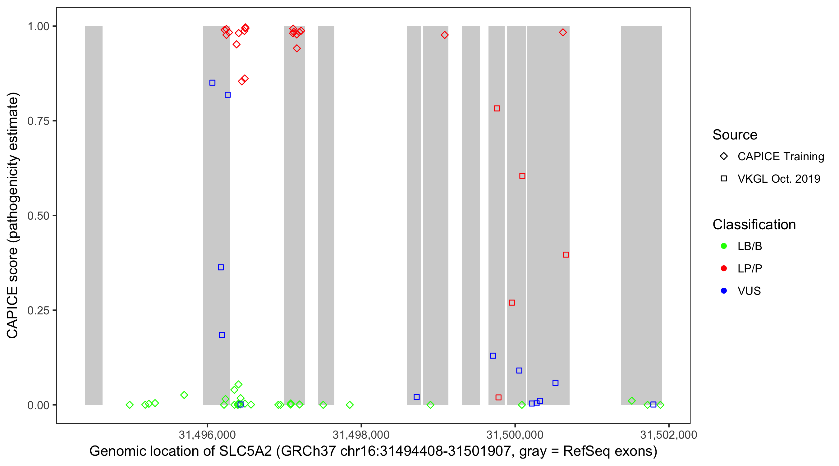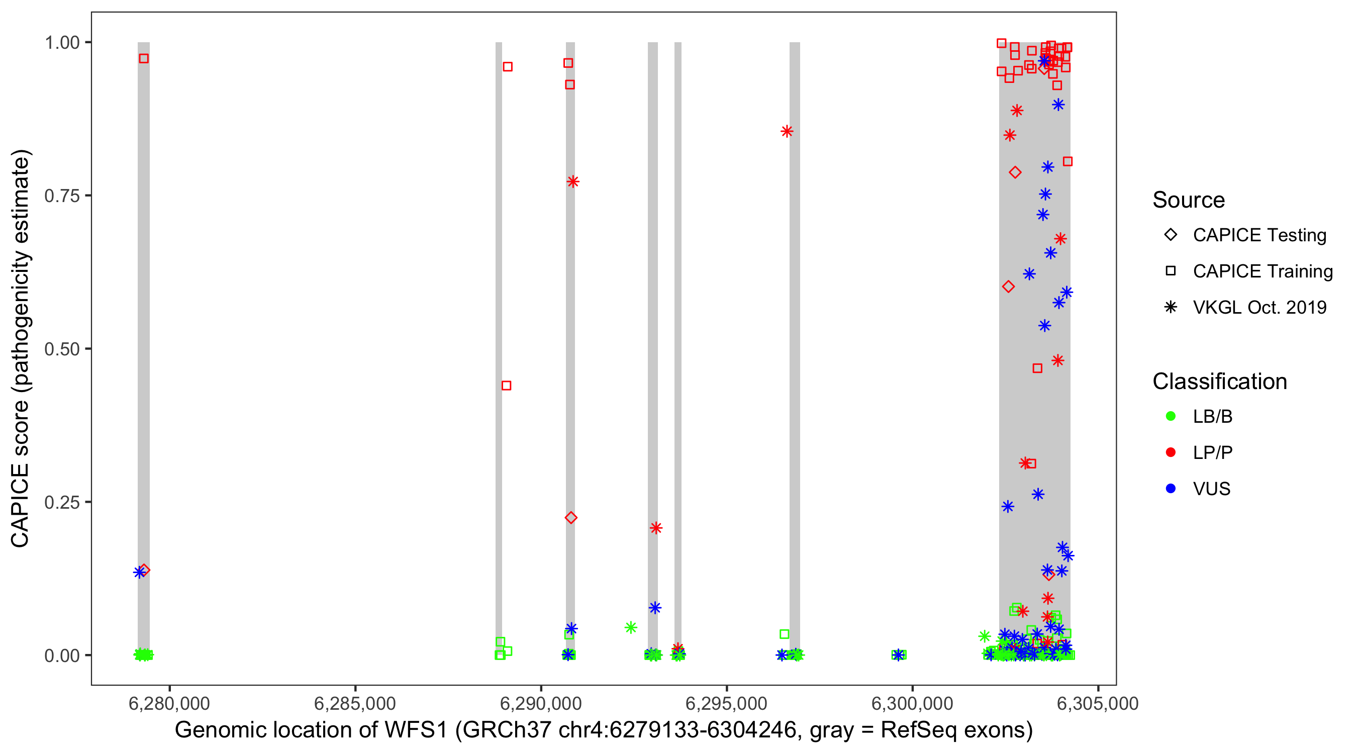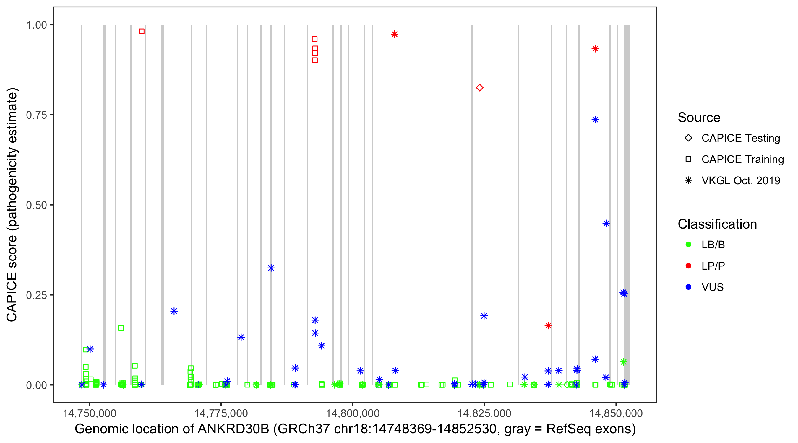 Shown are CAPICE train/test variants plus VKGL Oct 2019.