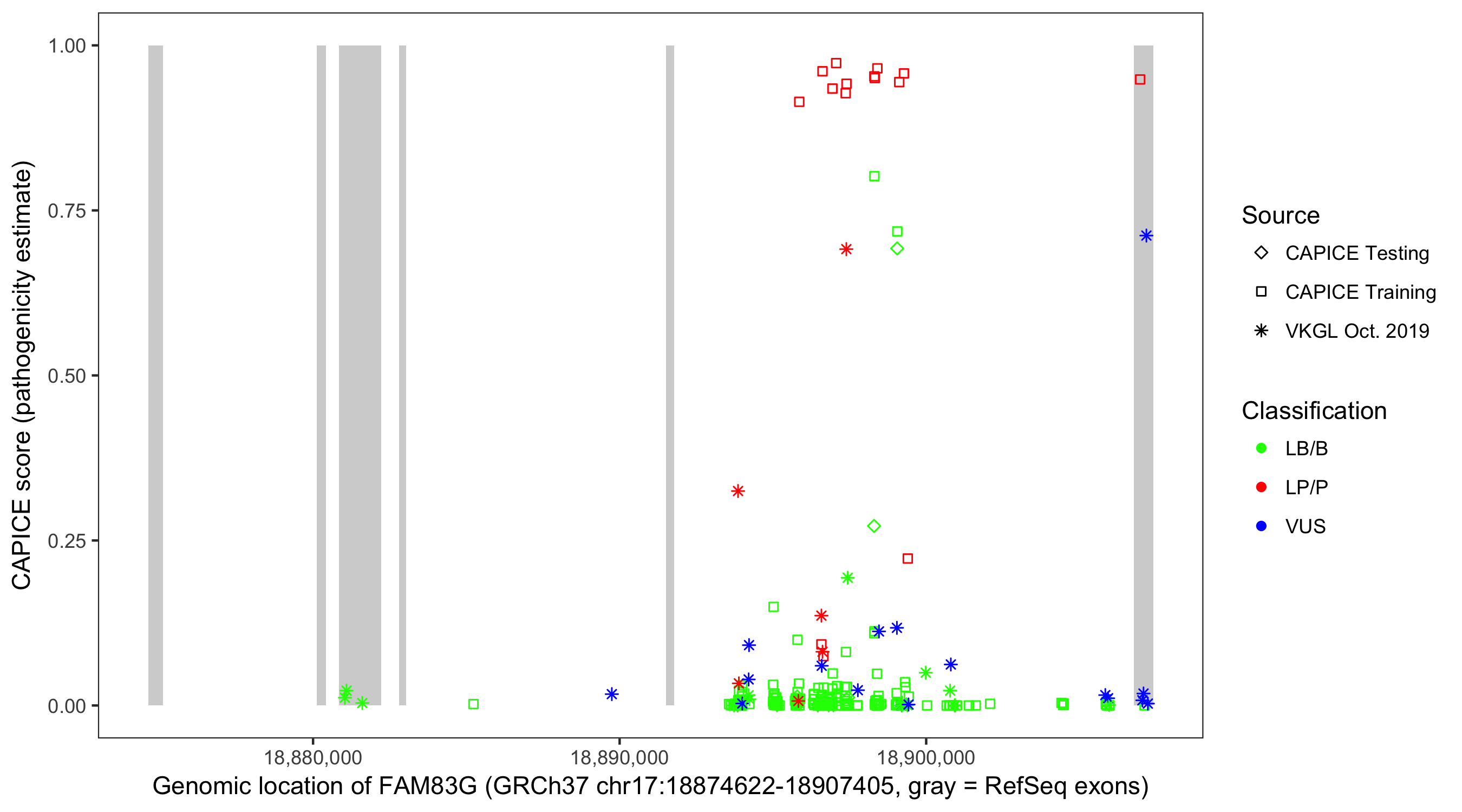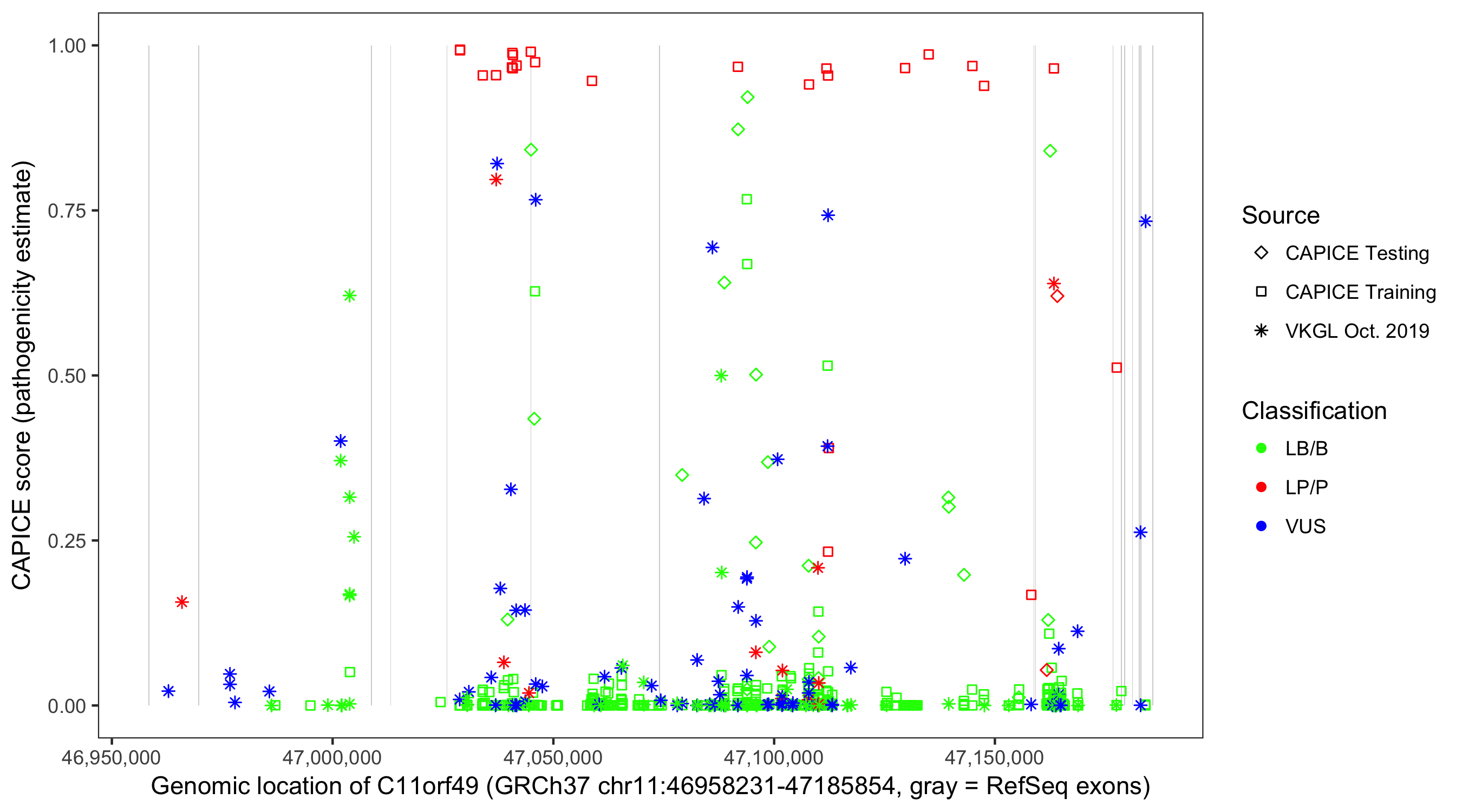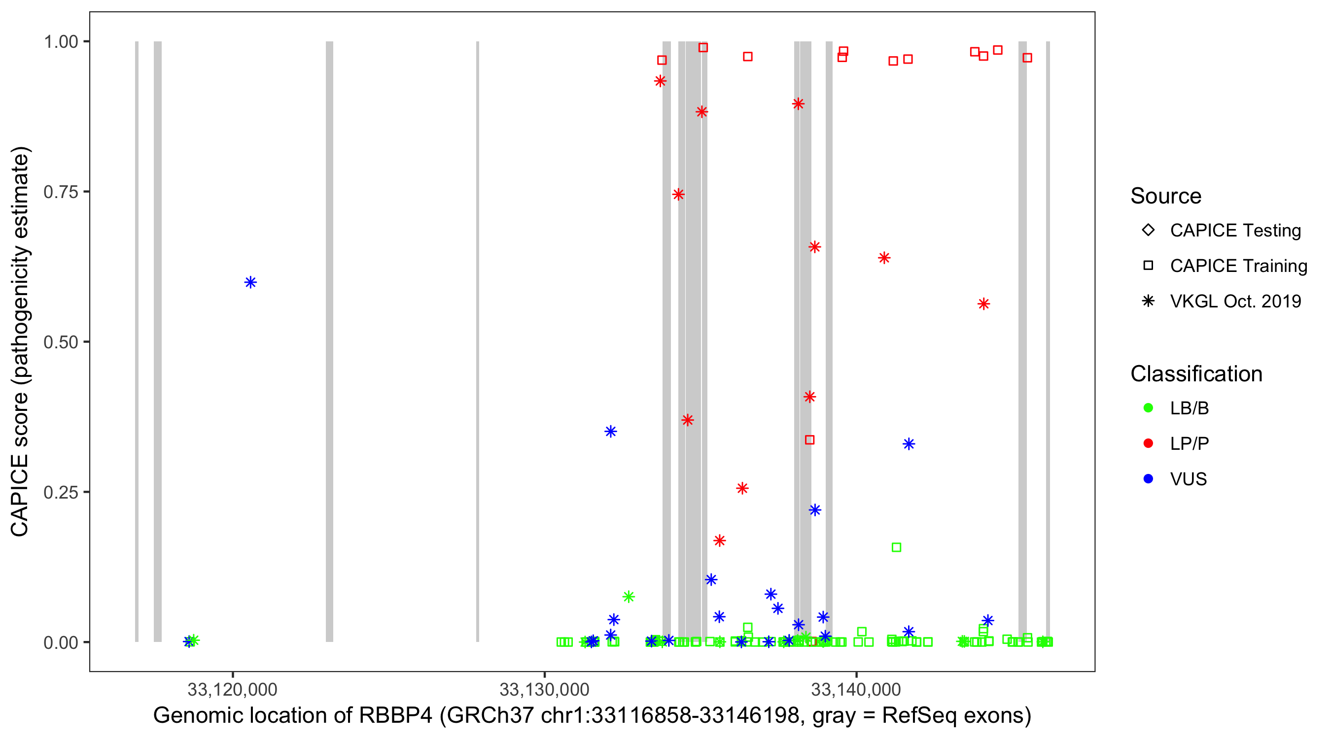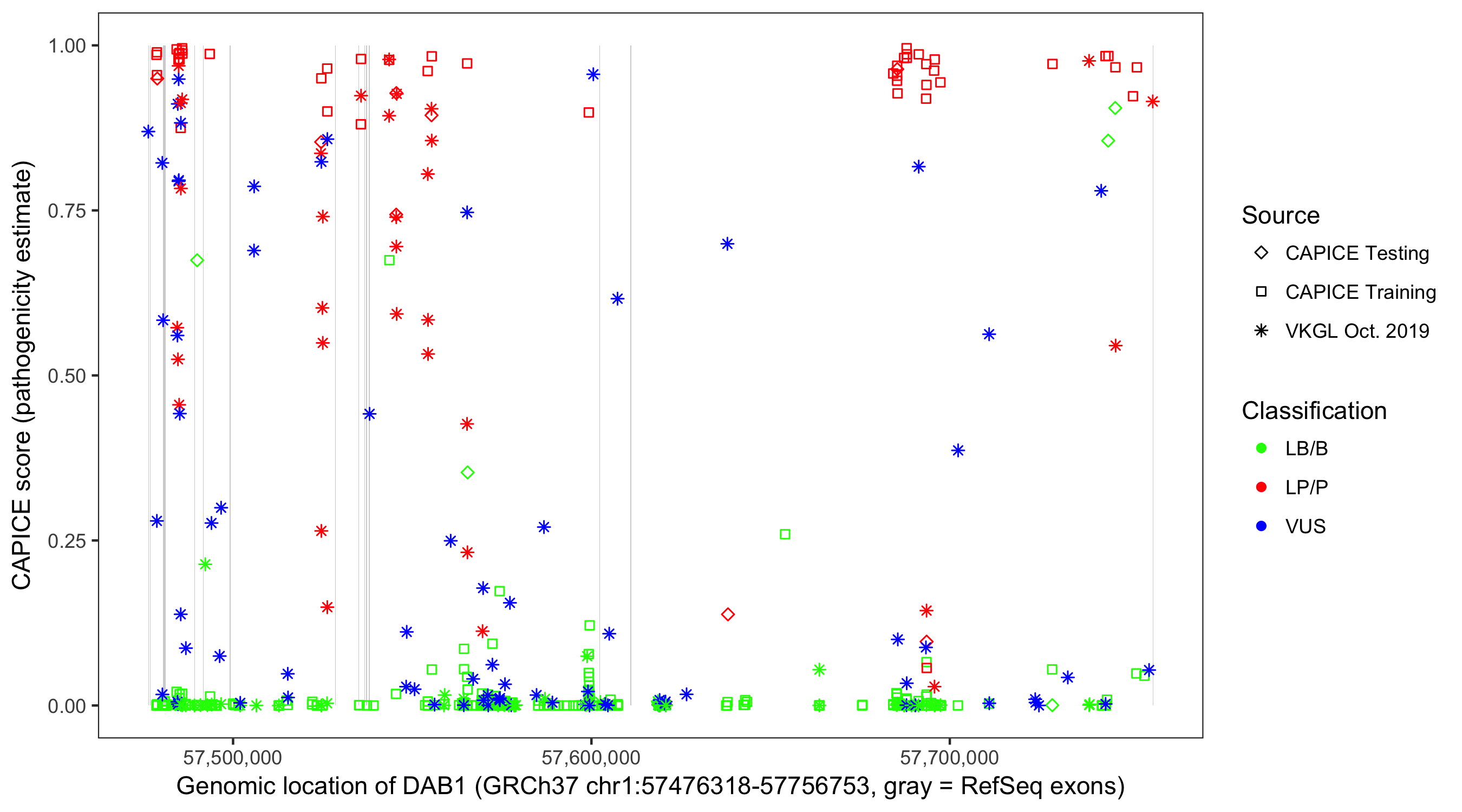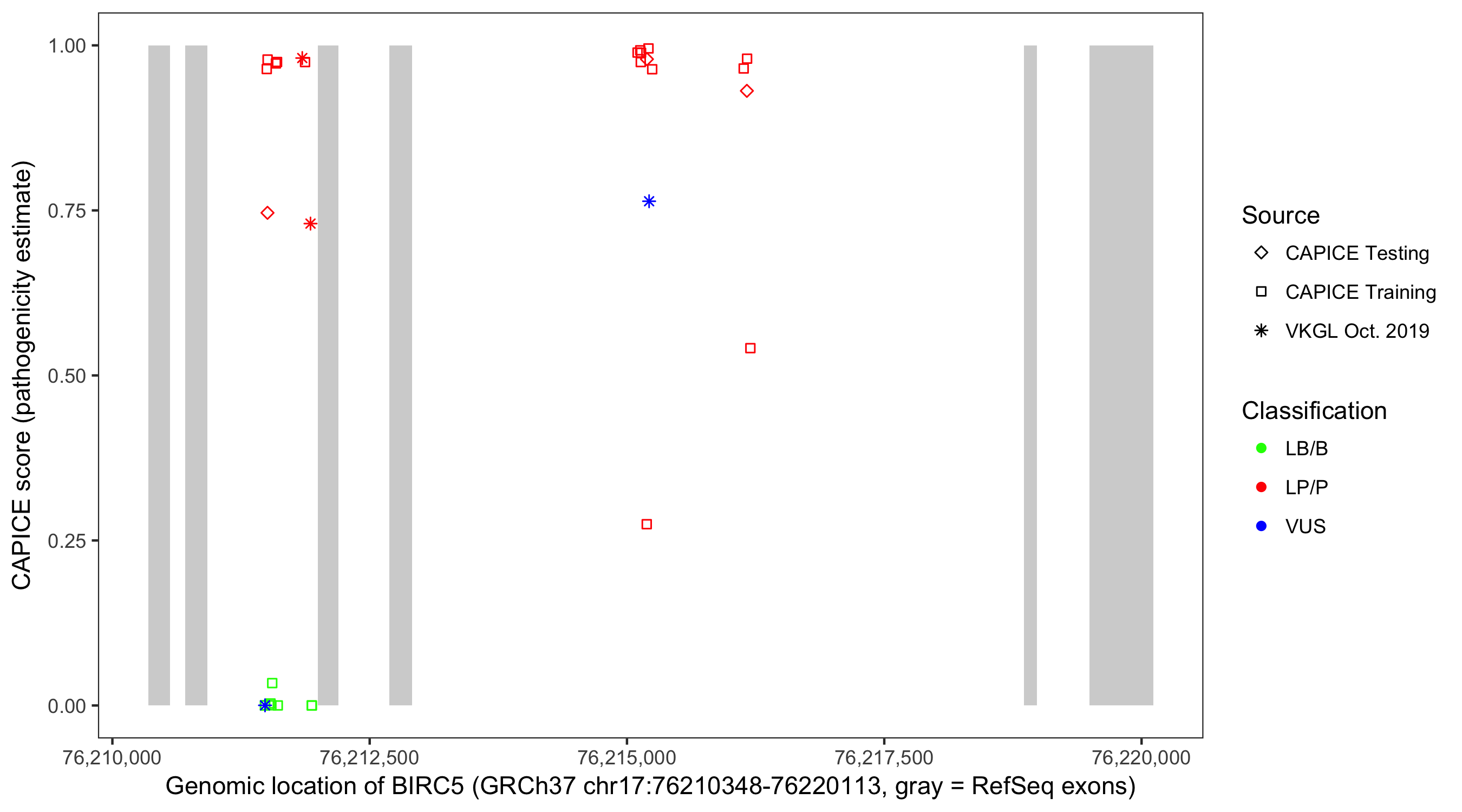 Shown are CAPICE train/test variants plus VKGL Oct 2019.