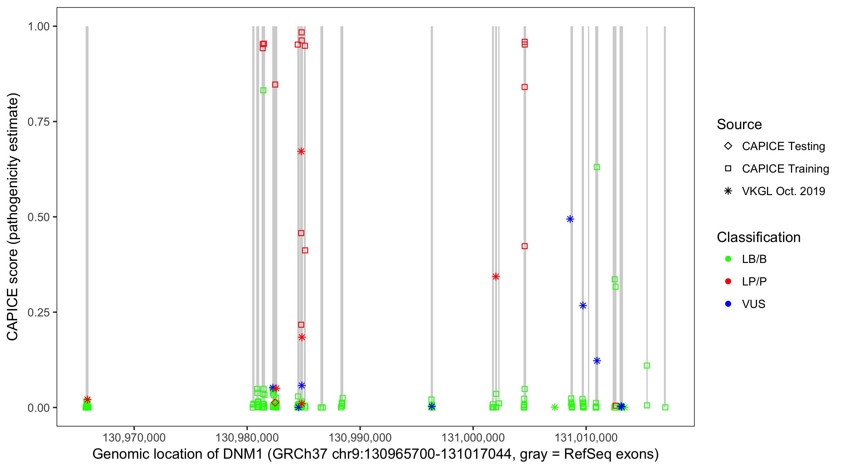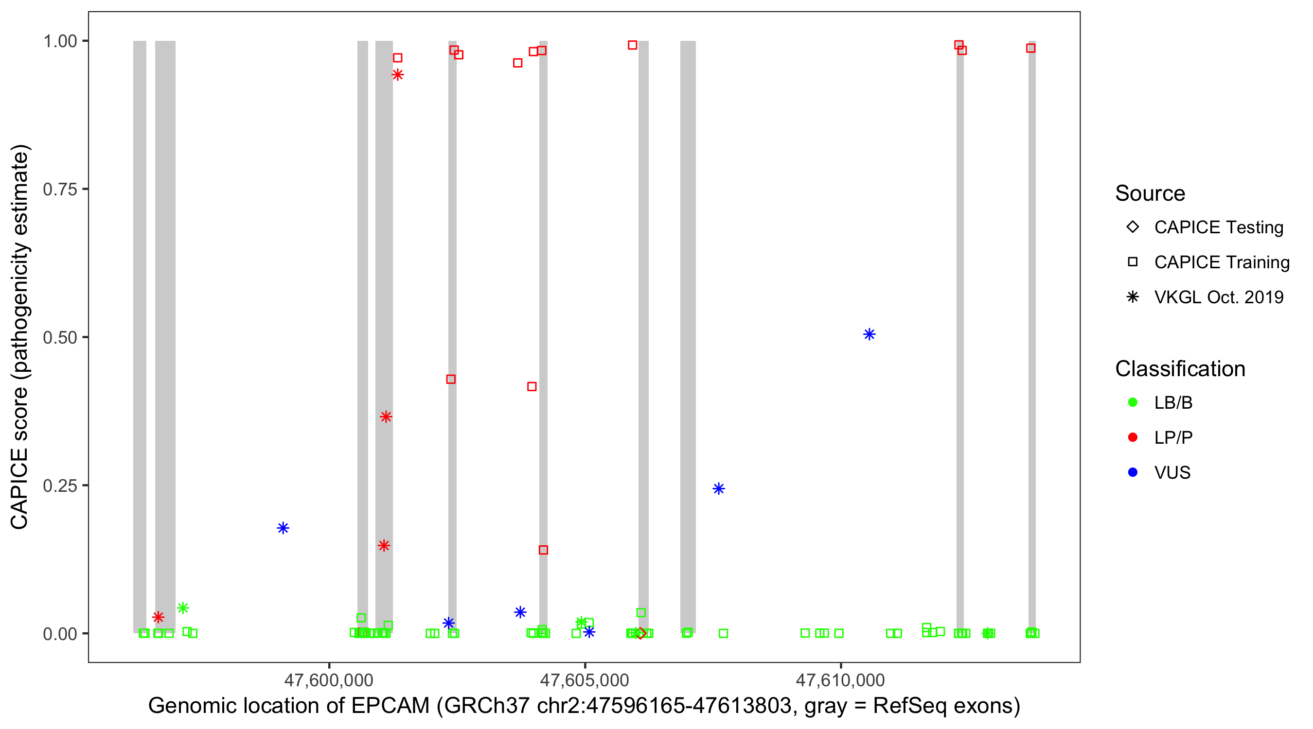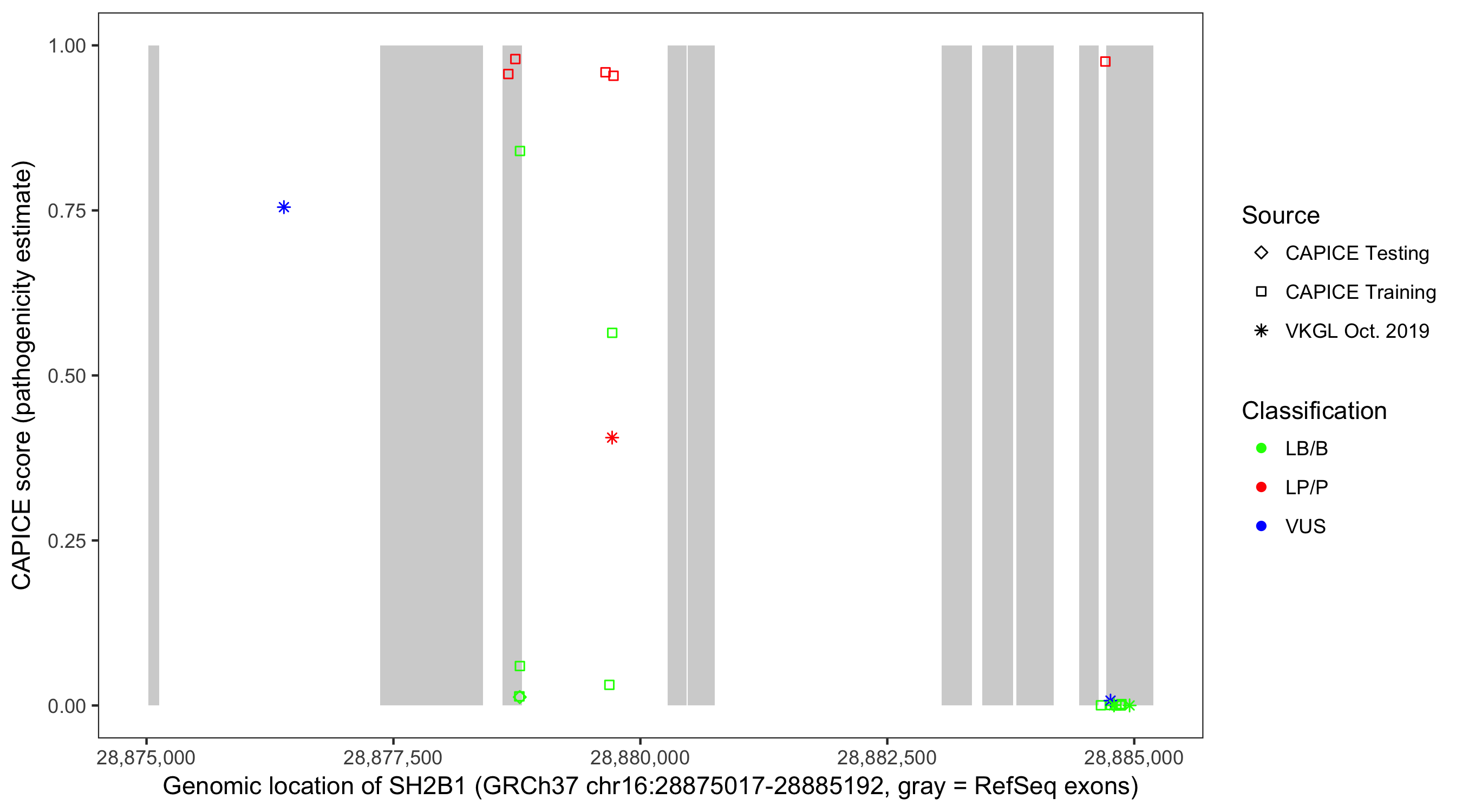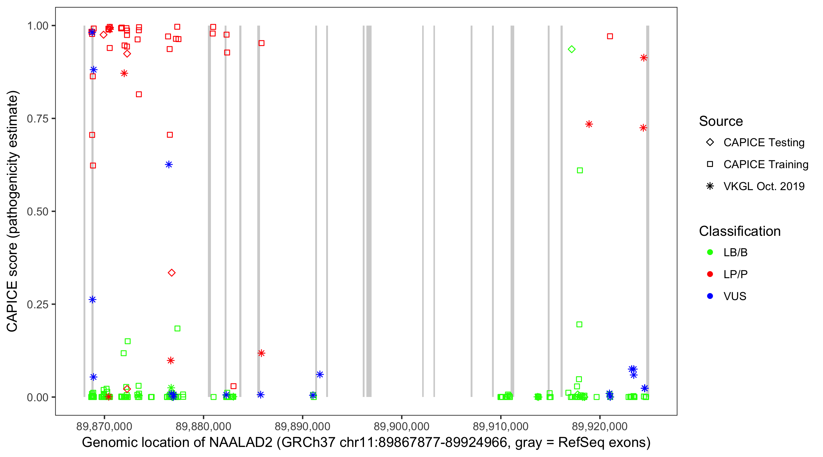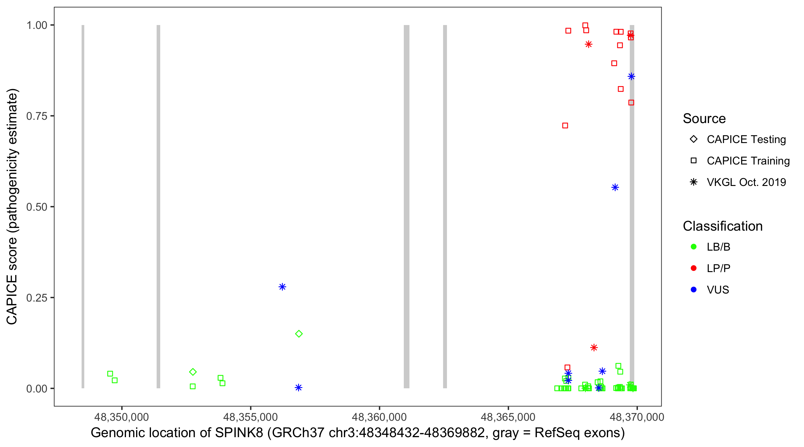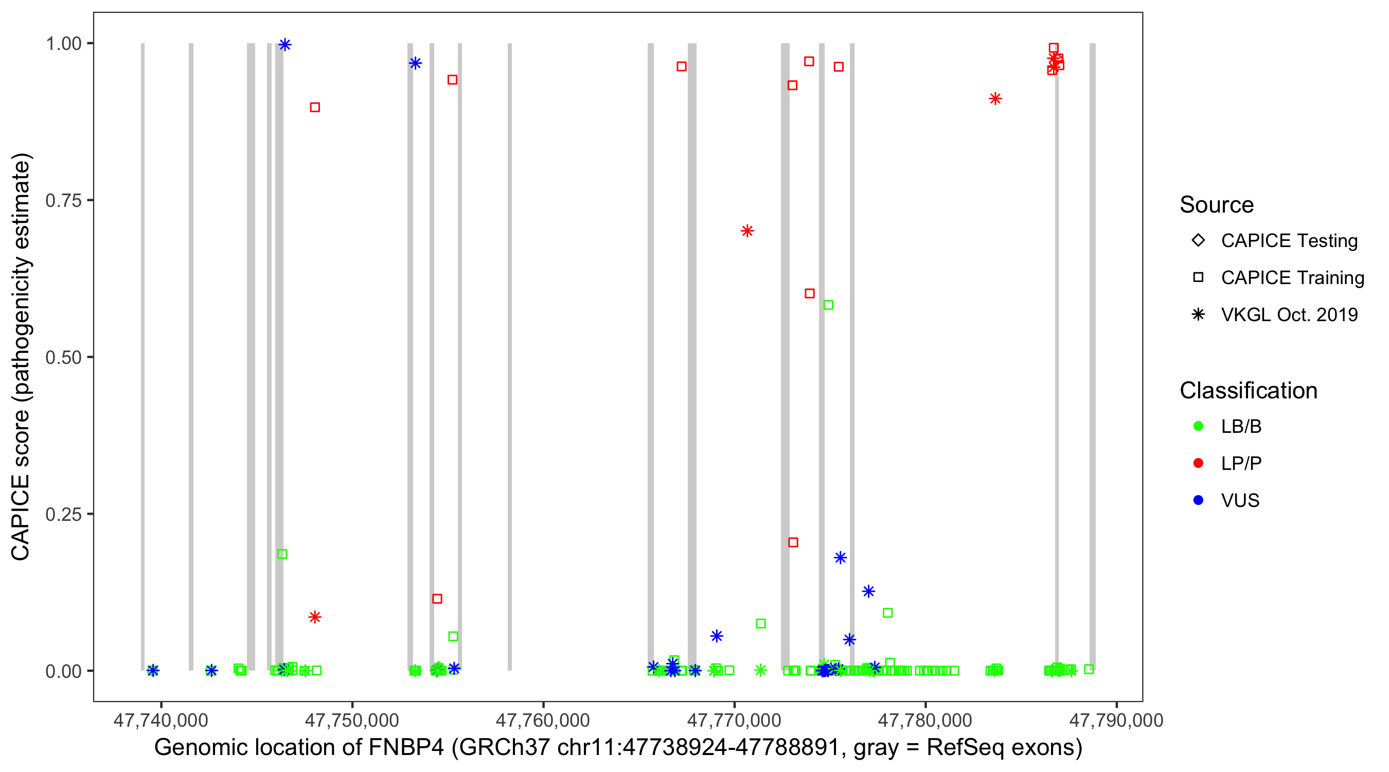 Shown are CAPICE train/test variants plus VKGL Oct 2019.