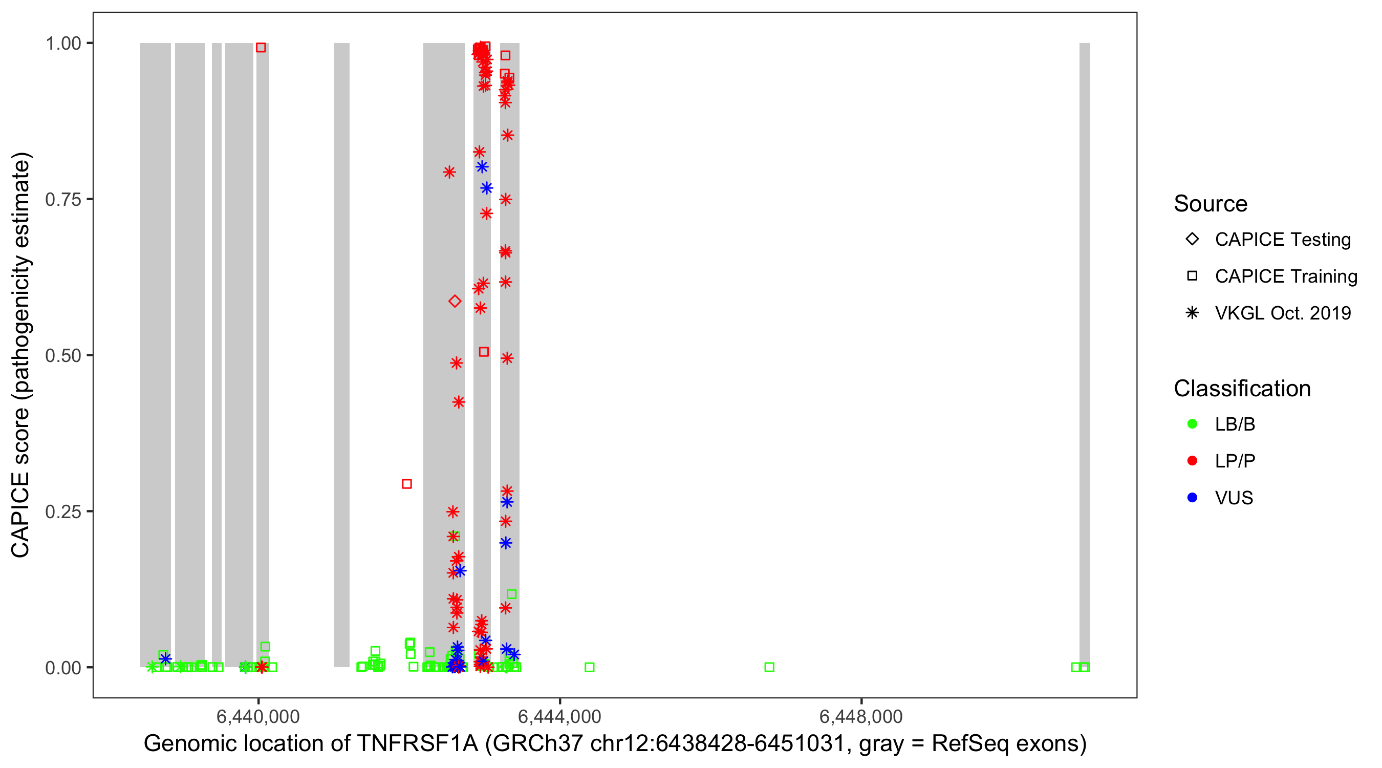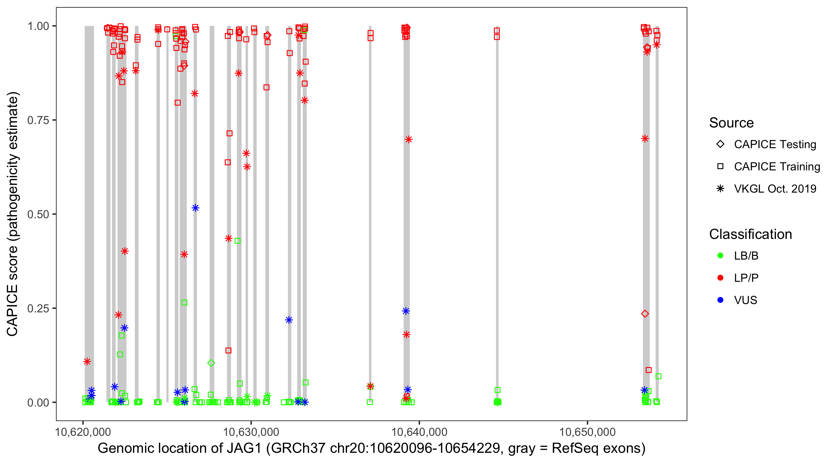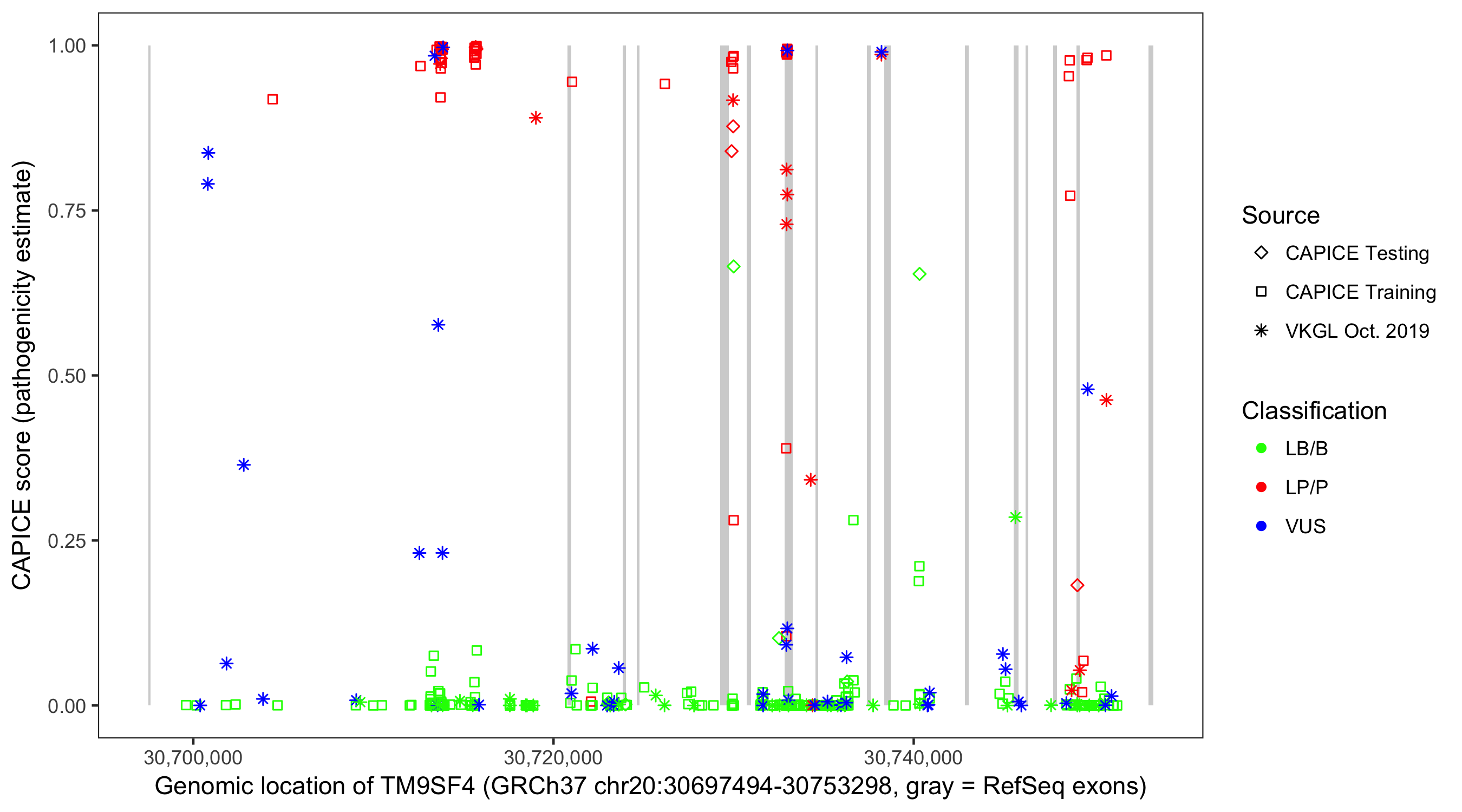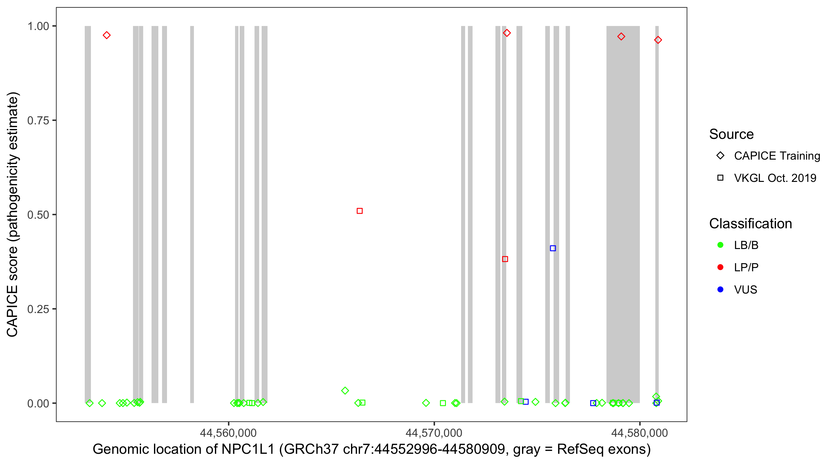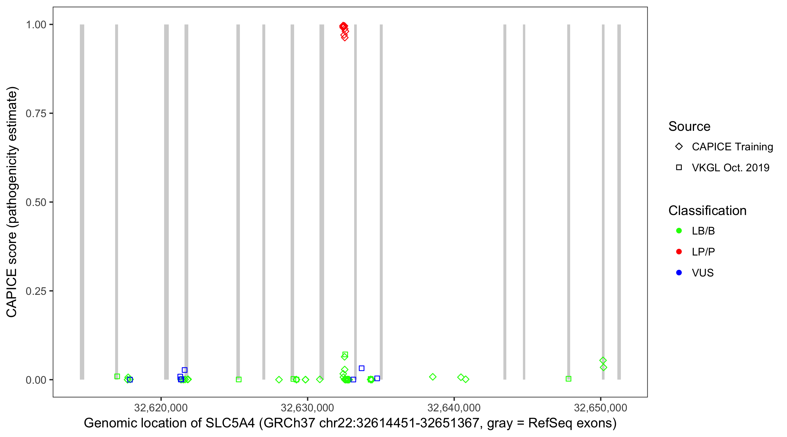 Shown are CAPICE train/test variants plus VKGL Oct 2019.