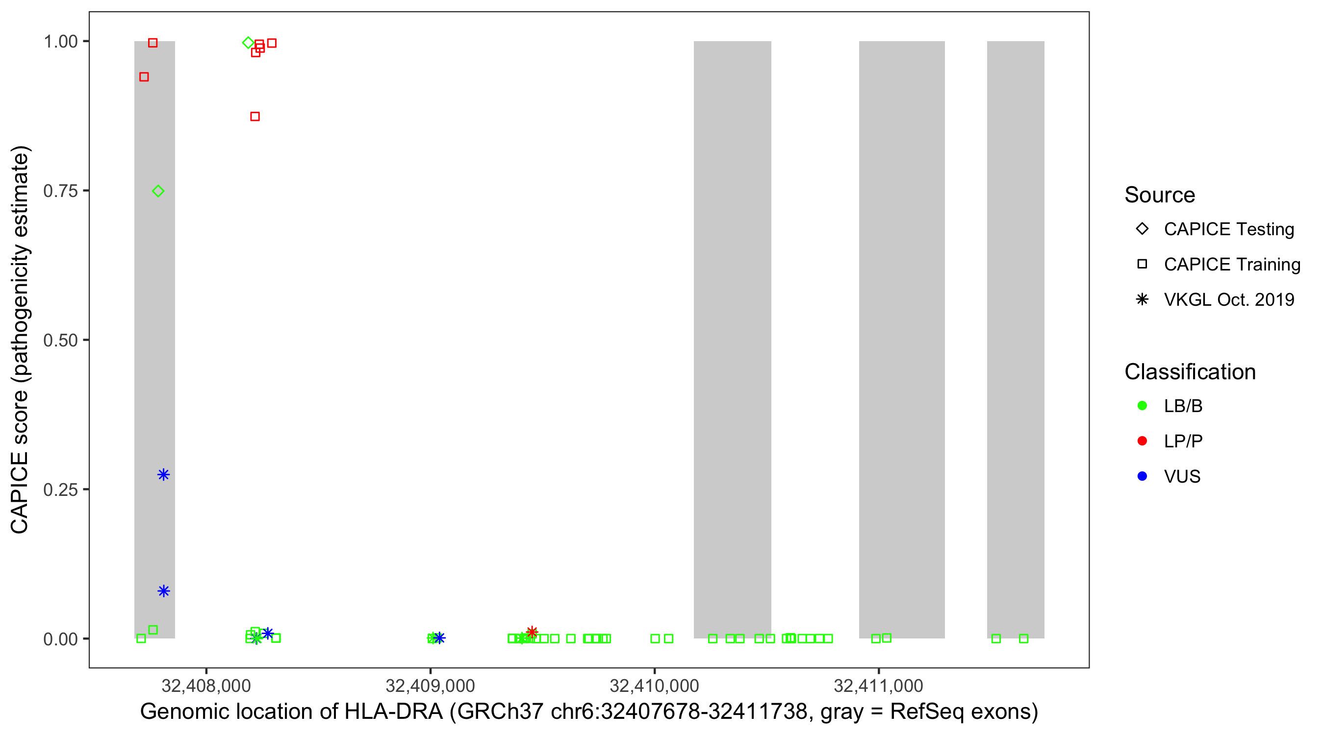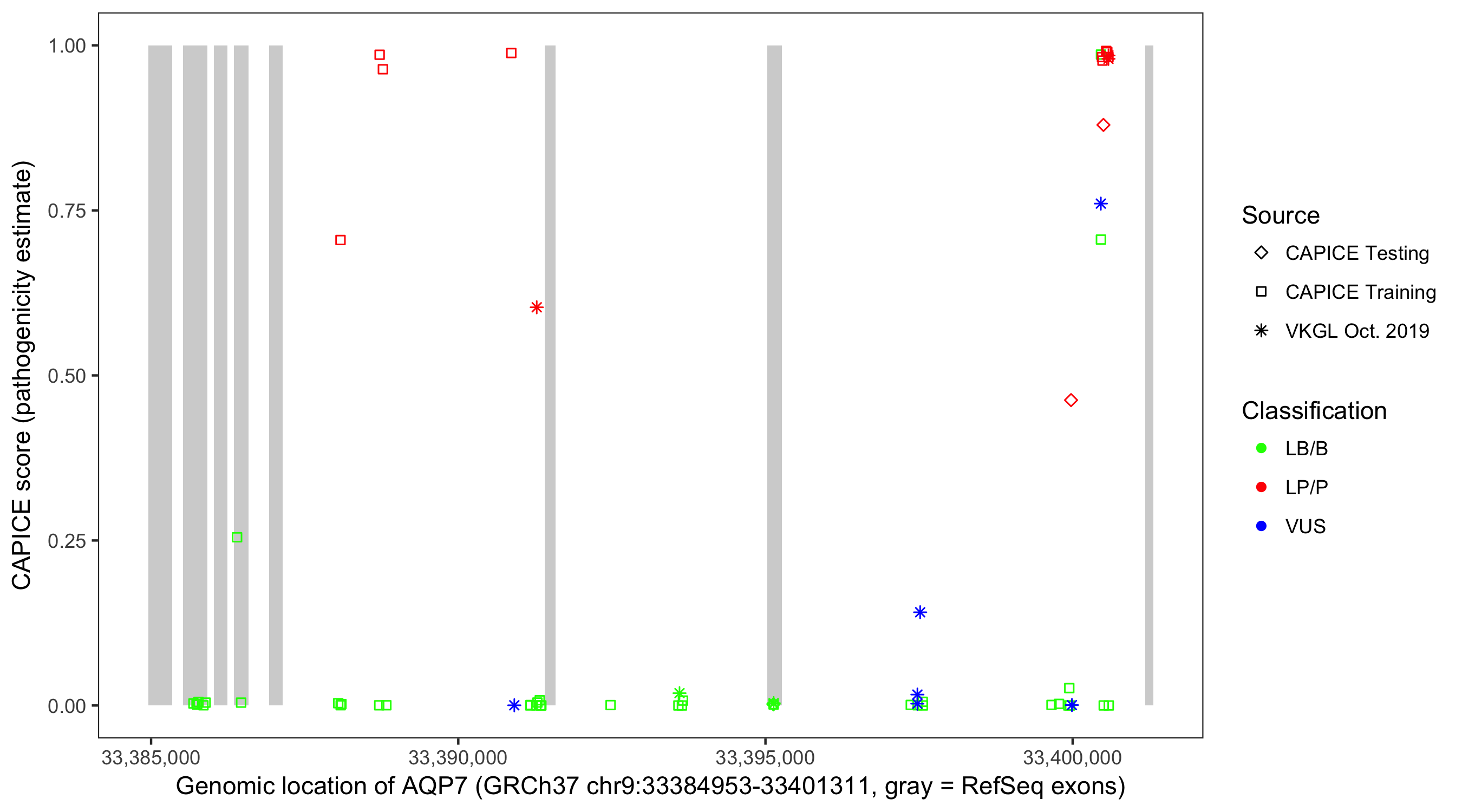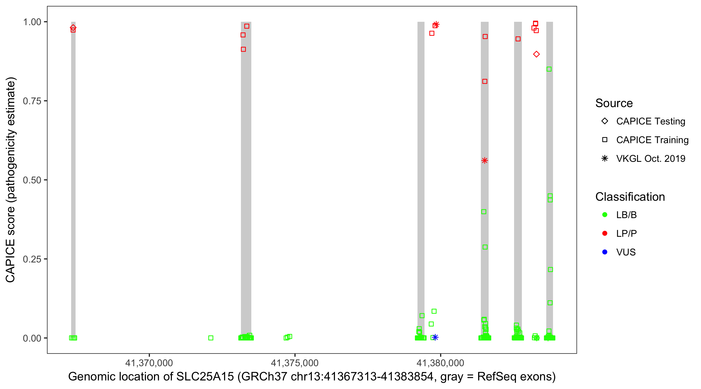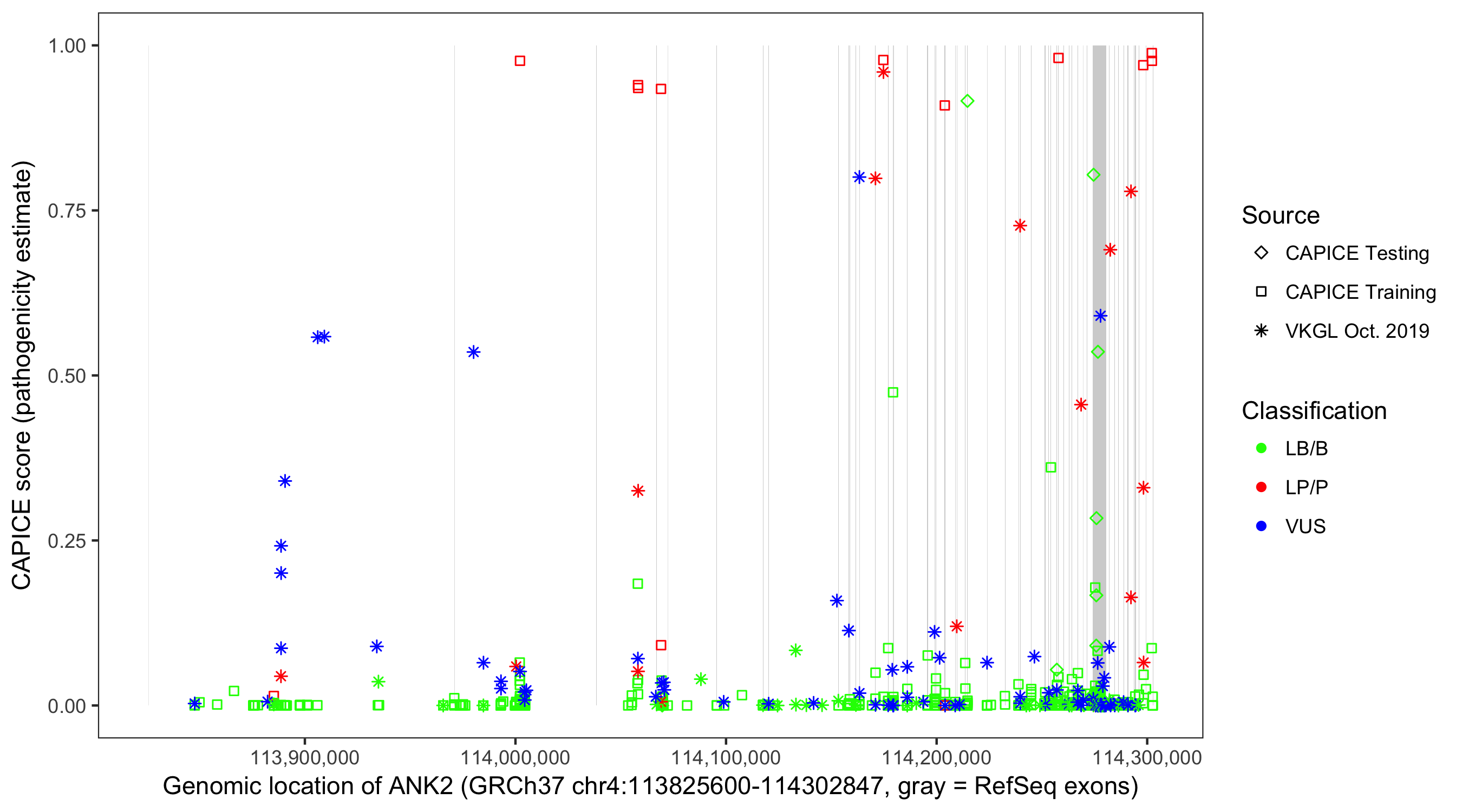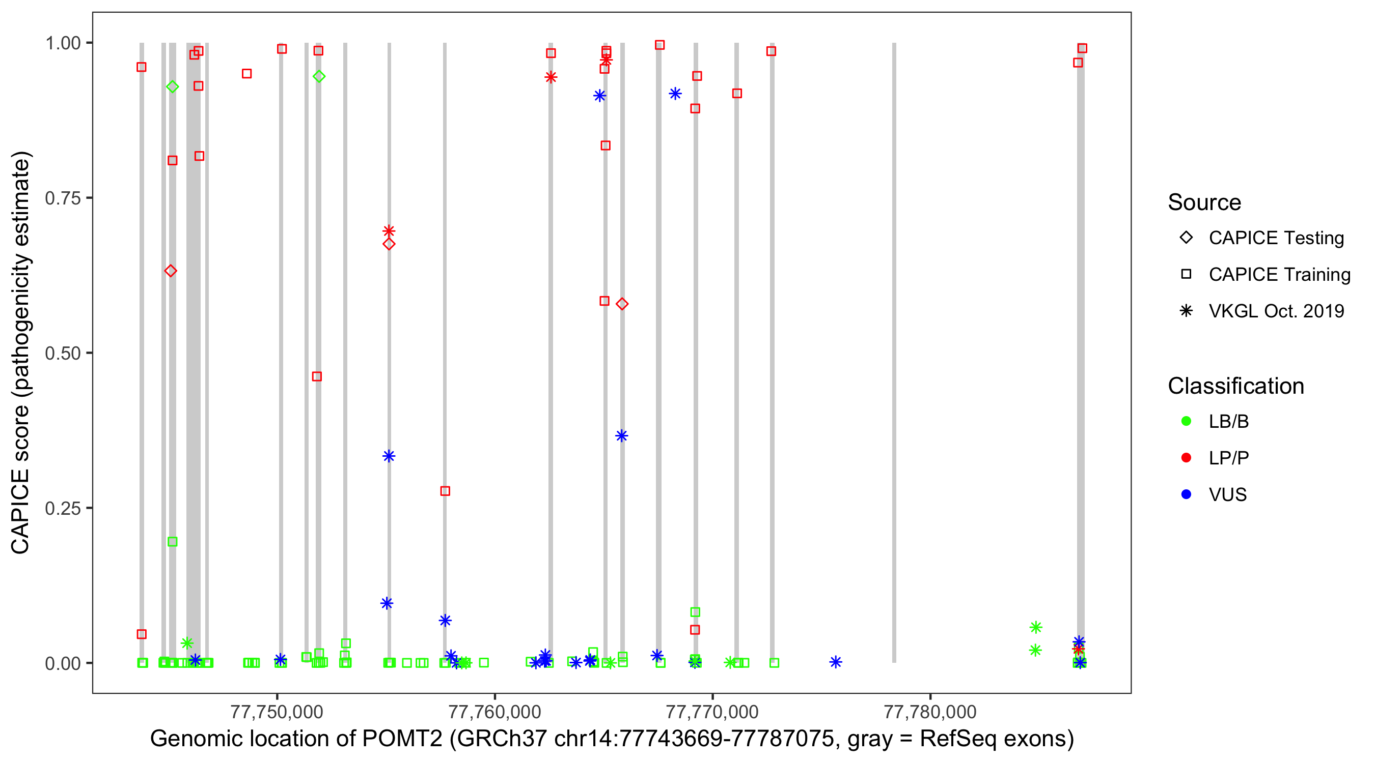 Shown are CAPICE train/test variants plus VKGL Oct 2019.