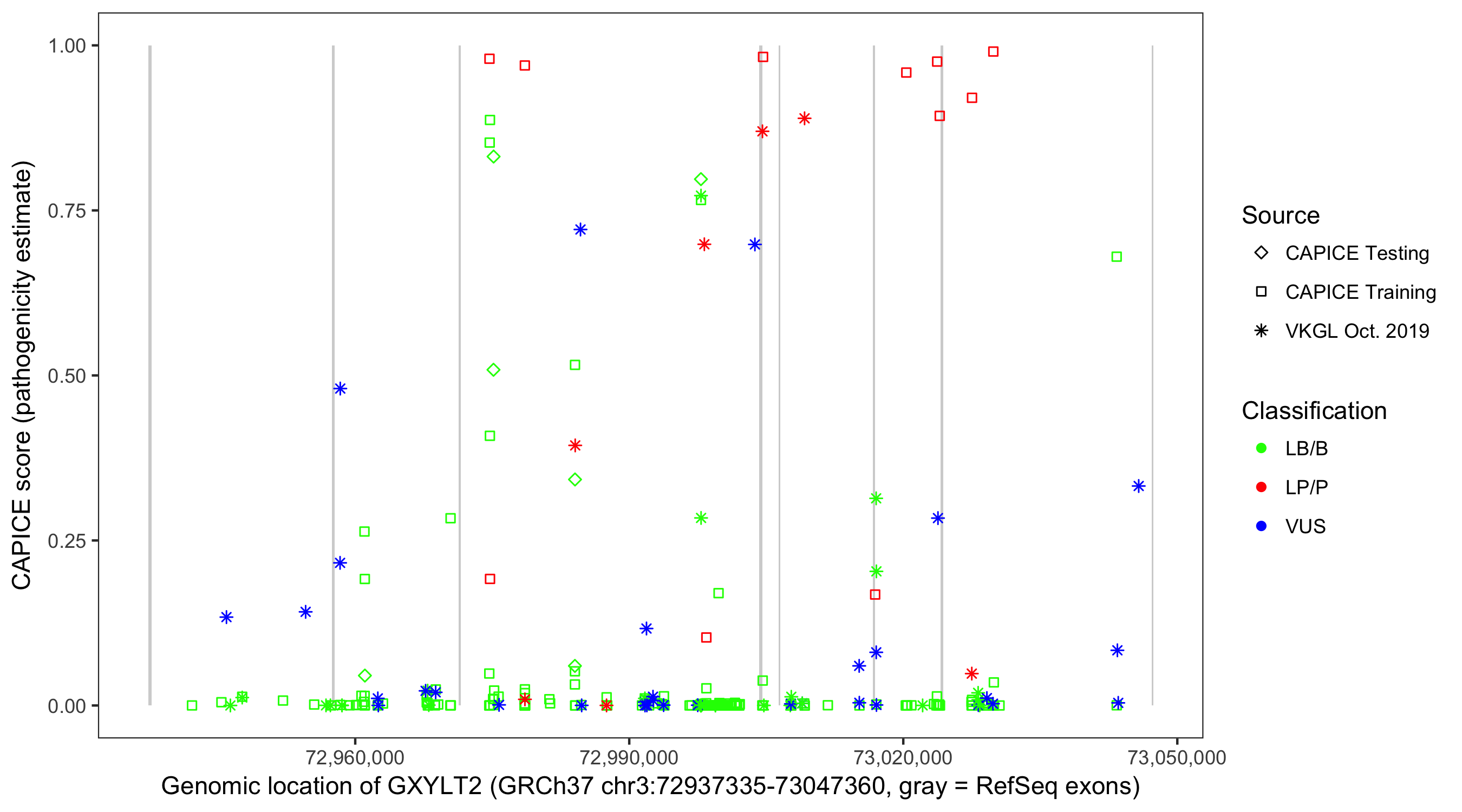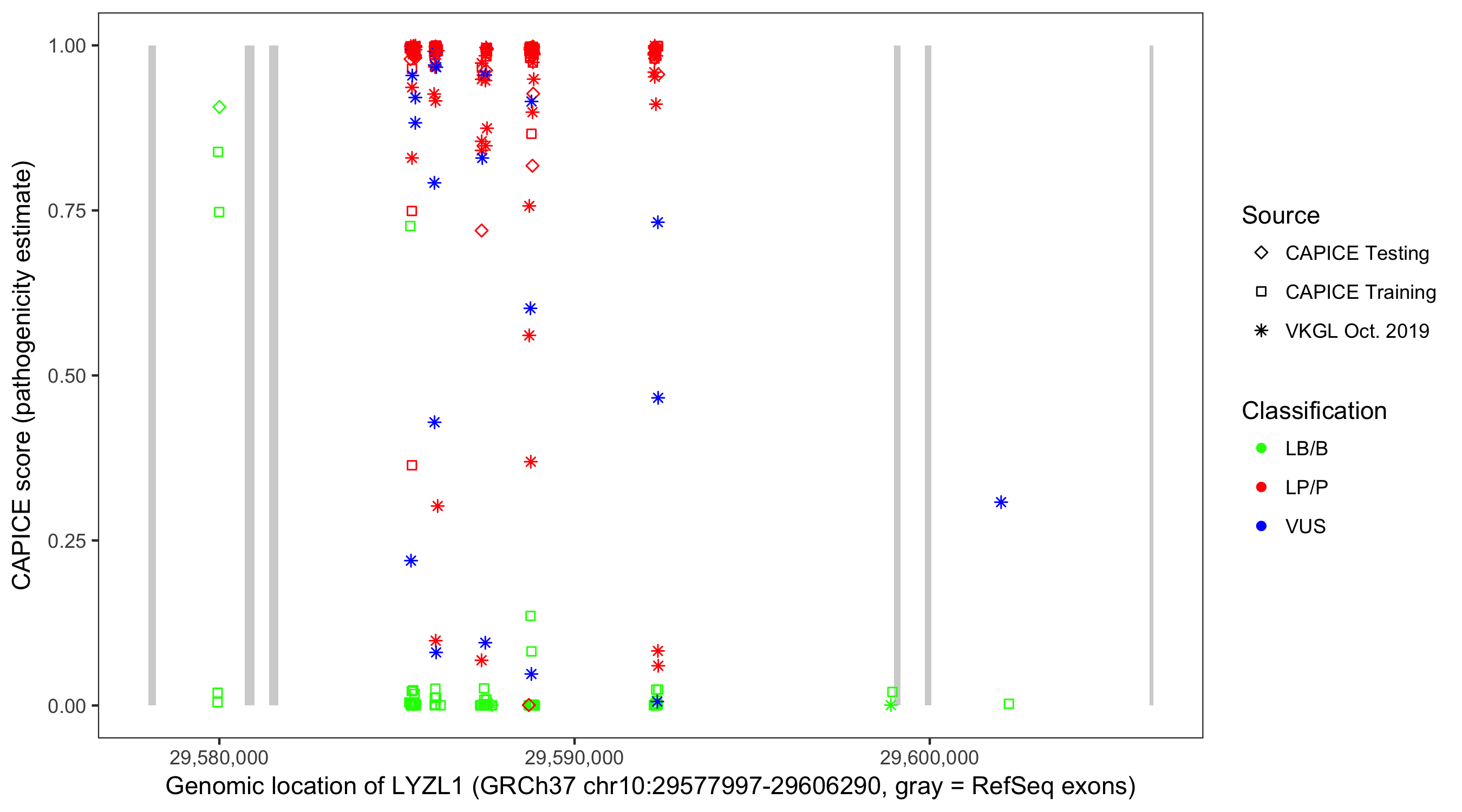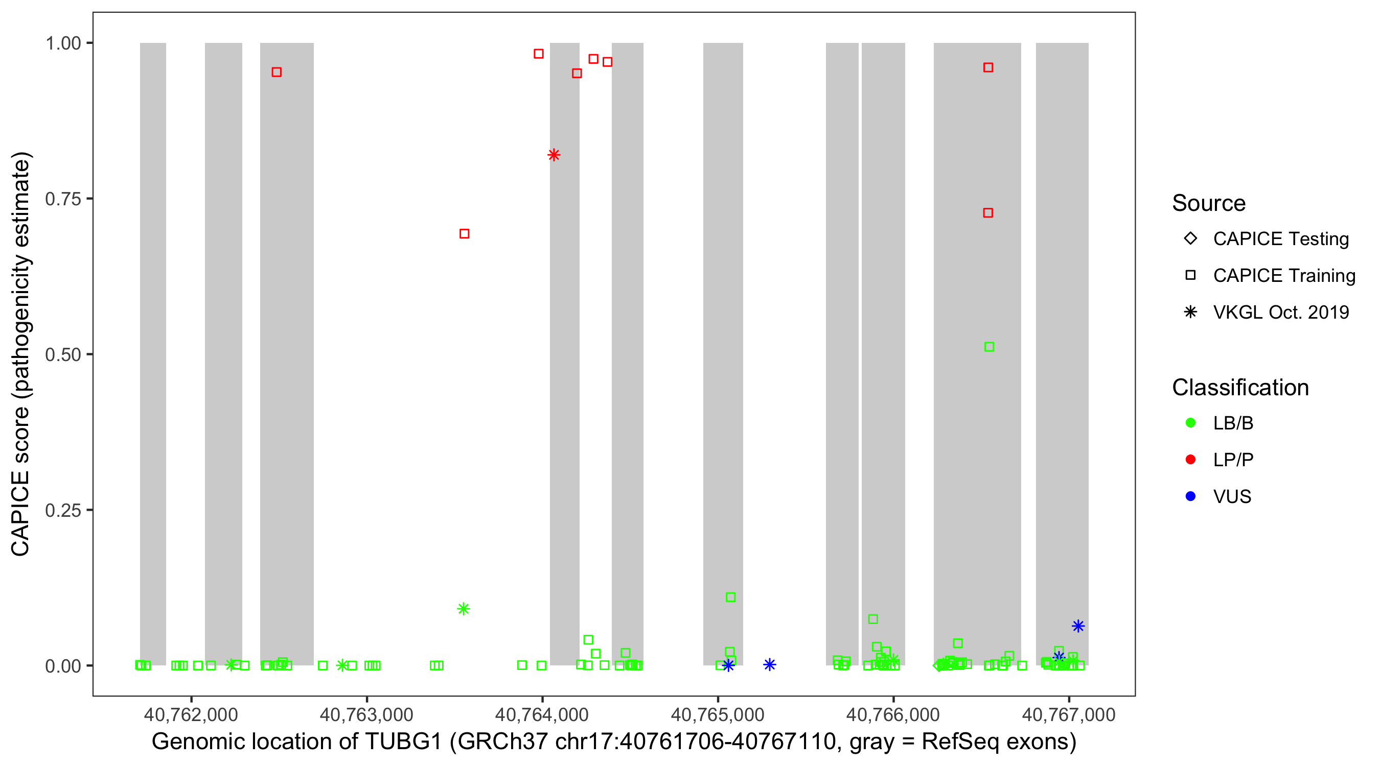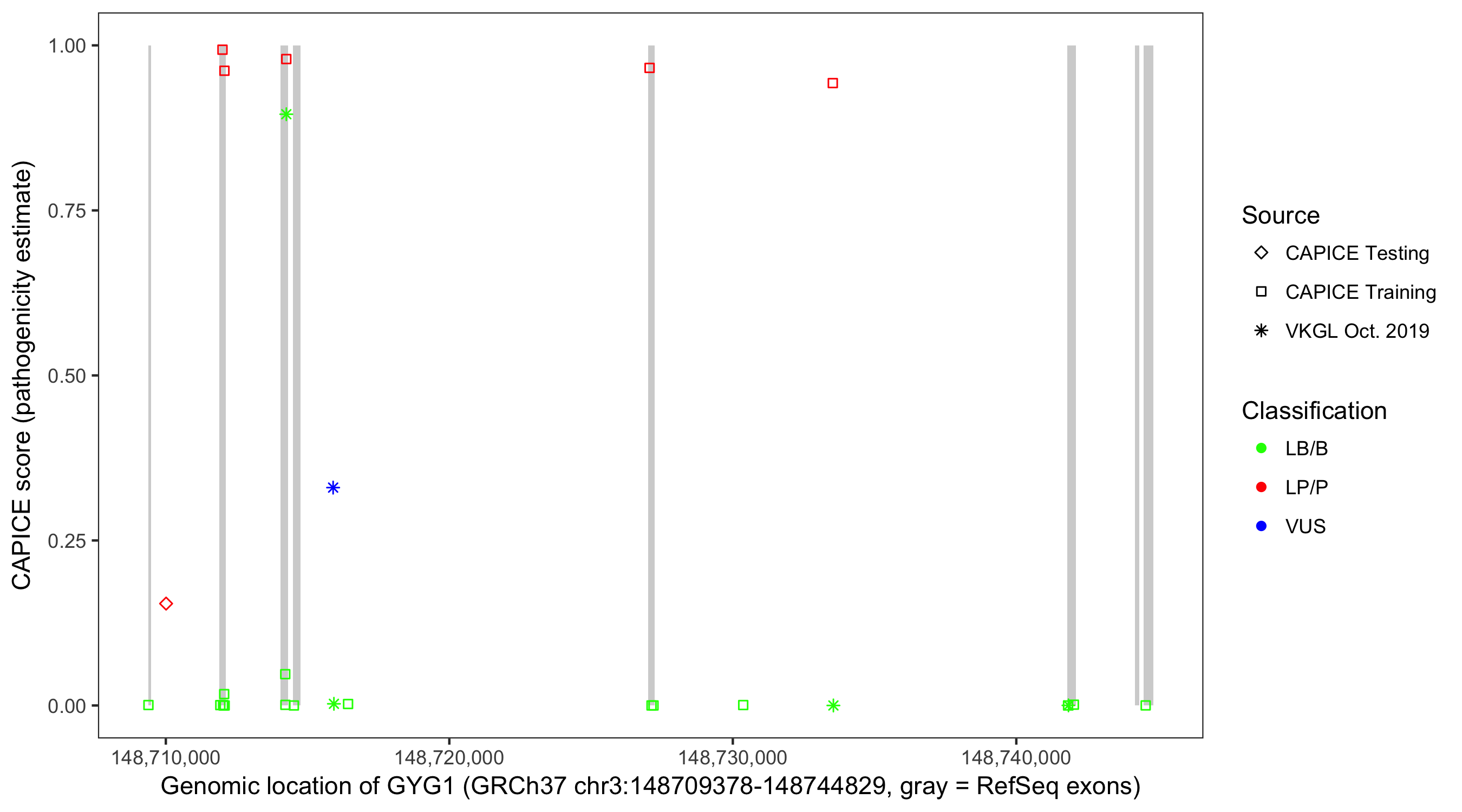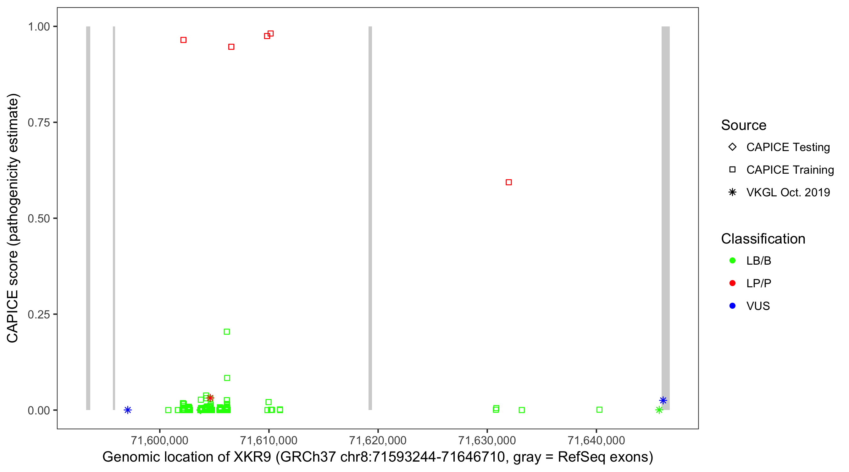 Shown are CAPICE train/test variants plus VKGL Oct 2019.