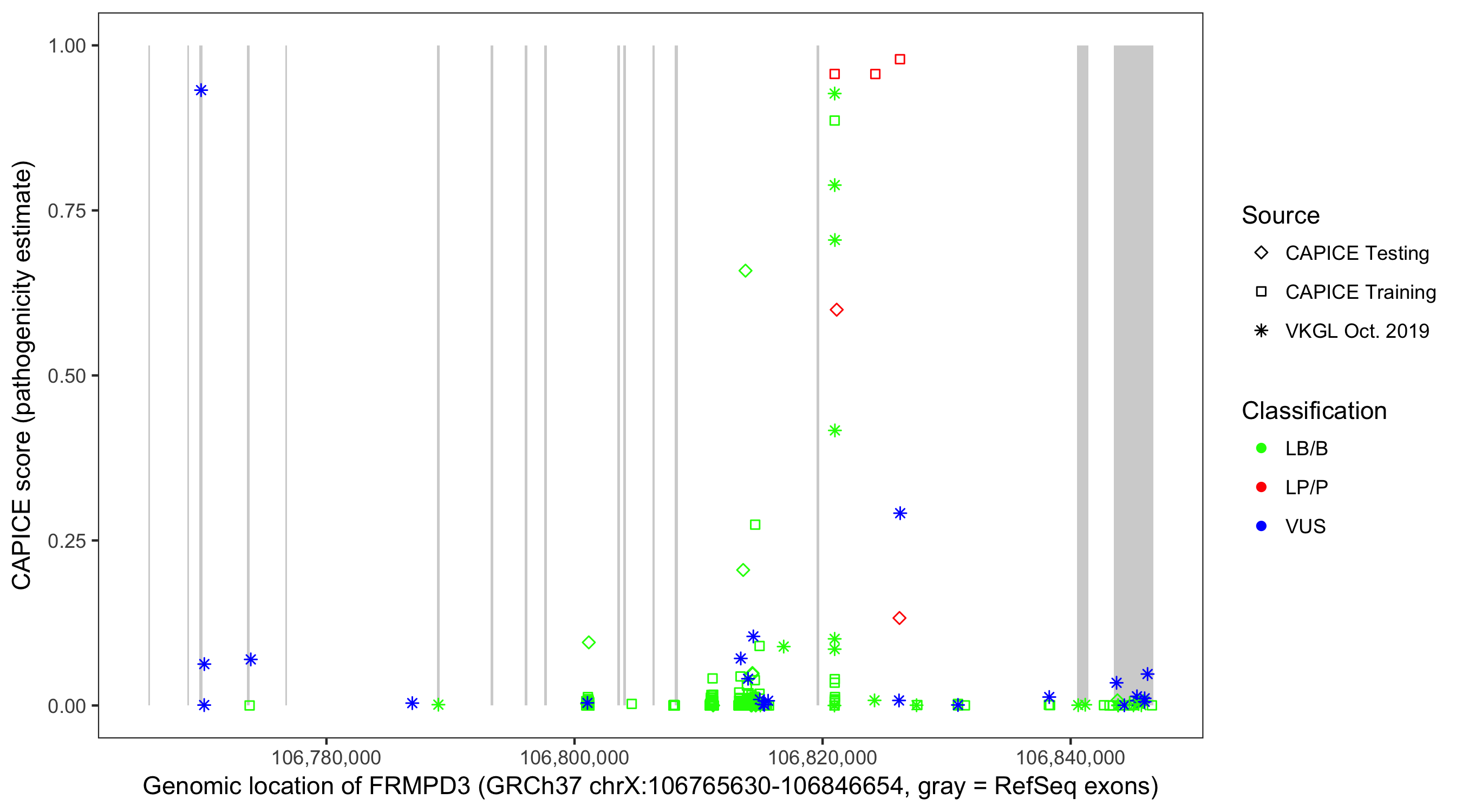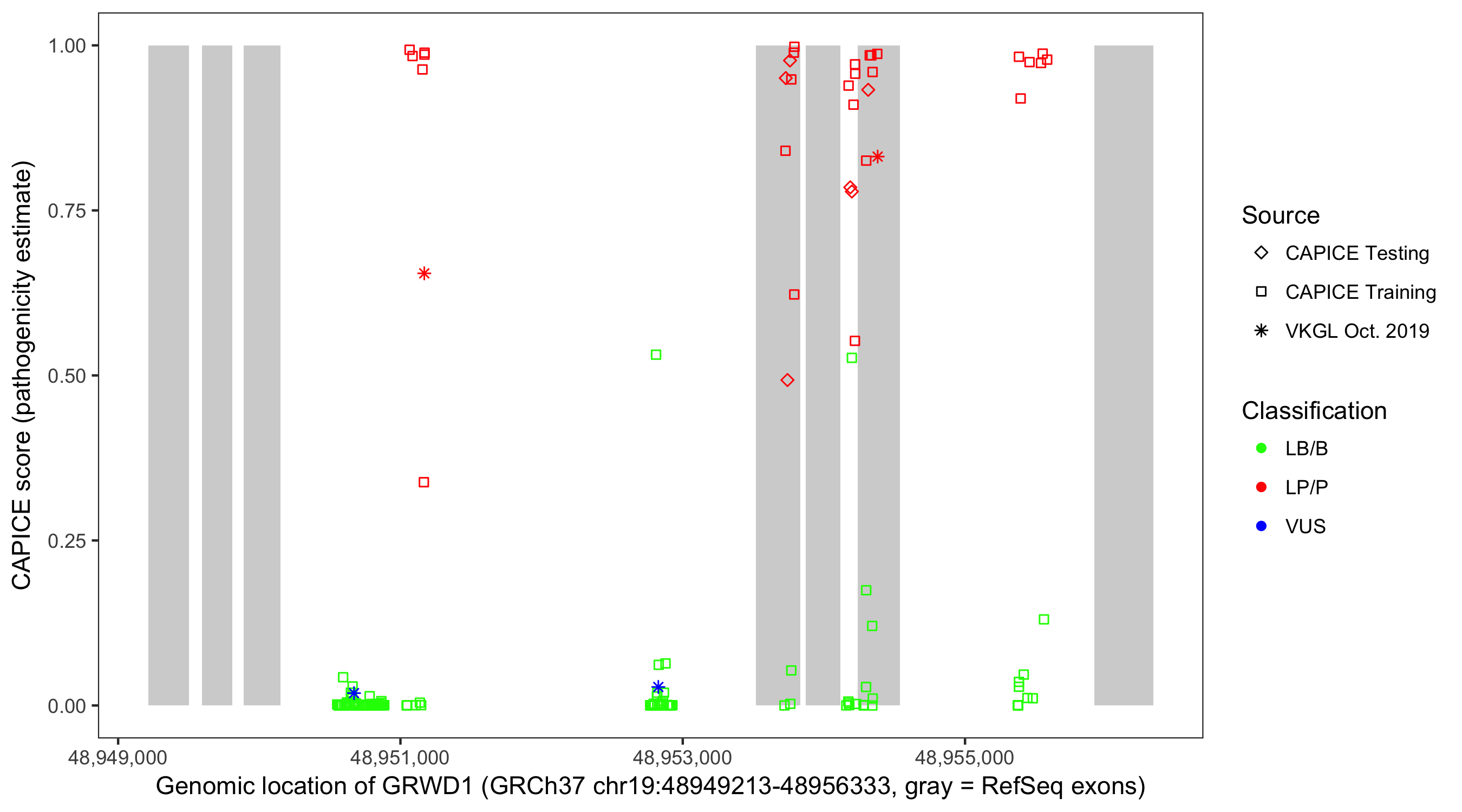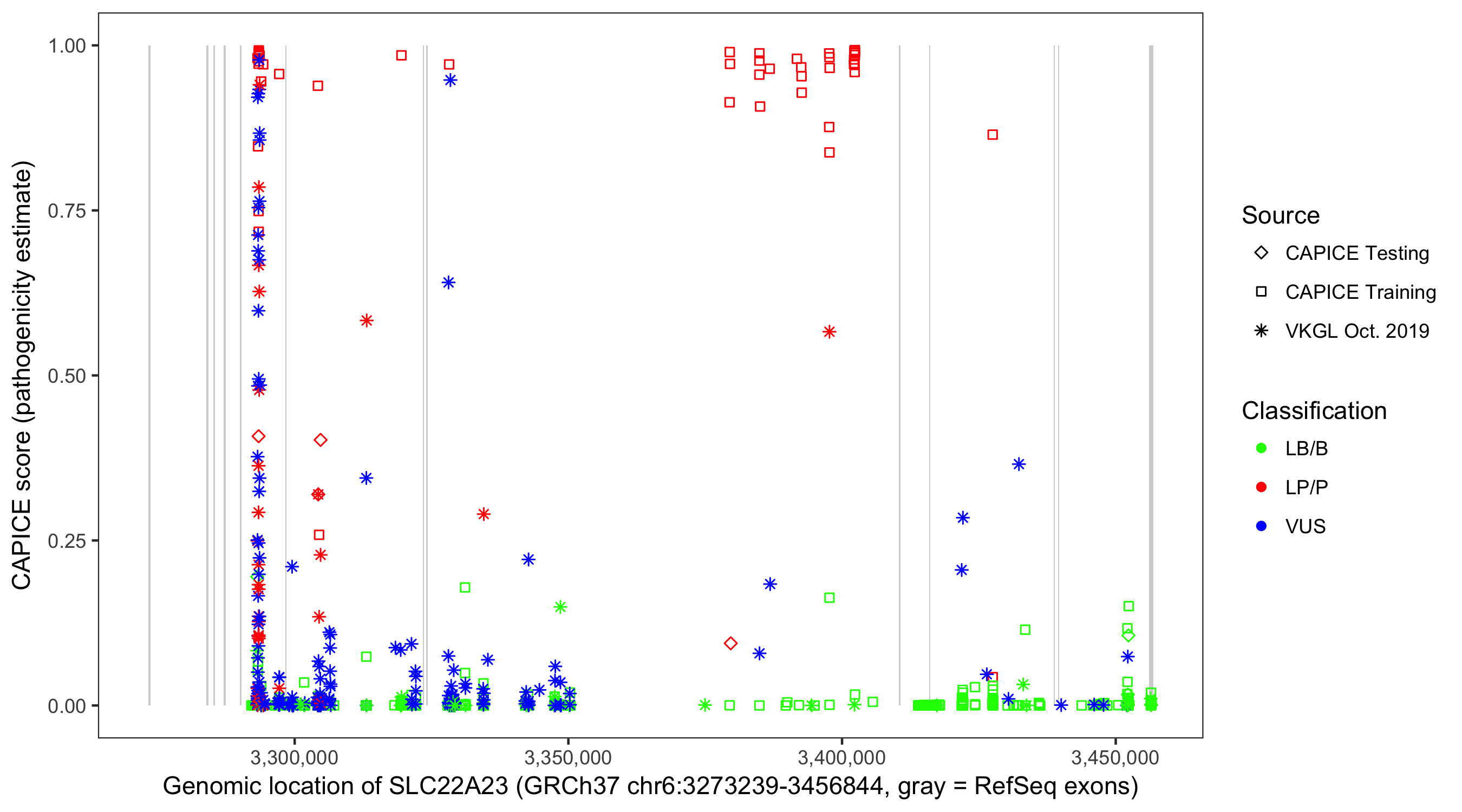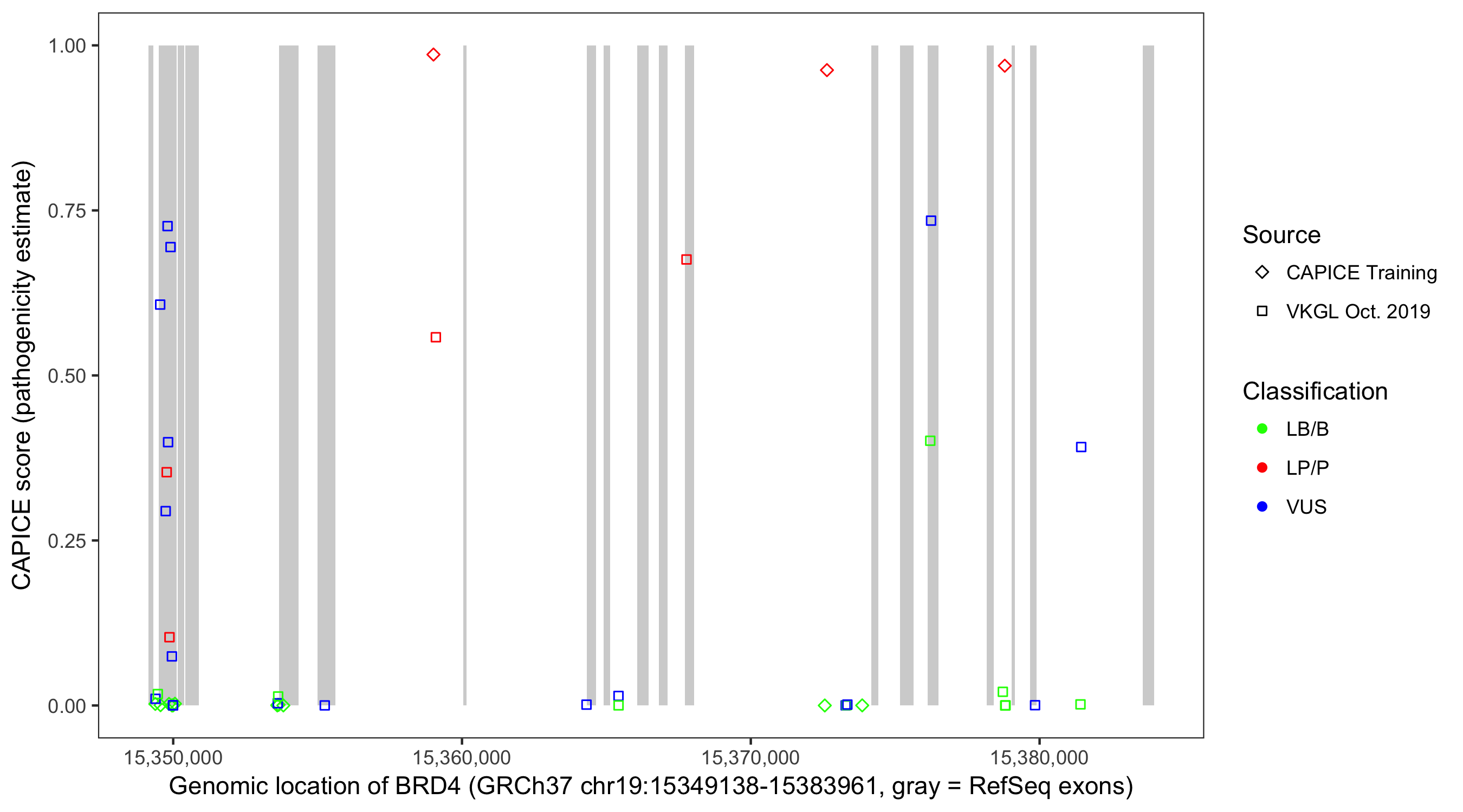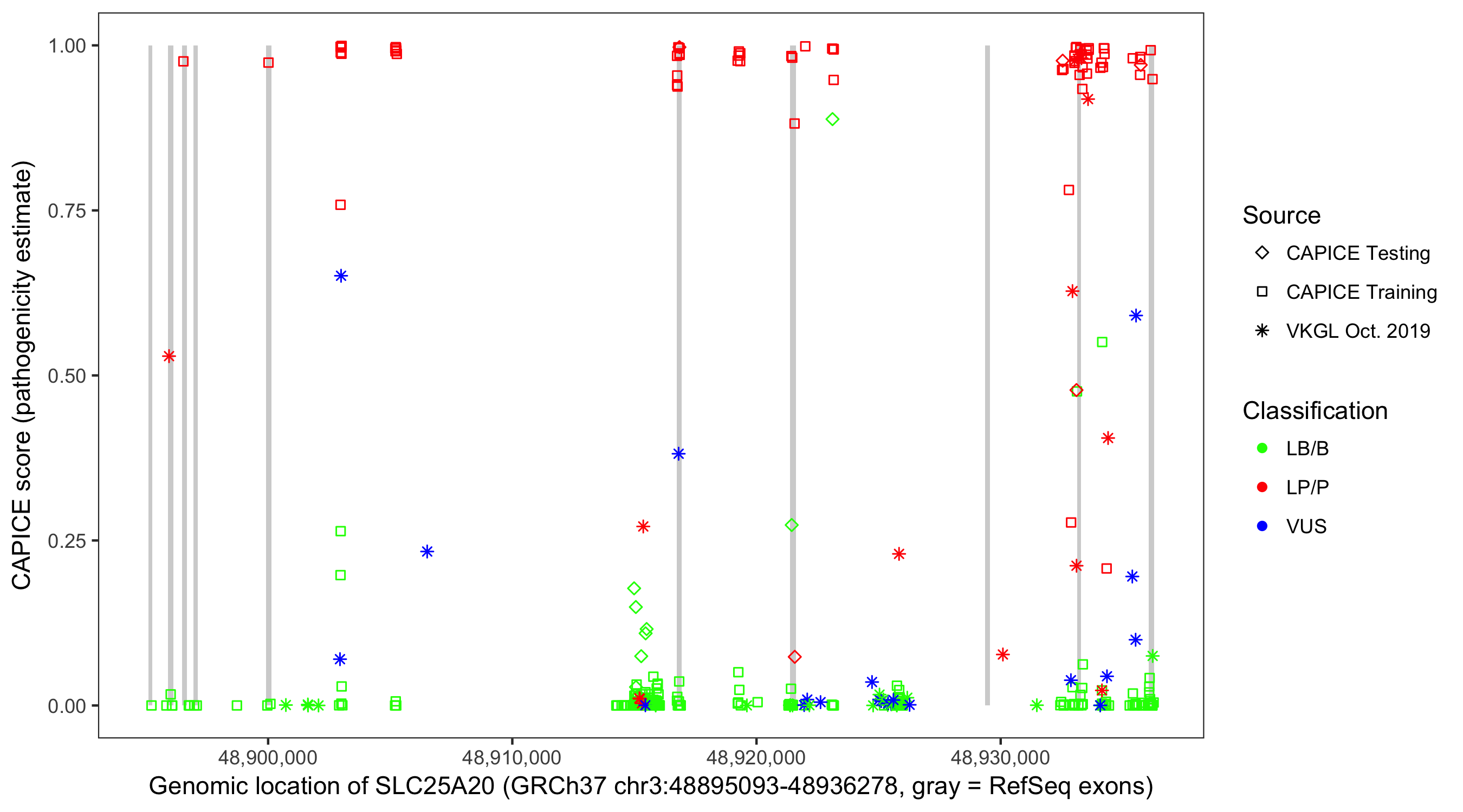 Shown are CAPICE train/test variants plus VKGL Oct 2019.
